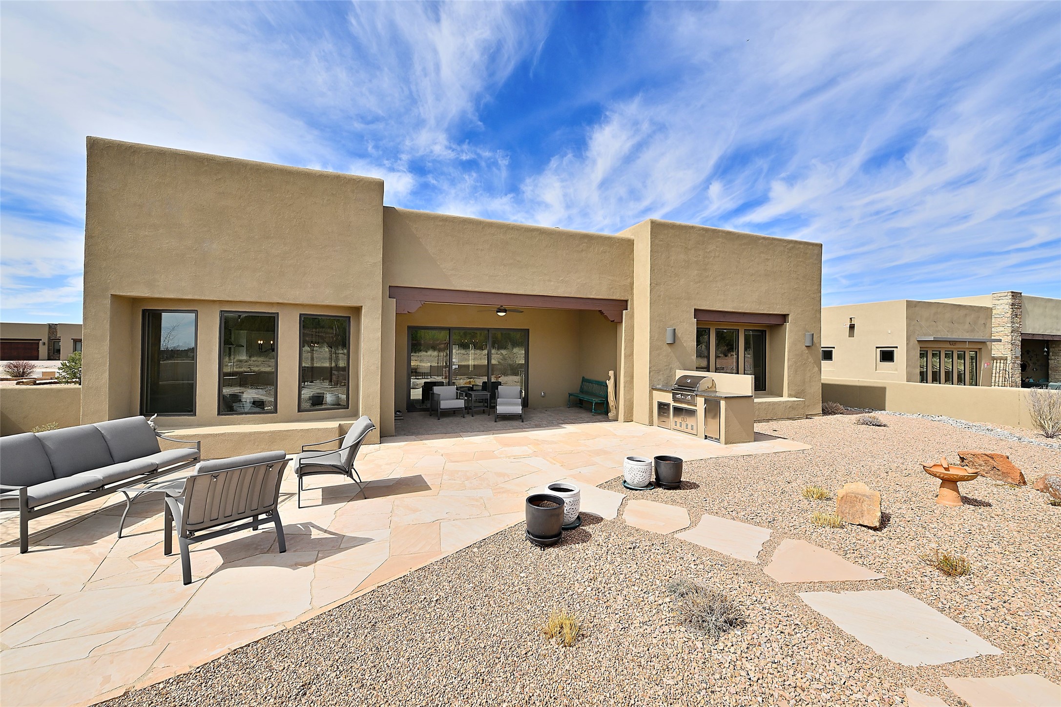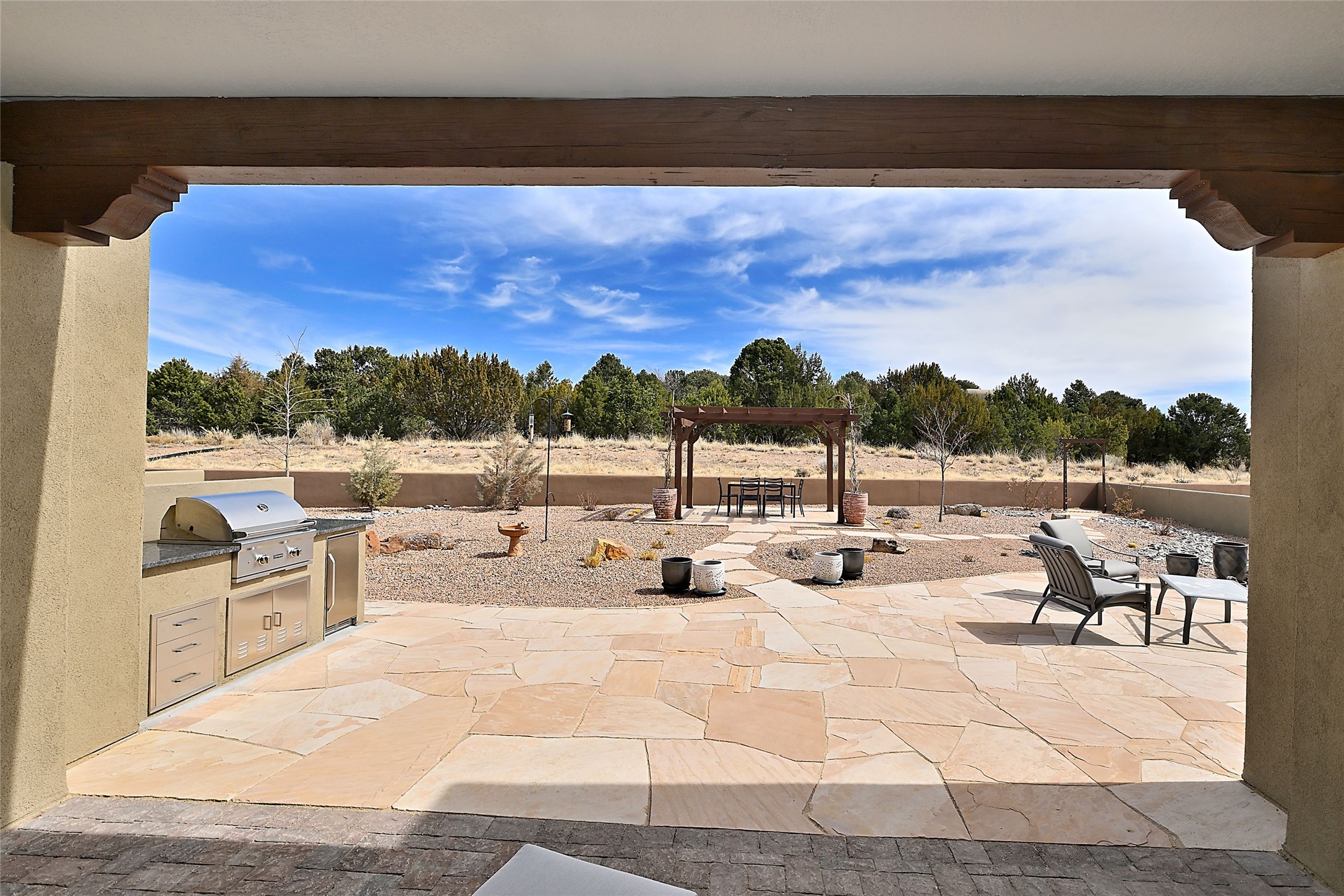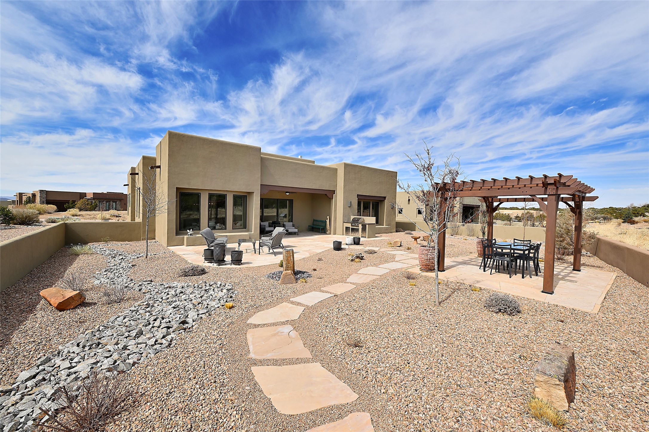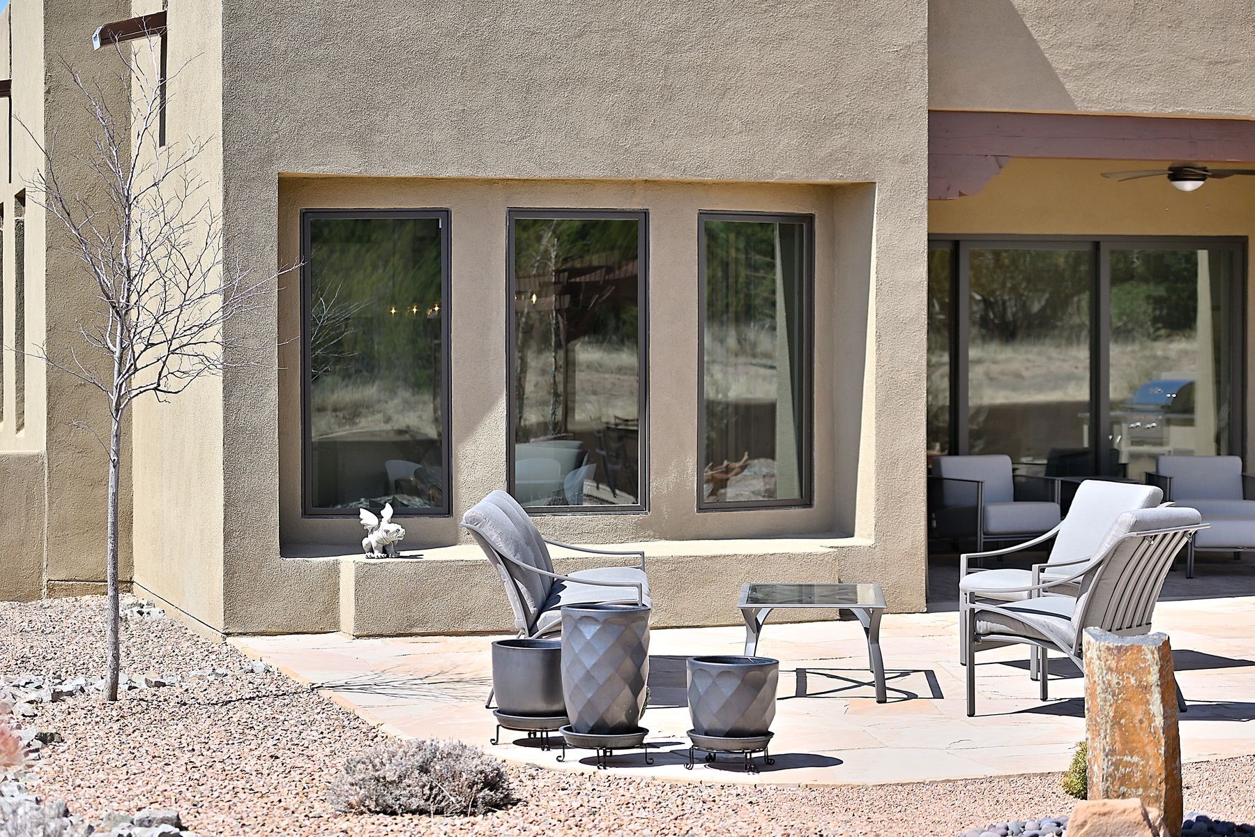 Welcome to this stunning 3,119 sq. ft. home, built in 2022, offering a perfect blend of modern elegance and thoughtful design. With an open floor plan and high ceilings, this home is both spacious and inviting. Located in the heart of the Las Terrazas enclavein Las Campanas, the neighborhood offers privacy, walking paths, security and 24/7 EMT service. The bright kitchen is a chef's dream, featuring white cabinets, quartzite countertops, stainless steel KitchenAid appliances, and a large island with seating. A breakfast nook and a large butler's pantry provide added convenience. The living room boasts a gas fireplace set into a beautiful stone wall, complemented by a wall of sliding doors that seamlessly open to the outdoor covered patio. Beyond, a professionally landscaped yard complete with outdoor kitchen, pergola, water feature, and rose arbor creates a beautiful private oasis. A formal dining room, located just off the living room, provides an elegant space for entertaining. A large library/office offers a perfect workspace. The home features three bedrooms and 3.5 bathrooms. The primary suite, set in its own private wing, includes a luxurious bath with a walk-in shower and a soaking tub. A guest bedroom with an en-suite bath and den/sitting area is currently used as a studio. This exceptional home combines comfort and sophistication--ideal for both everyday living and entertaining.