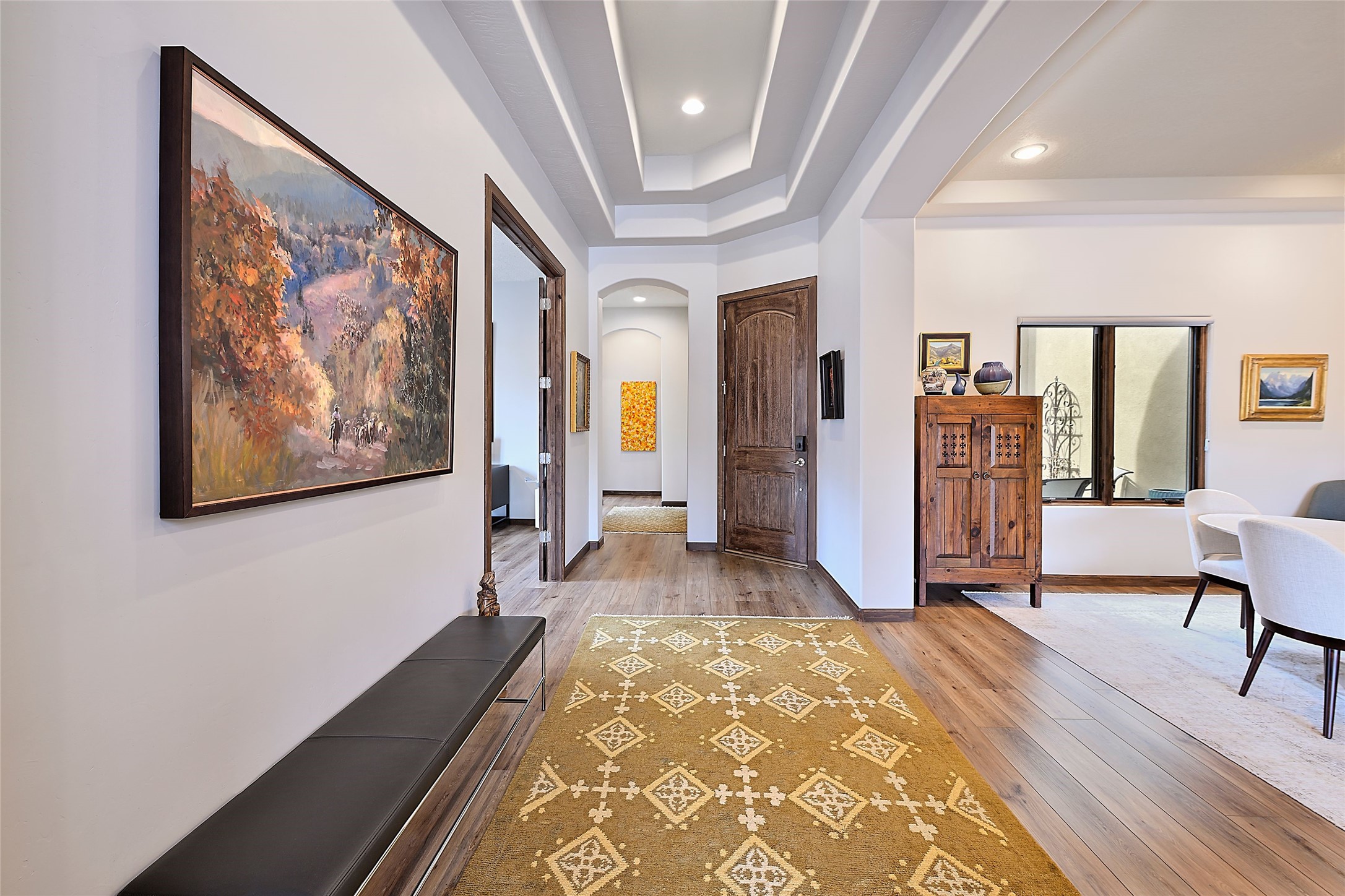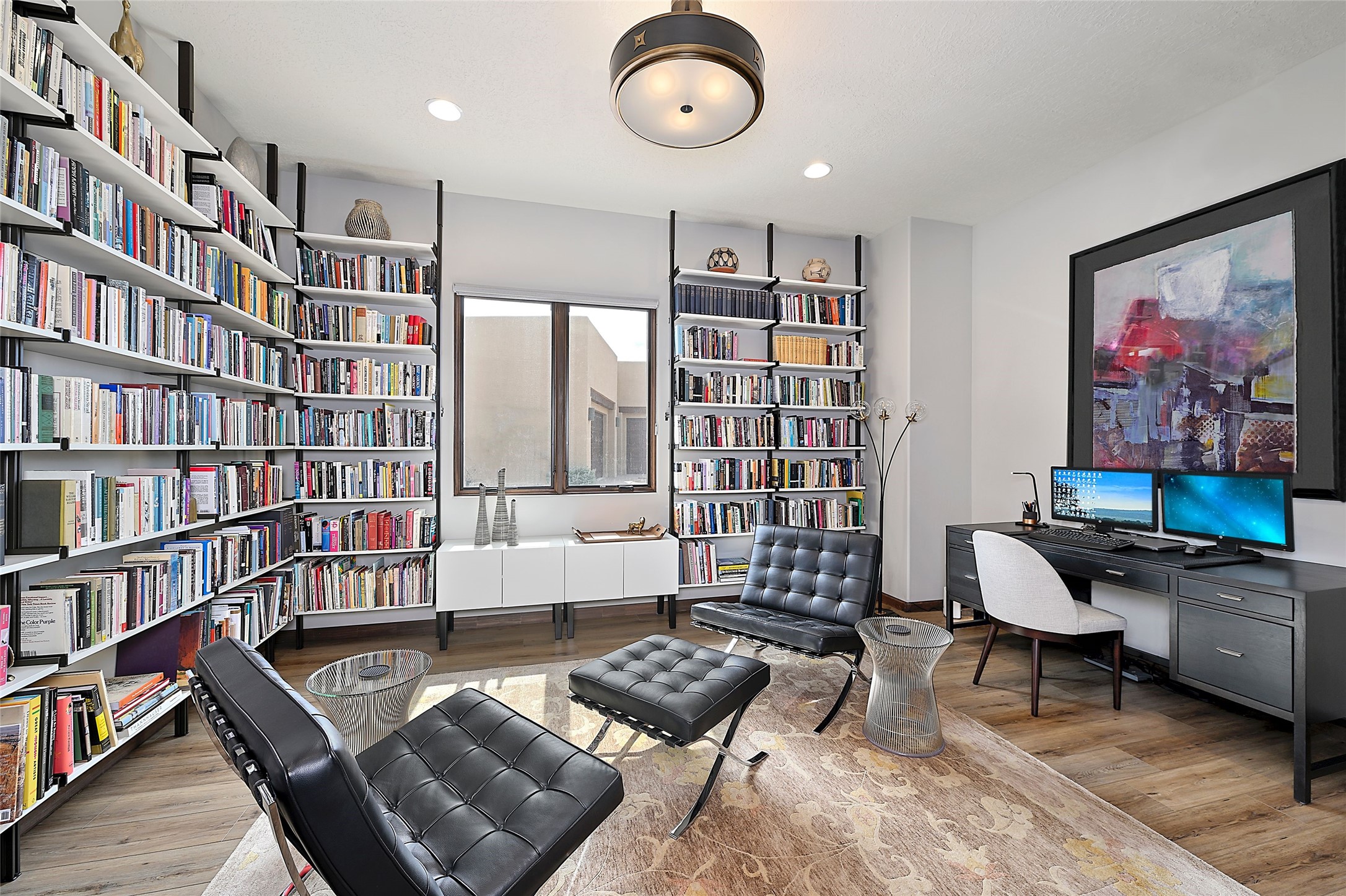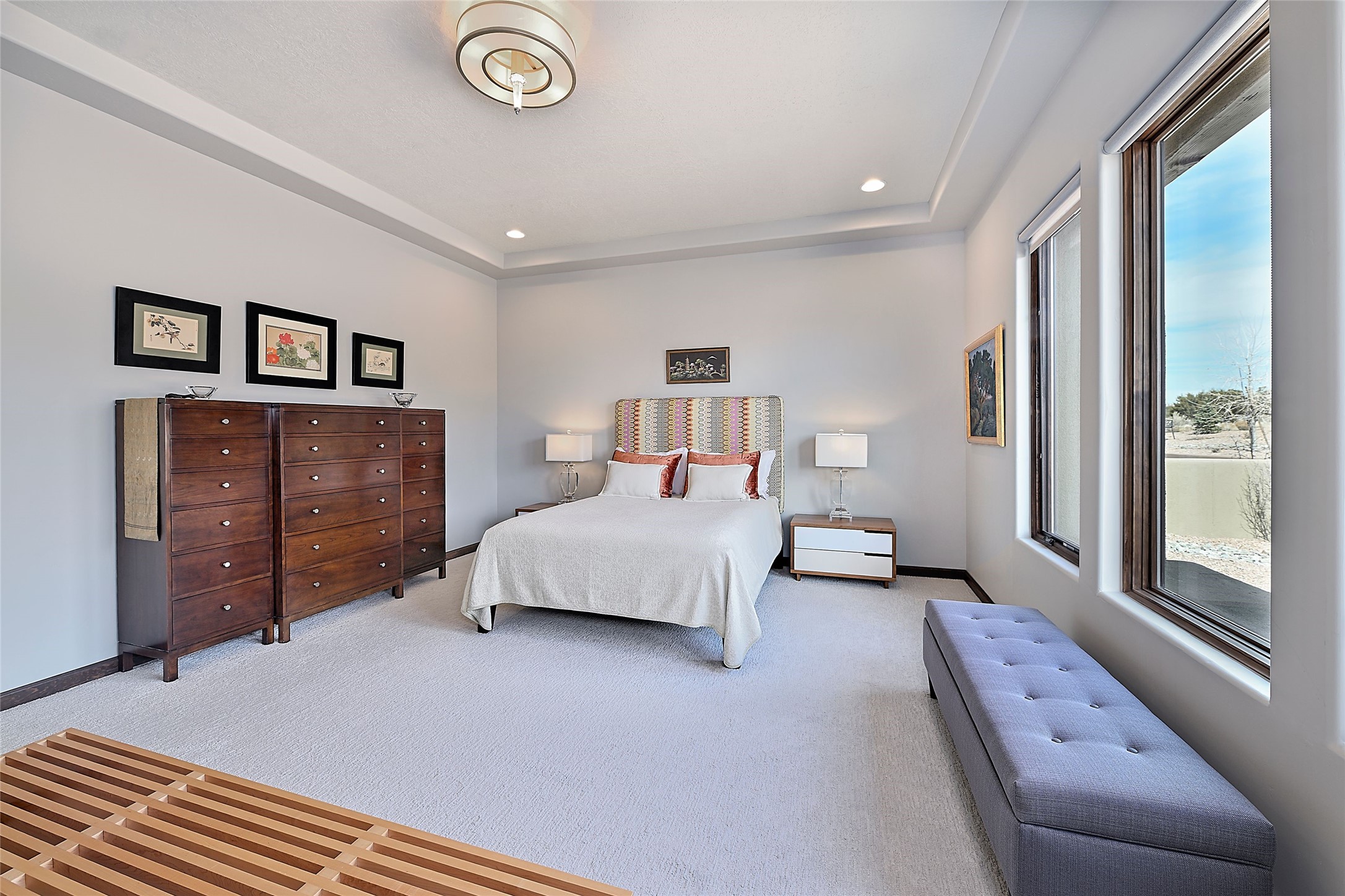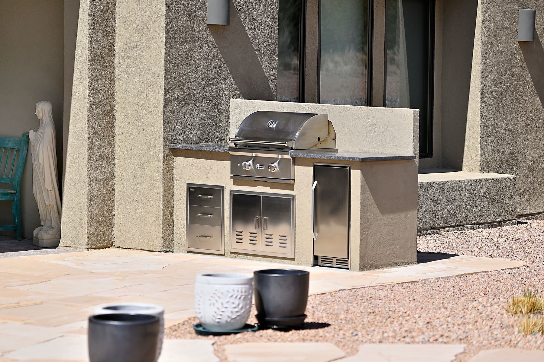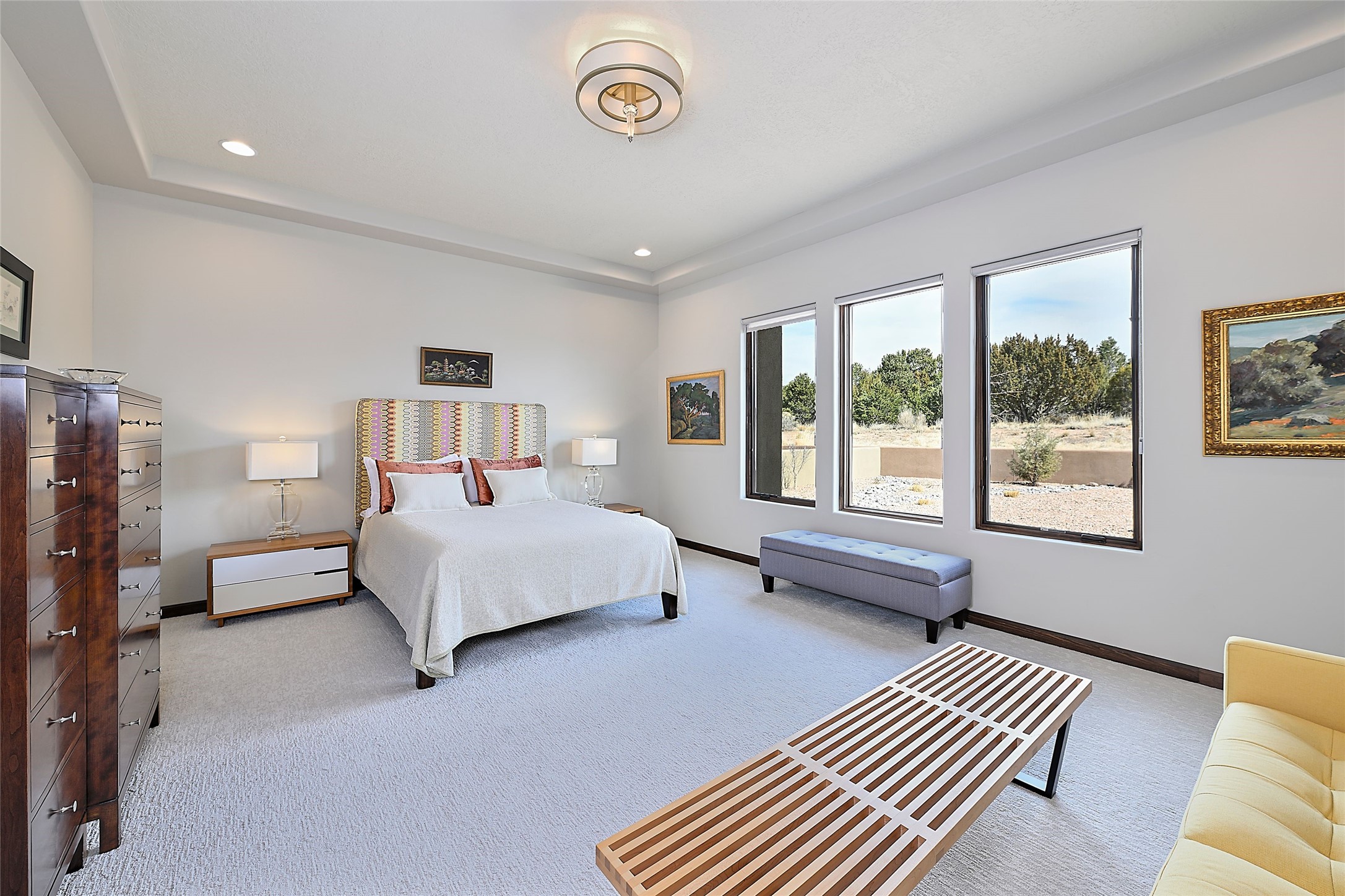 Welcome to this stunning 3,119 sq. ft. home, built in 2022, offering a perfect blend of modern elegance and thoughtful design. With an open floor plan and high ceilings, this home is both spacious and inviting. Located in the heart of the Las Terrazas enclavein Las Campanas, the neighborhood offers privacy, walking paths, security and 24/7 EMT service. The bright kitchen is a chef's dream, featuring white cabinets, quartzite countertops, stainless steel KitchenAid appliances, and a large island with seating. A breakfast nook and a large butler's pantry provide added convenience. The living room boasts a gas fireplace set into a beautiful stone wall, complemented by a wall of sliding doors that seamlessly open to the outdoor covered patio. Beyond, a professionally landscaped yard complete with outdoor kitchen, pergola, water feature, and rose arbor creates a beautiful private oasis. A formal dining room, located just off the living room, provides an elegant space for entertaining. A large library/office offers a perfect workspace. The home features three bedrooms and 3.5 bathrooms. The primary suite, set in its own private wing, includes a luxurious bath with a walk-in shower and a soaking tub. A guest bedroom with an en-suite bath and den/sitting area is currently used as a studio. This exceptional home combines comfort and sophistication--ideal for both everyday living and entertaining.