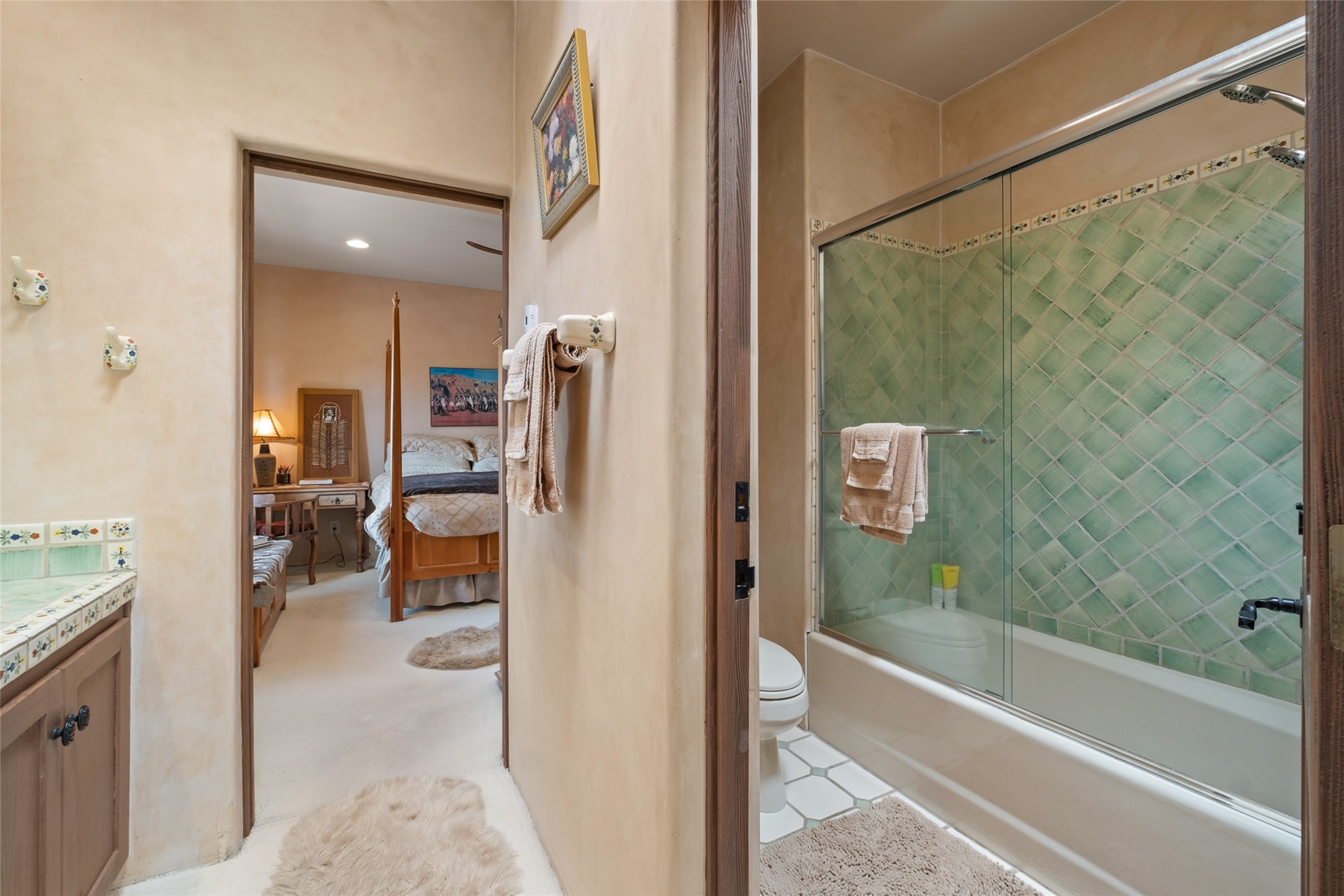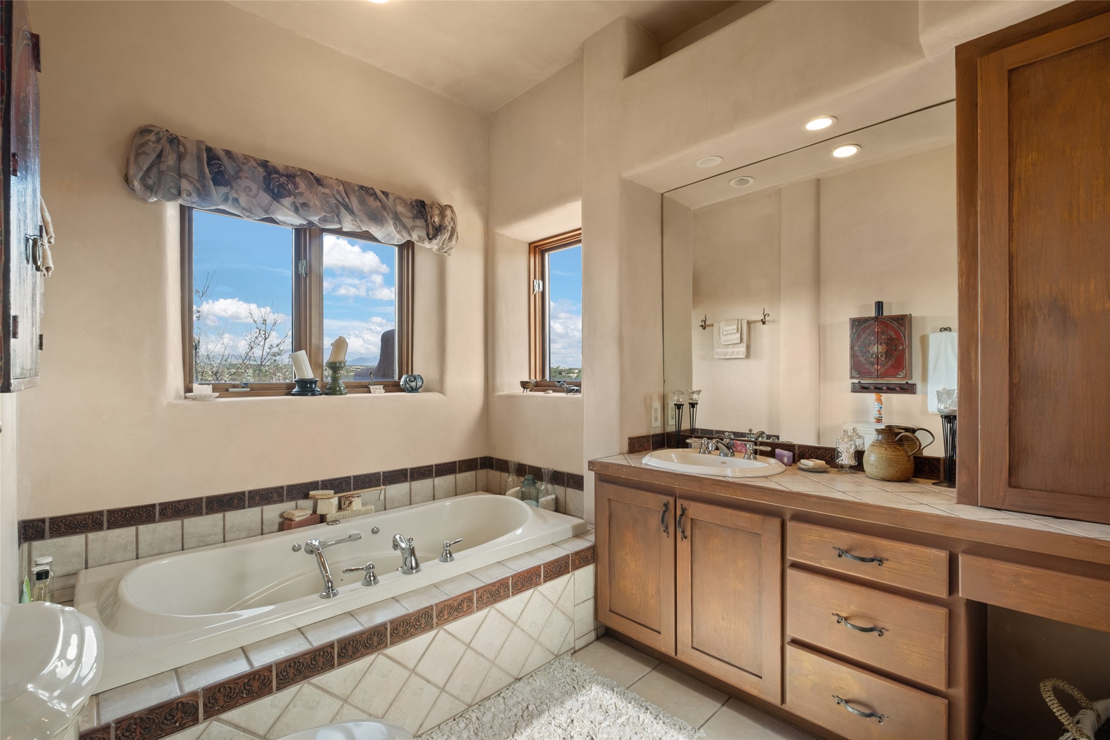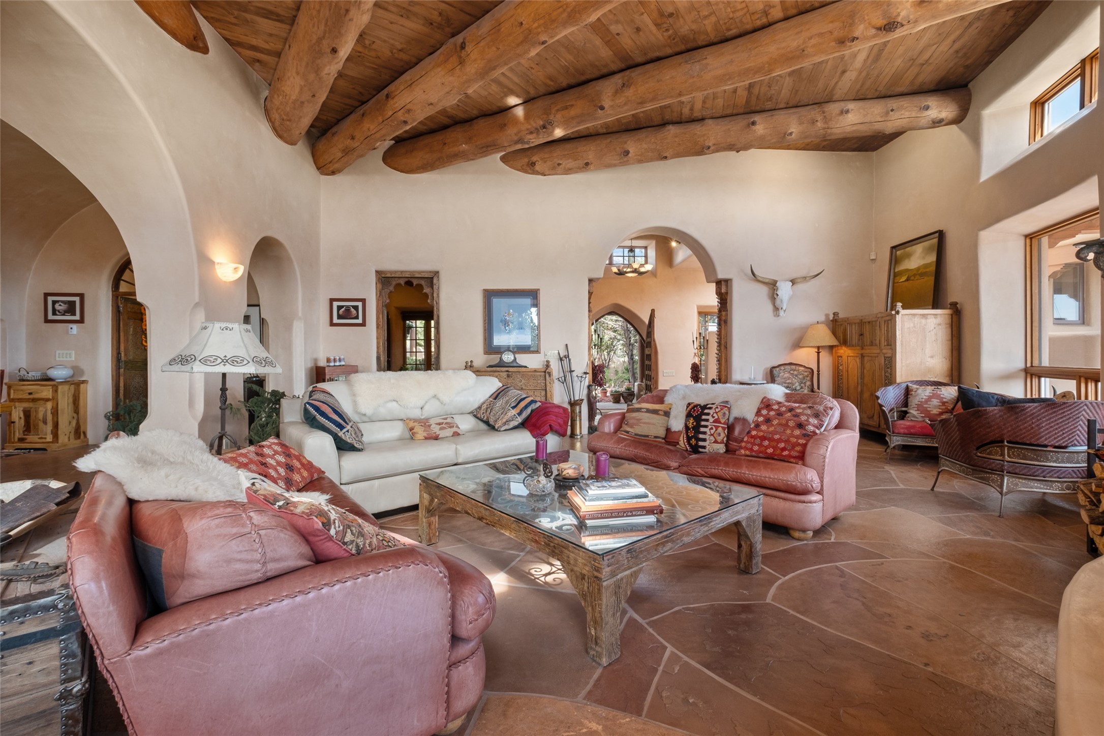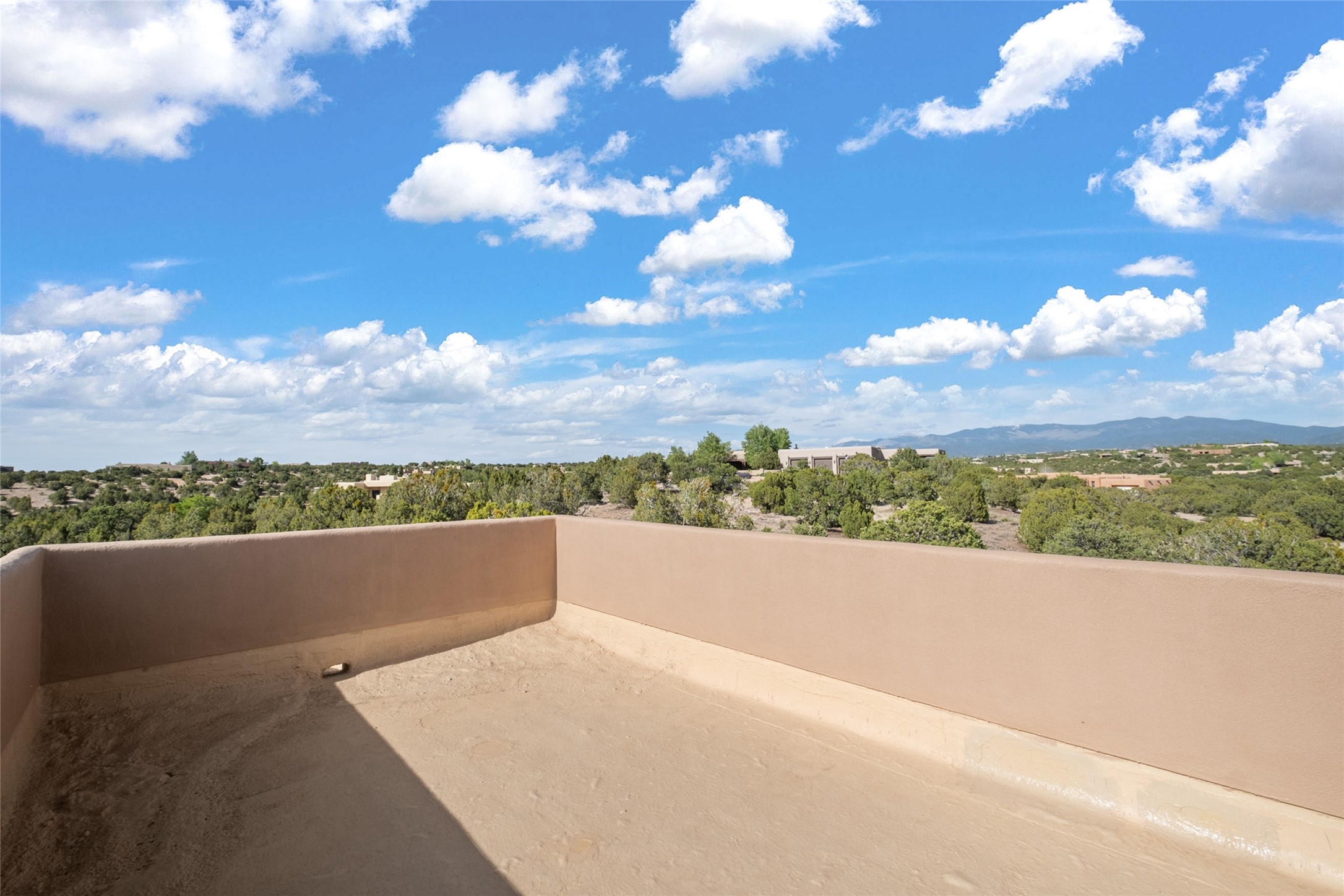 Featured in the New York Times! Discover the grandeur of this stunning Spanish Colonial hacienda residence on an elevated lot in Las Campanas with panoramic mountain views. Offering 5,172 sq ft of custom living space on 1.53-acres, this home is designed for both privacy and elegance, featuring exceptional separation of spaces. With four spacious bedrooms and four bathrooms, this property is ideal for those seeking a refined living experience. The bedrooms have great separation for comfort and privacy. The attached guest house with a kitchen is ideal for visitors or extended family. Art enthusiasts will appreciate the abundant wall space, perfect for displaying treasured collections. The beautiful colonial doors and intricate architectural details add a touch of old-world charm throughout the home. Enjoy breathtaking 360 degree views of the Jemez and Sangre de Cristo mountains from the roof deck. The enchanting courtyard with center fountain offers a serene outdoor retreat, ideal for relaxing and enjoying the tranquil surroundings. The courtyard offers lounging, outdoor grilling, and entertaining. This peaceful oasis is surrounded with mature landscaping. Located on a quiet cul-de-sac, this property combines the best of privacy and community living. Don't miss the opportunity to own this magnificent, custom home that blends Spanish Colonial elegance with modern comforts.