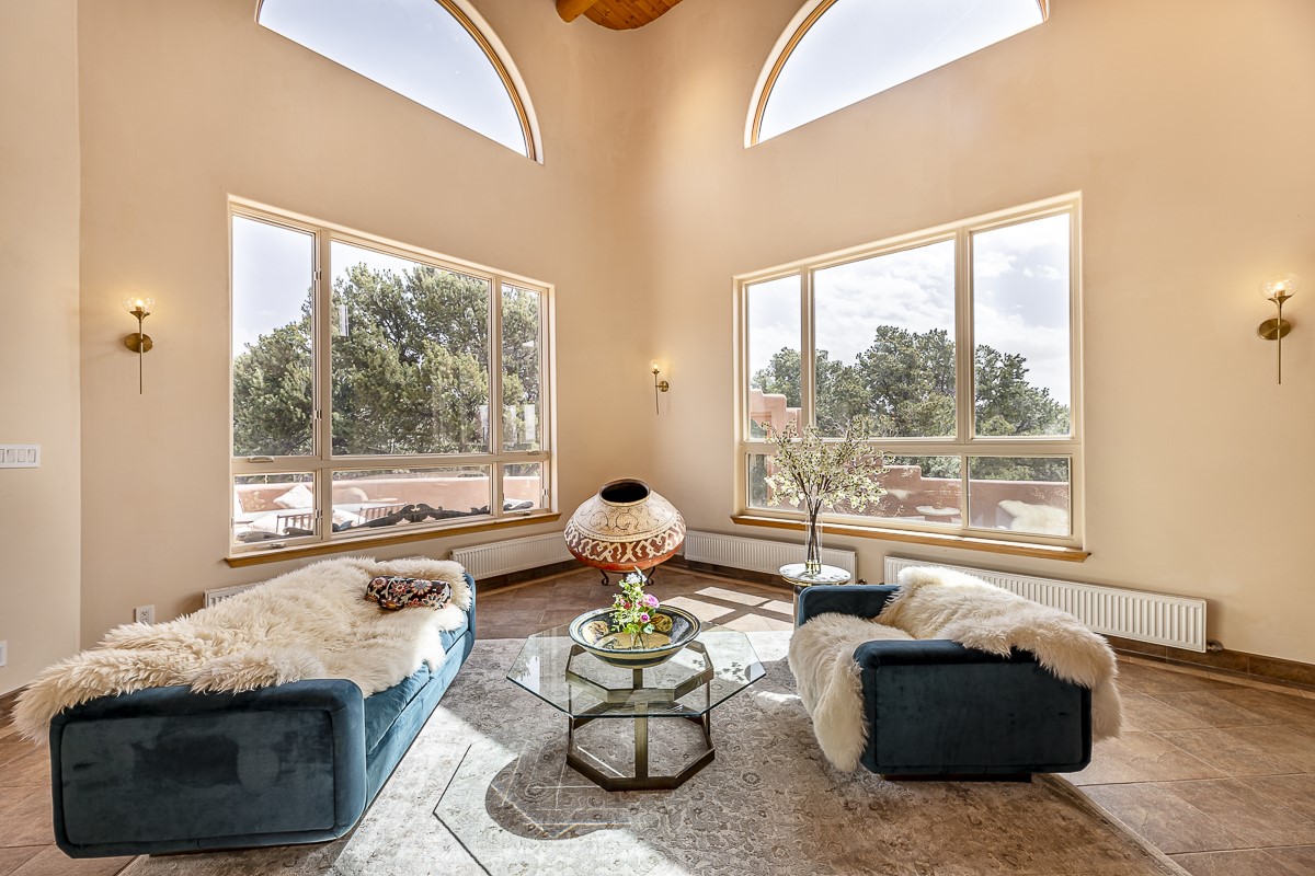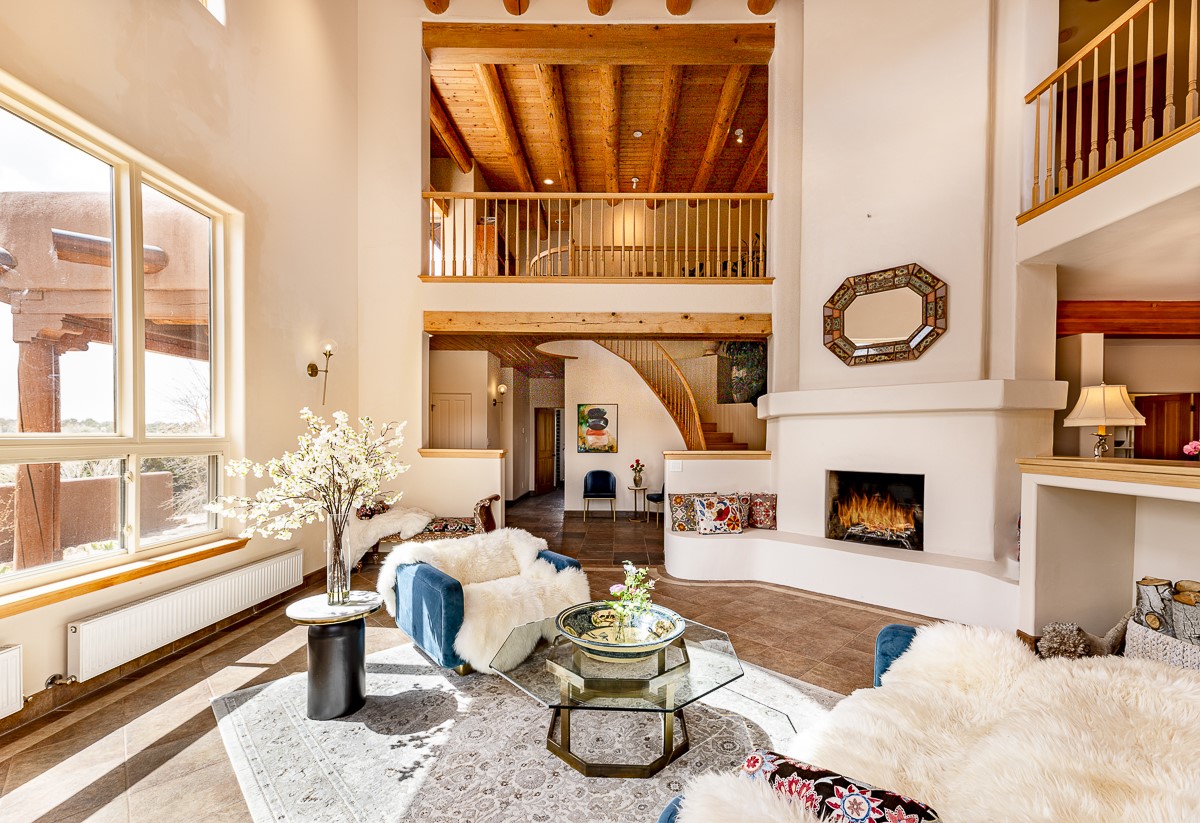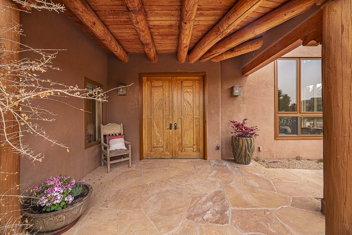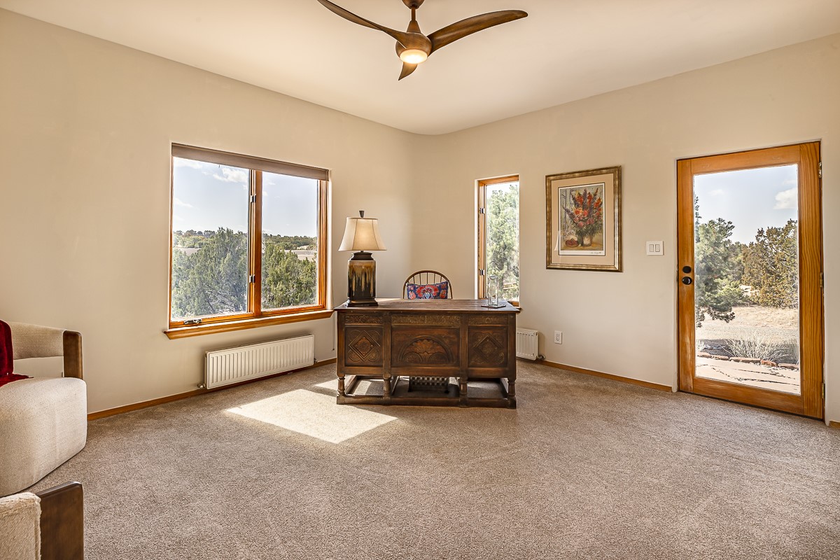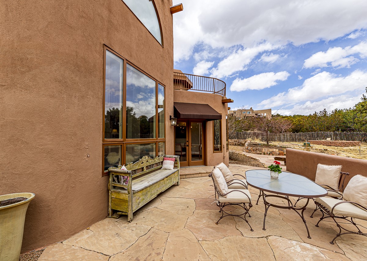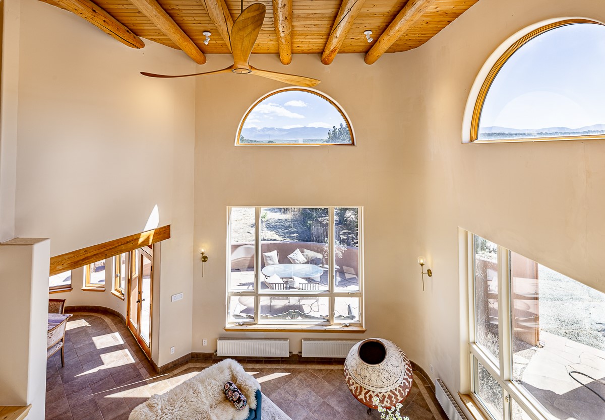 Welcome to the tranquil community of La Mariposa - at a great price! This light filled home has been extensively updated with beautiful, new hardwood floors, new lighting, a hot water on demand water heater, and hot water baseboard heat to the studio. The primary bedroom suite offers a private patio with stunning views of the Sangre de Cristo Mountains. With outdoor patios throughout, this home offers lots of privacy and serenity. The open concept kitchen is quite spacious for gatherings, with a large pantry and intimate seating areas. The back portal, located off of the dining room, is perfect for outdoor dining during the warm weather, with a water fountain nearby. The mature gardens surrounding the home are breathtaking in bloom and include mature apple, peach, cherry, and pear trees. There is also a greywater system for the landscaping. The heated studio is privately located off the garage with its own exterior entrances. There are no steps from the studio and throughout the first floor of the house. This home has lots to offer!