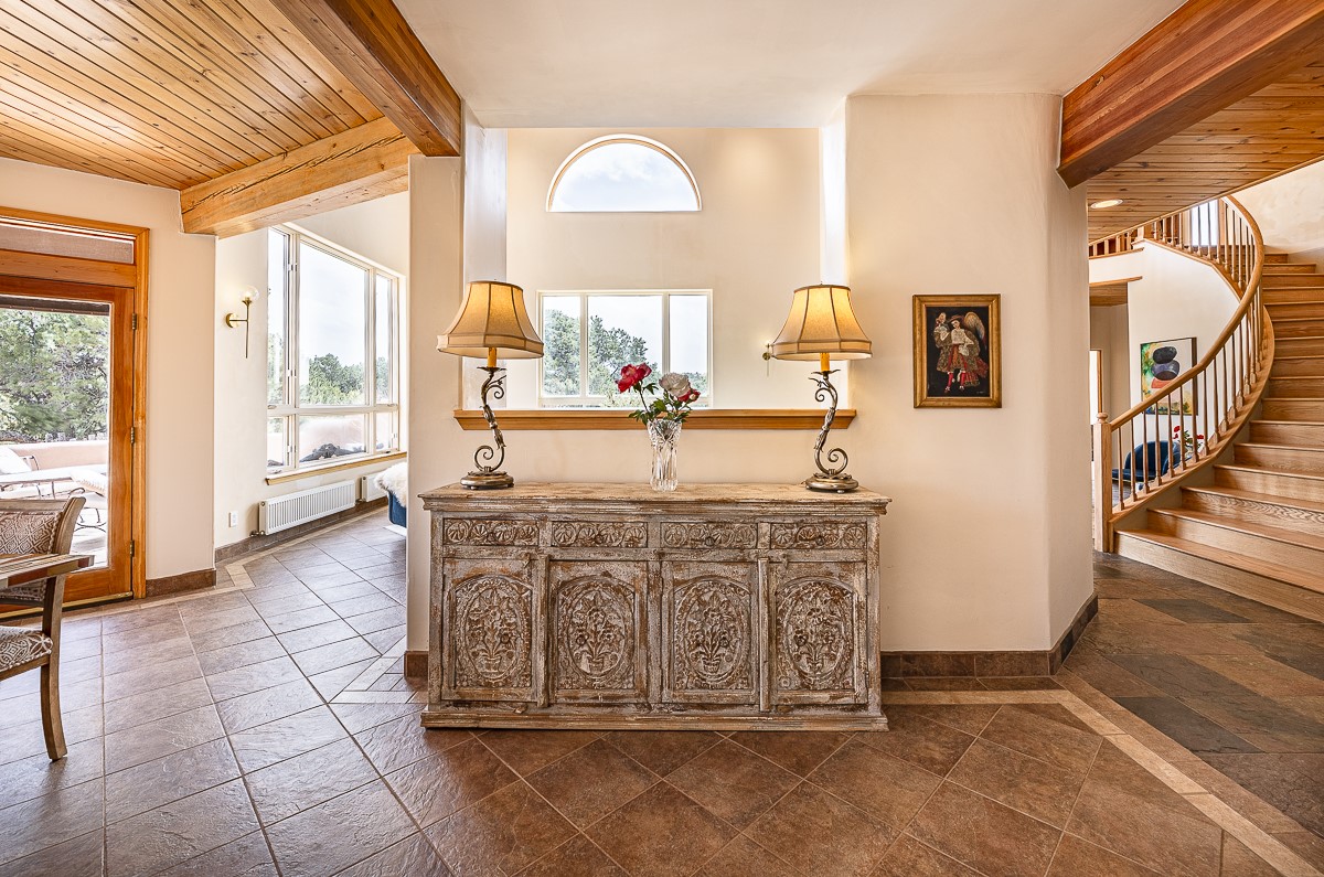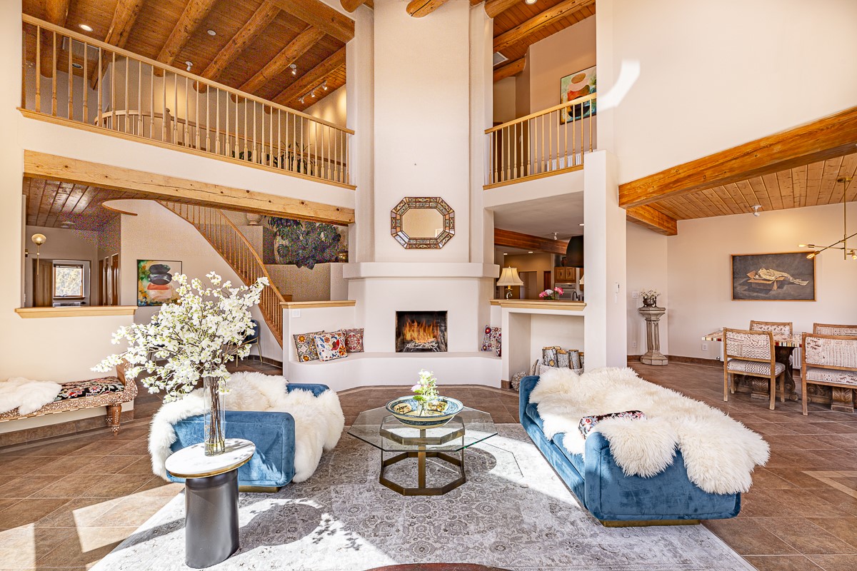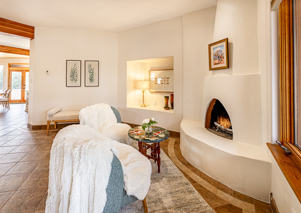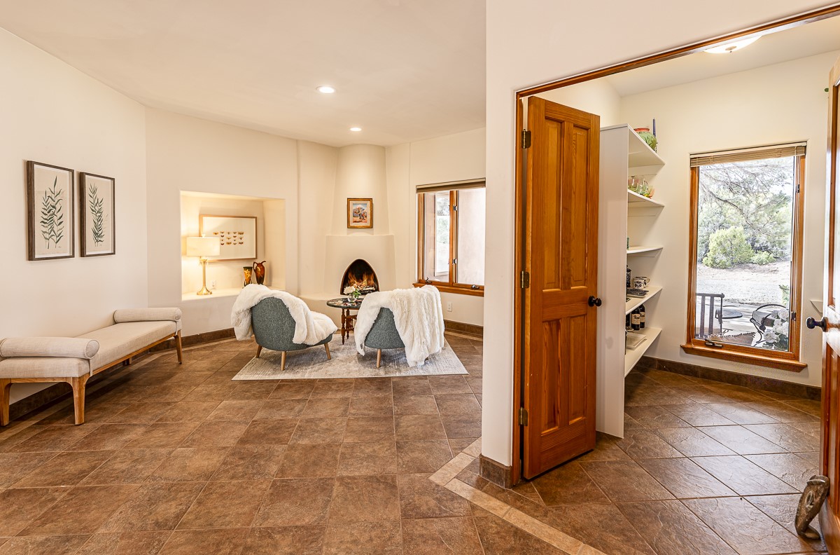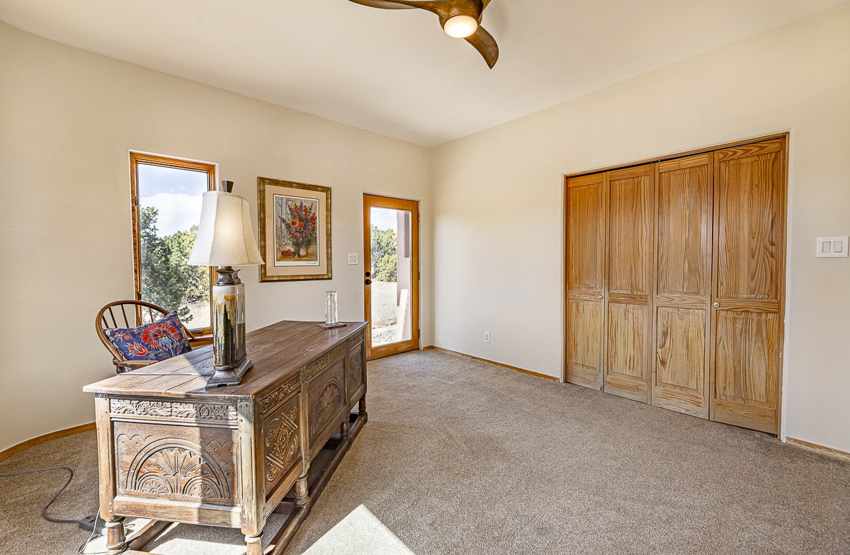 Welcome to the tranquil community of La Mariposa - at a great price! This light filled home has been extensively updated with beautiful, new hardwood floors, new lighting, a hot water on demand water heater, and hot water baseboard heat to the studio. The primary bedroom suite offers a private patio with stunning views of the Sangre de Cristo Mountains. With outdoor patios throughout, this home offers lots of privacy and serenity. The open concept kitchen is quite spacious for gatherings, with a large pantry and intimate seating areas. The back portal, located off of the dining room, is perfect for outdoor dining during the warm weather, with a water fountain nearby. The mature gardens surrounding the home are breathtaking in bloom and include mature apple, peach, cherry, and pear trees. There is also a greywater system for the landscaping. The heated studio is privately located off the garage with its own exterior entrances. There are no steps from the studio and throughout the first floor of the house. This home has lots to offer!