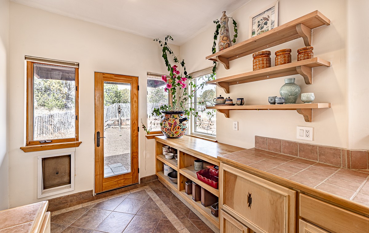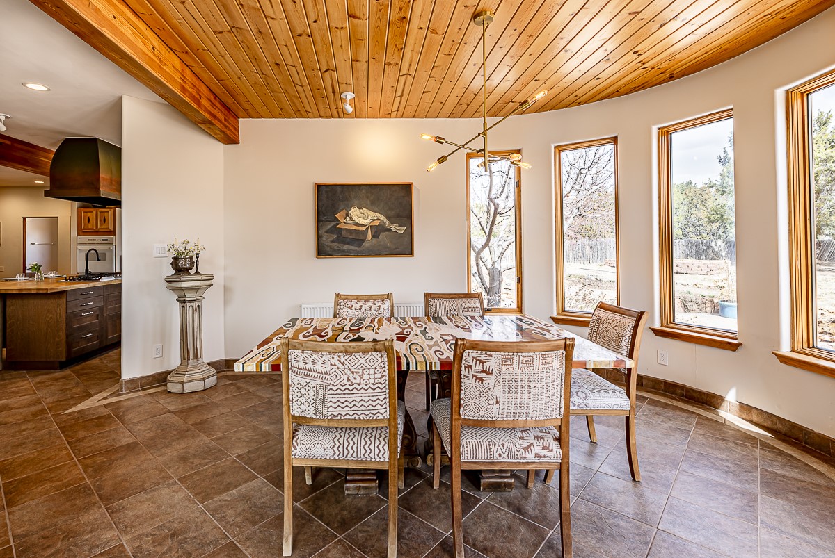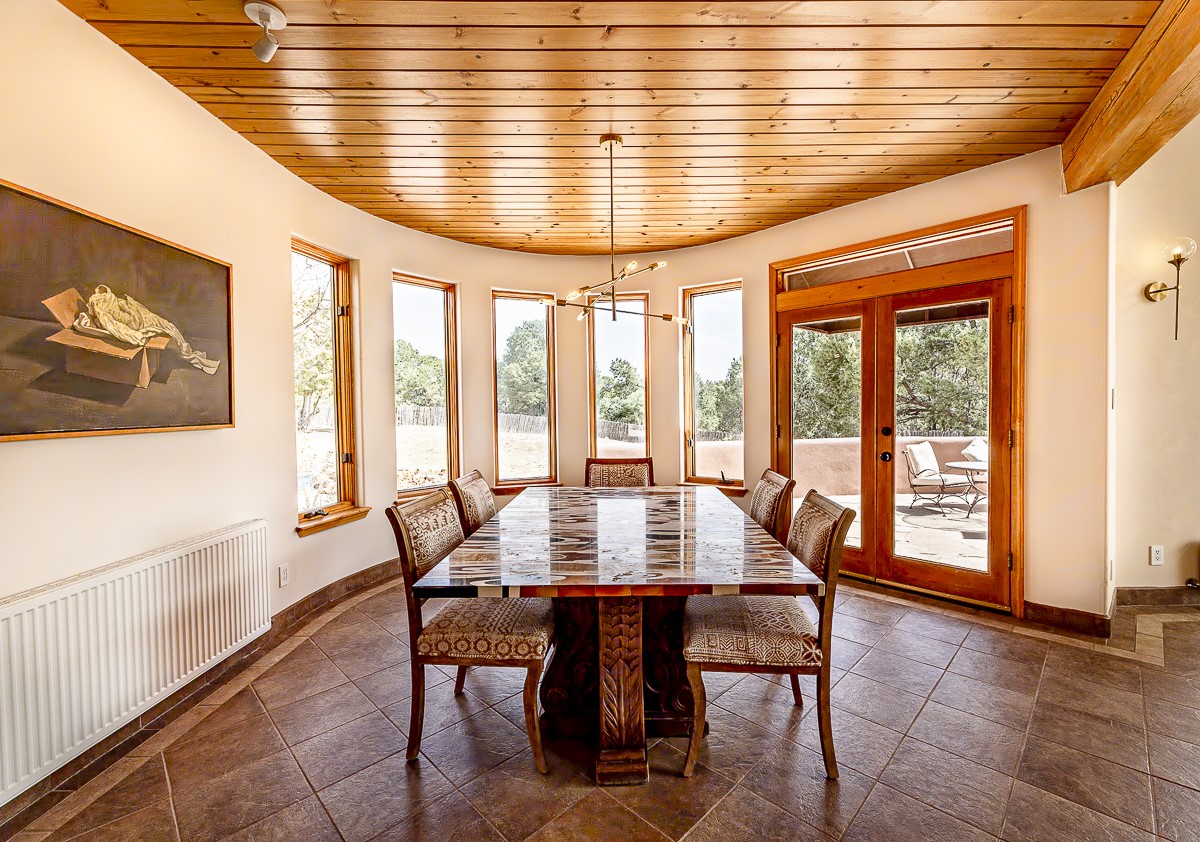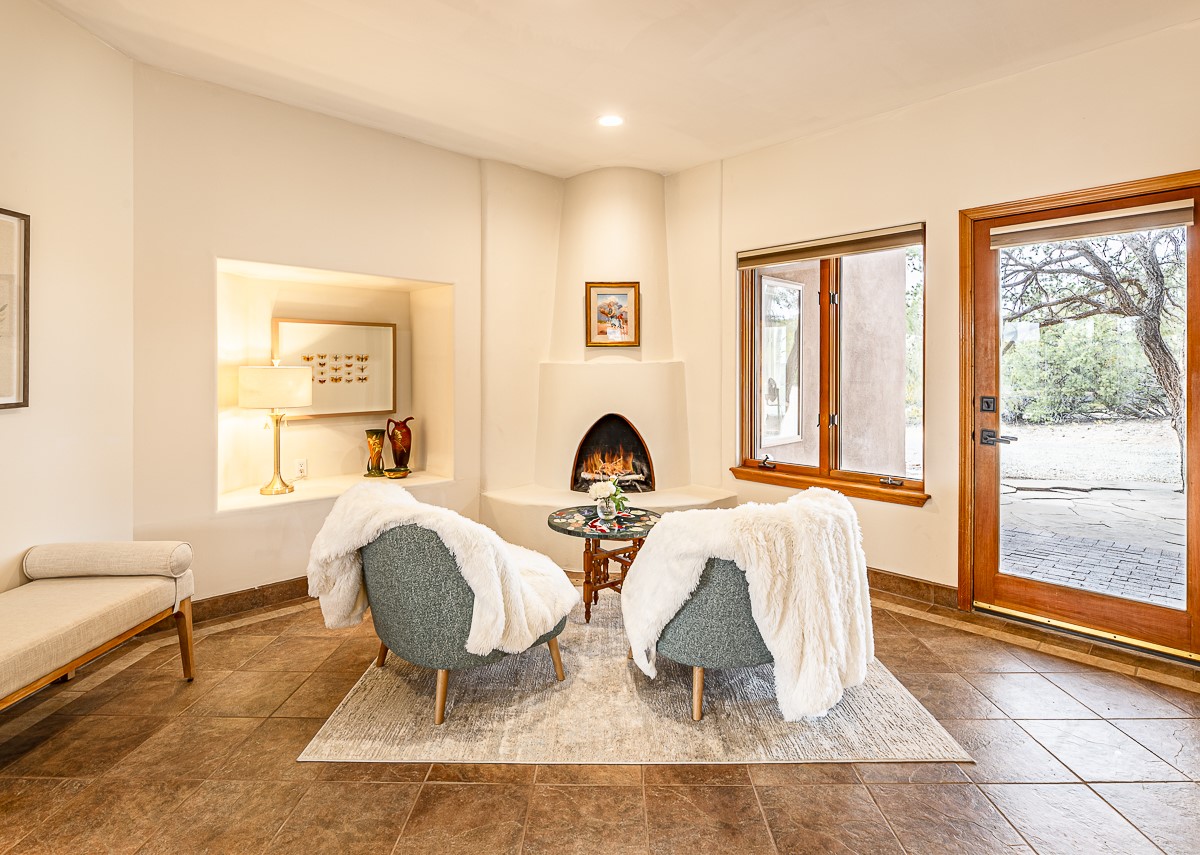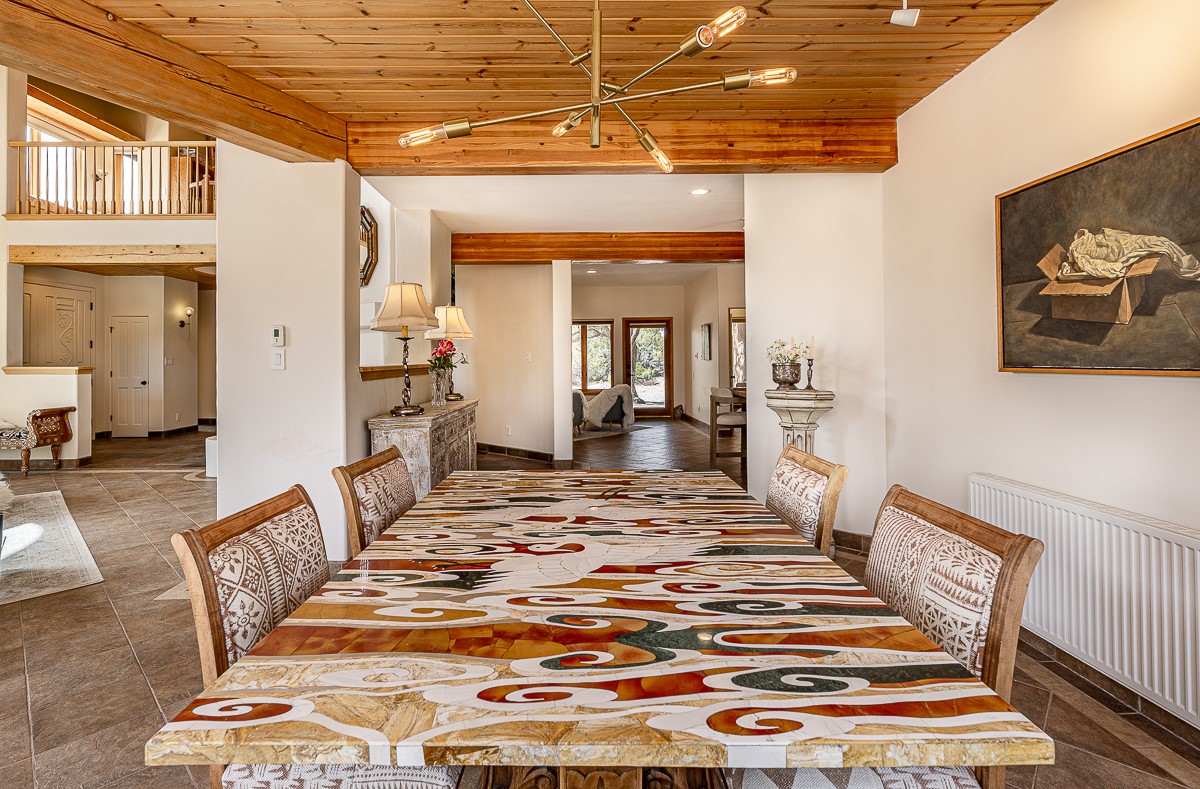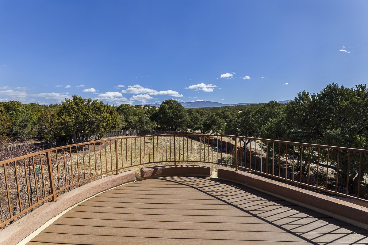 Welcome to the tranquil community of La Mariposa - at a great price! This light filled home has been extensively updated with beautiful, new hardwood floors, new lighting, a hot water on demand water heater, and hot water baseboard heat to the studio. The primary bedroom suite offers a private patio with stunning views of the Sangre de Cristo Mountains. With outdoor patios throughout, this home offers lots of privacy and serenity. The open concept kitchen is quite spacious for gatherings, with a large pantry and intimate seating areas. The back portal, located off of the dining room, is perfect for outdoor dining during the warm weather, with a water fountain nearby. The mature gardens surrounding the home are breathtaking in bloom and include mature apple, peach, cherry, and pear trees. There is also a greywater system for the landscaping. The heated studio is privately located off the garage with its own exterior entrances. There are no steps from the studio and throughout the first floor of the house. This home has lots to offer!