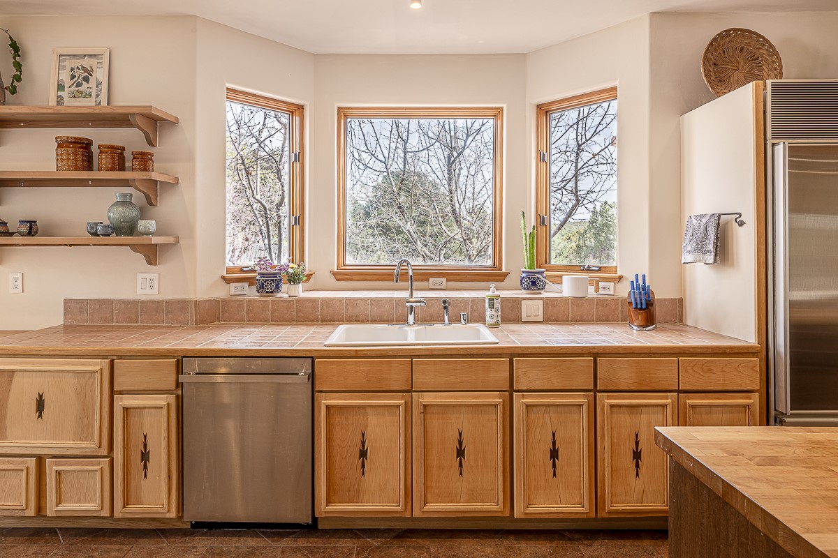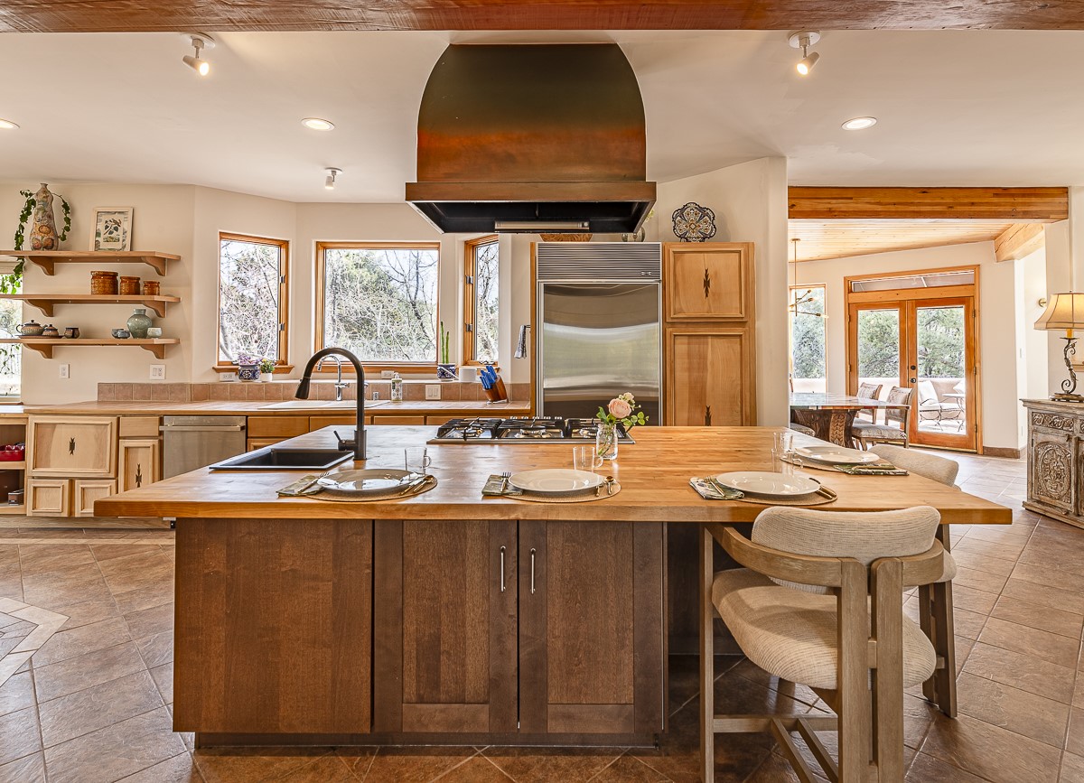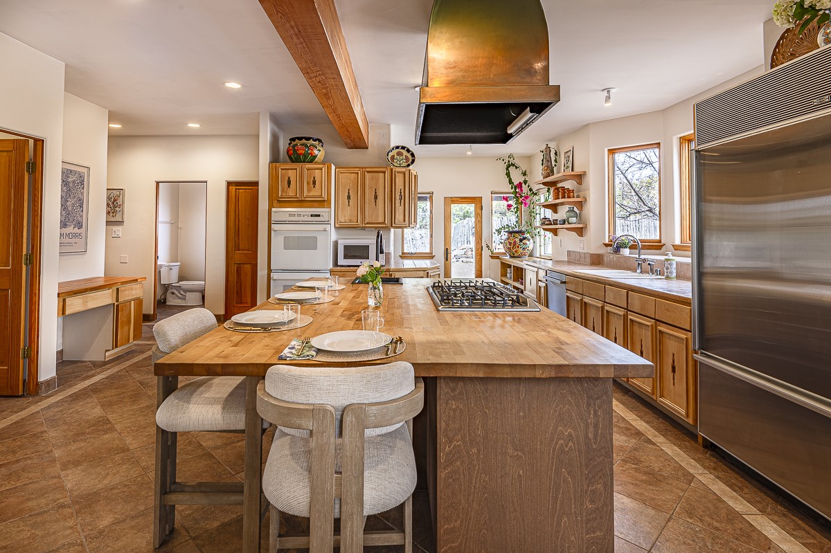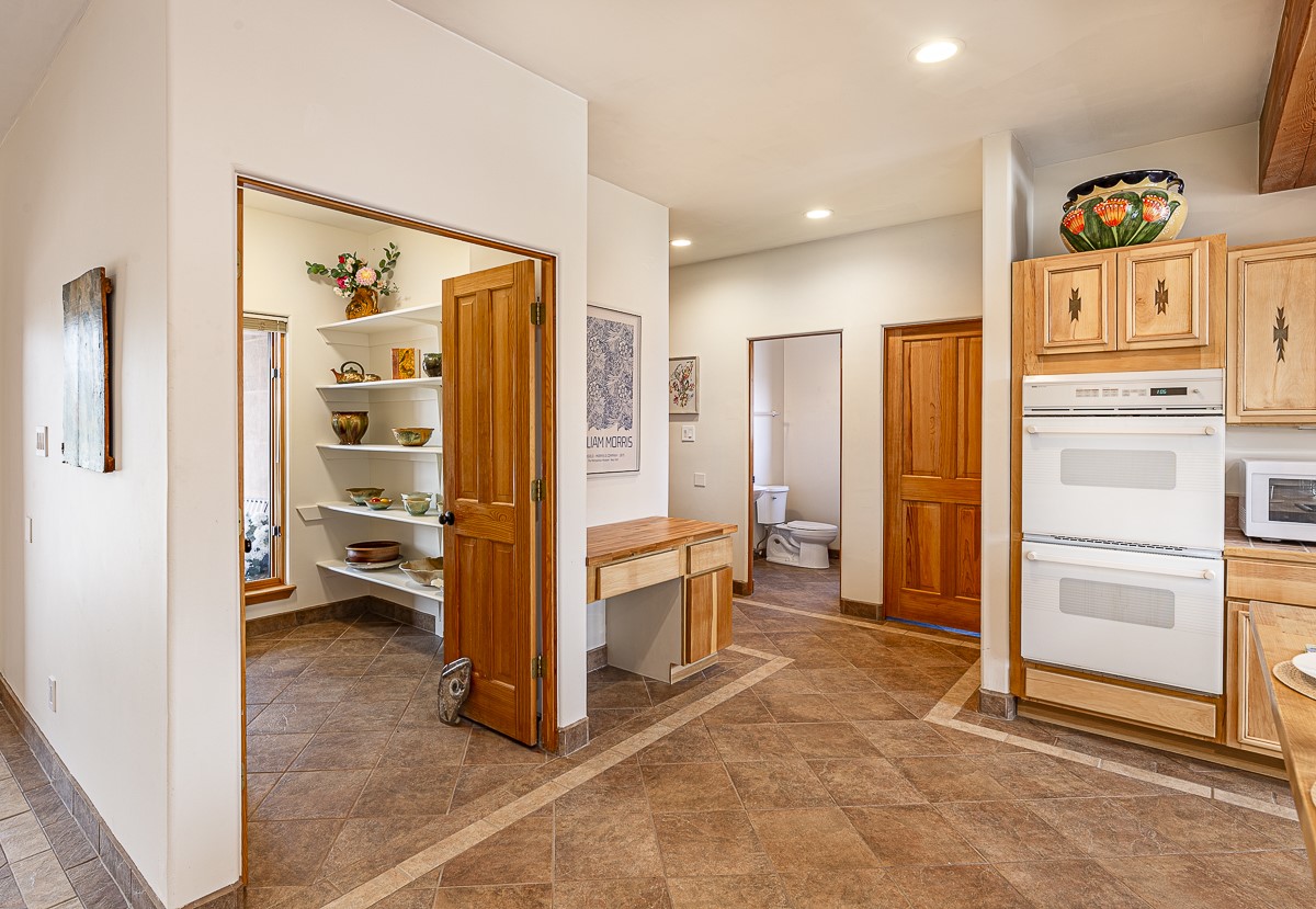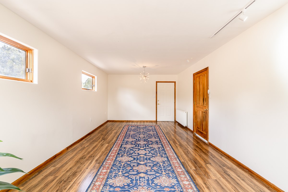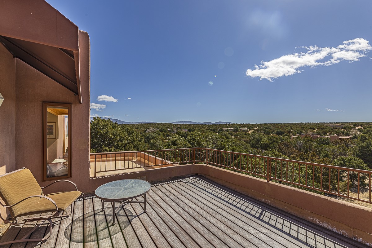 Welcome to the tranquil community of La Mariposa - at a great price! This light filled home has been extensively updated with beautiful, new hardwood floors, new lighting, a hot water on demand water heater, and hot water baseboard heat to the studio. The primary bedroom suite offers a private patio with stunning views of the Sangre de Cristo Mountains. With outdoor patios throughout, this home offers lots of privacy and serenity. The open concept kitchen is quite spacious for gatherings, with a large pantry and intimate seating areas. The back portal, located off of the dining room, is perfect for outdoor dining during the warm weather, with a water fountain nearby. The mature gardens surrounding the home are breathtaking in bloom and include mature apple, peach, cherry, and pear trees. There is also a greywater system for the landscaping. The heated studio is privately located off the garage with its own exterior entrances. There are no steps from the studio and throughout the first floor of the house. This home has lots to offer!