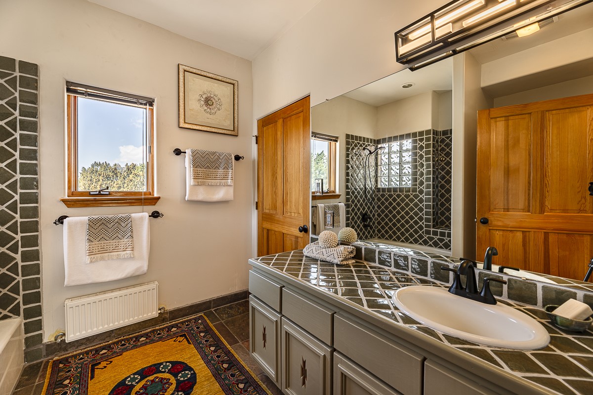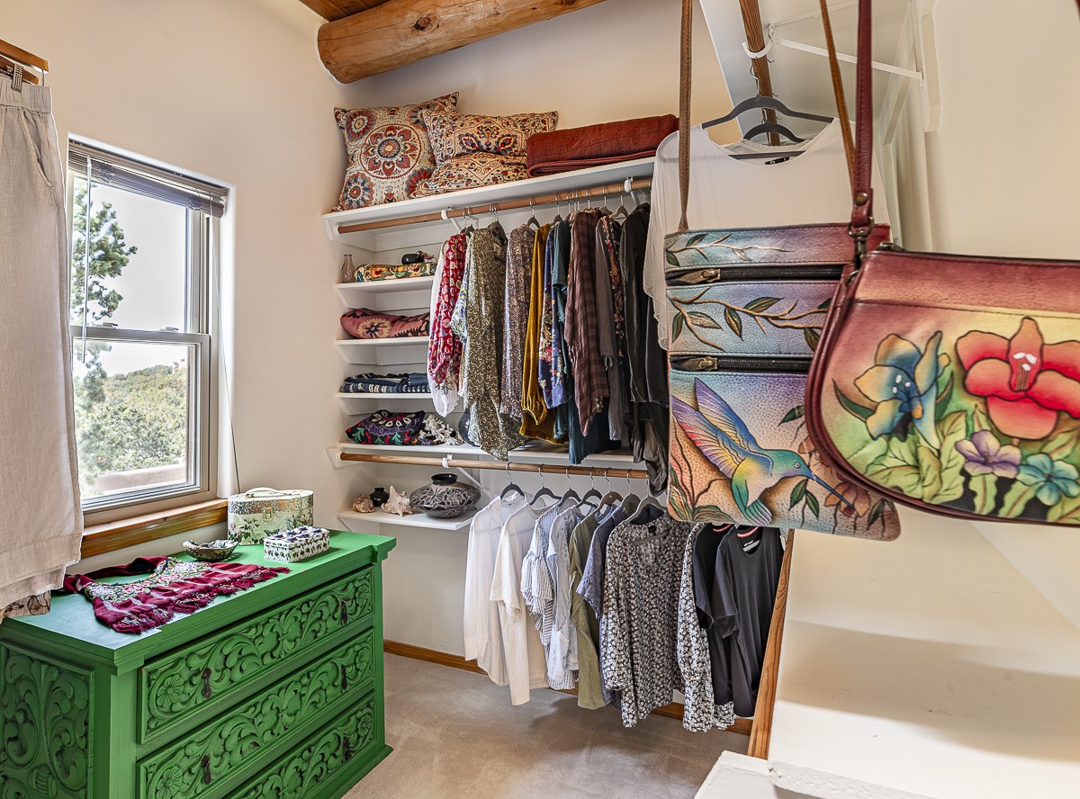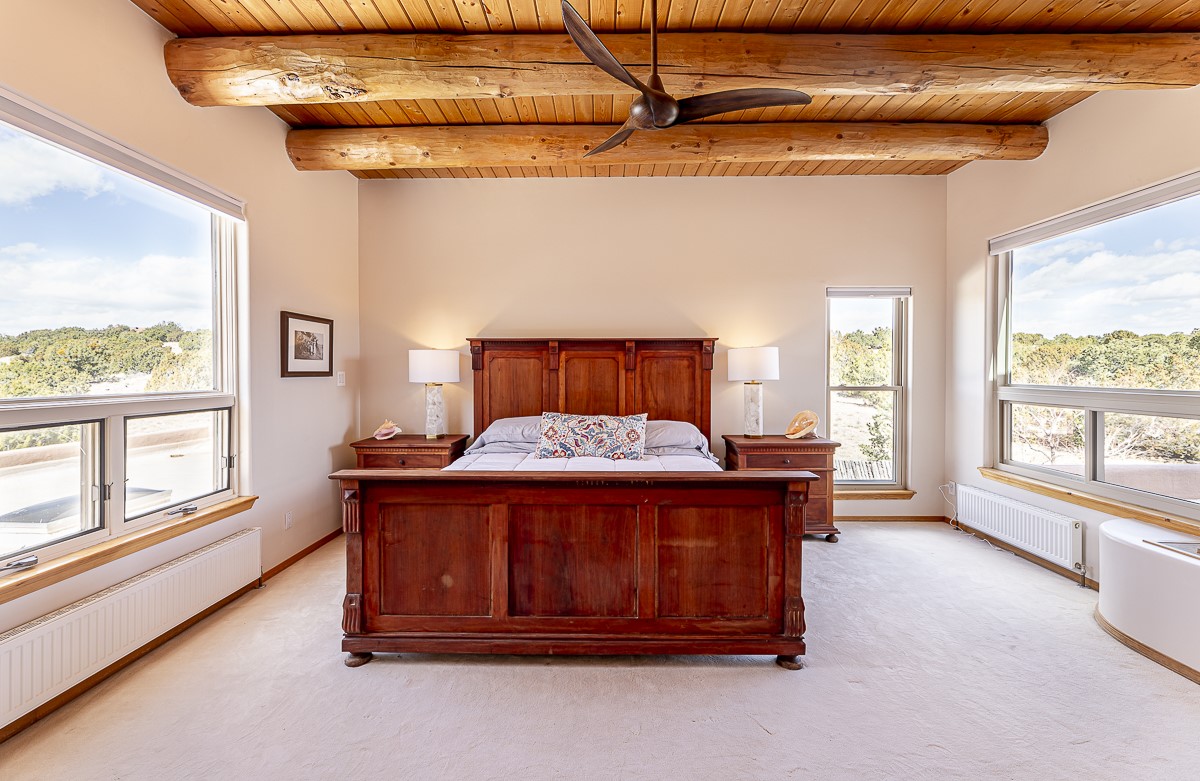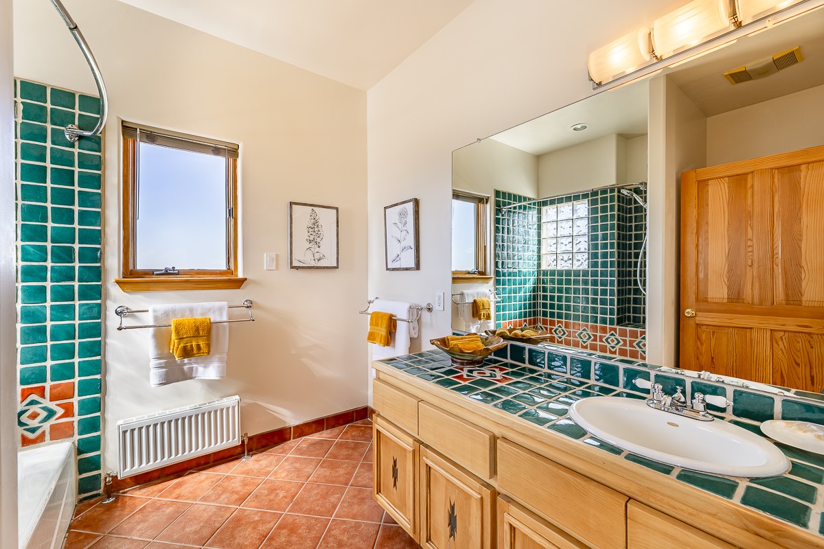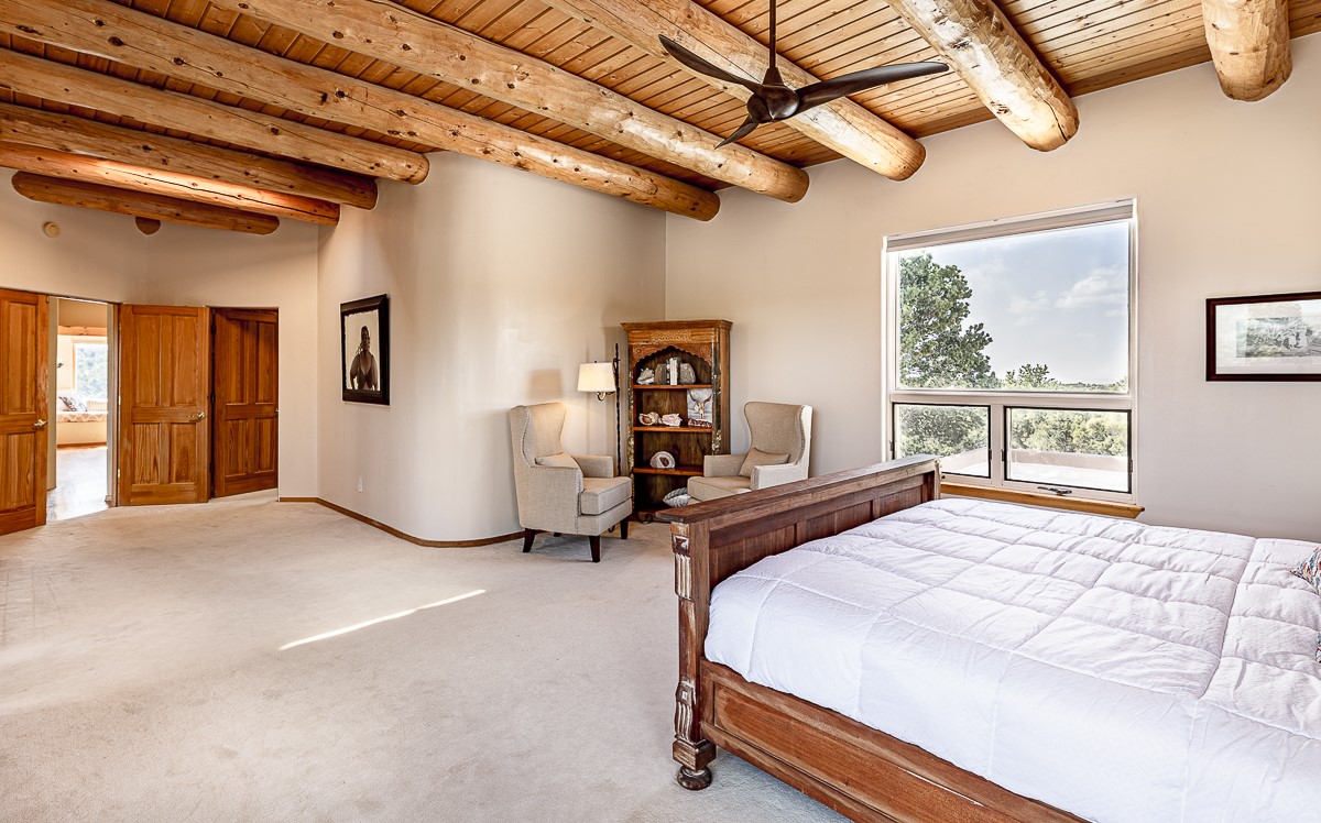 Welcome to the tranquil community of La Mariposa - at a great price! This light filled home has been extensively updated with beautiful, new hardwood floors, new lighting, a hot water on demand water heater, and hot water baseboard heat to the studio. The primary bedroom suite offers a private patio with stunning views of the Sangre de Cristo Mountains. With outdoor patios throughout, this home offers lots of privacy and serenity. The open concept kitchen is quite spacious for gatherings, with a large pantry and intimate seating areas. The back portal, located off of the dining room, is perfect for outdoor dining during the warm weather, with a water fountain nearby. The mature gardens surrounding the home are breathtaking in bloom and include mature apple, peach, cherry, and pear trees. There is also a greywater system for the landscaping. The heated studio is privately located off the garage with its own exterior entrances. There are no steps from the studio and throughout the first floor of the house. This home has lots to offer!
