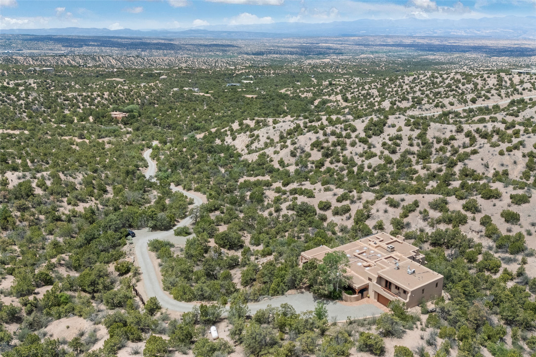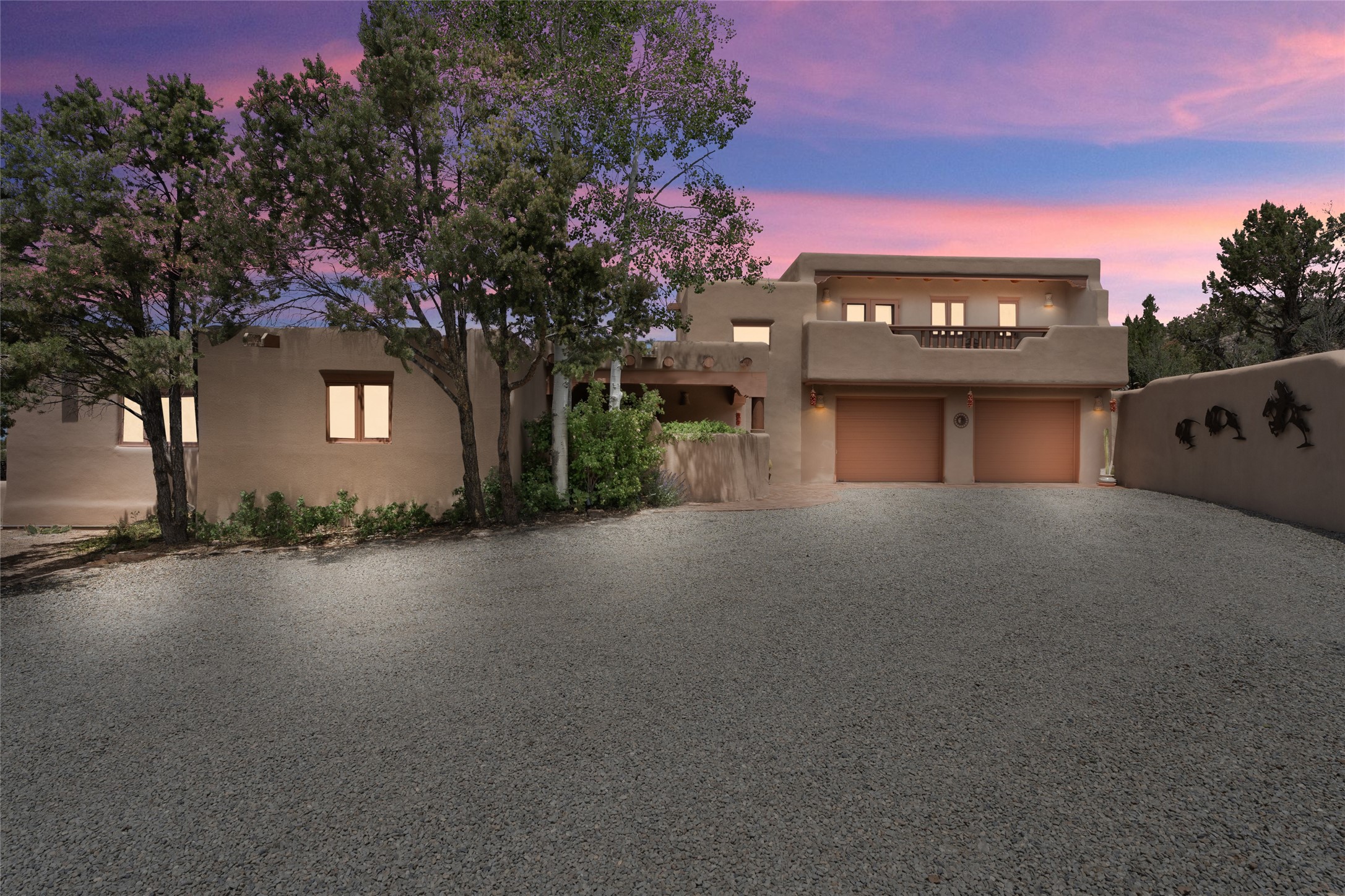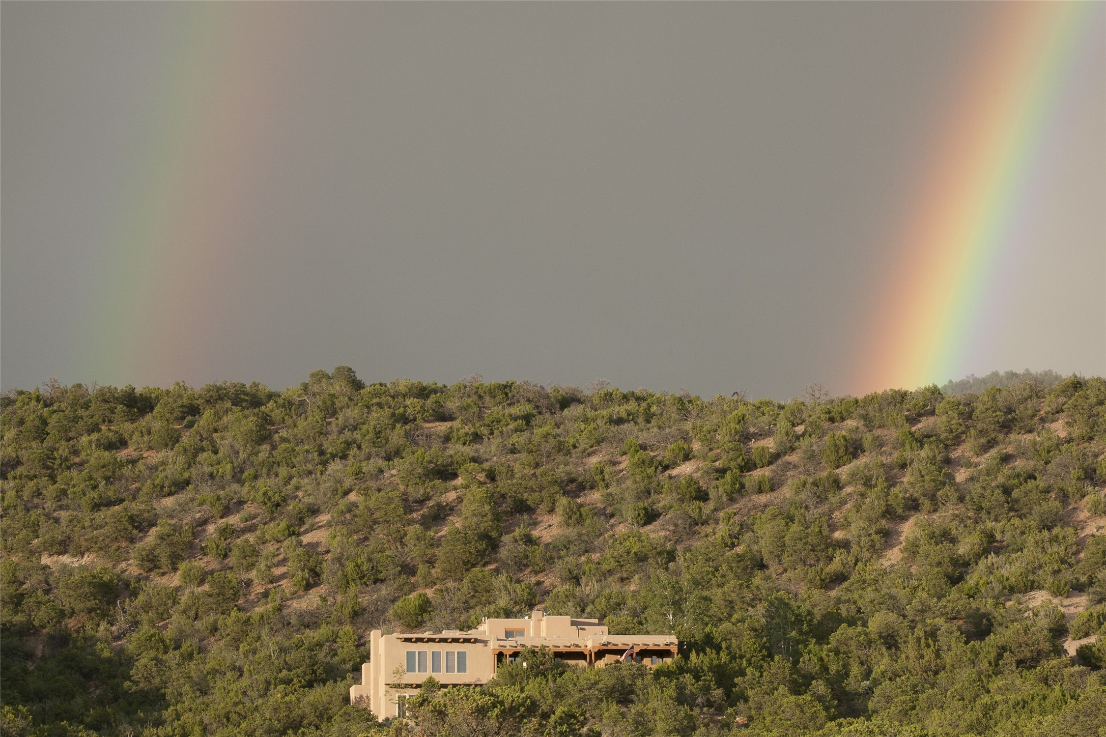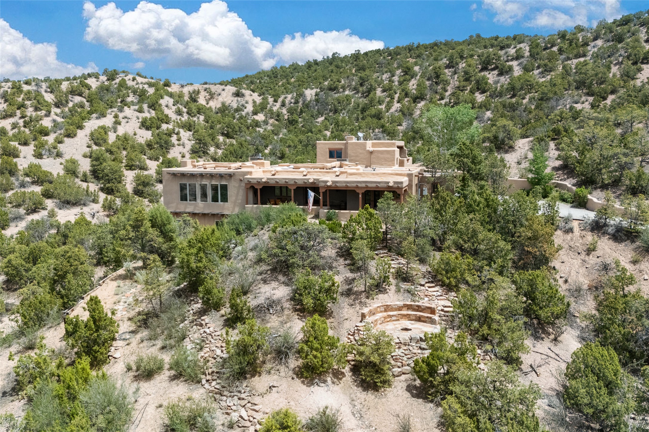 She said, " I want a gorgeous big house with room for all our family, with spaces for various activities, totally private on some land with fabulous views, and only about 15 minutes to the plaza." He replied, "Then let's live on Love Street, Camino Amor." Impressive construction, beautiful finishes, and thoughtful features for happy, comfortable living in beauty. Located in prestigious, Los Caminitos. A classic Santa Fe Style Hacienda sits atop a glorious ridgeline on 27 lush, private acres surrounded by luxurious green hills with views that go on forever and ever. Private. This is easy living, stylishly, with easy entertaining flowing through spacious rooms with high finished ceilings and all of the Santa Fe touches; vigas, corbels, lintels, nichos and bancos that enhance this happy ambience. 5 bedrooms suites a 6th powder room with a nice separation of spaces comfortably accommodate all your family and friends! Otherwise, most of your living is on the main floor! It is silent here...You can hear the cicadas and the bluebirds, and see millions of stars at night in the dark sky sitting on stone bancos around the stunning firepit. You can be alone with the universe here. This impeccably maintained home is move-in ready now as it is, or you could take it to the next level and create a showplace. As an owner in this lovely gated community of Los Caminitos, you will be a member of the private Los Caminitos Clubouse with pool, tennis, pickleball, barbecue facilities and private party house for members use. (Los Caminitos.com, for complete HOA information), A stones throw to the elegant Four Seasons Encantado Resort, and about 12 minutes to the plaza, you are sure to come back home to peace, serenity, and love here on Camino Amor.