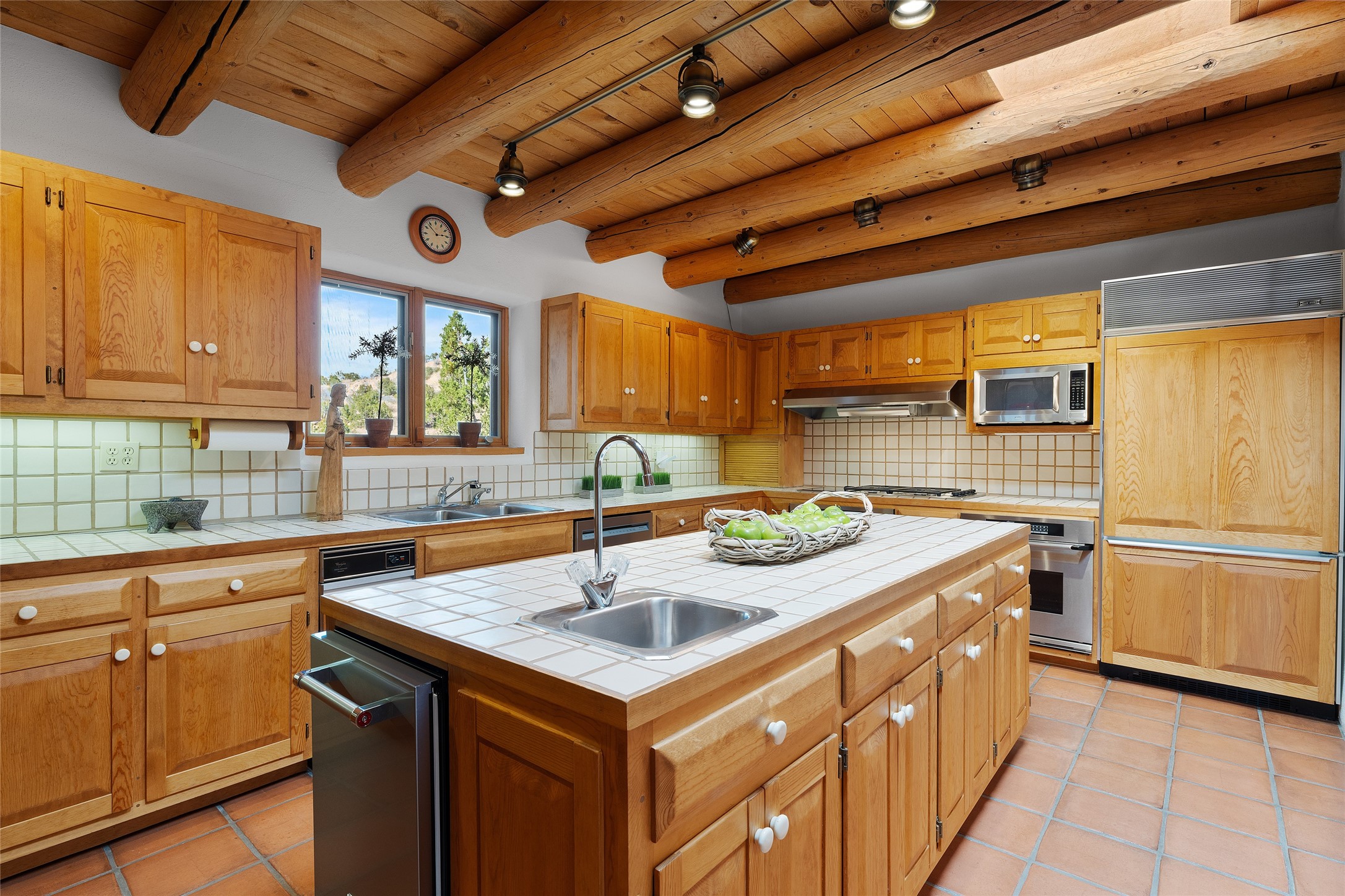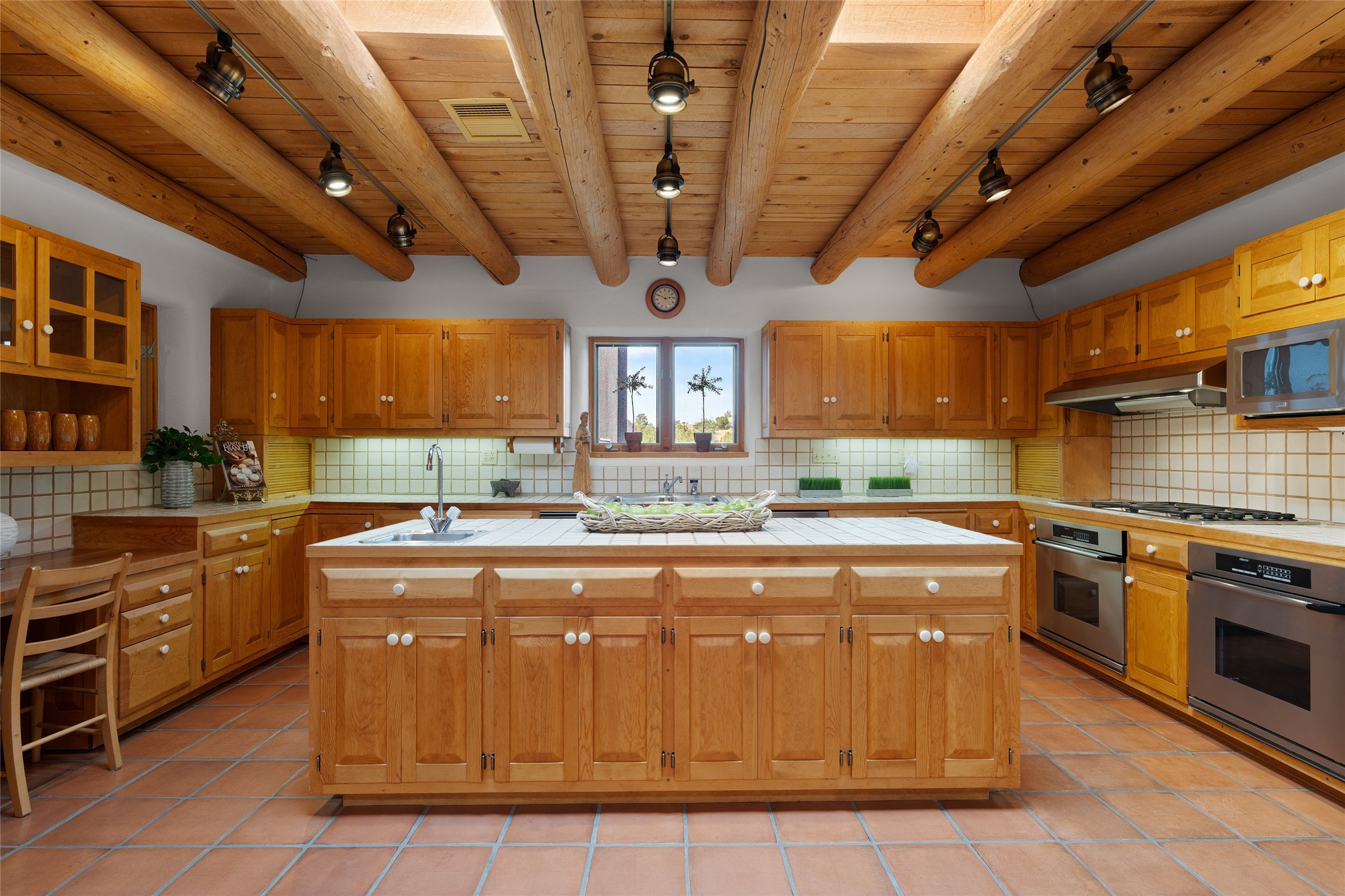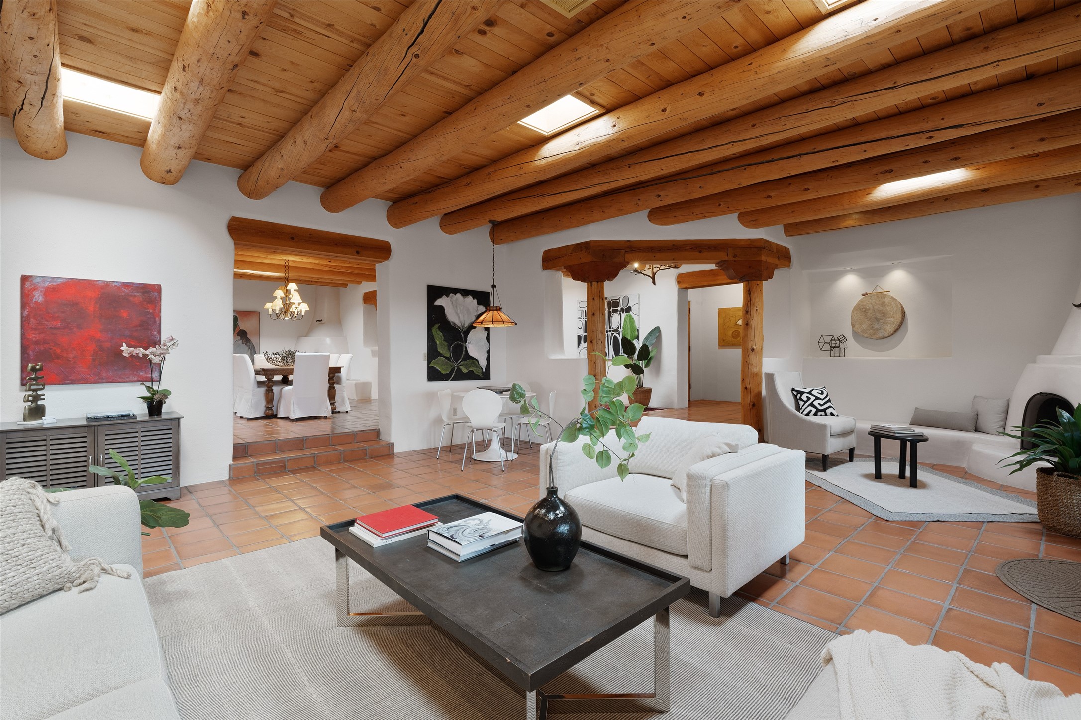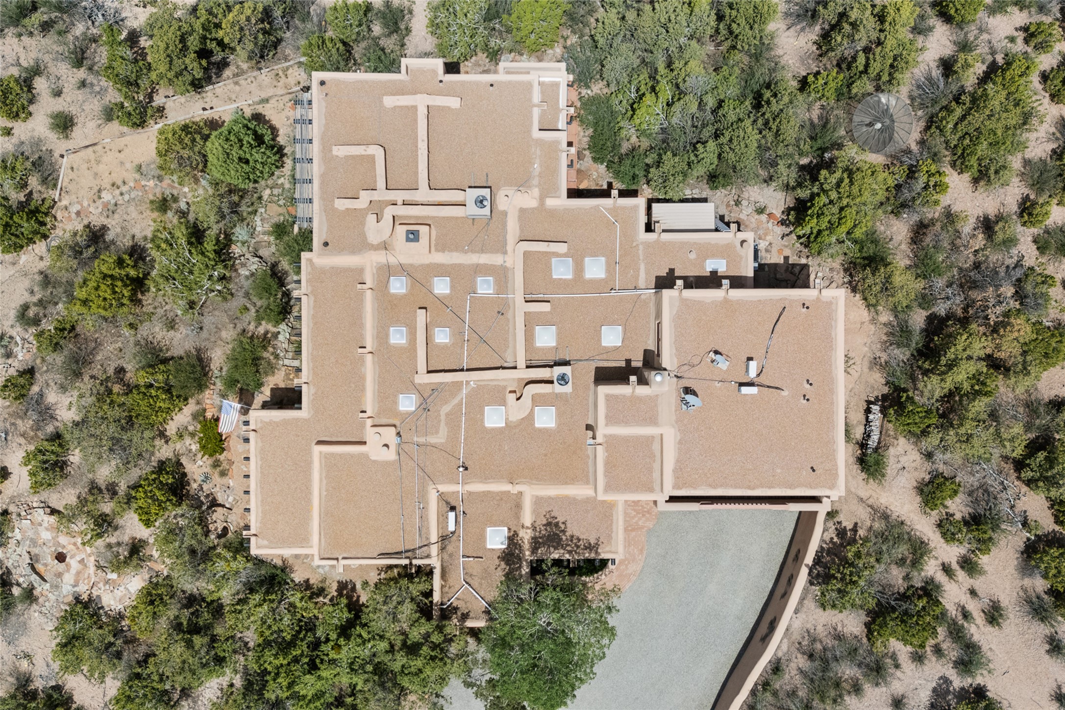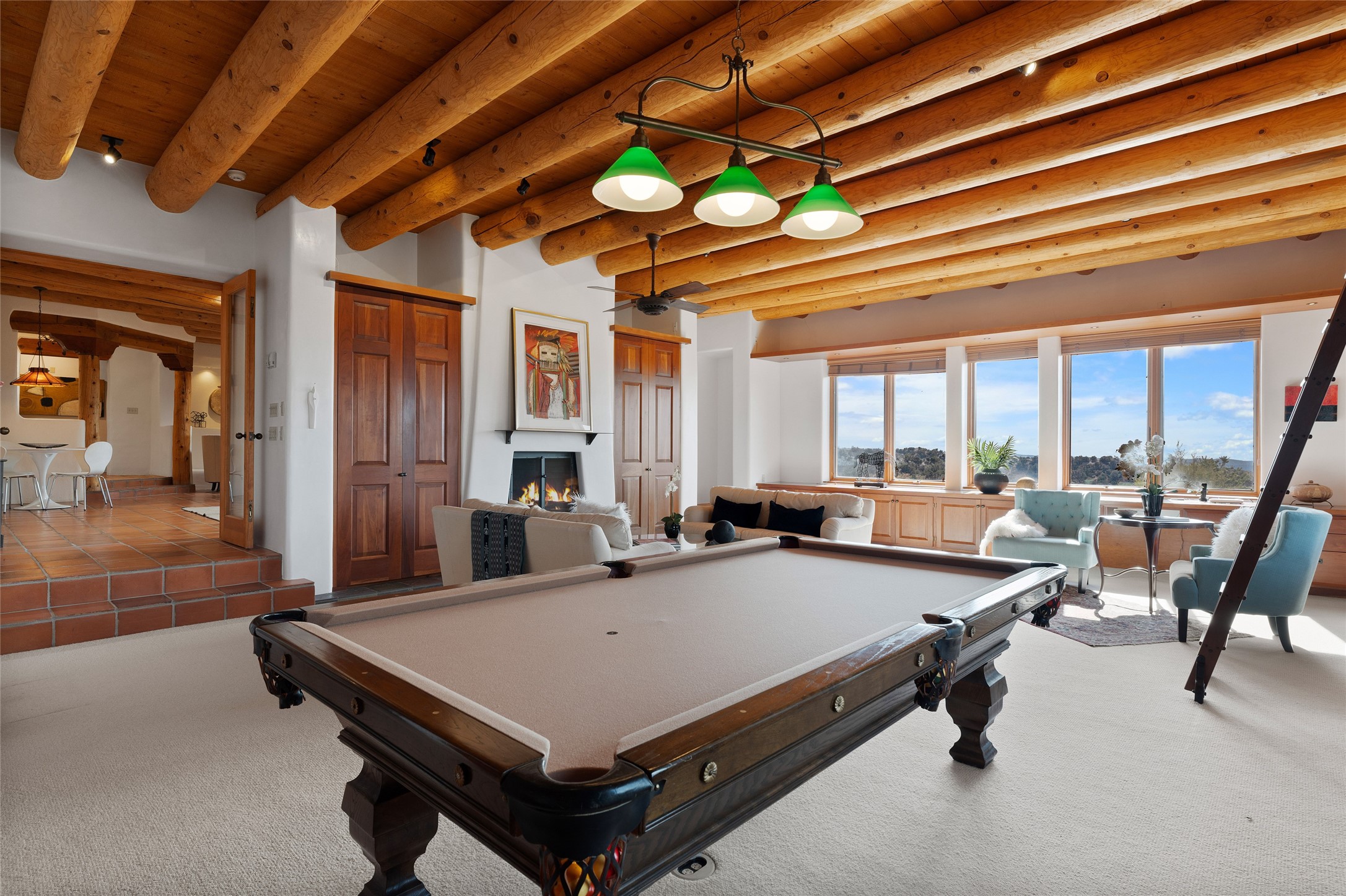 She said, " I want a gorgeous big house with room for all our family, with spaces for various activities, totally private on some land with fabulous views, and only about 15 minutes to the plaza." He replied, "Then let's live on Love Street, Camino Amor." Impressive construction, beautiful finishes, and thoughtful features for happy, comfortable living in beauty. Located in prestigious, Los Caminitos. A classic Santa Fe Style Hacienda sits atop a glorious ridgeline on 27 lush, private acres surrounded by luxurious green hills with views that go on forever and ever. Private. This is easy living, stylishly, with easy entertaining flowing through spacious rooms with high finished ceilings and all of the Santa Fe touches; vigas, corbels, lintels, nichos and bancos that enhance this happy ambience. 5 bedrooms suites a 6th powder room with a nice separation of spaces comfortably accommodate all your family and friends! Otherwise, most of your living is on the main floor! It is silent here...You can hear the cicadas and the bluebirds, and see millions of stars at night in the dark sky sitting on stone bancos around the stunning firepit. You can be alone with the universe here. This impeccably maintained home is move-in ready now as it is, or you could take it to the next level and create a showplace. As an owner in this lovely gated community of Los Caminitos, you will be a member of the private Los Caminitos Clubouse with pool, tennis, pickleball, barbecue facilities and private party house for members use. (Los Caminitos.com, for complete HOA information), A stones throw to the elegant Four Seasons Encantado Resort, and about 12 minutes to the plaza, you are sure to come back home to peace, serenity, and love here on Camino Amor.