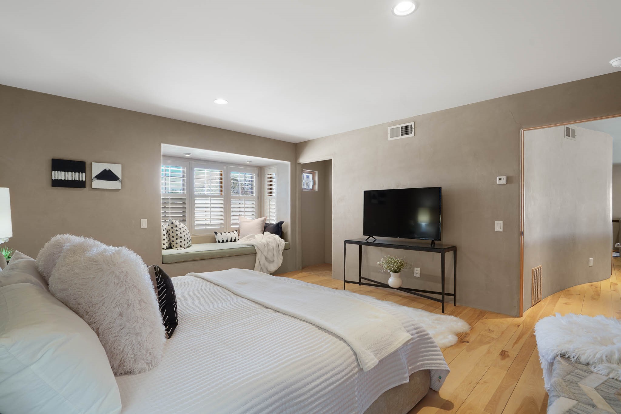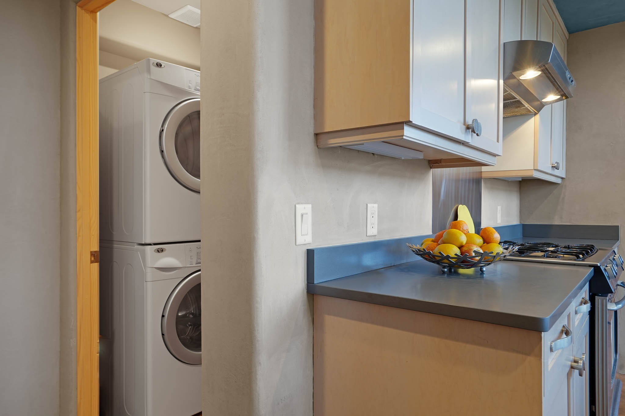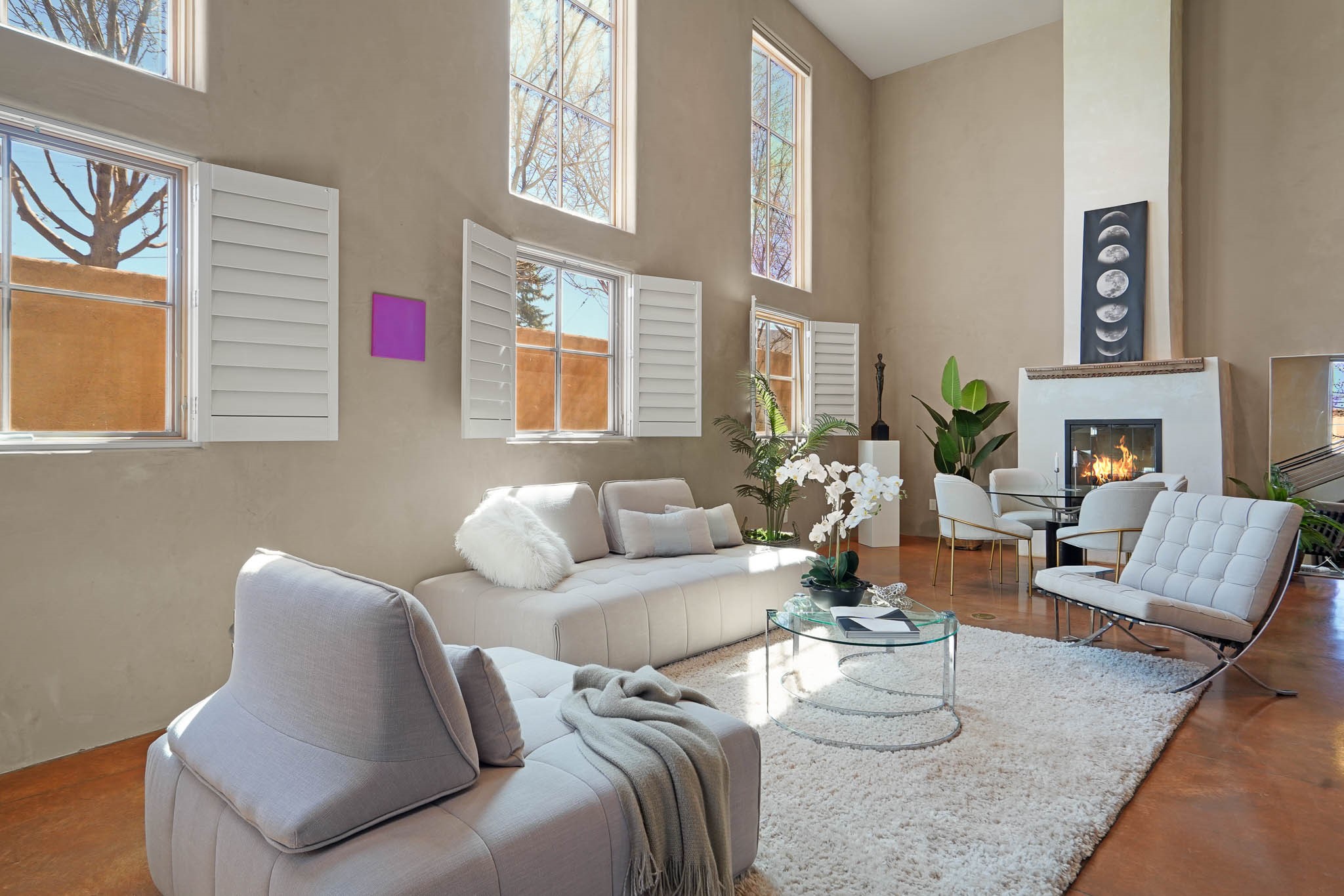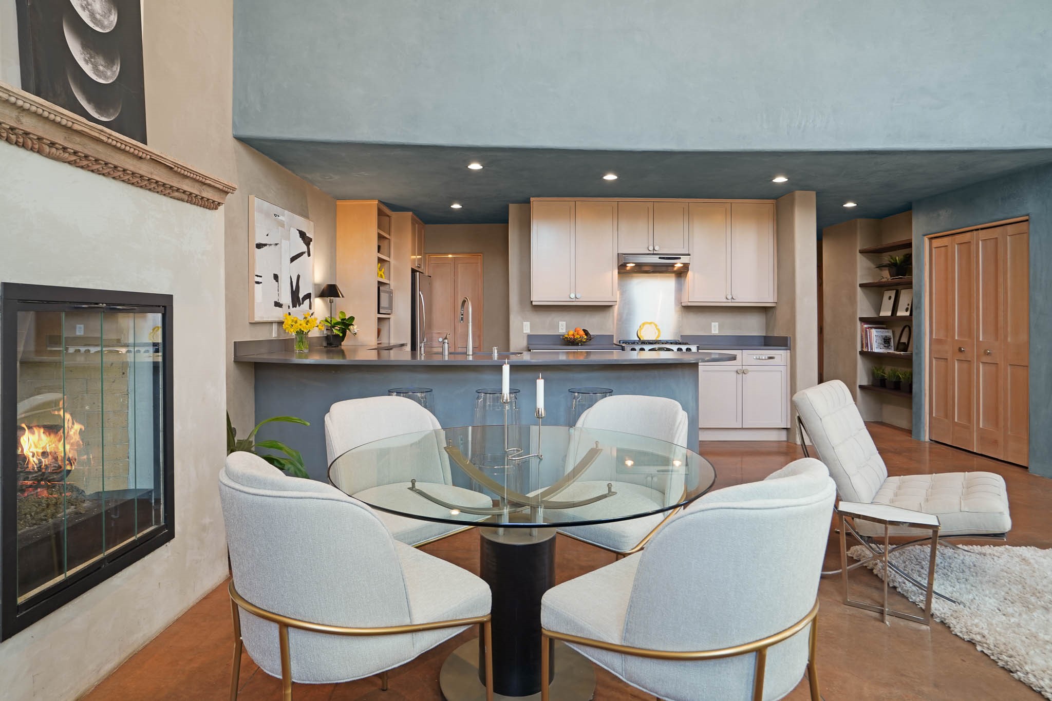 Stylish and thoughtfully designed, this light-filled condo is just steps from Kaune's neighborhood market and within walking distance of many of Santa Fe's most popular destinations. Offering a blend of modern comfort and Southwest charm, this home is perfect for those seeking convenience, elegance, and versatility. A private, gated front courtyard, shaded by beautiful Aspen trees, creates a peaceful entry and a perfect, quiet spot to enjoy morning coffee or evening relaxation. Inside, the main level features an open-concept living space with soaring ceilings, large windows, and American clay walls that enhance the natural light. A gas log fireplace adds warmth and ambiance, while the chef's kitchen boasts high-end appliances, a spacious island ideal for entertaining, and a generous pantry. A separate laundry room provides additional convenience. Also on the first floor, a guest bedroom and full bathroom offer privacy for visitors, and a stylish powder room sits off the entry for added convenience. A graceful staircase leads to the upper level, where a bright and airy landing serves as the perfect spot for a home office or cozy reading nook. The primary suite is a private retreat, featuring dual closets, a sleek ensuite bathroom, and stunning views. Designed for easy living and low maintenance, this home is an ideal lock-and-leave property. It also features radiant heat, central air conditioning, and a two-car garage--ensuring year-round comfort.Zoned RAC for multi-purpose use, this condo offers exceptional flexibility in a prime location. Schedule your showing today and experience the best of Santa Fe living!