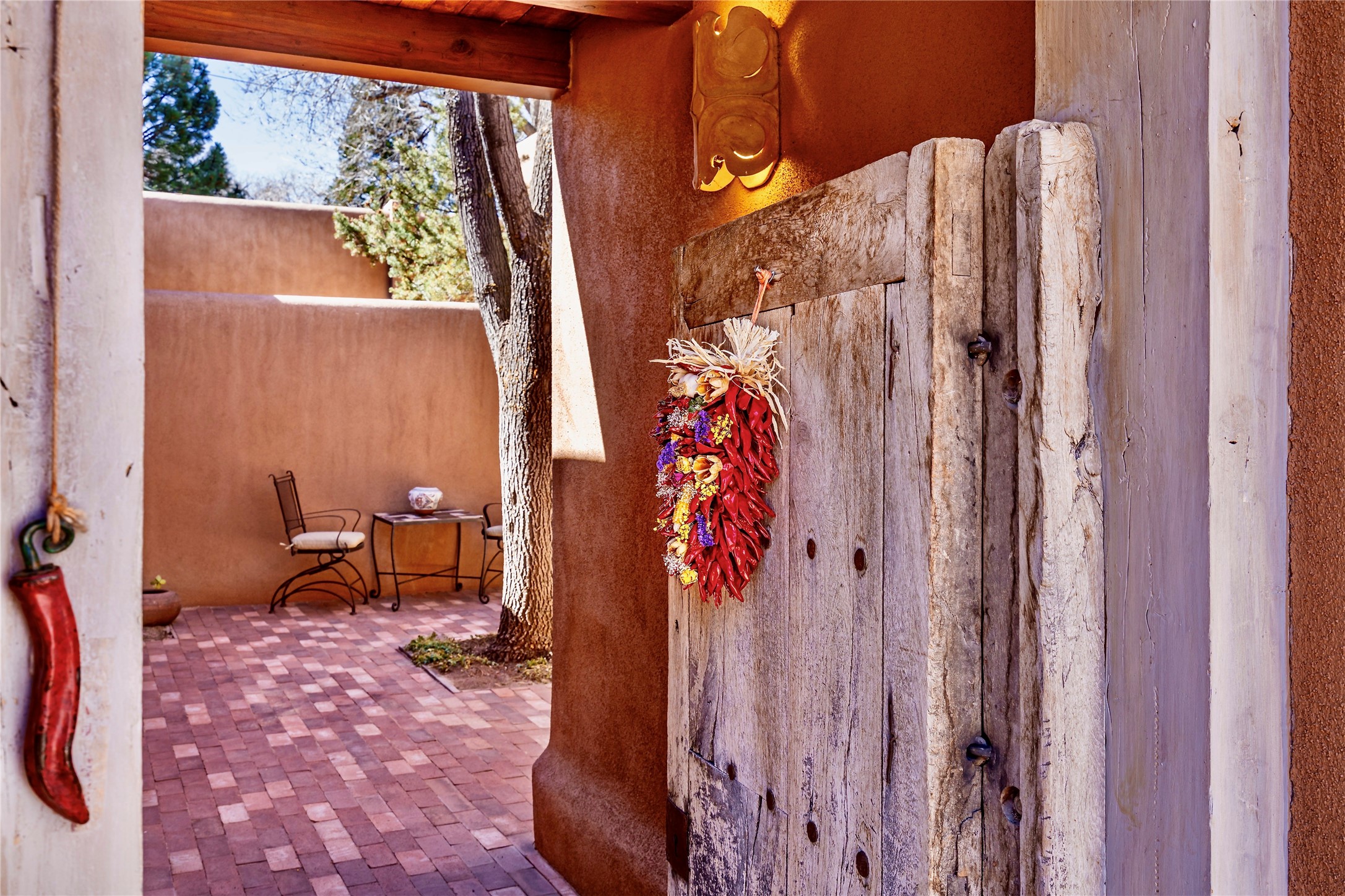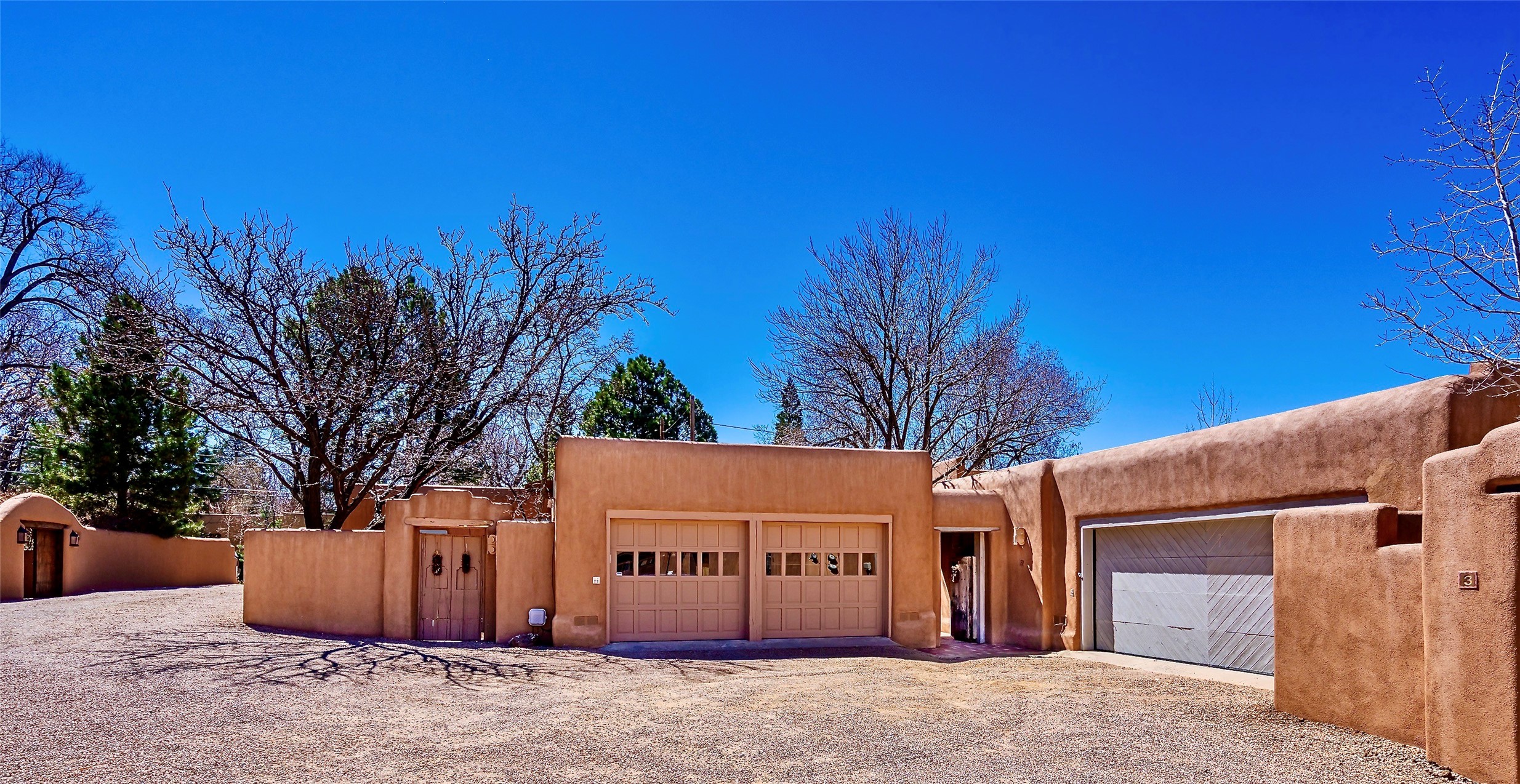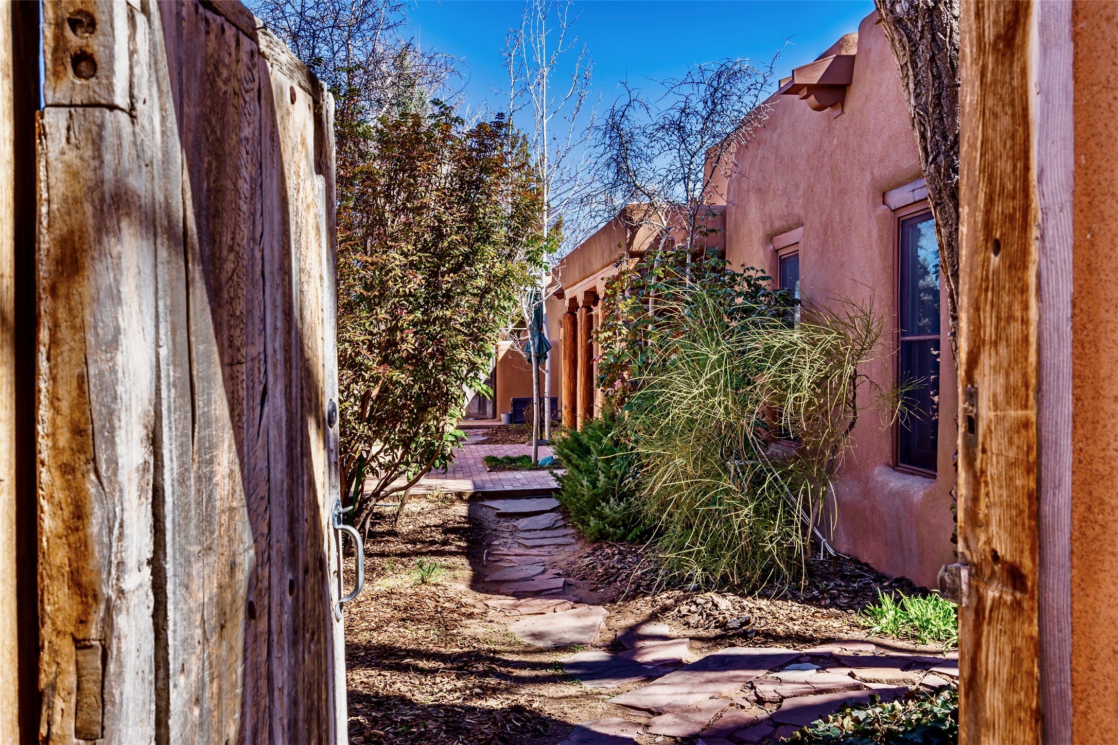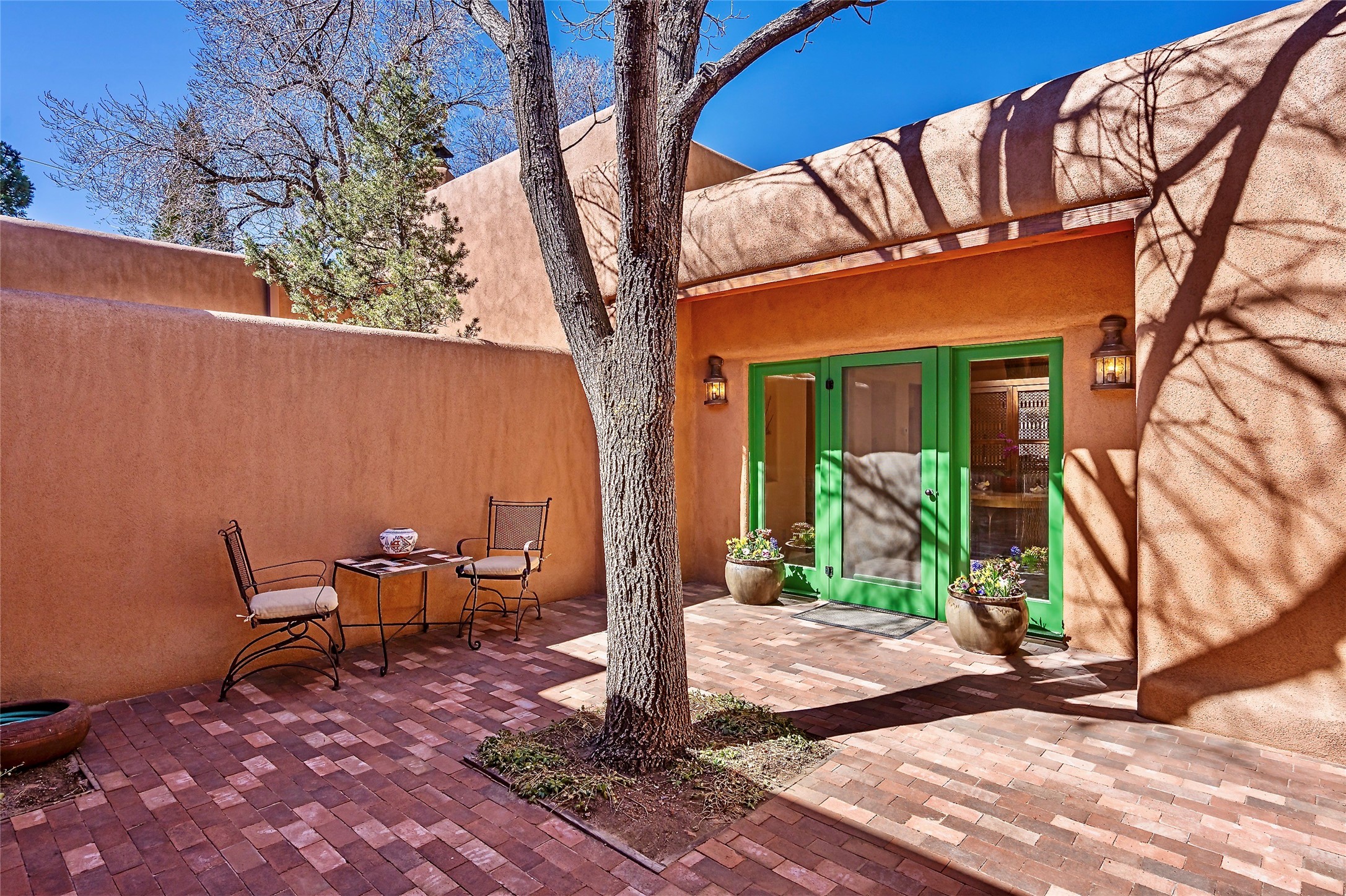 Sensational Acequia Madre Condo in the heart of the historic Eastside. Tucked down a long, private drive in a small 6 unit compound, lies a beautiful, single level, double adobe home featuring specialized features including old Mexican doors, along with the perfect blend of saltillo tile and brick floors. The living room features tall 14 ft coved ceiling with plaster walls, ideal for that very special Santa Fe art collection! This quintessential, corner unit, is fully gated and surrounded by tall walls, patios, portals and gardens. Welcoming bricked, walled and gated entry courtyard along with a rear, West-facing courtyard and portal, trees and private gate to Acequia Madre which is featured in the book Santa Fe Style! Delightful kitchen with center island breakfast bar and plenty of cabinetry. Two spacious bedrooms, one with office nook, and steam shower in the ensuite bathroom. Dedicated laundry room with sink and office area. Oversized 2 car garage with extra storage cabinets + designated guest parking. Mini-splits provide AC and heat along with whole house baseboard heating and water softener. An added, unexpected bonus is the compound water well-each owner shares for outdoor irrigation. Needless to say, Acequia Compound Condos lies in the most fabulous Acequia Madre location surrounded by grand estate-type properties and is close to iconic Canyon Road with the finest of art galleries and restaurants, along with Downtown Subscription for your morning coffee and communal gatherings. Rarely do any units in this compound come available. Truly a five star home in a five star, compound in an A+location!
