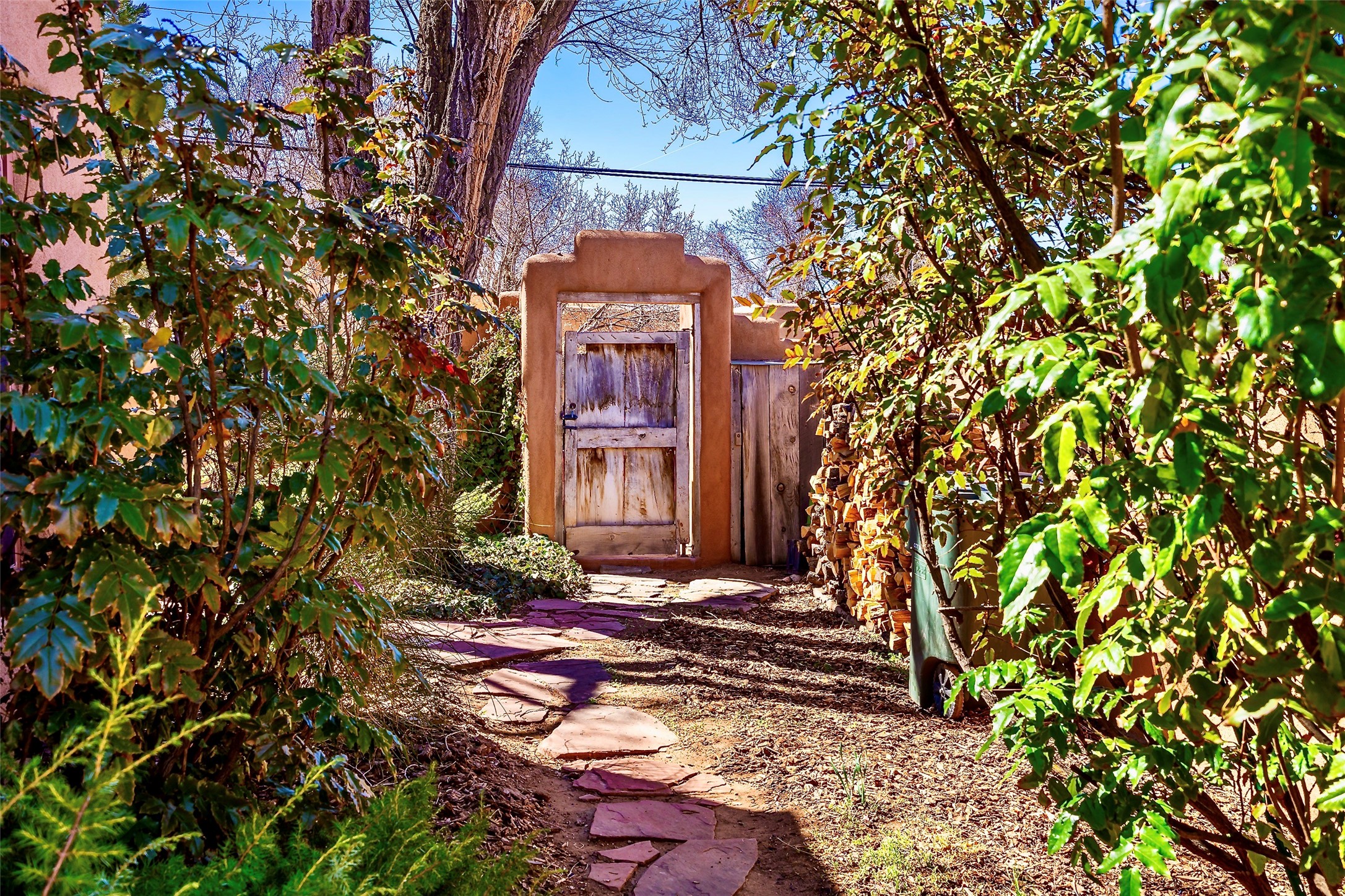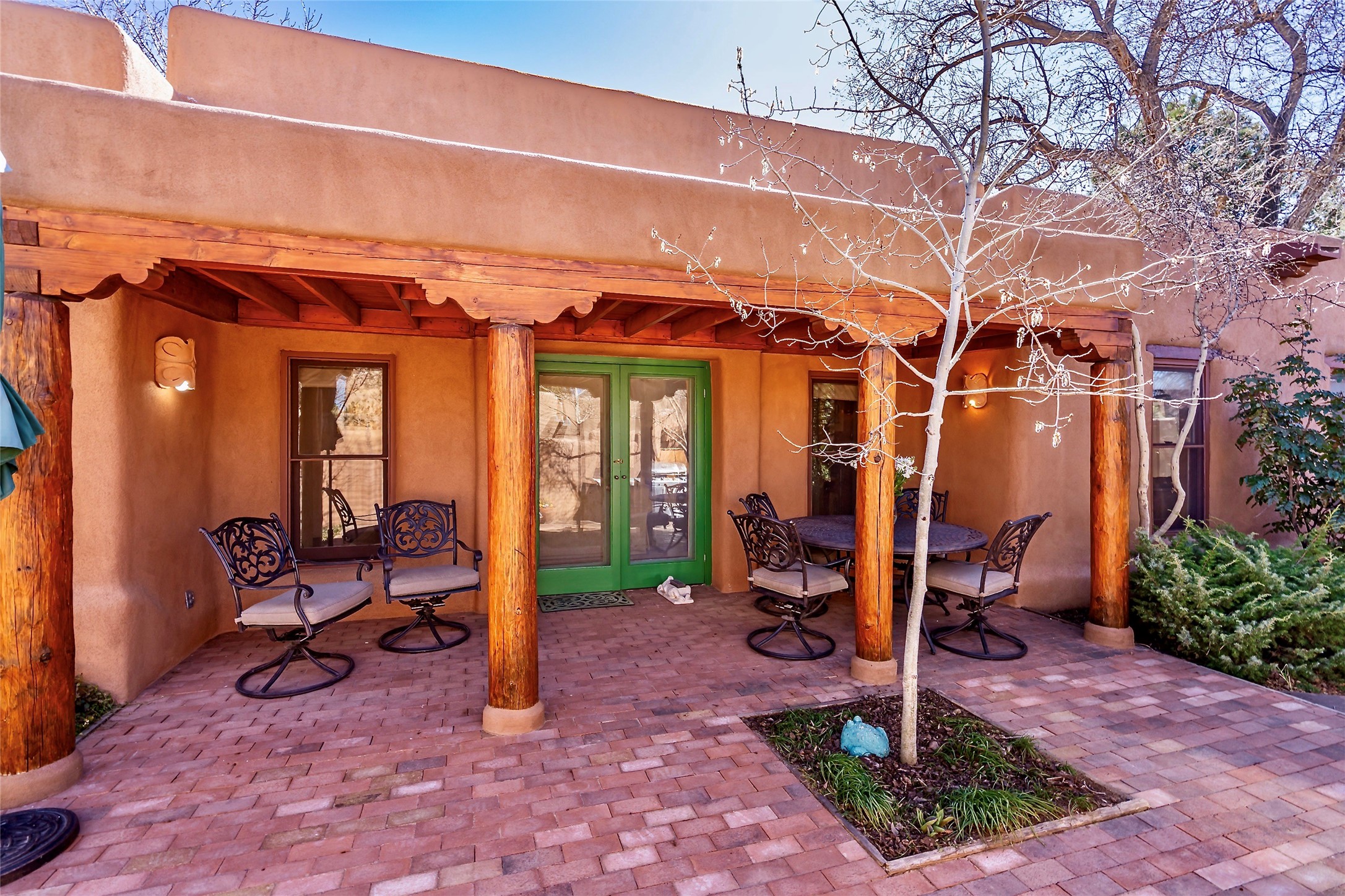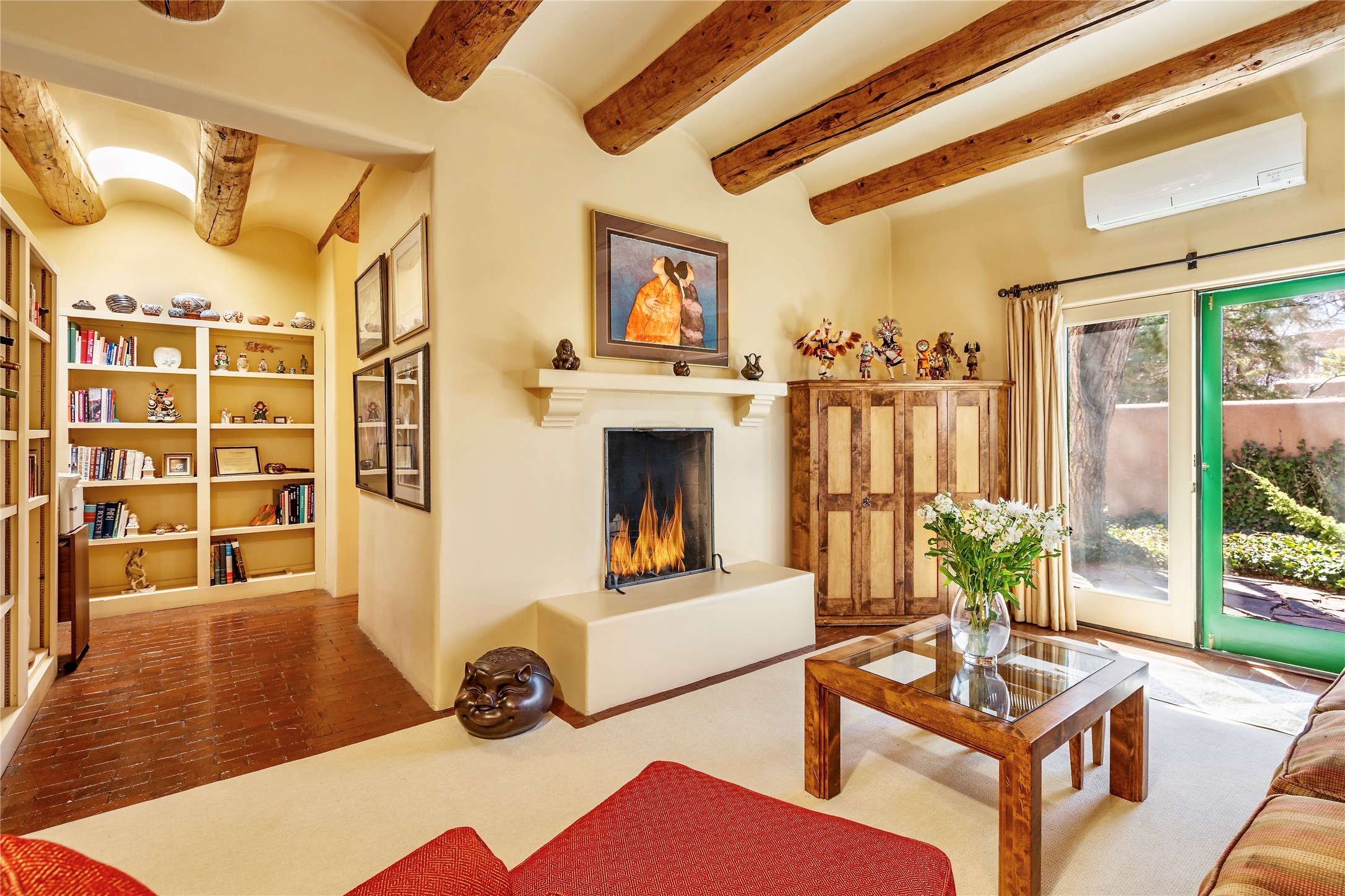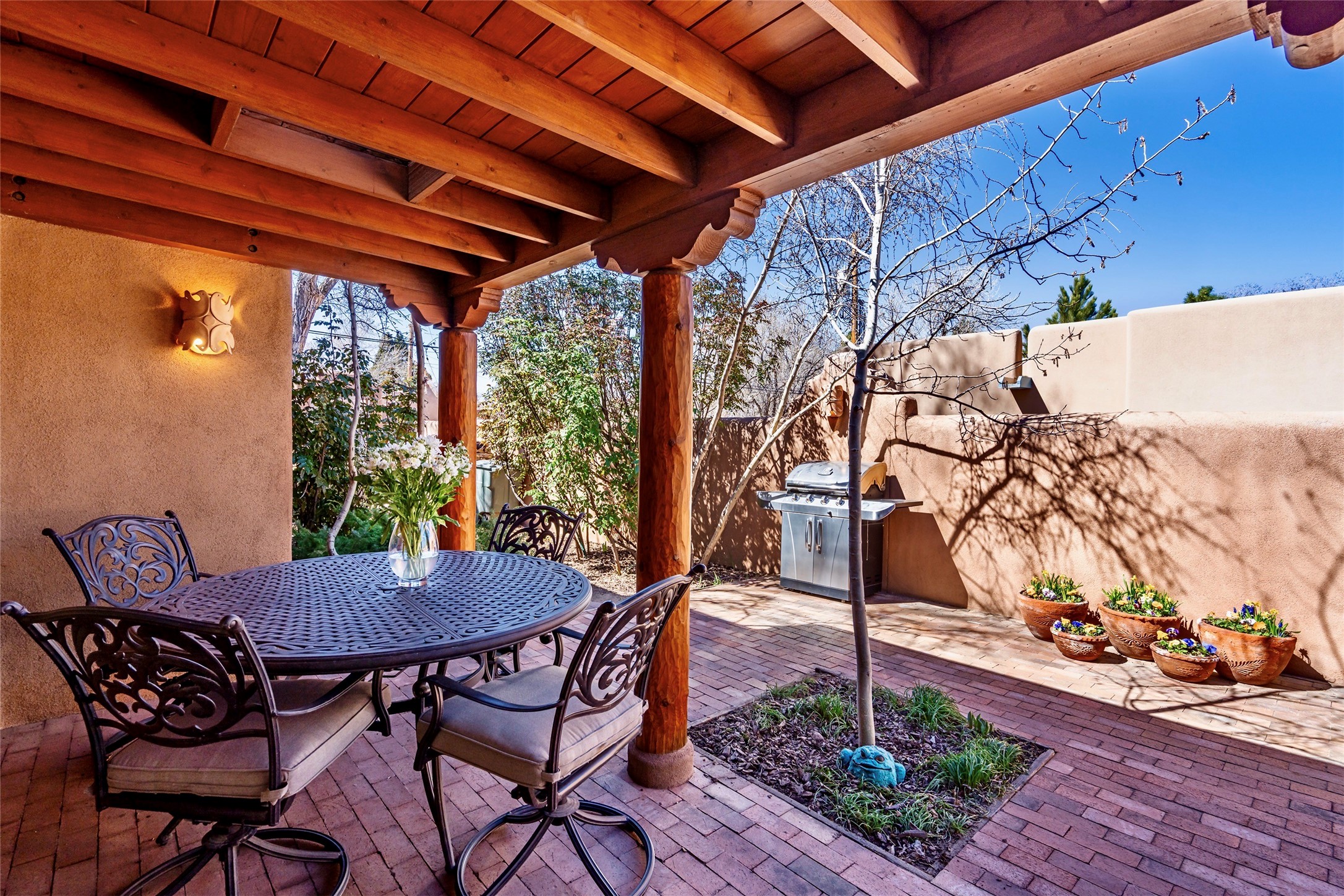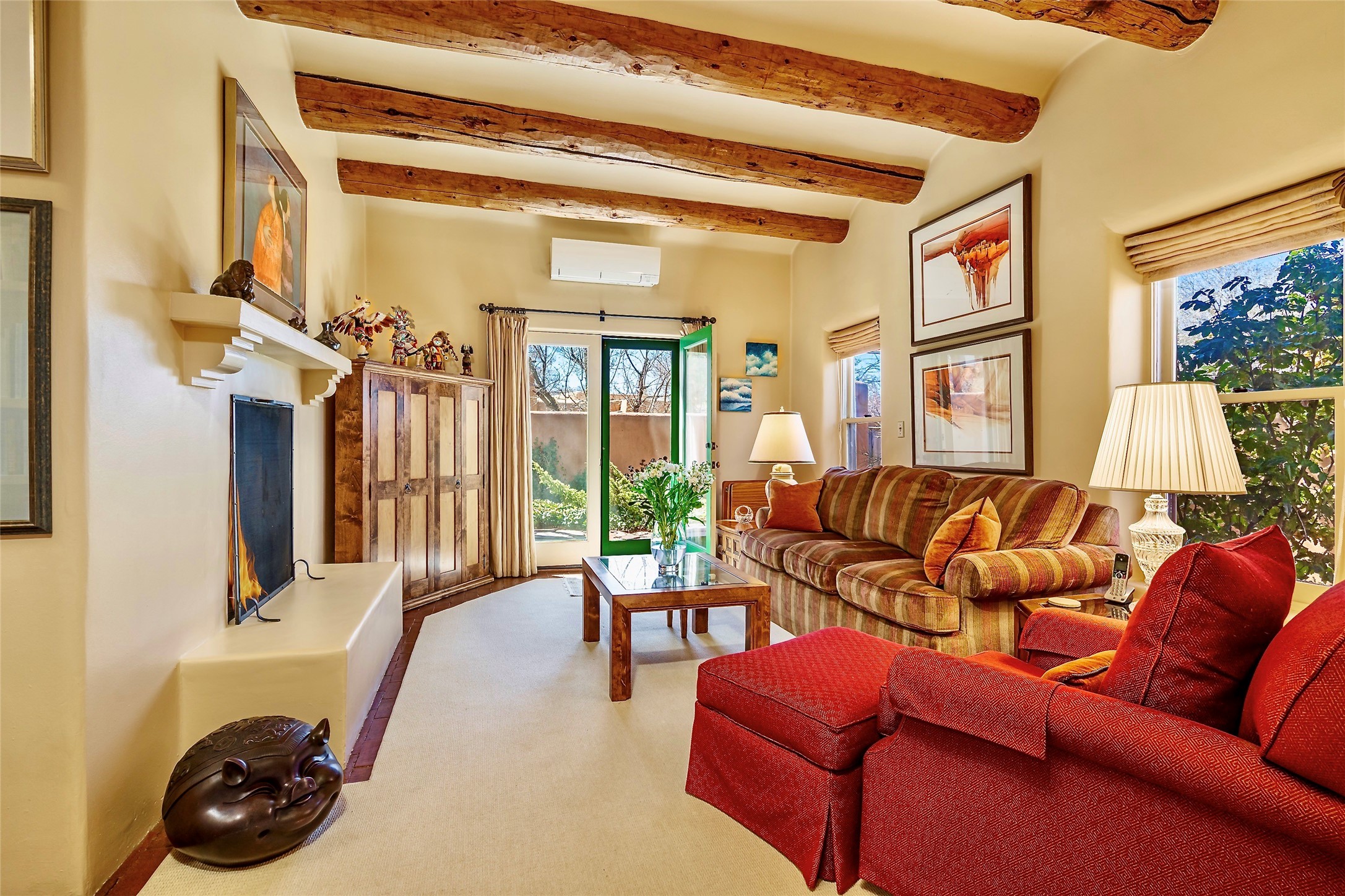 Sensational Acequia Madre Condo in the heart of the historic Eastside. Tucked down a long, private drive in a small 6 unit compound, lies a beautiful, single level, double adobe home featuring specialized features including old Mexican doors, along with the perfect blend of saltillo tile and brick floors. The living room features tall 14 ft coved ceiling with plaster walls, ideal for that very special Santa Fe art collection! This quintessential, corner unit, is fully gated and surrounded by tall walls, patios, portals and gardens. Welcoming bricked, walled and gated entry courtyard along with a rear, West-facing courtyard and portal, trees and private gate to Acequia Madre which is featured in the book Santa Fe Style! Delightful kitchen with center island breakfast bar and plenty of cabinetry. Two spacious bedrooms, one with office nook, and steam shower in the ensuite bathroom. Dedicated laundry room with sink and office area. Oversized 2 car garage with extra storage cabinets + designated guest parking. Mini-splits provide AC and heat along with whole house baseboard heating and water softener. An added, unexpected bonus is the compound water well-each owner shares for outdoor irrigation. Needless to say, Acequia Compound Condos lies in the most fabulous Acequia Madre location surrounded by grand estate-type properties and is close to iconic Canyon Road with the finest of art galleries and restaurants, along with Downtown Subscription for your morning coffee and communal gatherings. Rarely do any units in this compound come available. Truly a five star home in a five star, compound in an A+location!