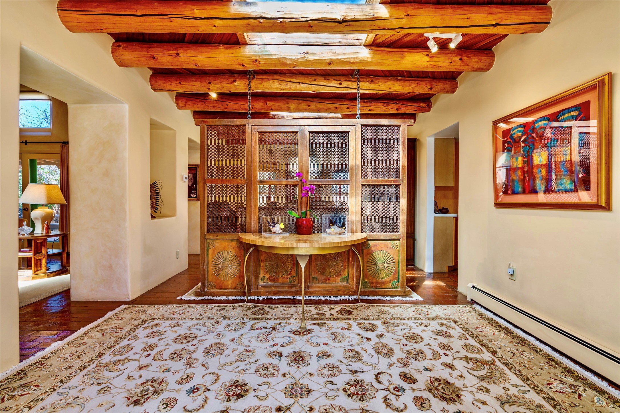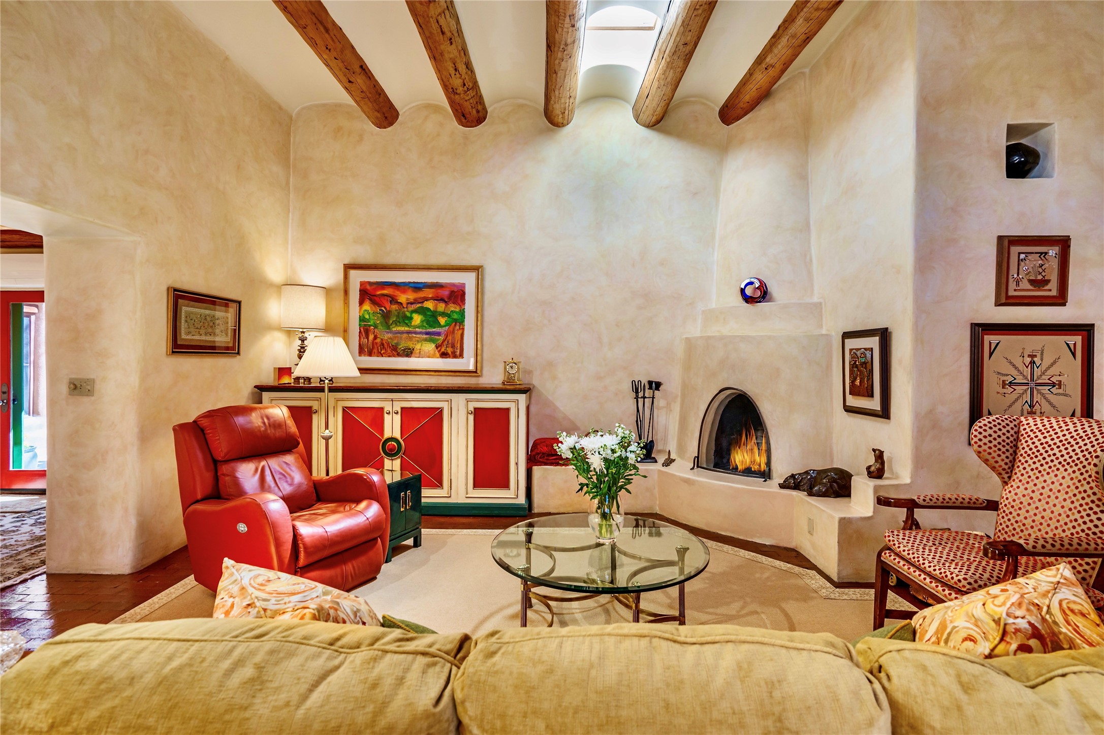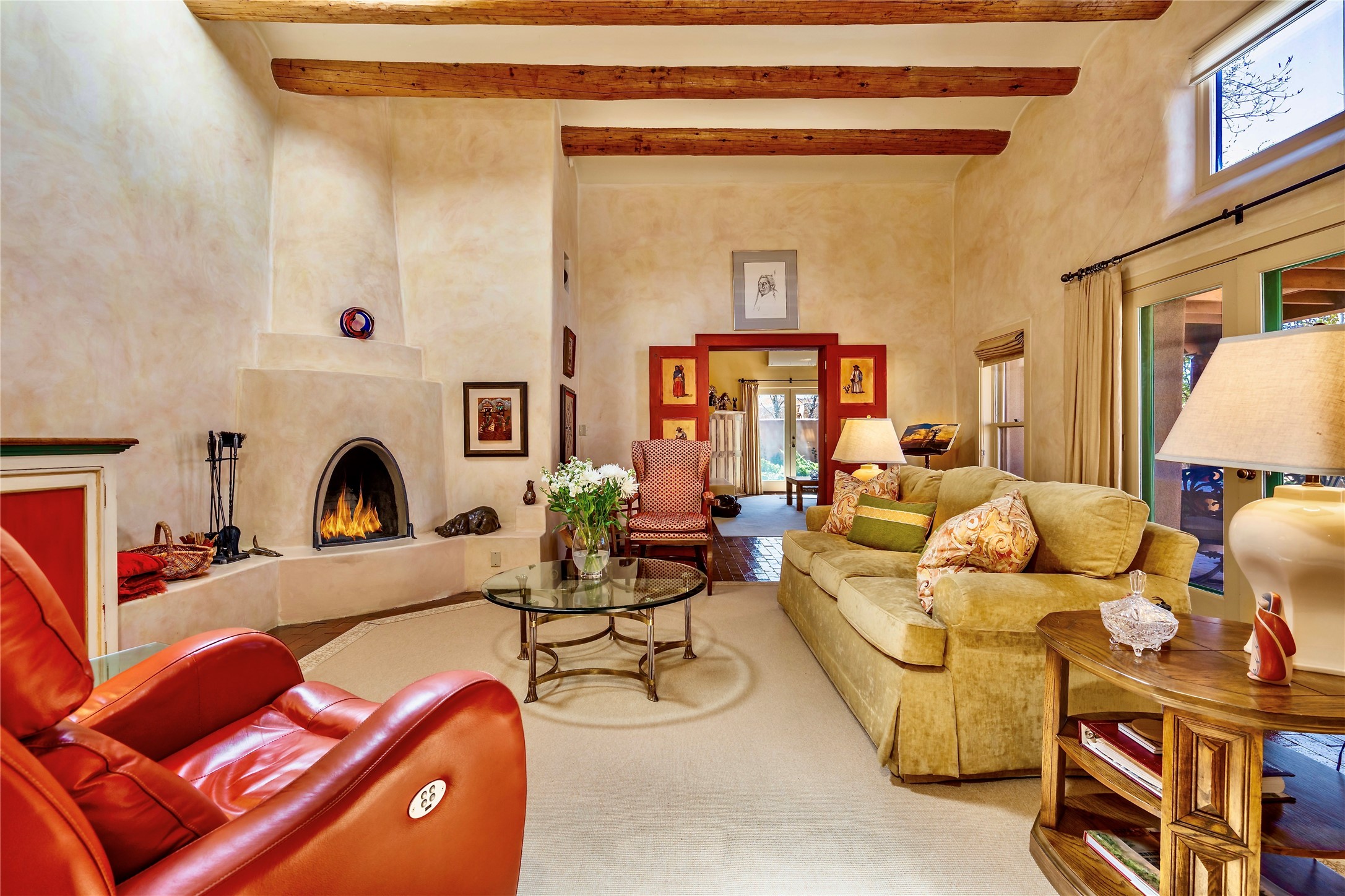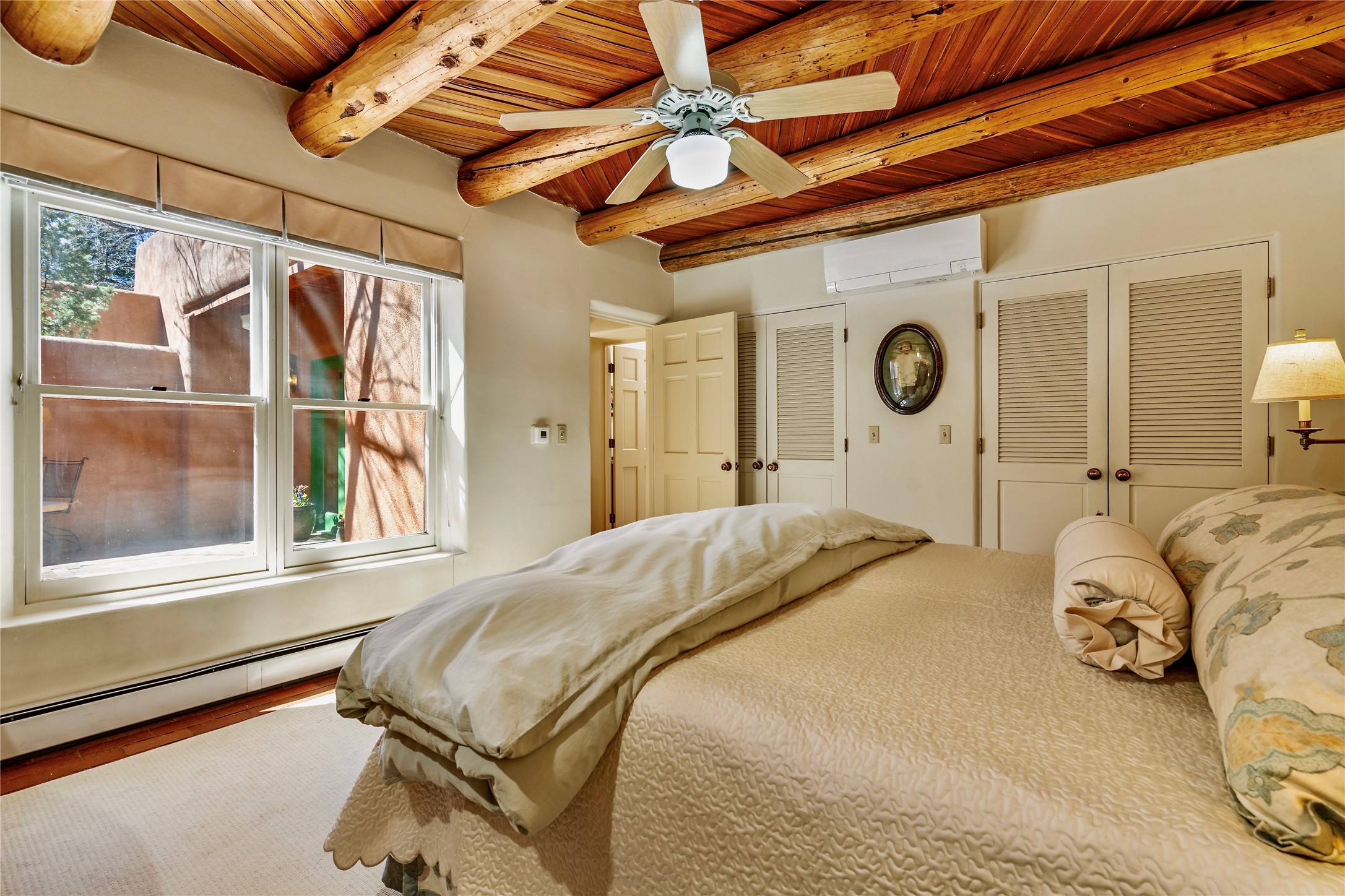 Sensational Acequia Madre Condo in the heart of the historic Eastside. Tucked down a long, private drive in a small 6 unit compound, lies a beautiful, single level, double adobe home featuring specialized features including old Mexican doors, along with the perfect blend of saltillo tile and brick floors. The living room features tall 14 ft coved ceiling with plaster walls, ideal for that very special Santa Fe art collection! This quintessential, corner unit, is fully gated and surrounded by tall walls, patios, portals and gardens. Welcoming bricked, walled and gated entry courtyard along with a rear, West-facing courtyard and portal, trees and private gate to Acequia Madre which is featured in the book Santa Fe Style! Delightful kitchen with center island breakfast bar and plenty of cabinetry. Two spacious bedrooms, one with office nook, and steam shower in the ensuite bathroom. Dedicated laundry room with sink and office area. Oversized 2 car garage with extra storage cabinets + designated guest parking. Mini-splits provide AC and heat along with whole house baseboard heating and water softener. An added, unexpected bonus is the compound water well-each owner shares for outdoor irrigation. Needless to say, Acequia Compound Condos lies in the most fabulous Acequia Madre location surrounded by grand estate-type properties and is close to iconic Canyon Road with the finest of art galleries and restaurants, along with Downtown Subscription for your morning coffee and communal gatherings. Rarely do any units in this compound come available. Truly a five star home in a five star, compound in an A+location!