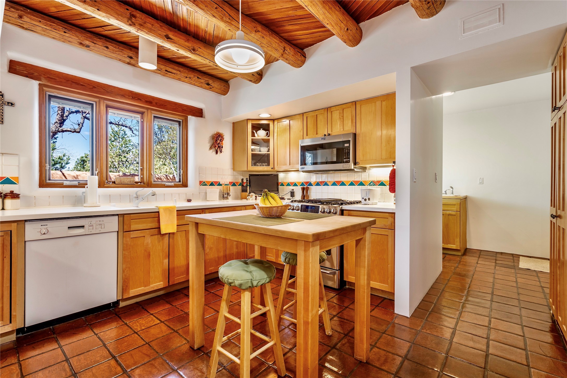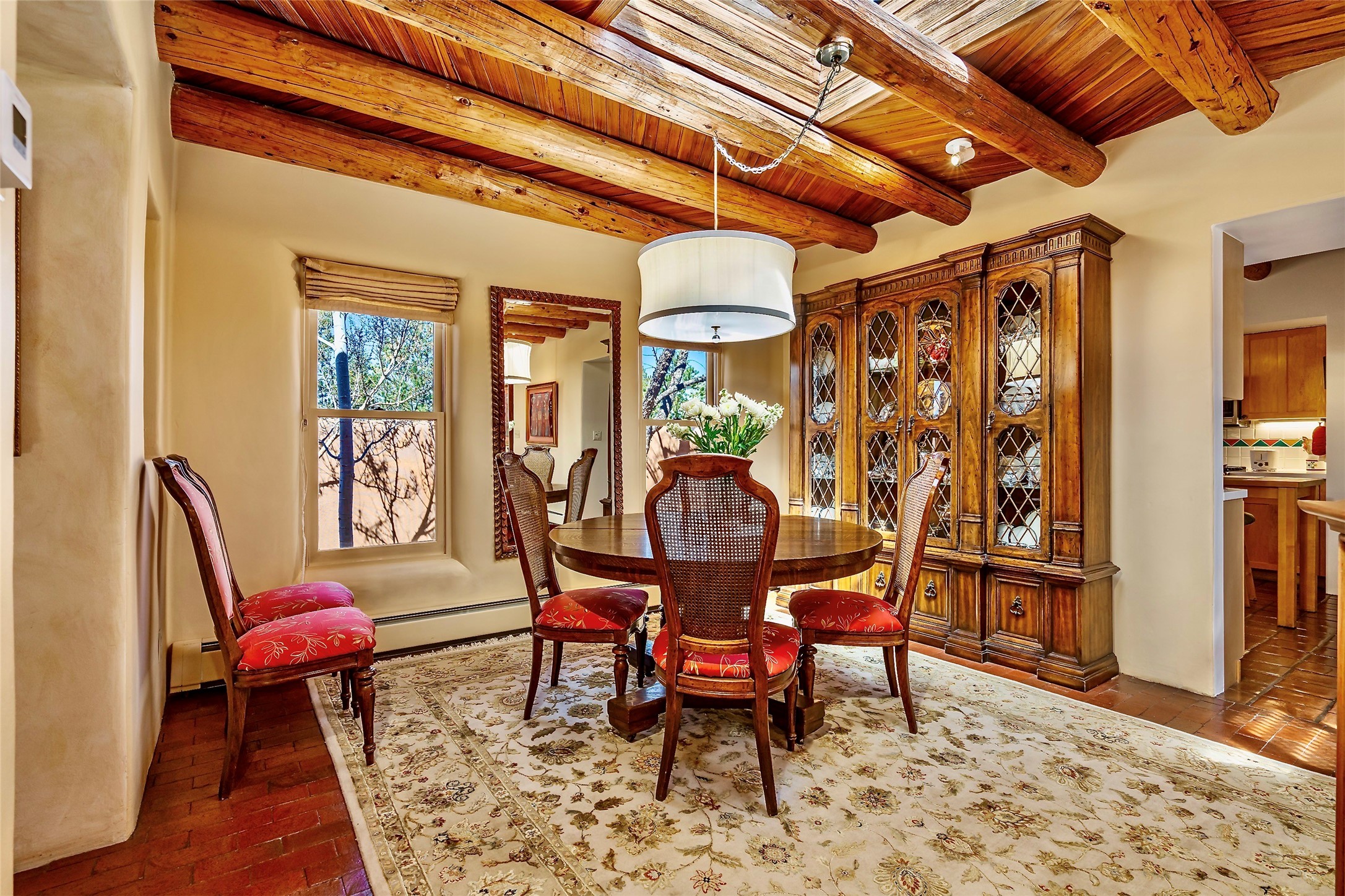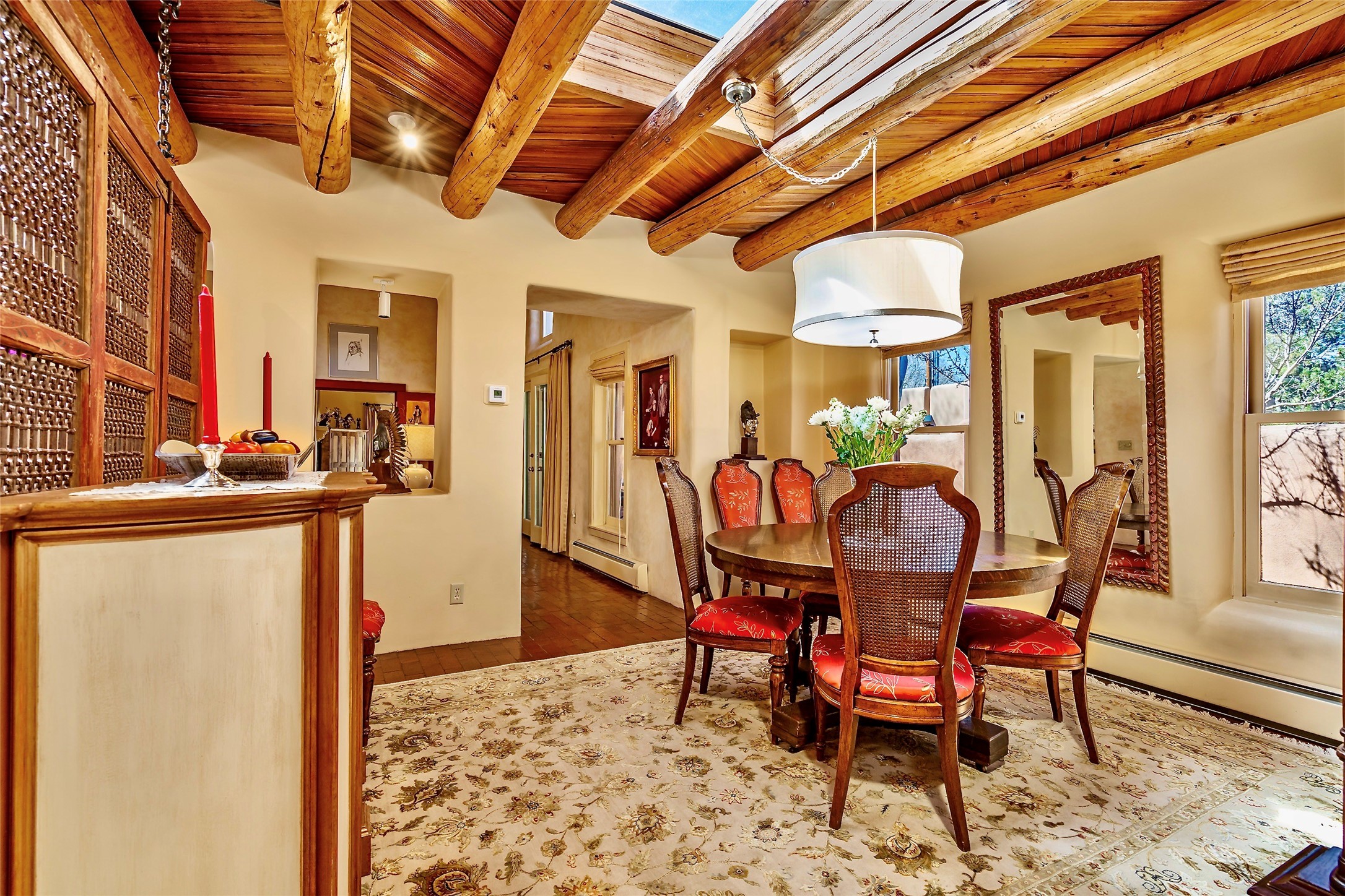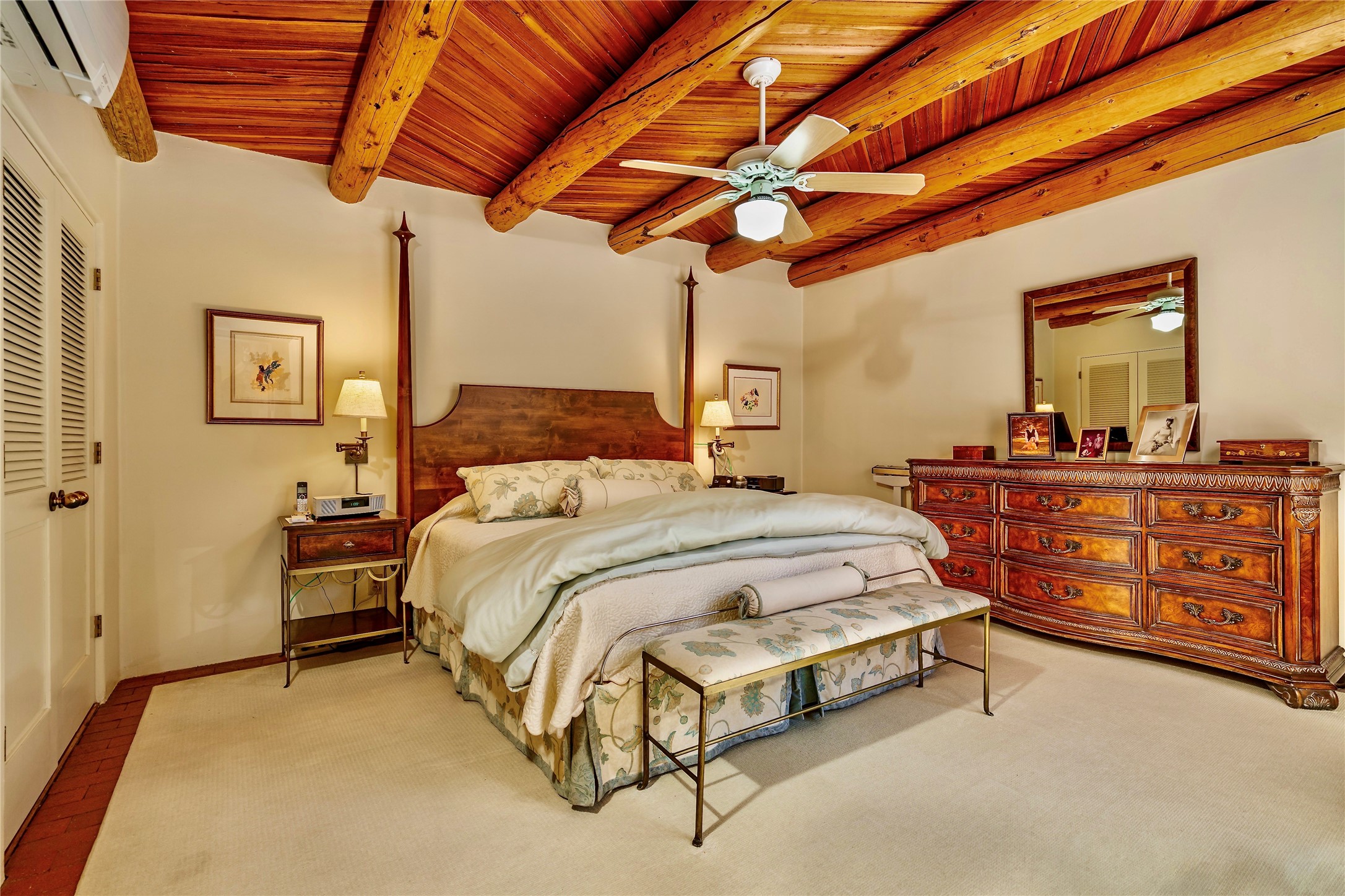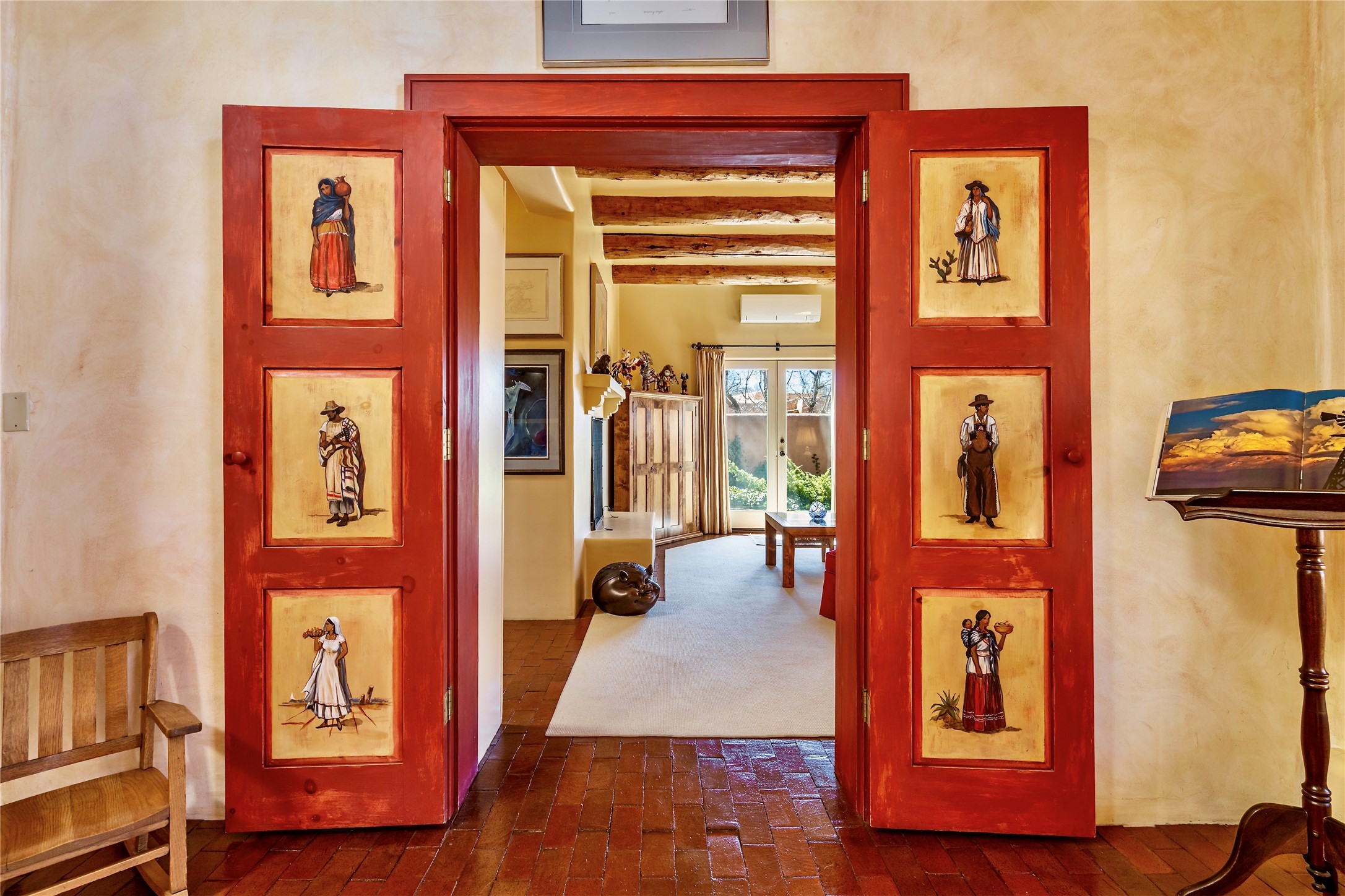 Sensational Acequia Madre Condo in the heart of the historic Eastside. Tucked down a long, private drive in a small 6 unit compound, lies a beautiful, single level, double adobe home featuring specialized features including old Mexican doors, along with the perfect blend of saltillo tile and brick floors. The living room features tall 14 ft coved ceiling with plaster walls, ideal for that very special Santa Fe art collection! This quintessential, corner unit, is fully gated and surrounded by tall walls, patios, portals and gardens. Welcoming bricked, walled and gated entry courtyard along with a rear, West-facing courtyard and portal, trees and private gate to Acequia Madre which is featured in the book Santa Fe Style! Delightful kitchen with center island breakfast bar and plenty of cabinetry. Two spacious bedrooms, one with office nook, and steam shower in the ensuite bathroom. Dedicated laundry room with sink and office area. Oversized 2 car garage with extra storage cabinets + designated guest parking. Mini-splits provide AC and heat along with whole house baseboard heating and water softener. An added, unexpected bonus is the compound water well-each owner shares for outdoor irrigation. Needless to say, Acequia Compound Condos lies in the most fabulous Acequia Madre location surrounded by grand estate-type properties and is close to iconic Canyon Road with the finest of art galleries and restaurants, along with Downtown Subscription for your morning coffee and communal gatherings. Rarely do any units in this compound come available. Truly a five star home in a five star, compound in an A+location!