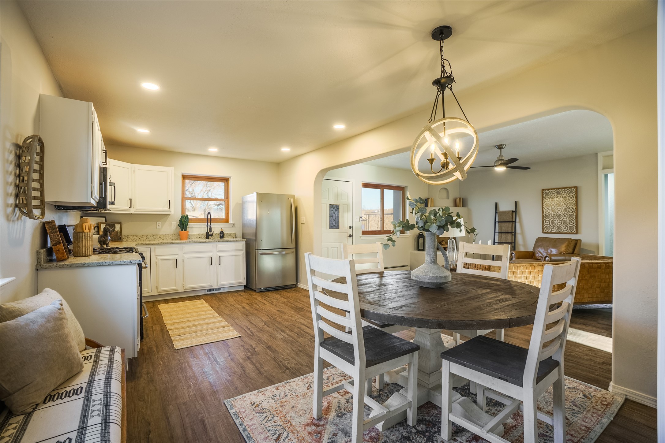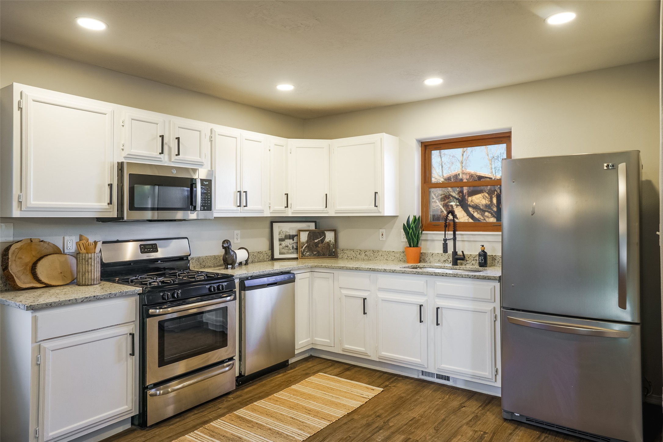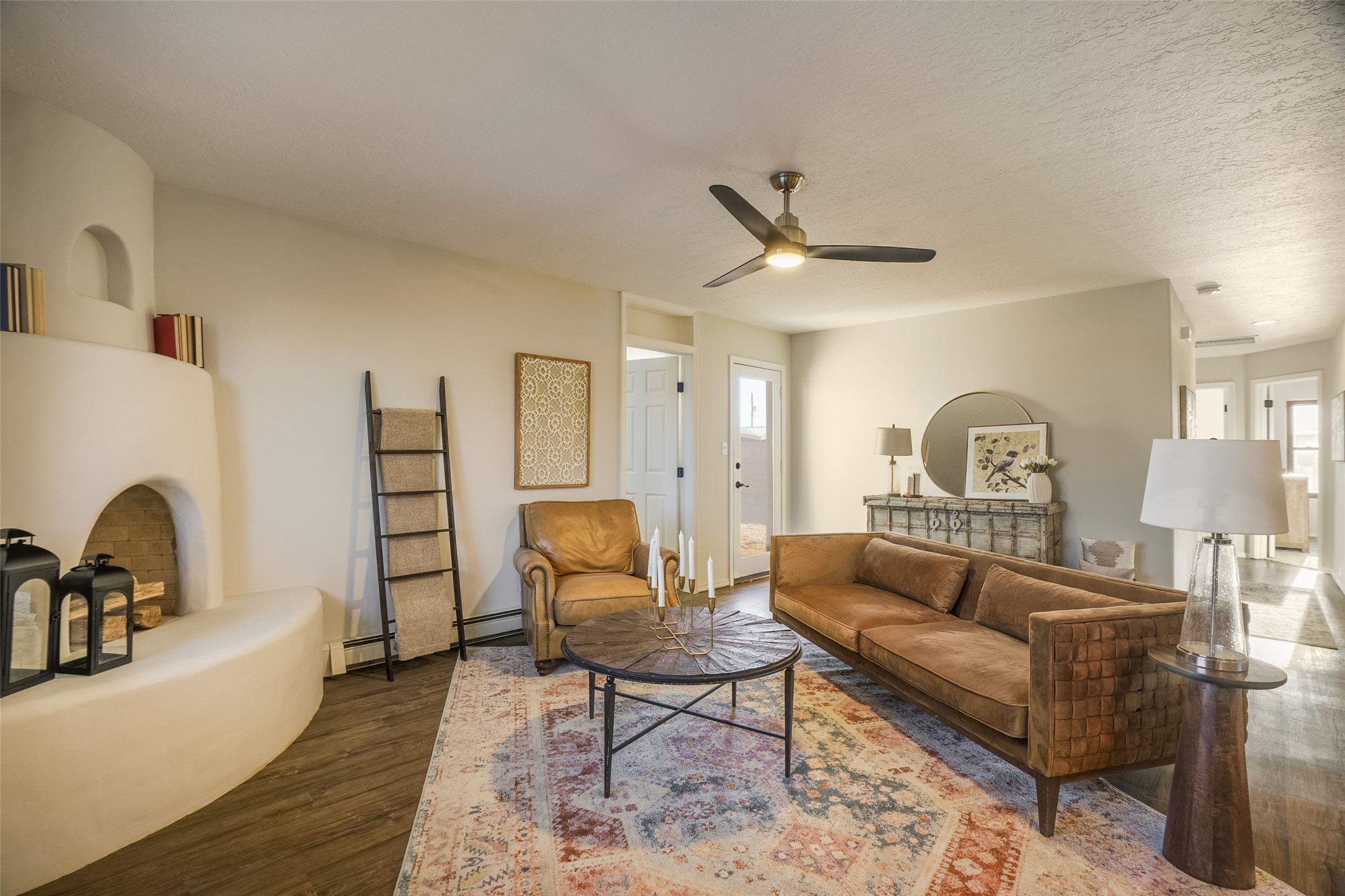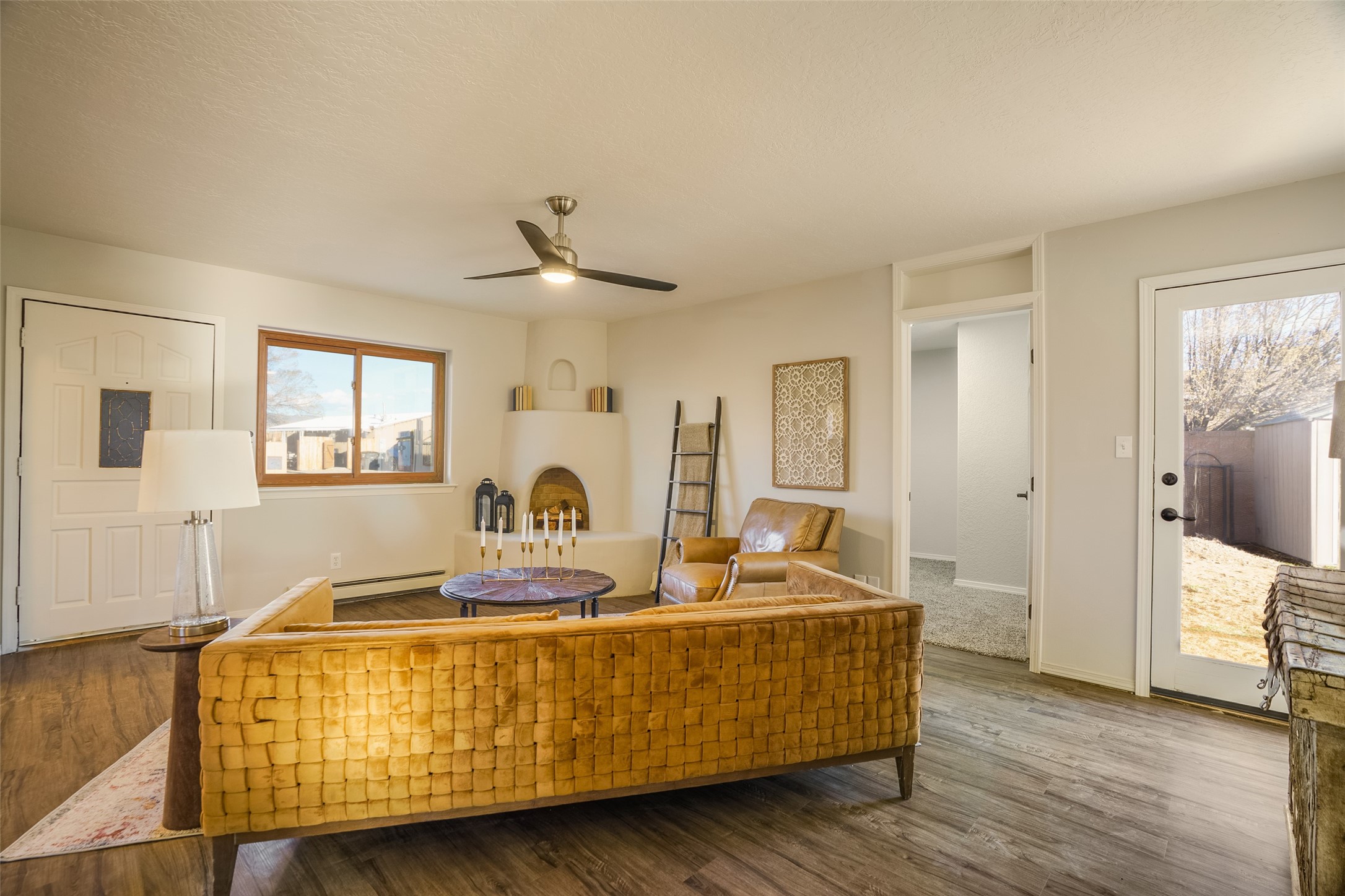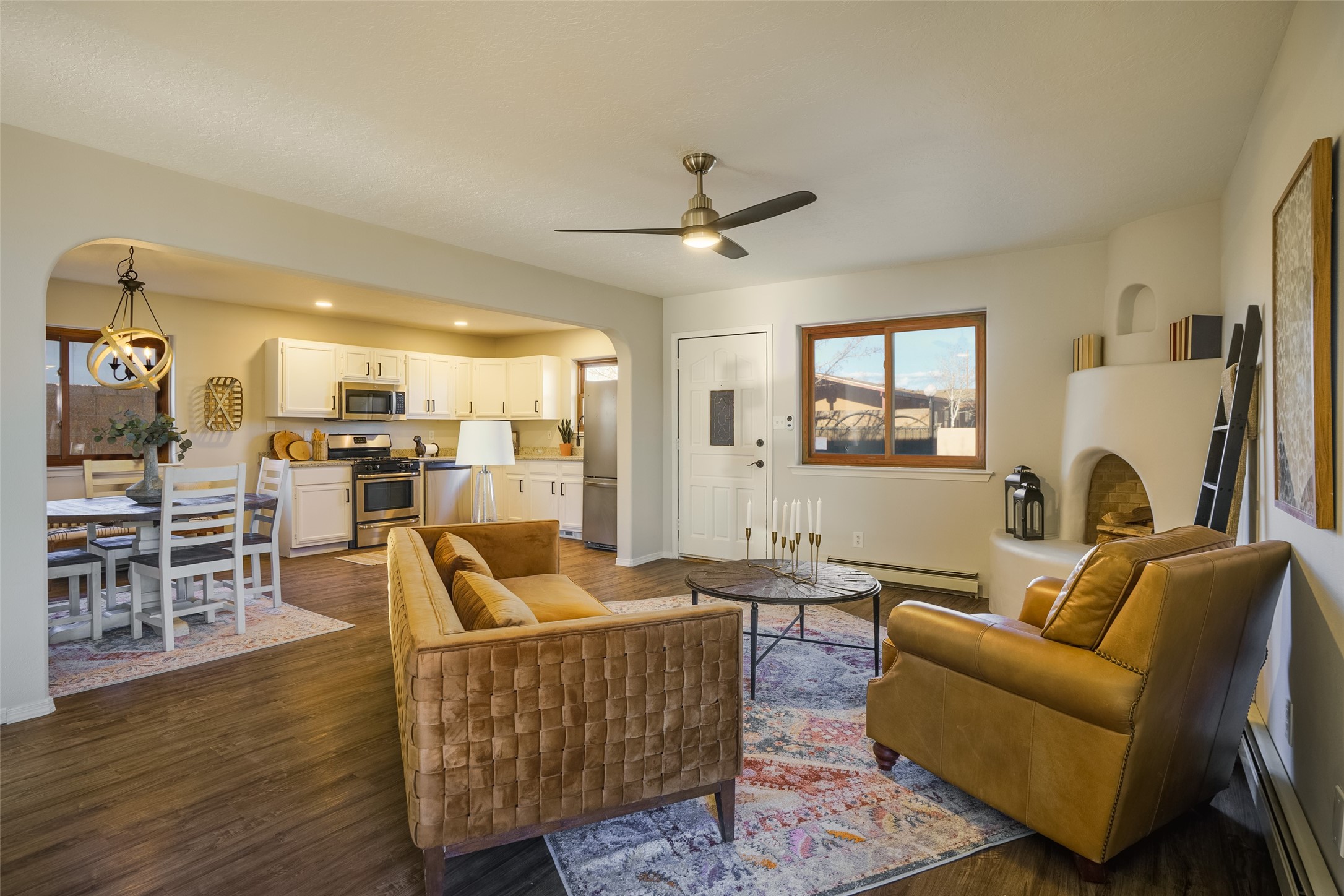STEP INTO THE WARMTH OF CLASSIC SANTA FE LIVING. Inside this 4-bed, 2-bath home, you'll find the charm of the modern southwest-- a kiva fireplace, luxury vinyl that mimics rustic wood, and soft carpeted bedrooms. Enjoy the benefits of newer appliances and a stunningly UPDATED kitchen and bathrooms. The open floorplan welcomes the sunlight, while upscale design touches bring flair to every corner. The large yard, wrapped in an adobe wall, invites lazy afternoons and starlit evenings. Beautiful bathrooms and you can always make the 4th bedroom into a quiet office or study! Nestled in a prime Santa Fe location, you're close to culture, cuisine, and endless blue skies. Come experience the magic--schedule your tour today.