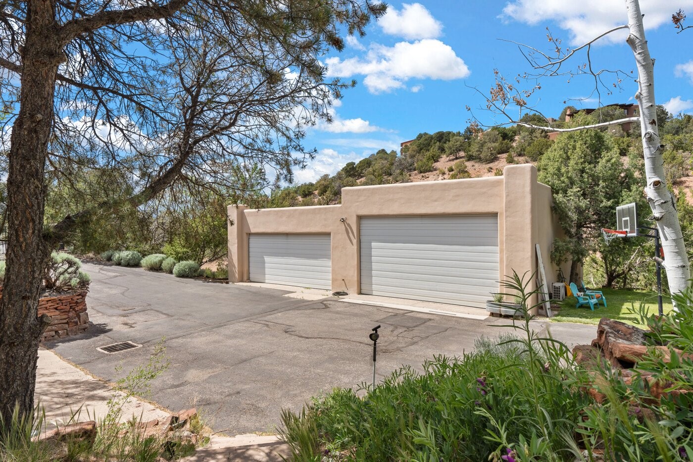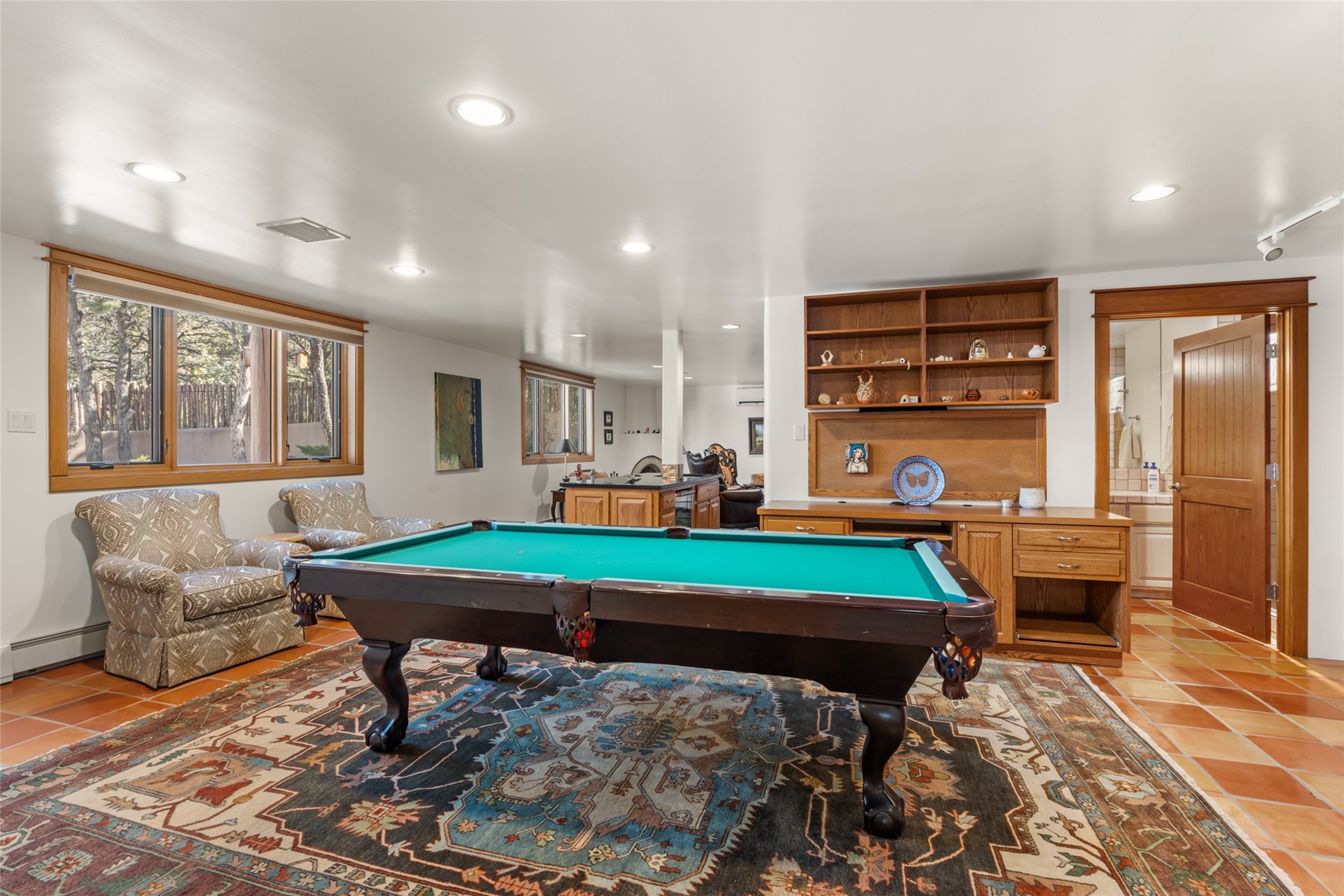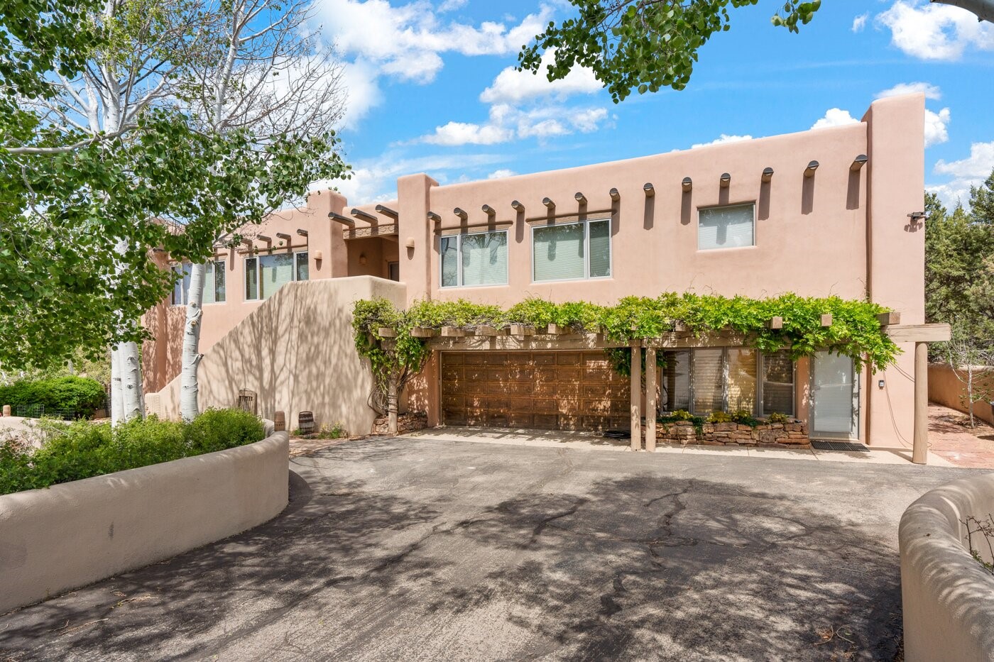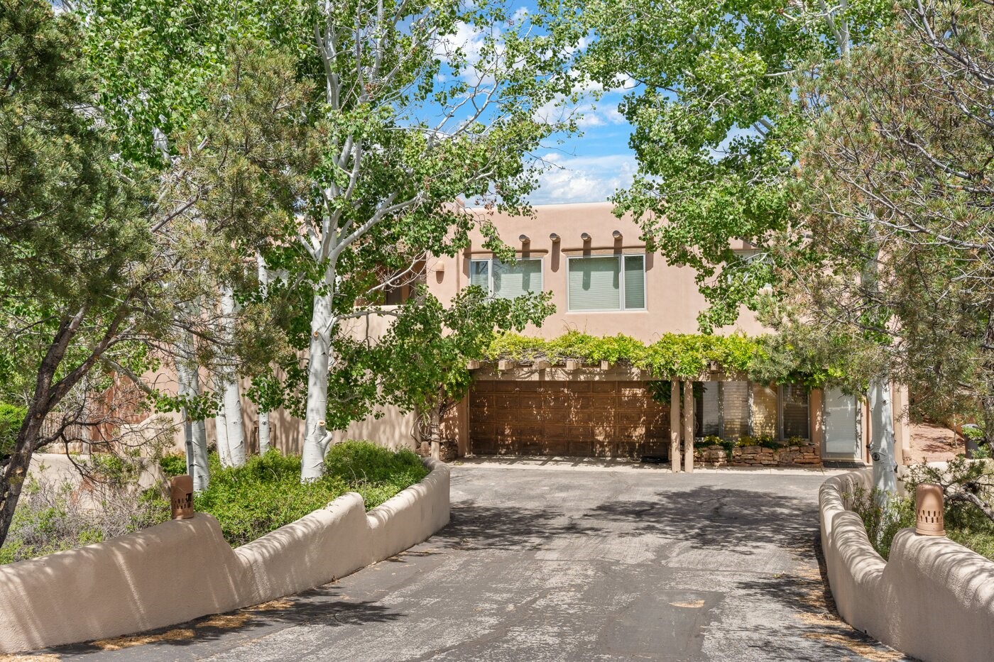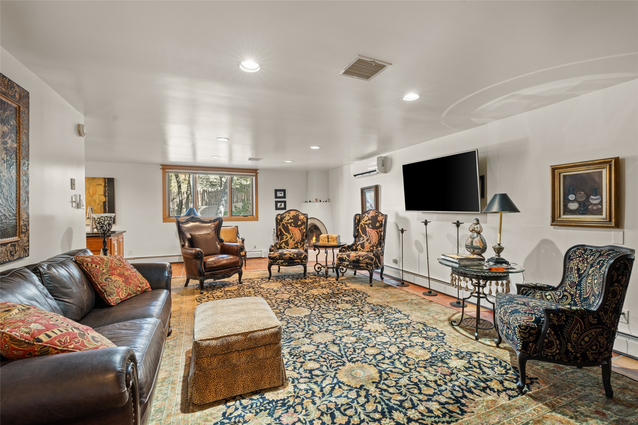 Situated on a large, secluded, and serene 2 acre north-side estate, an exquisite transformation has taken place. The two levels of the main house have been opened and expanded, resulting in a thoughtful home filled with natural light. Walls of windows look upon treetops, fabulous Jemez Mountain and sunset views, and abundant foliage and wildlife. The upper level incorporates the primary suite and two other large bedrooms, a large open concept kitchen and dining area, with Saltillo tiles and vigas flowing into the living area, capped by a dramatic kiva fireplace. For the newly imagined lower level, 1,843 sq ft were added to the original 5,307 sq ft house to create a second lower wing in the main house. The result - 7,150 sq feet with total of 6 bedrooms, remodeled upstairs kitchen, a new 2nd living room with an enclosed patio, 2 new bedrooms, a den with a kitchenette and fireplace, office space, a new laundry room, and too many other new and remodeled features to mention here. The flexibility of these spaces is abundant. Additionally, the property boasts a 1020 sq ft RV garage, recently converted into a heated and cooled artist's studio. There is also a one bedroom casita and 2 two car garages. The guest house, art studio, and one 2 car garage have a separate address and a 2nd gated entrance and the property now totals an extraordinary 8,545 sq ft of heated space on 2 landscaped acres. An amazing value.