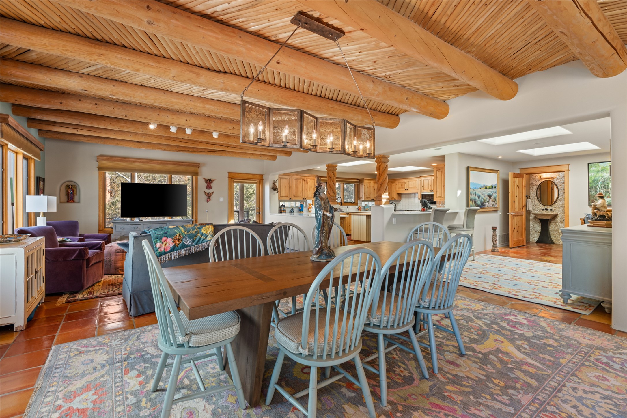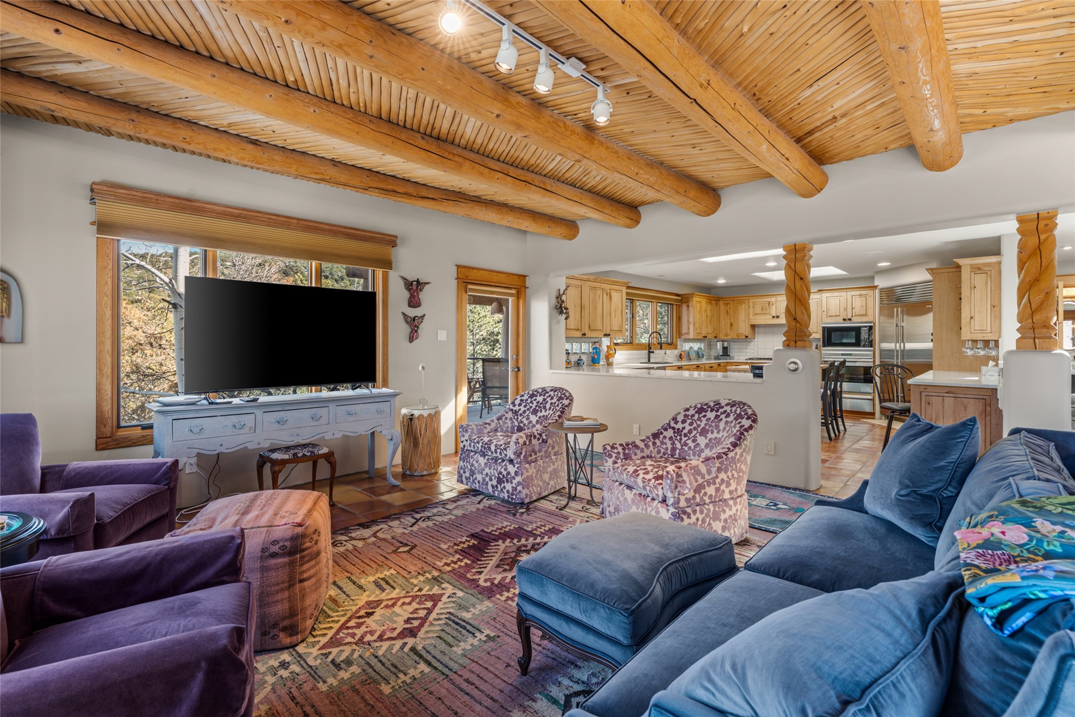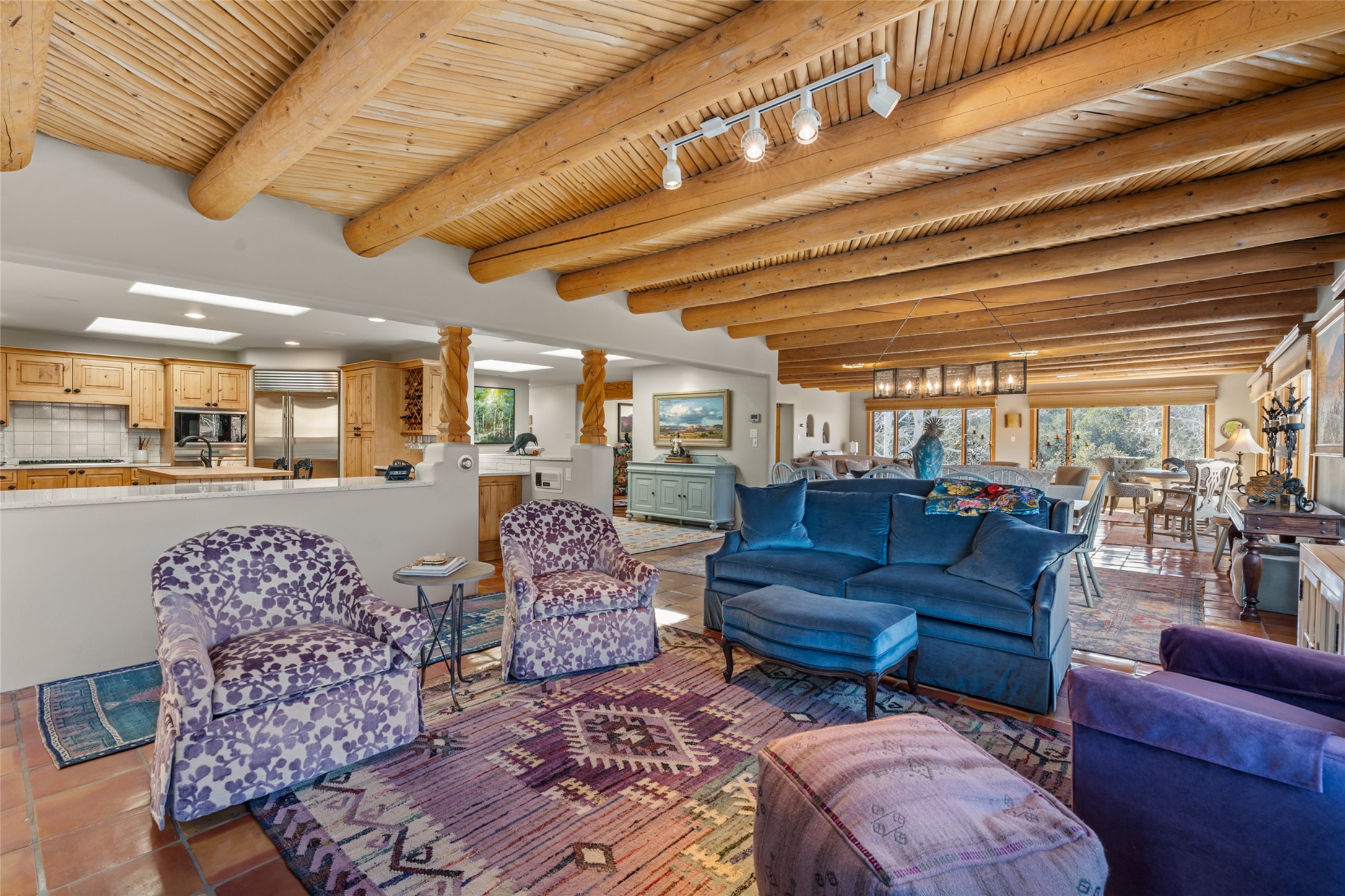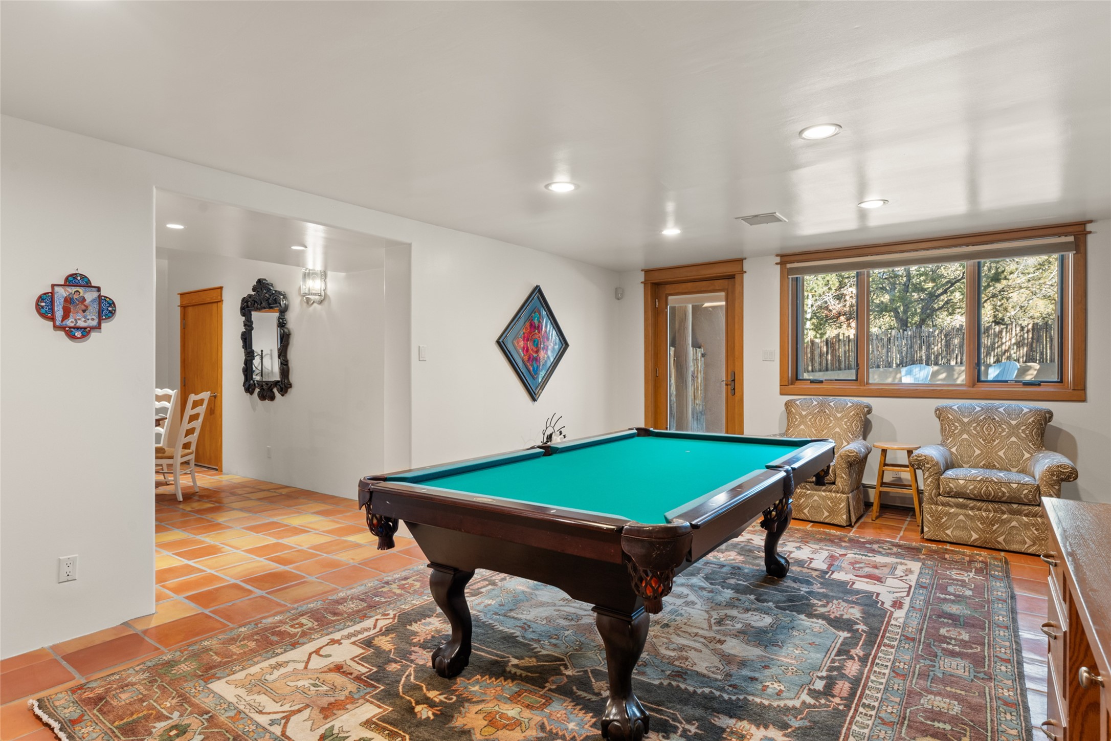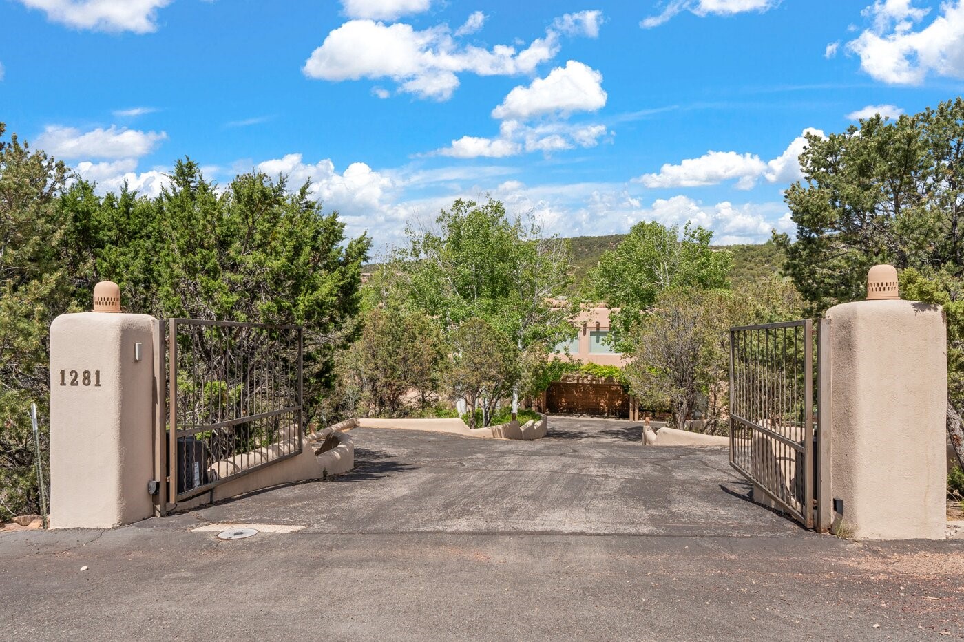 Situated on a large, secluded, and serene 2 acre north-side estate, an exquisite transformation has taken place. The two levels of the main house have been opened and expanded, resulting in a thoughtful home filled with natural light. Walls of windows look upon treetops, fabulous Jemez Mountain and sunset views, and abundant foliage and wildlife. The upper level incorporates the primary suite and two other large bedrooms, a large open concept kitchen and dining area, with Saltillo tiles and vigas flowing into the living area, capped by a dramatic kiva fireplace. For the newly imagined lower level, 1,843 sq ft were added to the original 5,307 sq ft house to create a second lower wing in the main house. The result - 7,150 sq feet with total of 6 bedrooms, remodeled upstairs kitchen, a new 2nd living room with an enclosed patio, 2 new bedrooms, a den with a kitchenette and fireplace, office space, a new laundry room, and too many other new and remodeled features to mention here. The flexibility of these spaces is abundant. Additionally, the property boasts a 1020 sq ft RV garage, recently converted into a heated and cooled artist's studio. There is also a one bedroom casita and 2 two car garages. The guest house, art studio, and one 2 car garage have a separate address and a 2nd gated entrance and the property now totals an extraordinary 8,545 sq ft of heated space on 2 landscaped acres. An amazing value.