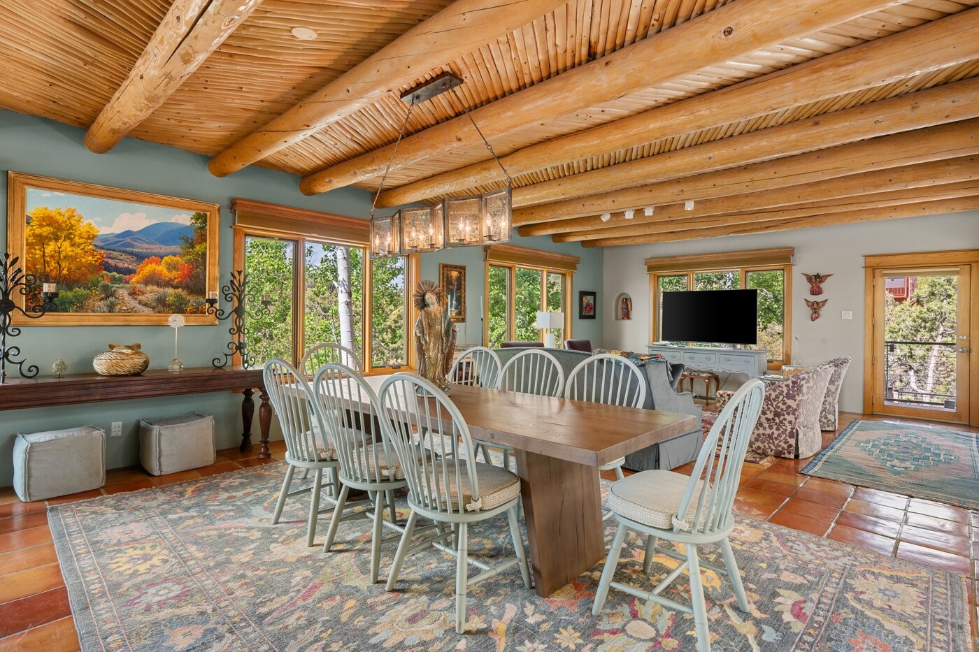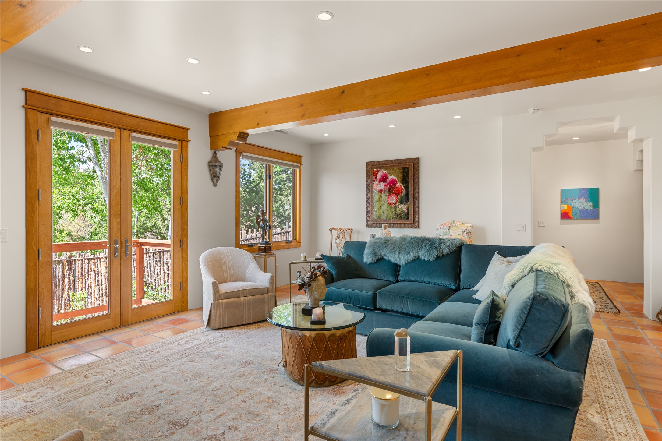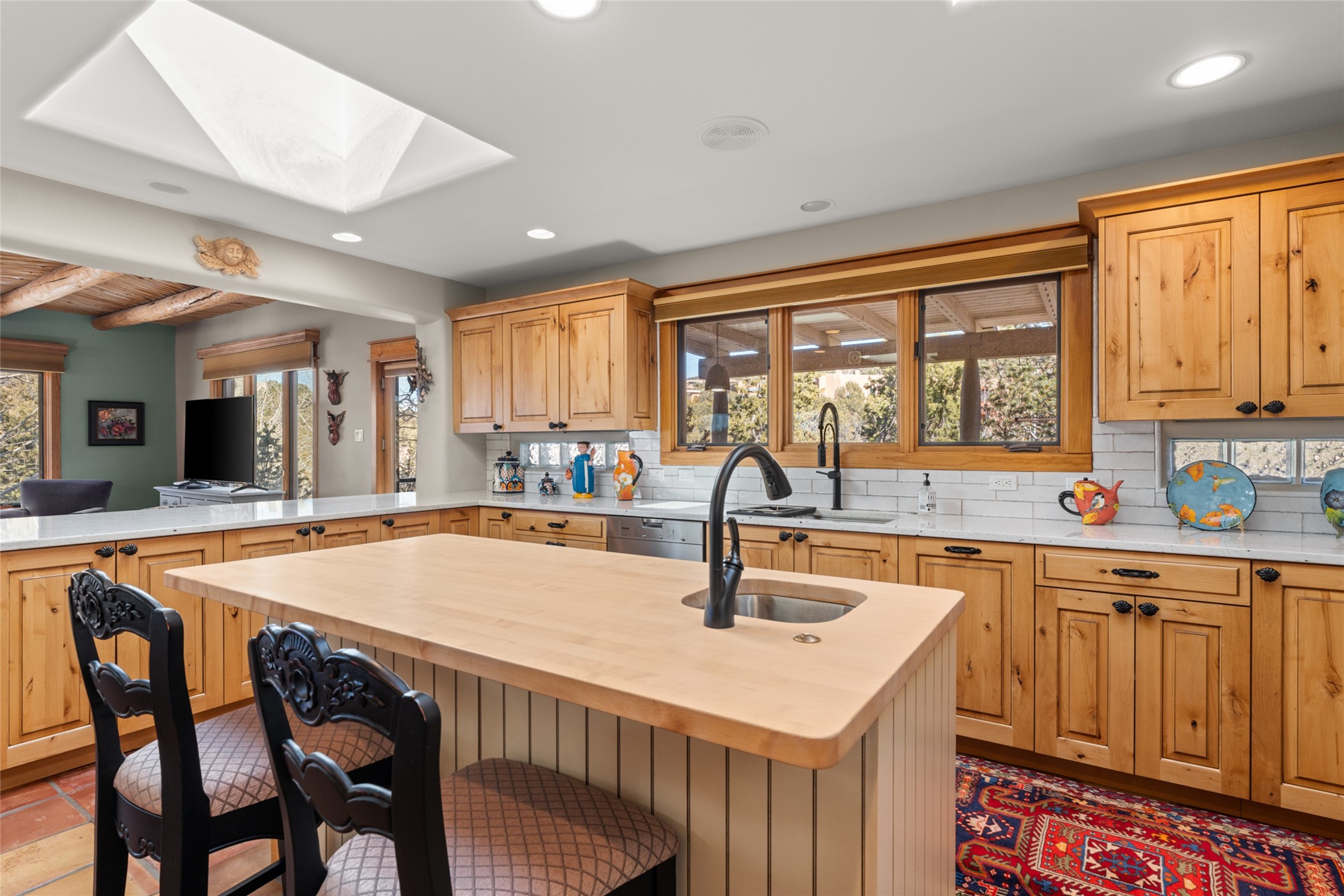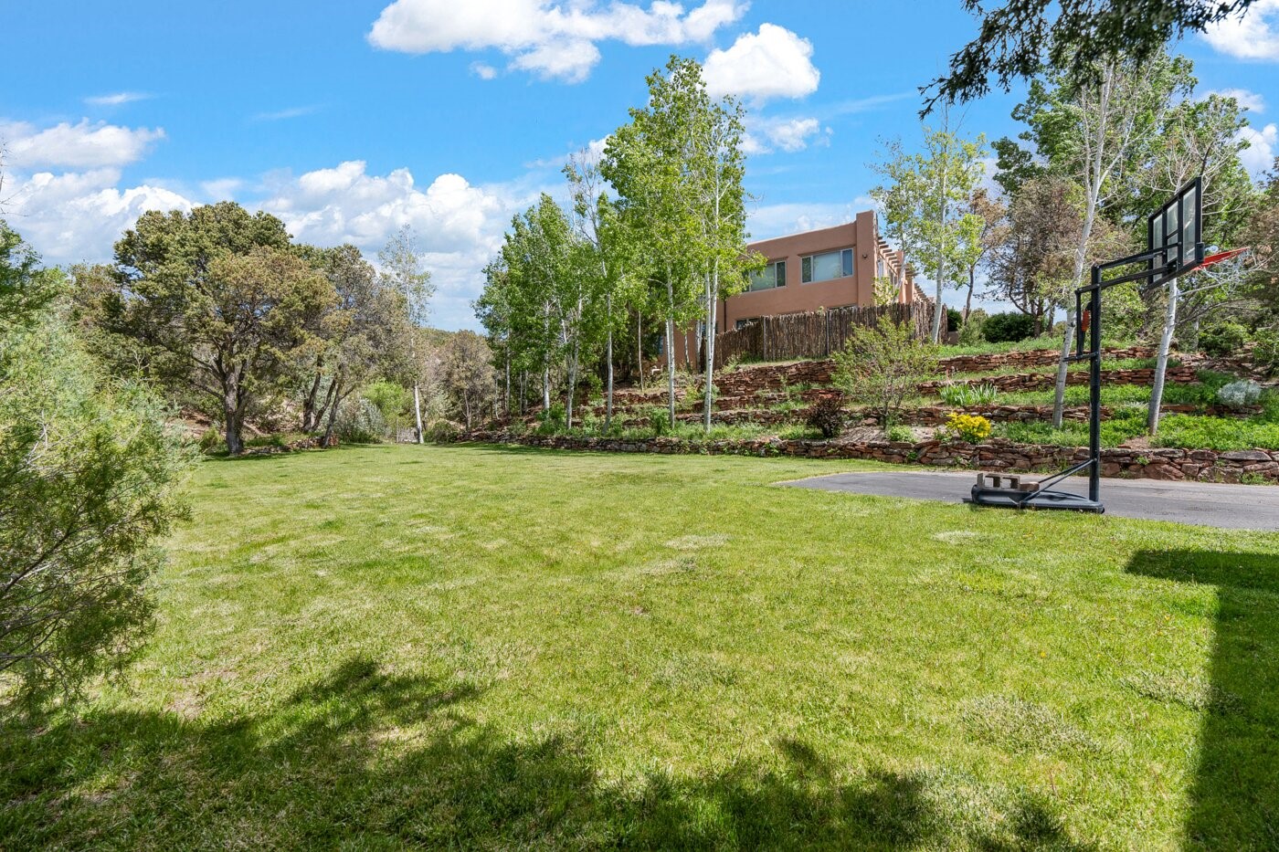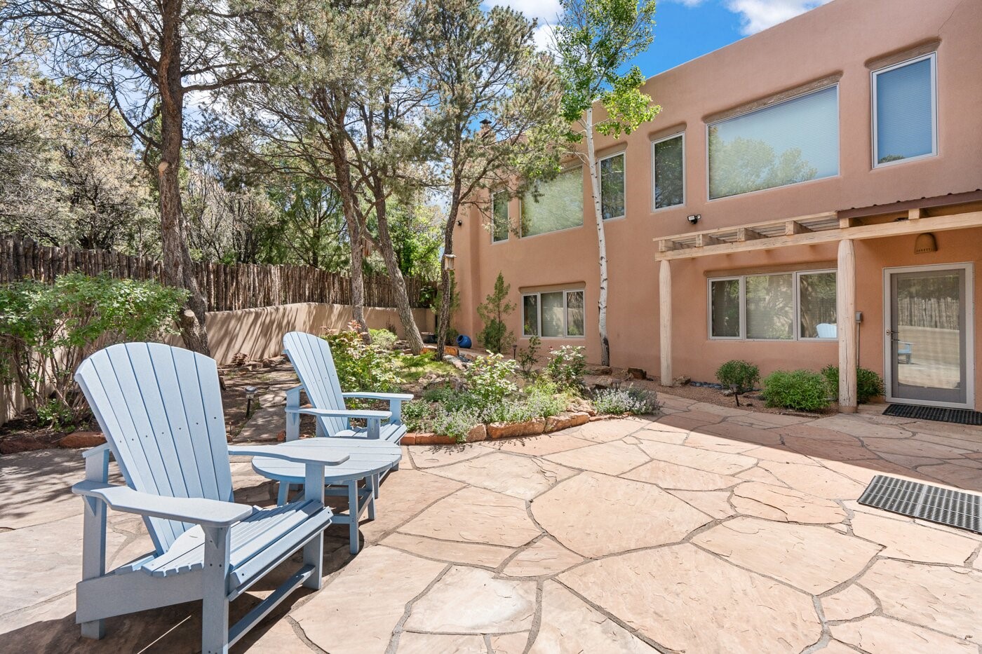 Situated on a large, secluded, and serene 2 acre north-side estate, an exquisite transformation has taken place. The two levels of the main house have been opened and expanded, resulting in a thoughtful home filled with natural light. Walls of windows look upon treetops, fabulous Jemez Mountain and sunset views, and abundant foliage and wildlife. The upper level incorporates the primary suite and two other large bedrooms, a large open concept kitchen and dining area, with Saltillo tiles and vigas flowing into the living area, capped by a dramatic kiva fireplace. For the newly imagined lower level, 1,843 sq ft were added to the original 5,307 sq ft house to create a second lower wing in the main house. The result - 7,150 sq feet with total of 6 bedrooms, remodeled upstairs kitchen, a new 2nd living room with an enclosed patio, 2 new bedrooms, a den with a kitchenette and fireplace, office space, a new laundry room, and too many other new and remodeled features to mention here. The flexibility of these spaces is abundant. Additionally, the property boasts a 1020 sq ft RV garage, recently converted into a heated and cooled artist's studio. There is also a one bedroom casita and 2 two car garages. The guest house, art studio, and one 2 car garage have a separate address and a 2nd gated entrance and the property now totals an extraordinary 8,545 sq ft of heated space on 2 landscaped acres. An amazing value.