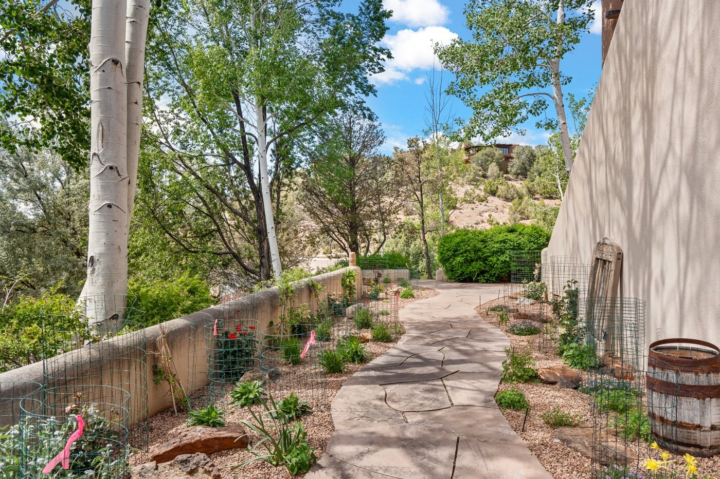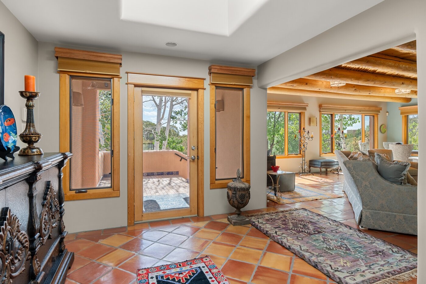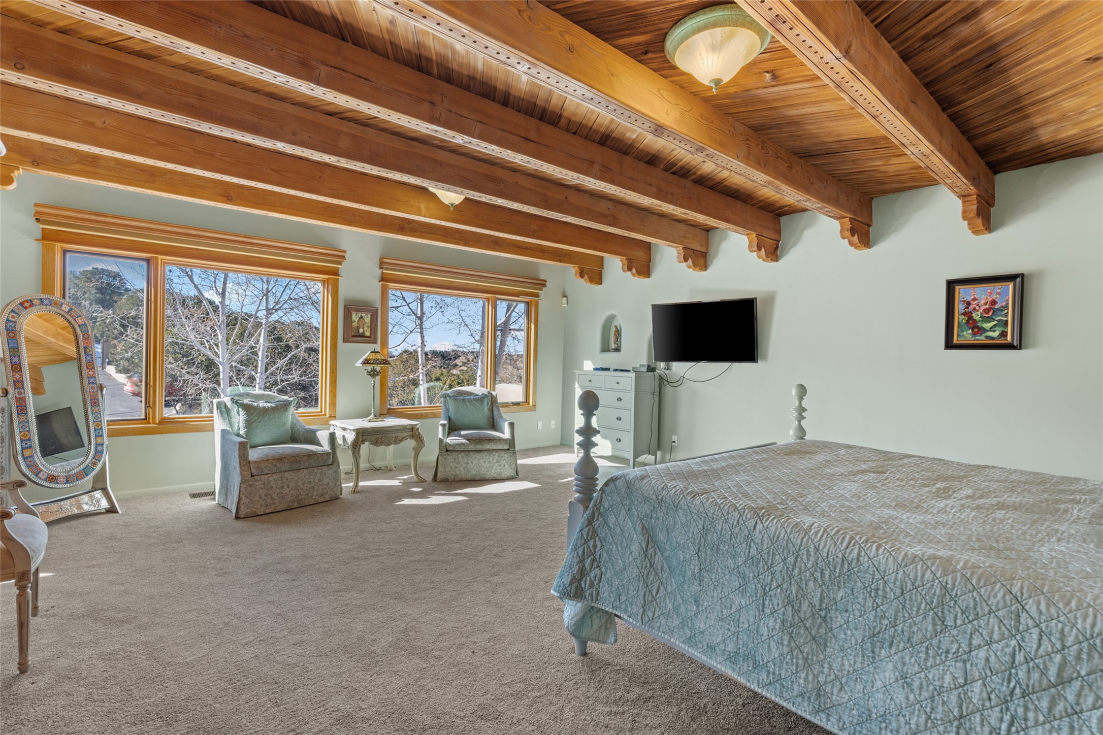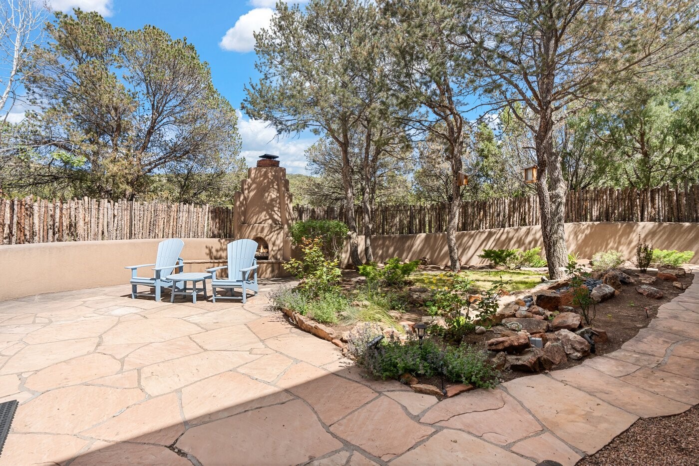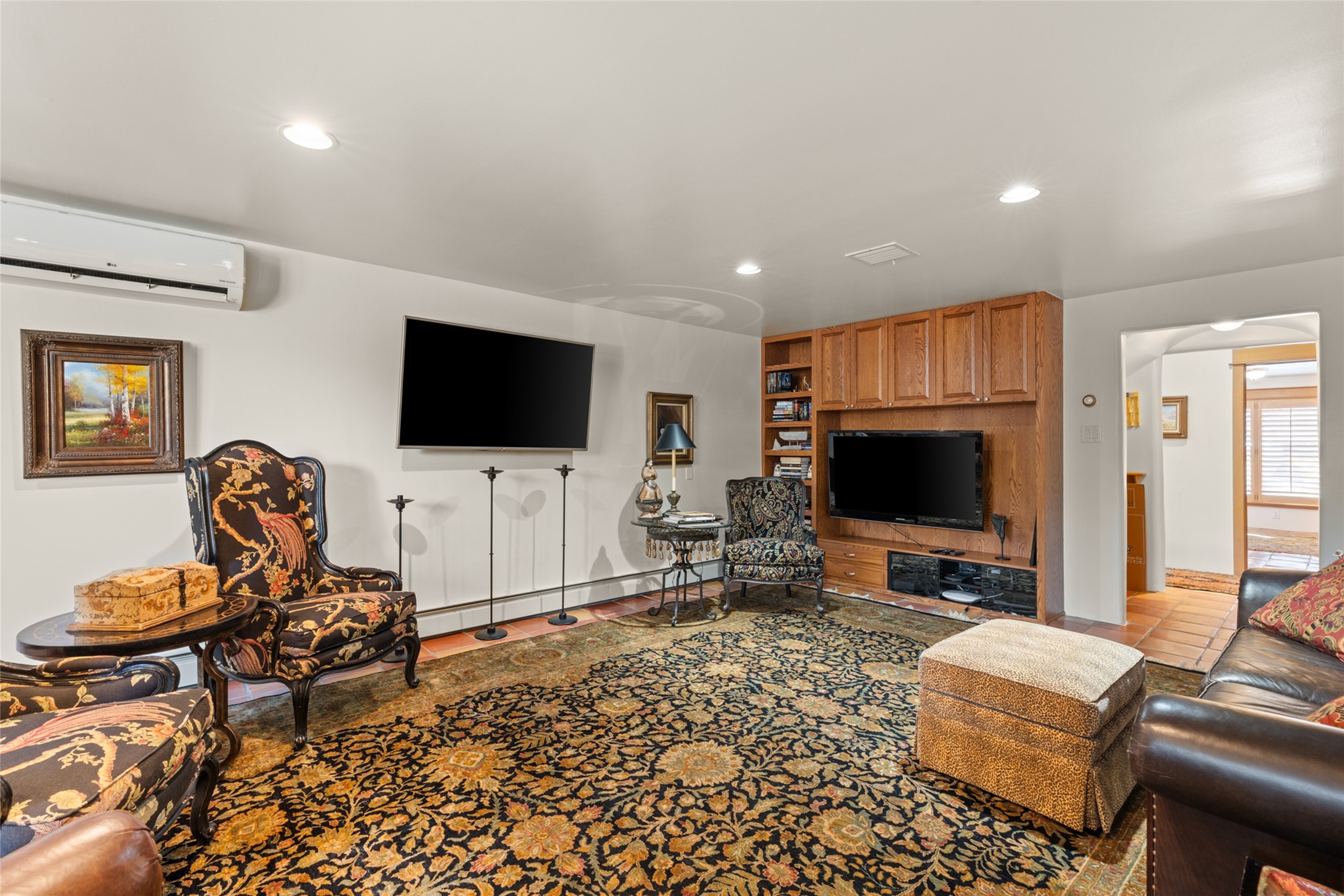 Situated on a large, secluded, and serene 2 acre north-side estate, an exquisite transformation has taken place. The two levels of the main house have been opened and expanded, resulting in a thoughtful home filled with natural light. Walls of windows look upon treetops, fabulous Jemez Mountain and sunset views, and abundant foliage and wildlife. The upper level incorporates the primary suite and two other large bedrooms, a large open concept kitchen and dining area, with Saltillo tiles and vigas flowing into the living area, capped by a dramatic kiva fireplace. For the newly imagined lower level, 1,843 sq ft were added to the original 5,307 sq ft house to create a second lower wing in the main house. The result - 7,150 sq feet with total of 6 bedrooms, remodeled upstairs kitchen, a new 2nd living room with an enclosed patio, 2 new bedrooms, a den with a kitchenette and fireplace, office space, a new laundry room, and too many other new and remodeled features to mention here. The flexibility of these spaces is abundant. Additionally, the property boasts a 1020 sq ft RV garage, recently converted into a heated and cooled artist's studio. There is also a one bedroom casita and 2 two car garages. The guest house, art studio, and one 2 car garage have a separate address and a 2nd gated entrance and the property now totals an extraordinary 8,545 sq ft of heated space on 2 landscaped acres. An amazing value.