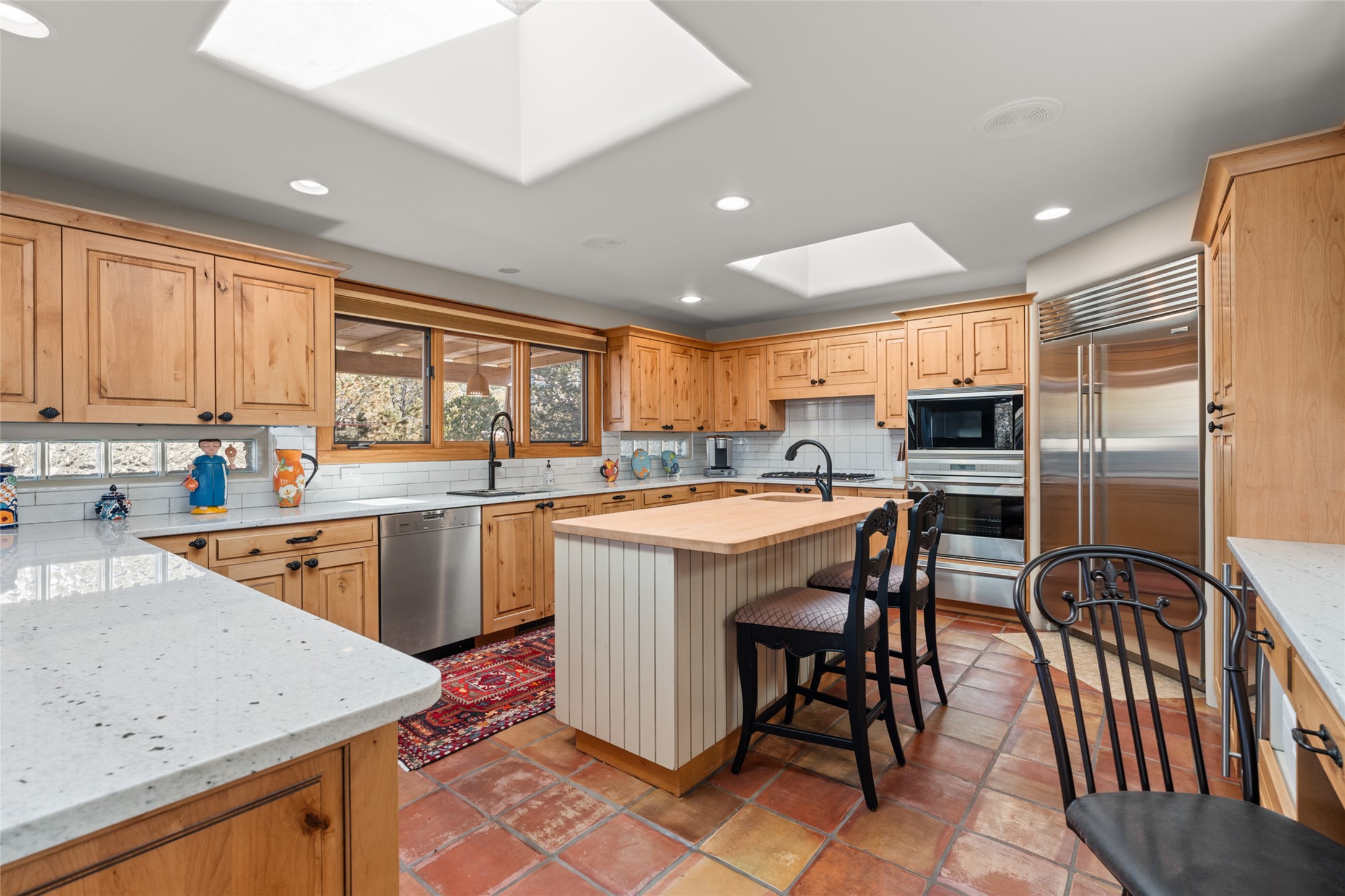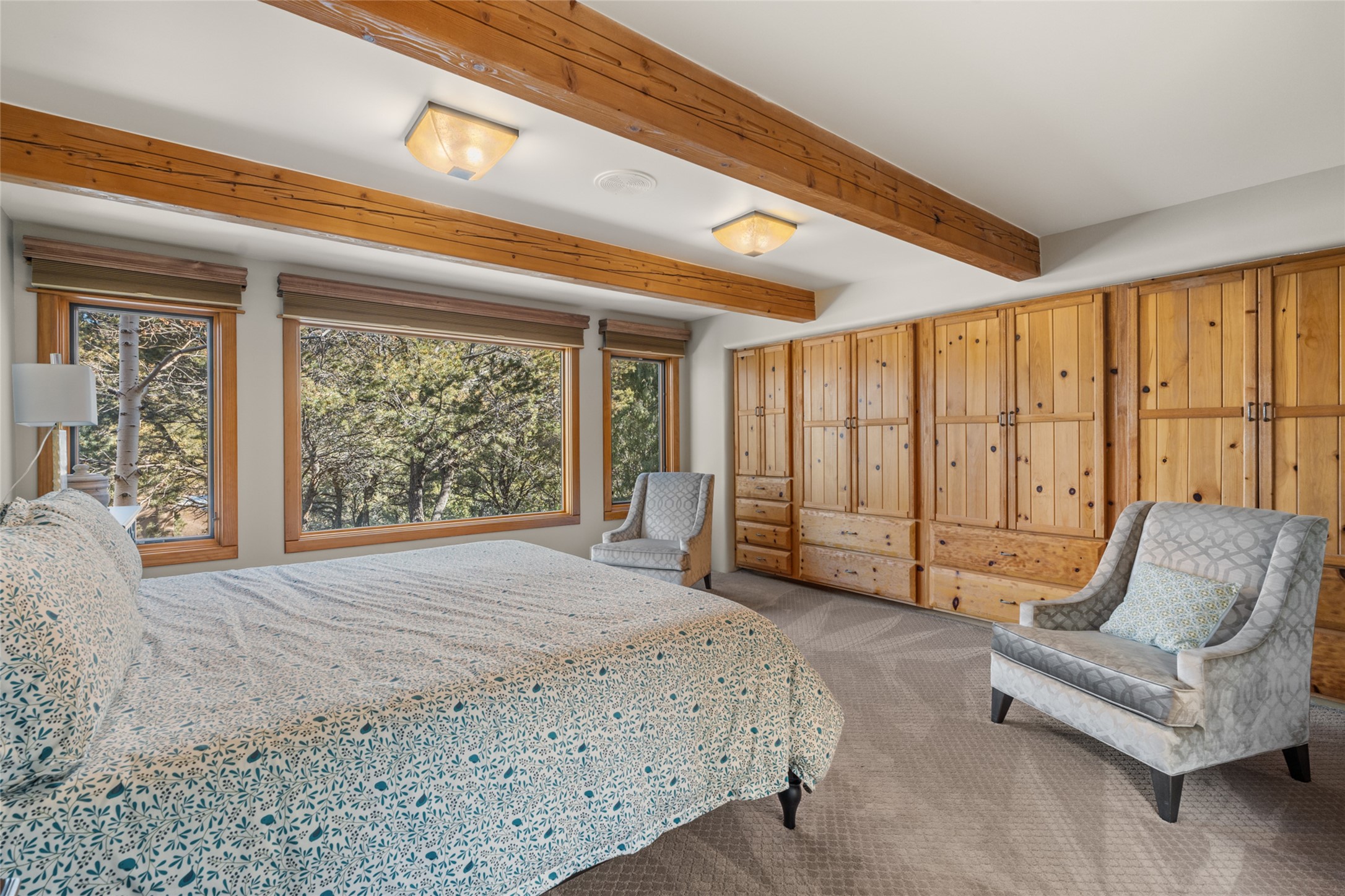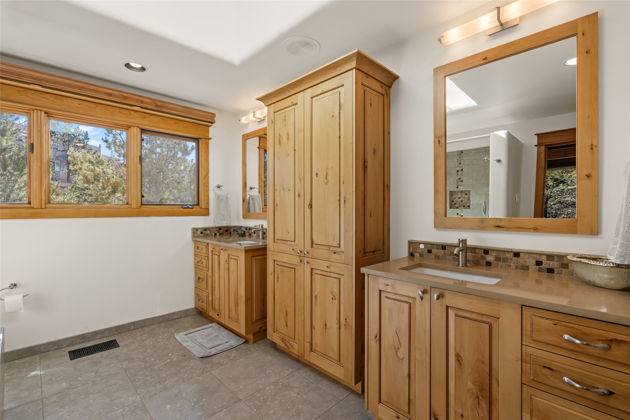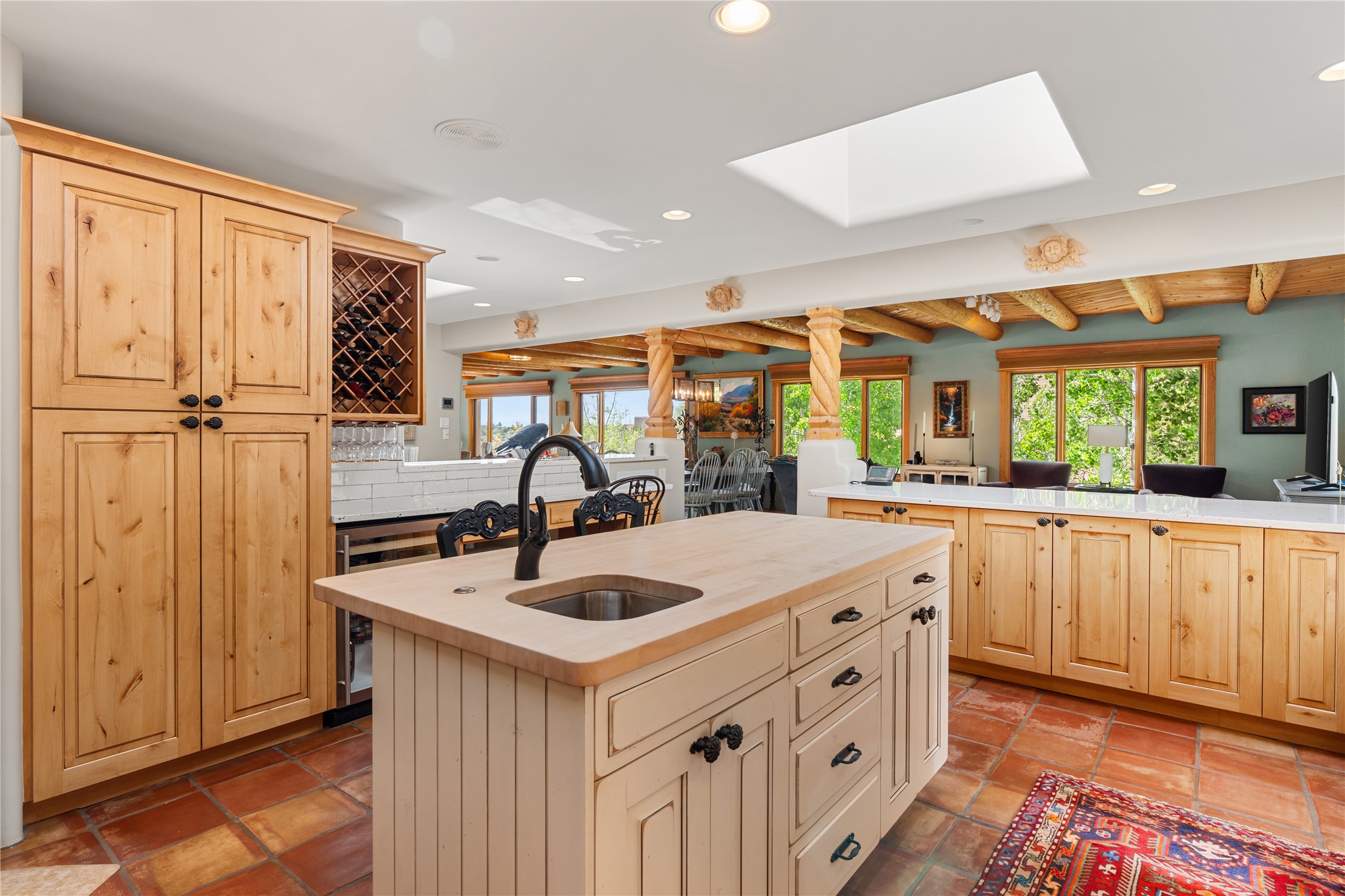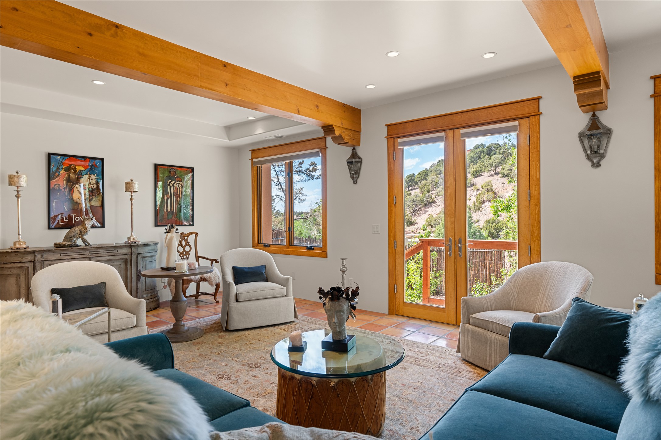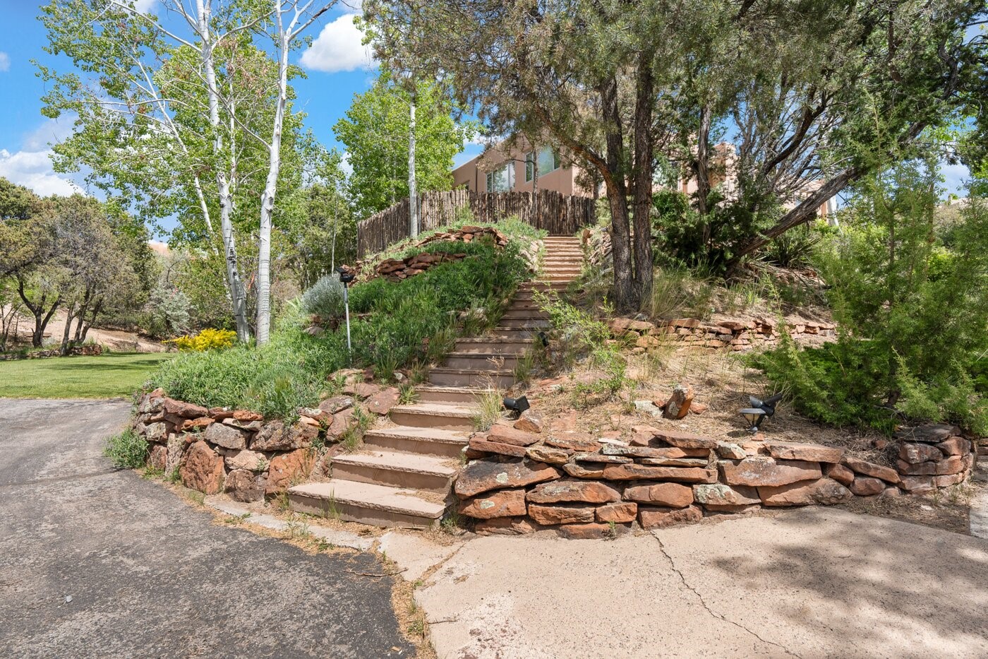 Situated on a large, secluded, and serene 2 acre north-side estate, an exquisite transformation has taken place. The two levels of the main house have been opened and expanded, resulting in a thoughtful home filled with natural light. Walls of windows look upon treetops, fabulous Jemez Mountain and sunset views, and abundant foliage and wildlife. The upper level incorporates the primary suite and two other large bedrooms, a large open concept kitchen and dining area, with Saltillo tiles and vigas flowing into the living area, capped by a dramatic kiva fireplace. For the newly imagined lower level, 1,843 sq ft were added to the original 5,307 sq ft house to create a second lower wing in the main house. The result - 7,150 sq feet with total of 6 bedrooms, remodeled upstairs kitchen, a new 2nd living room with an enclosed patio, 2 new bedrooms, a den with a kitchenette and fireplace, office space, a new laundry room, and too many other new and remodeled features to mention here. The flexibility of these spaces is abundant. Additionally, the property boasts a 1020 sq ft RV garage, recently converted into a heated and cooled artist's studio. There is also a one bedroom casita and 2 two car garages. The guest house, art studio, and one 2 car garage have a separate address and a 2nd gated entrance and the property now totals an extraordinary 8,545 sq ft of heated space on 2 landscaped acres. An amazing value.