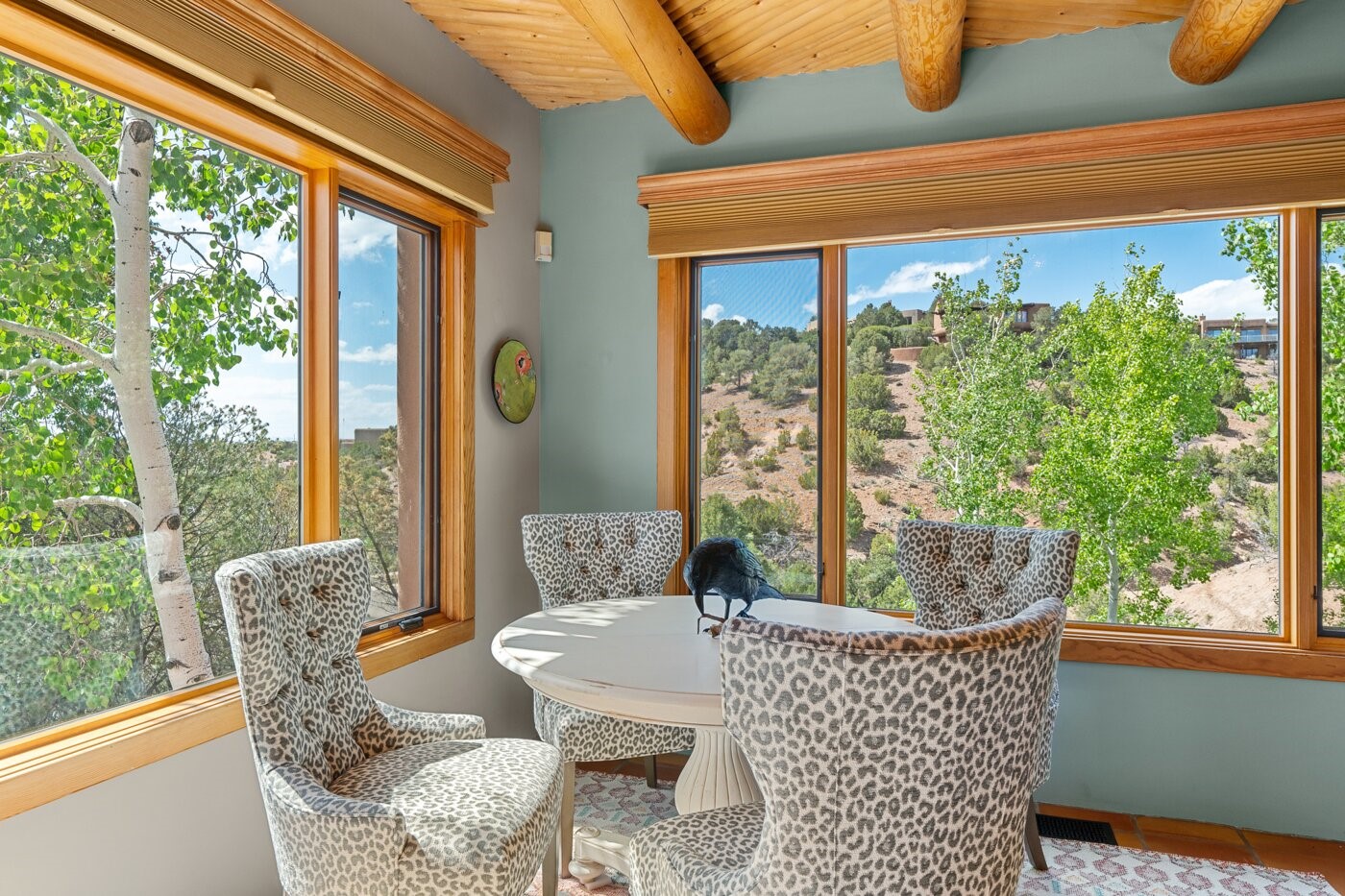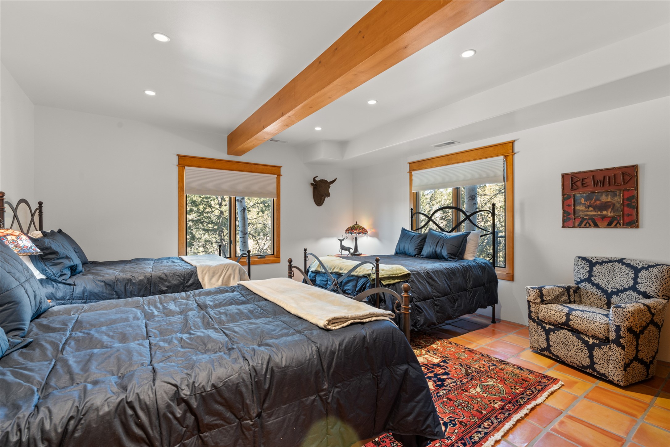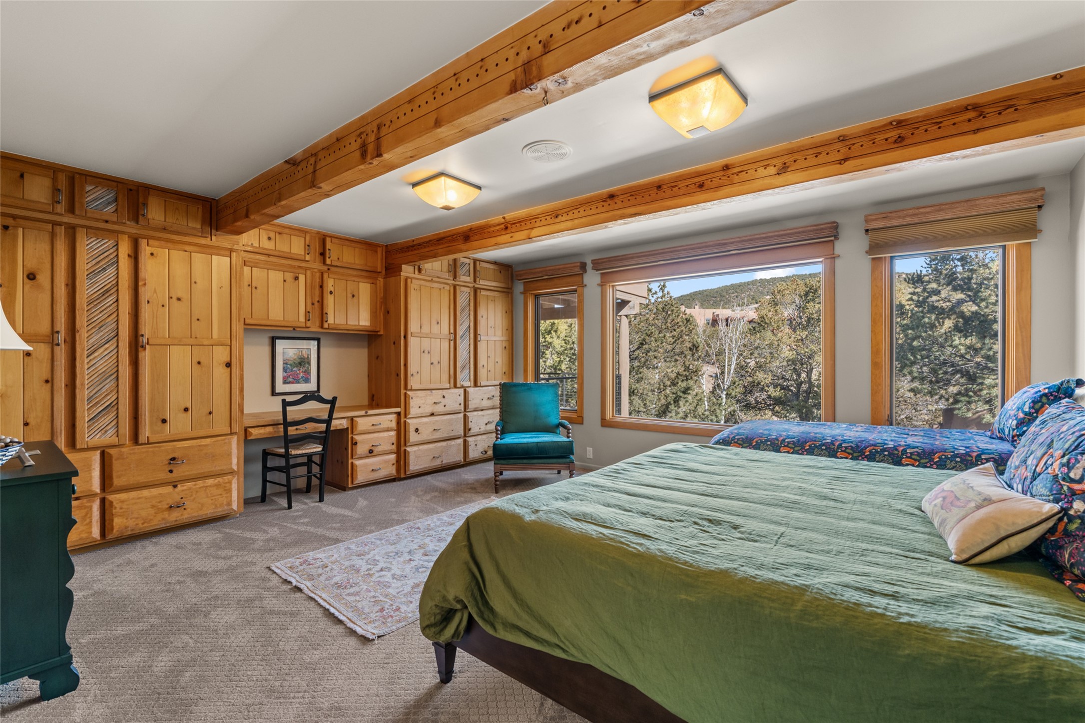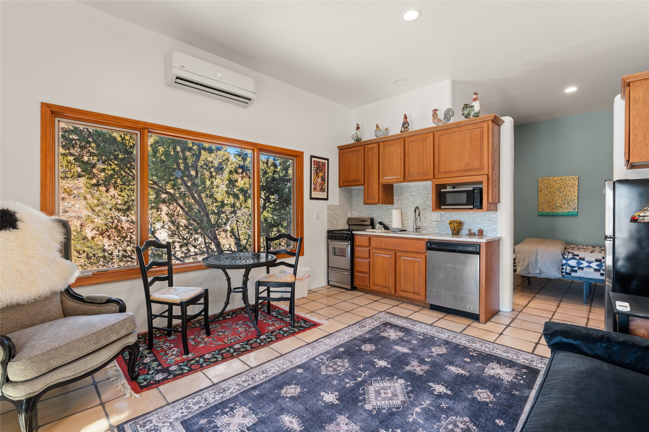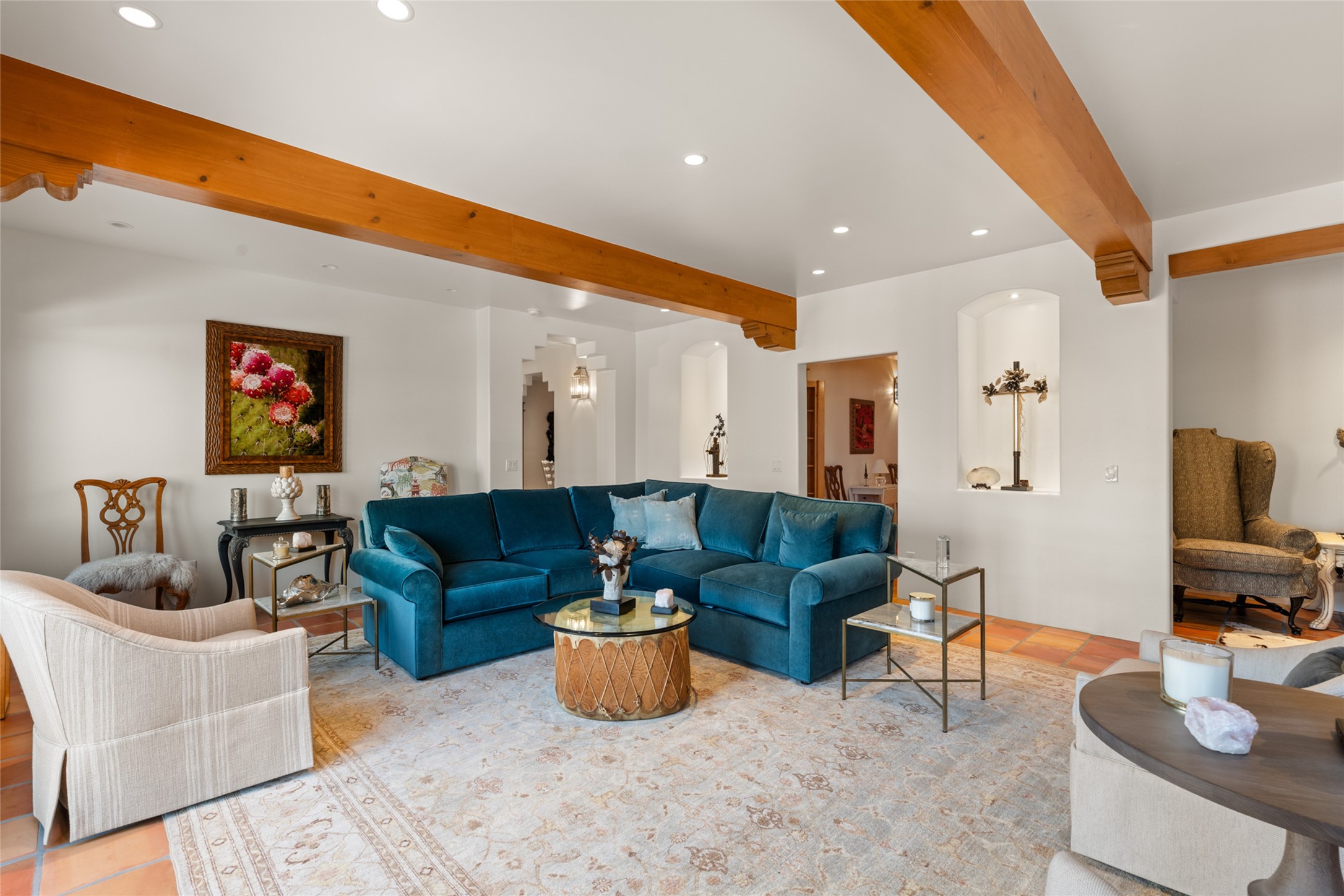 Situated on a large, secluded, and serene 2 acre north-side estate, an exquisite transformation has taken place. The two levels of the main house have been opened and expanded, resulting in a thoughtful home filled with natural light. Walls of windows look upon treetops, fabulous Jemez Mountain and sunset views, and abundant foliage and wildlife. The upper level incorporates the primary suite and two other large bedrooms, a large open concept kitchen and dining area, with Saltillo tiles and vigas flowing into the living area, capped by a dramatic kiva fireplace. For the newly imagined lower level, 1,843 sq ft were added to the original 5,307 sq ft house to create a second lower wing in the main house. The result - 7,150 sq feet with total of 6 bedrooms, remodeled upstairs kitchen, a new 2nd living room with an enclosed patio, 2 new bedrooms, a den with a kitchenette and fireplace, office space, a new laundry room, and too many other new and remodeled features to mention here. The flexibility of these spaces is abundant. Additionally, the property boasts a 1020 sq ft RV garage, recently converted into a heated and cooled artist's studio. There is also a one bedroom casita and 2 two car garages. The guest house, art studio, and one 2 car garage have a separate address and a 2nd gated entrance and the property now totals an extraordinary 8,545 sq ft of heated space on 2 landscaped acres. An amazing value.