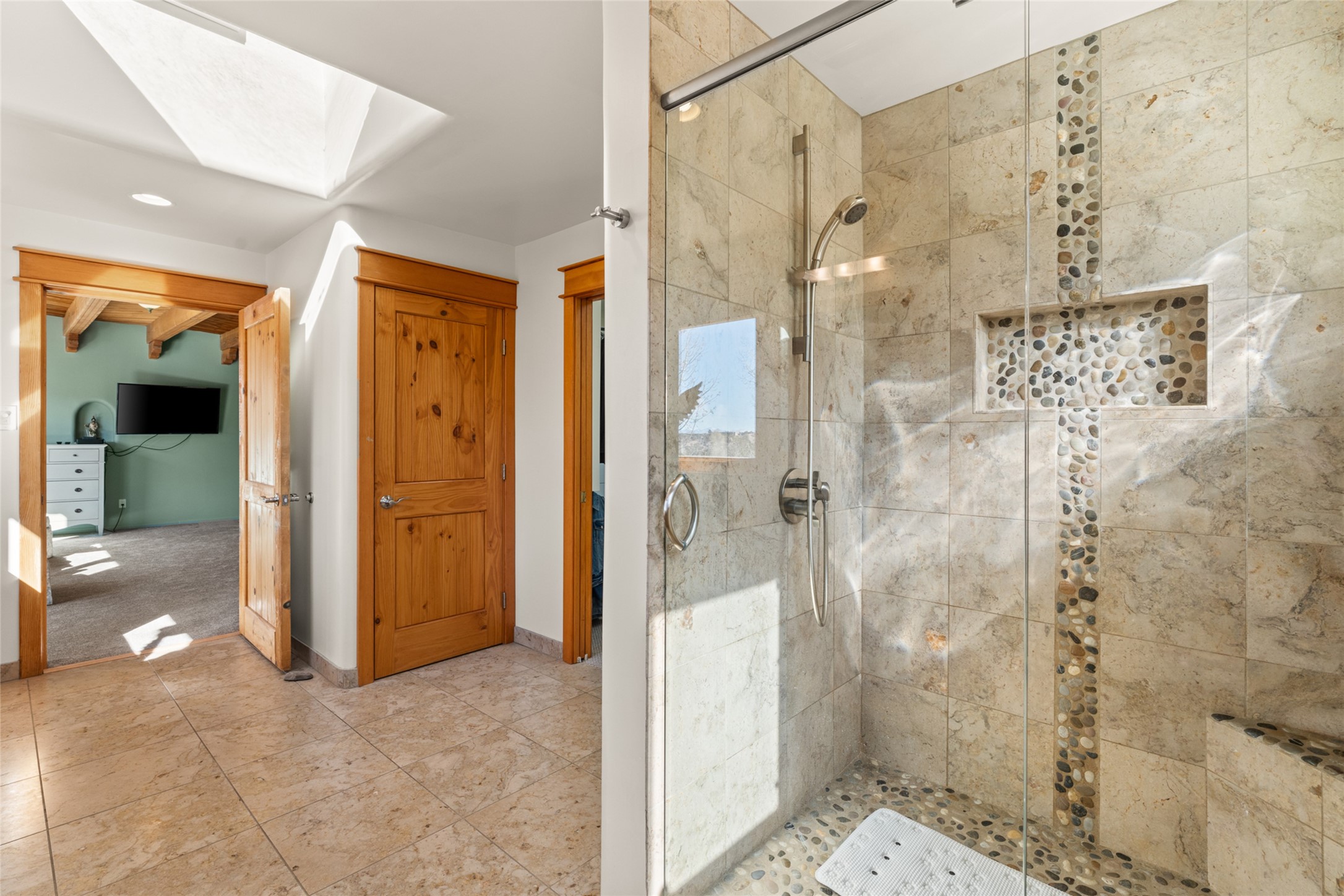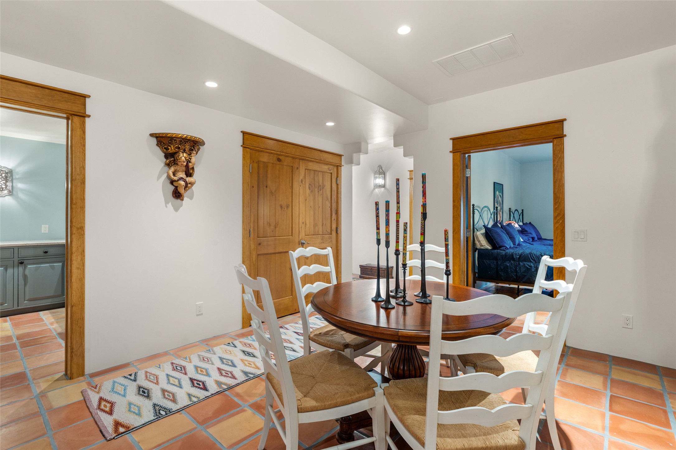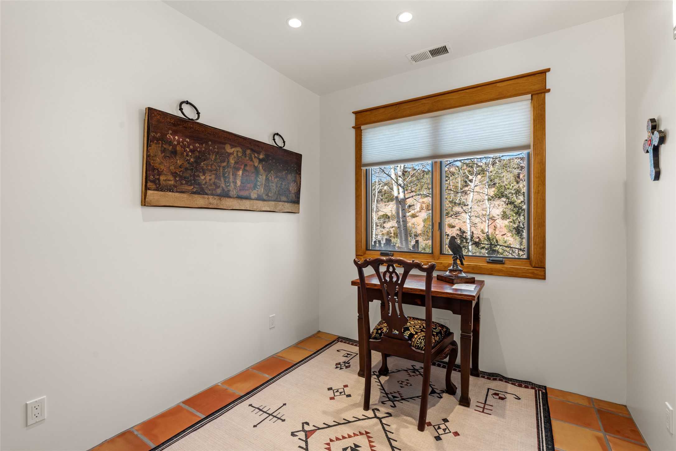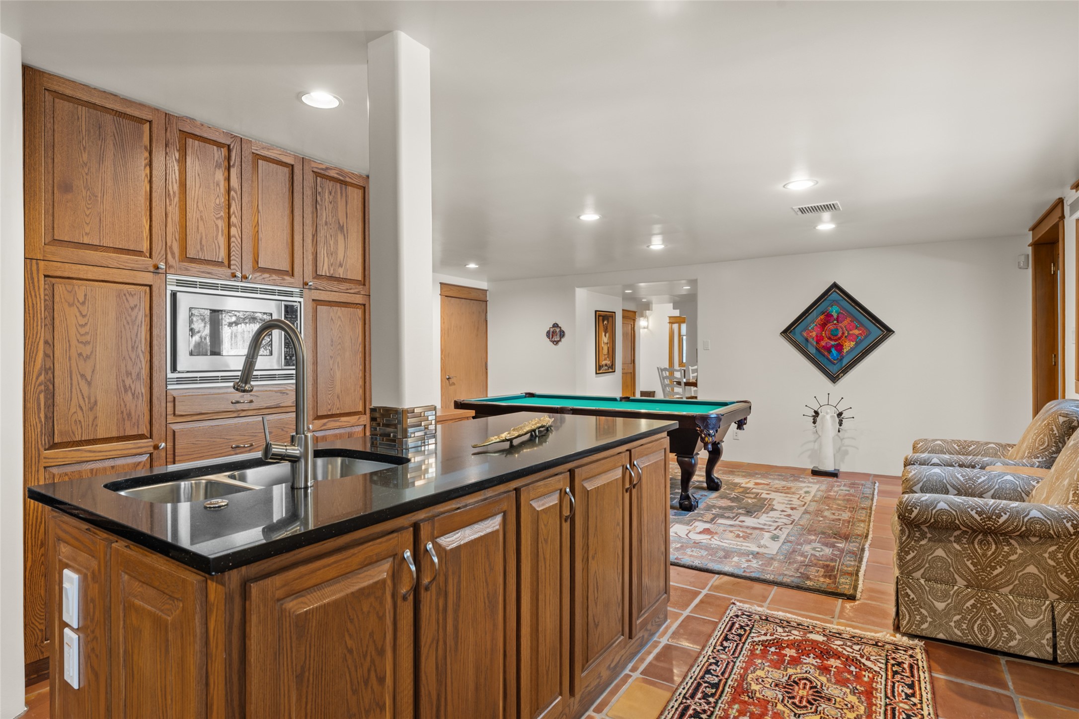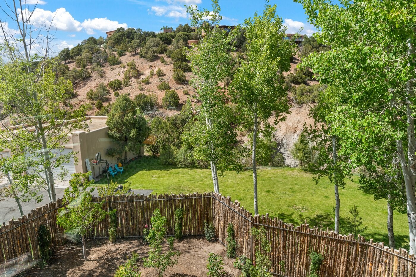 Situated on a large, secluded, and serene 2 acre north-side estate, an exquisite transformation has taken place. The two levels of the main house have been opened and expanded, resulting in a thoughtful home filled with natural light. Walls of windows look upon treetops, fabulous Jemez Mountain and sunset views, and abundant foliage and wildlife. The upper level incorporates the primary suite and two other large bedrooms, a large open concept kitchen and dining area, with Saltillo tiles and vigas flowing into the living area, capped by a dramatic kiva fireplace. For the newly imagined lower level, 1,843 sq ft were added to the original 5,307 sq ft house to create a second lower wing in the main house. The result - 7,150 sq feet with total of 6 bedrooms, remodeled upstairs kitchen, a new 2nd living room with an enclosed patio, 2 new bedrooms, a den with a kitchenette and fireplace, office space, a new laundry room, and too many other new and remodeled features to mention here. The flexibility of these spaces is abundant. Additionally, the property boasts a 1020 sq ft RV garage, recently converted into a heated and cooled artist's studio. There is also a one bedroom casita and 2 two car garages. The guest house, art studio, and one 2 car garage have a separate address and a 2nd gated entrance and the property now totals an extraordinary 8,545 sq ft of heated space on 2 landscaped acres. An amazing value.