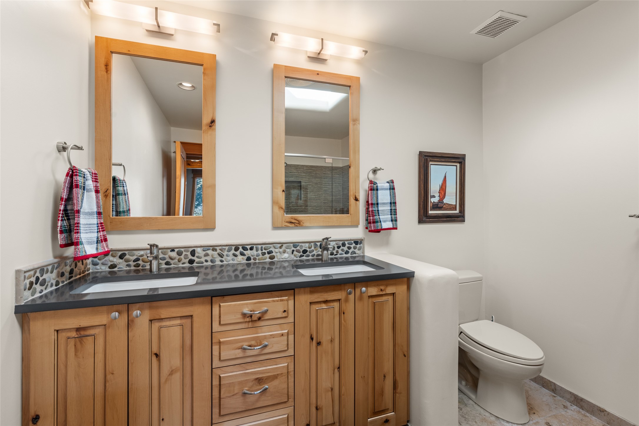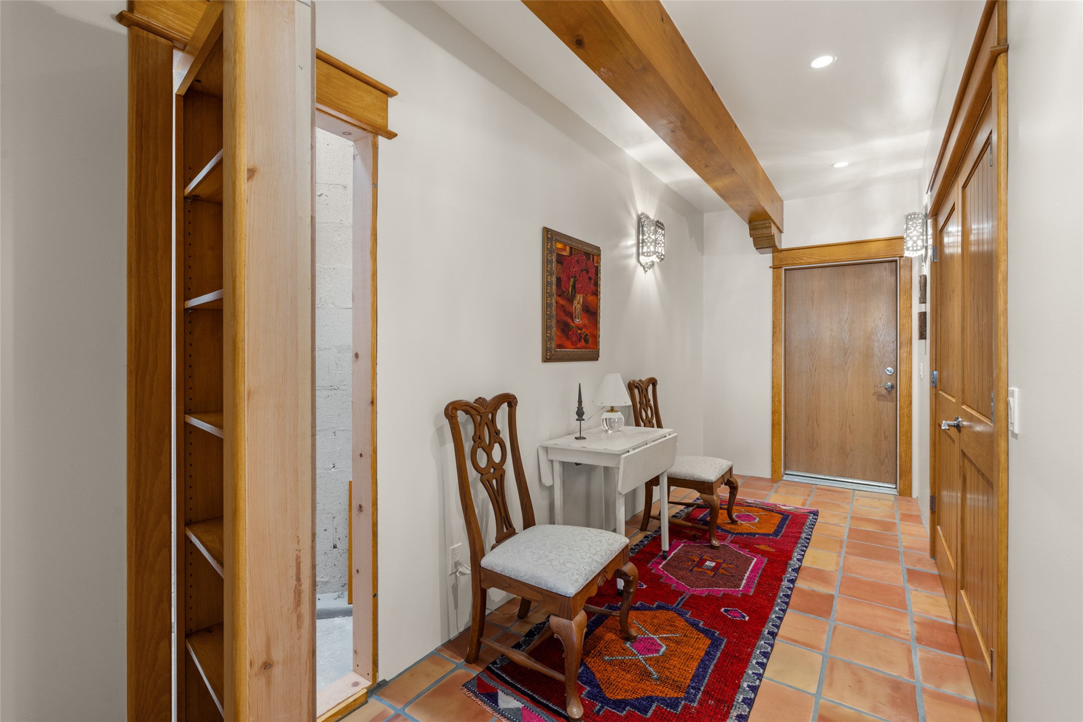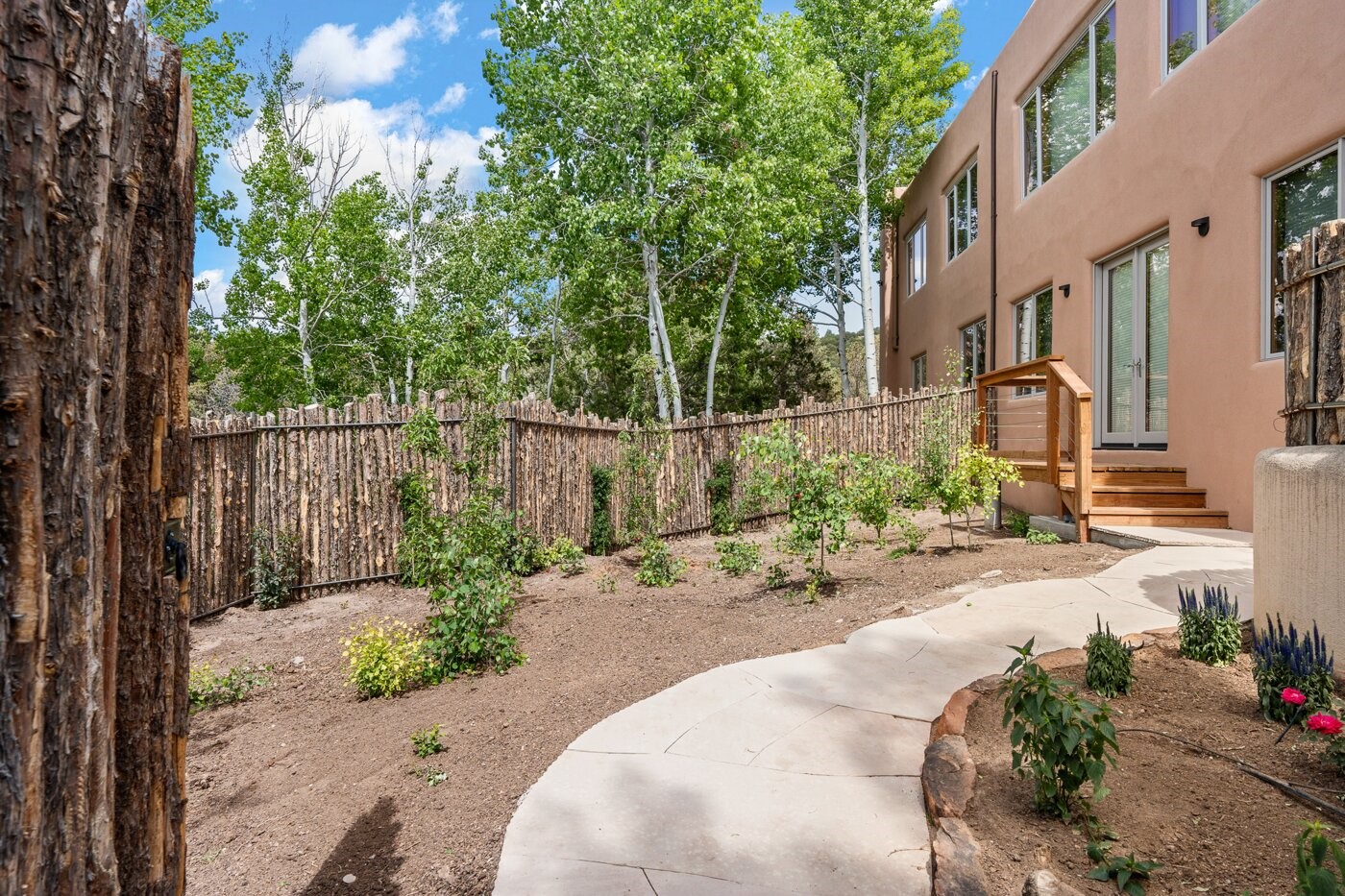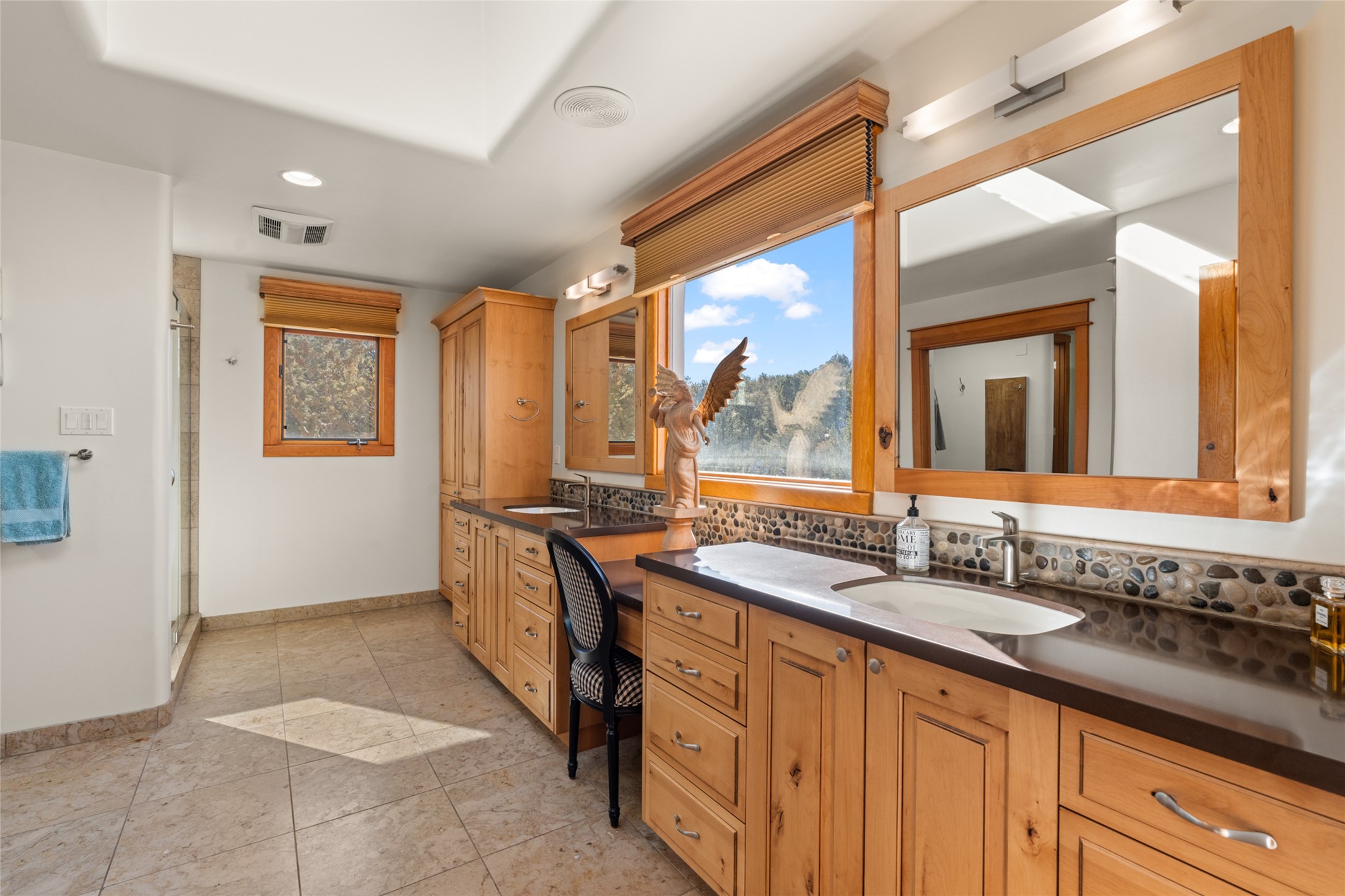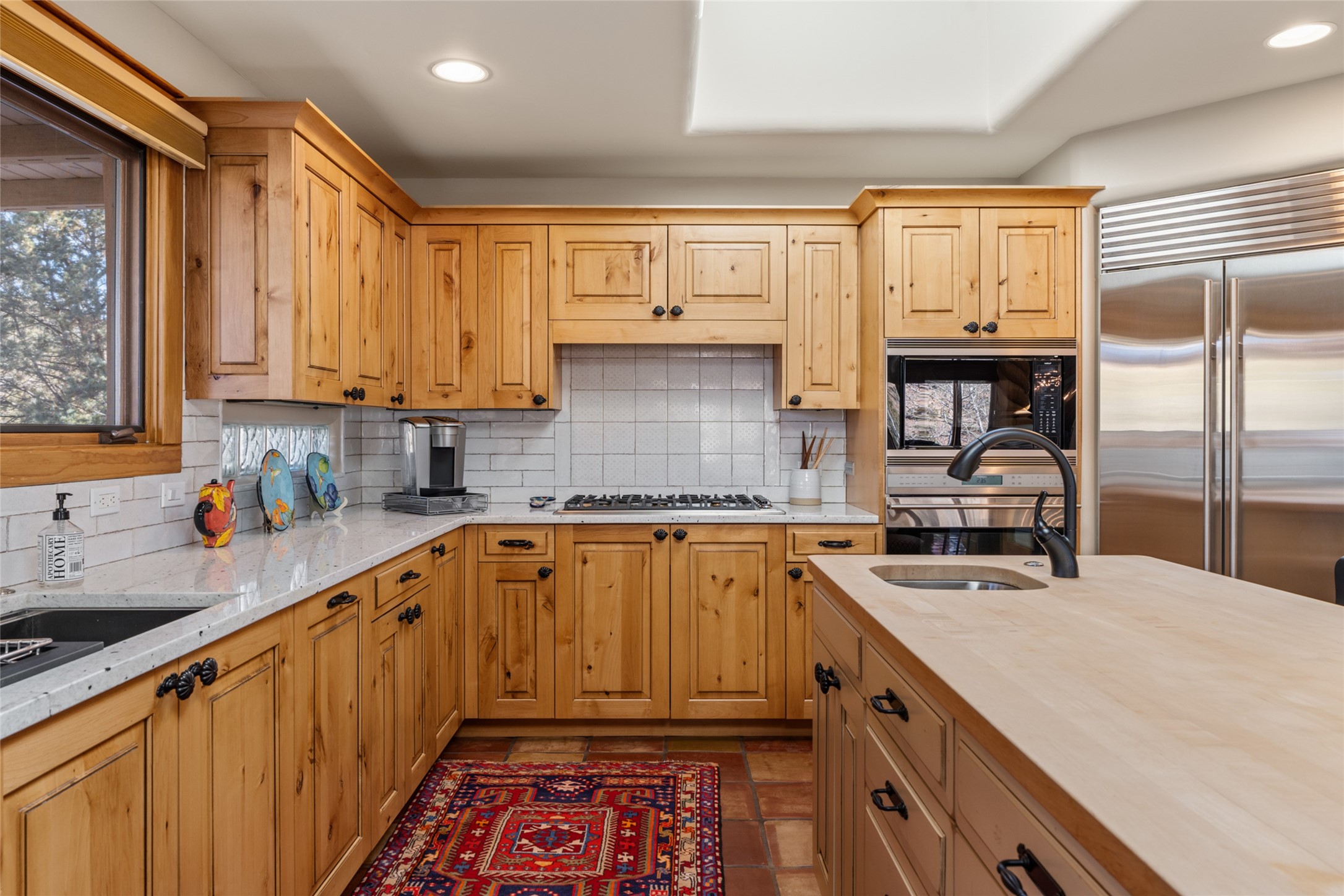Situated on a large, secluded, and serene 2 acre north-side estate, an exquisite transformation has taken place. The two levels of the main house have been opened and expanded, resulting in a thoughtful home filled with natural light. Walls of windows look upon treetops, fabulous Jemez Mountain and sunset views, and abundant foliage and wildlife. The upper level incorporates the primary suite and two other large bedrooms, a large open concept kitchen and dining area, with Saltillo tiles and vigas flowing into the living area, capped by a dramatic kiva fireplace. For the newly imagined lower level, 1,843 sq ft were added to the original 5,307 sq ft house to create a second lower wing in the main house. The result - 7,150 sq feet with total of 6 bedrooms, remodeled upstairs kitchen, a new 2nd living room with an enclosed patio, 2 new bedrooms, a den with a kitchenette and fireplace, office space, a new laundry room, and too many other new and remodeled features to mention here. The flexibility of these spaces is abundant. Additionally, the property boasts a 1020 sq ft RV garage, recently converted into a heated and cooled artist's studio. There is also a one bedroom casita and 2 two car garages. The guest house, art studio, and one 2 car garage have a separate address and a 2nd gated entrance and the property now totals an extraordinary 8,545 sq ft of heated space on 2 landscaped acres. An amazing value.