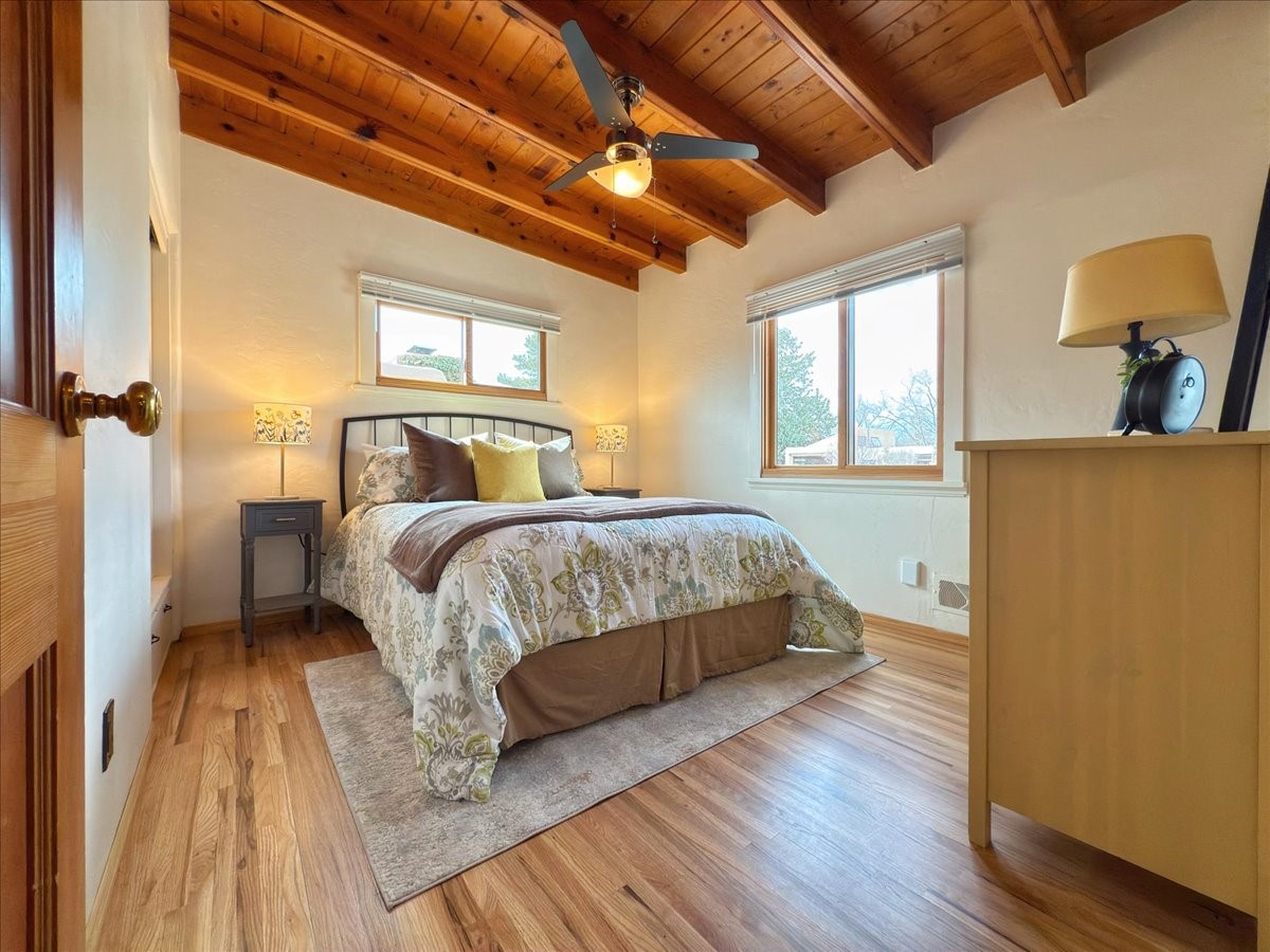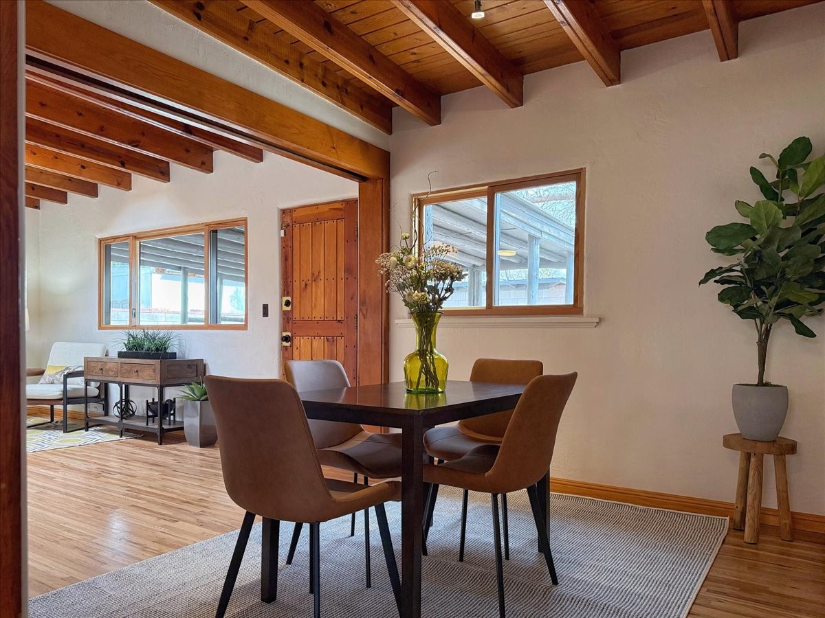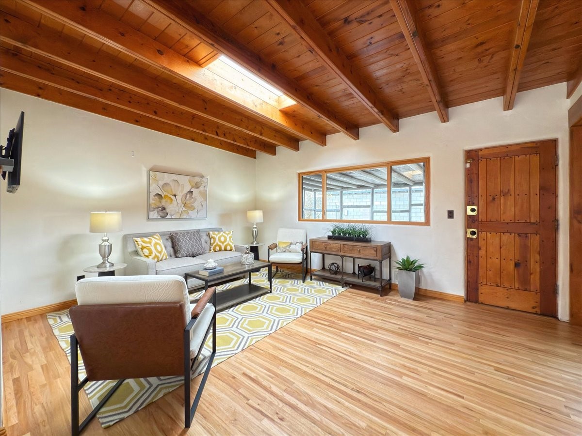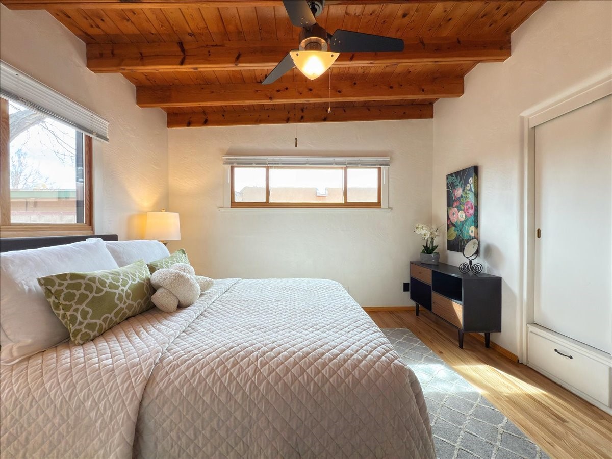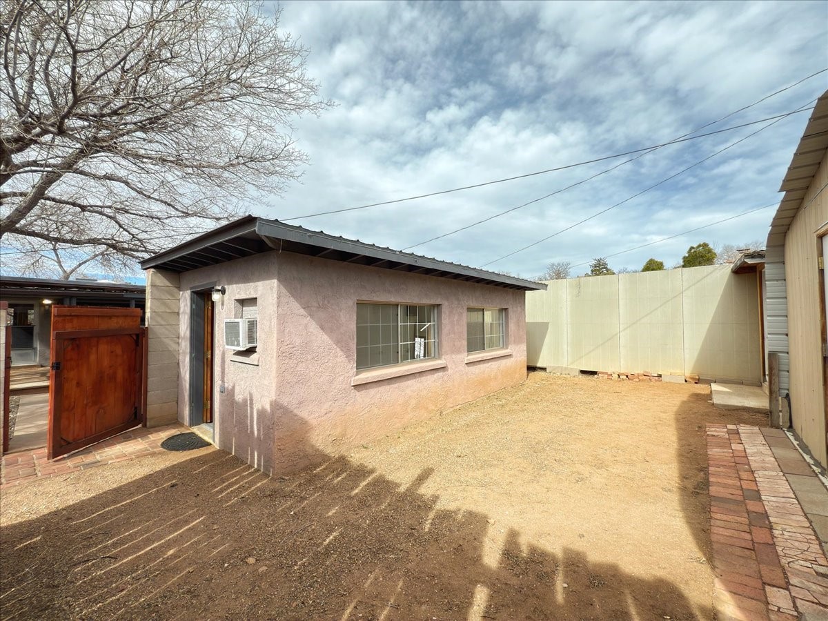 Welcome to this solid Stamm built home plus studio. This 1954 home retains charms of it's era, yet updated to today's standards. You'll love the original hardwood floors and Stamm doors! Custom wood work throughout. The third bedroom makes a great guest room or home office, separated on opposite sides of the house. The home is equipped with central air and heat, plus a tankless water heater and whole house water filtration system. The detached studio, with heat and cooling, could also provide a private office or studio with lots of natural light. As a bonus, this property has two large storage sheds, so the newer owner(s) never lack for storage space. The house comes with an installed EV charger in the carport. Centrally located to all things Santa Fe, you owe to yourself to come check this one out.