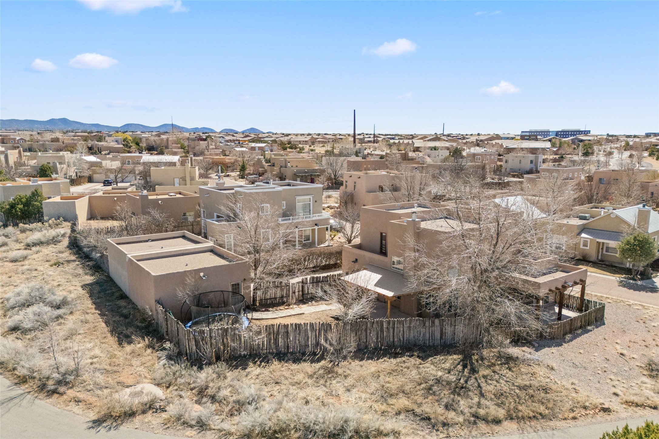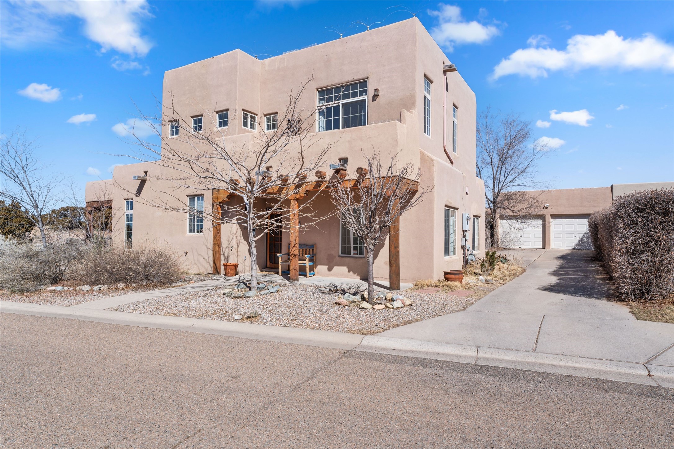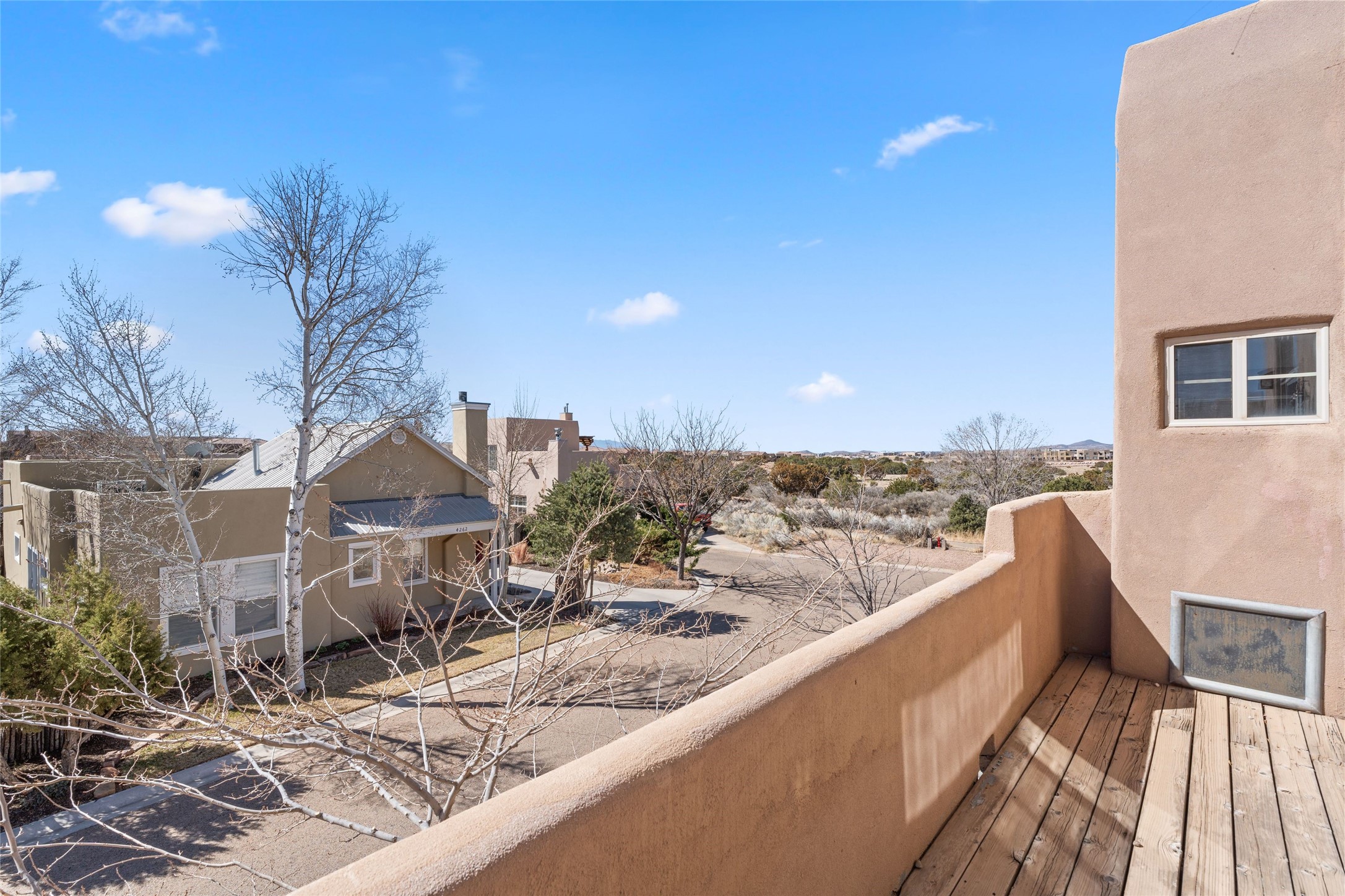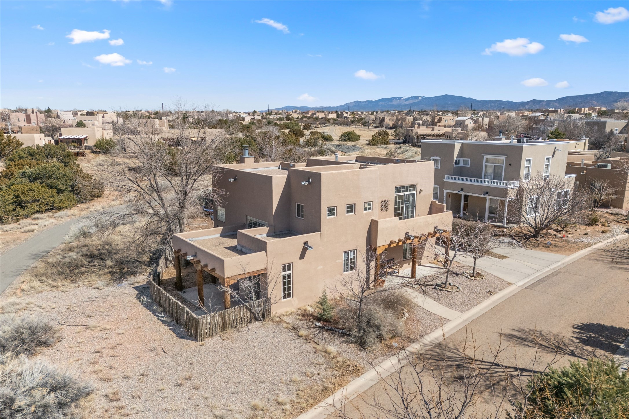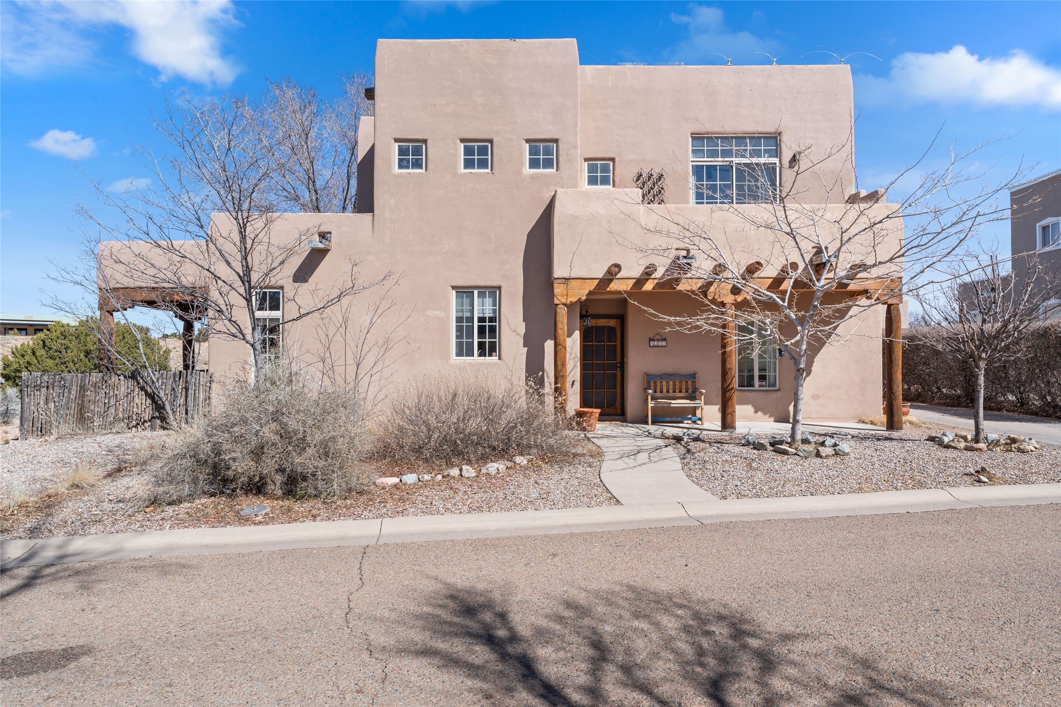 Pueblo style 3-bedroom, 2-bath home located in the desirable community of Nave Ade. Offering captivating 360-degree views of the stunning New Mexico landscape, this residence is designed for both comfort and style. Property is very private as it is at the end of a cul-de-sac and next to an arroyo which enhances the sense of nature and space. As you enter, you'll be greeted by high beamed ceilings and an abundance of natural light that highlights the open floor plan. The open floor plan creates a seamless flow between the living area, complete with a fireplace, and the kitchen featuring a central island--ideal for cooking and entertaining. Convenience is key with two spacious bedrooms, a full bath, and a laundry room all located on the main level. The primary suite, located upstairs, offers an oversized closet and a private deck, providing a tranquil retreat with breathtaking views. Step outside to enjoy the expansive outdoor patio that wraps around the south and west sides of the home, ideal for outdoor entertaining, morning coffee, or soaking in the warm New Mexico sun. The property also includes a detached 2-car garage with one side converted to a studio, adding to its functionality. Nave Ade is a thoughtfully planned development situated near the Santa Fe Community College, offering a vibrant lifestyle. Residents can enjoy access to a clubhouse featuring a workout room, swimming pool, steam room, and a network of walking trails that encourage outdoor exploration