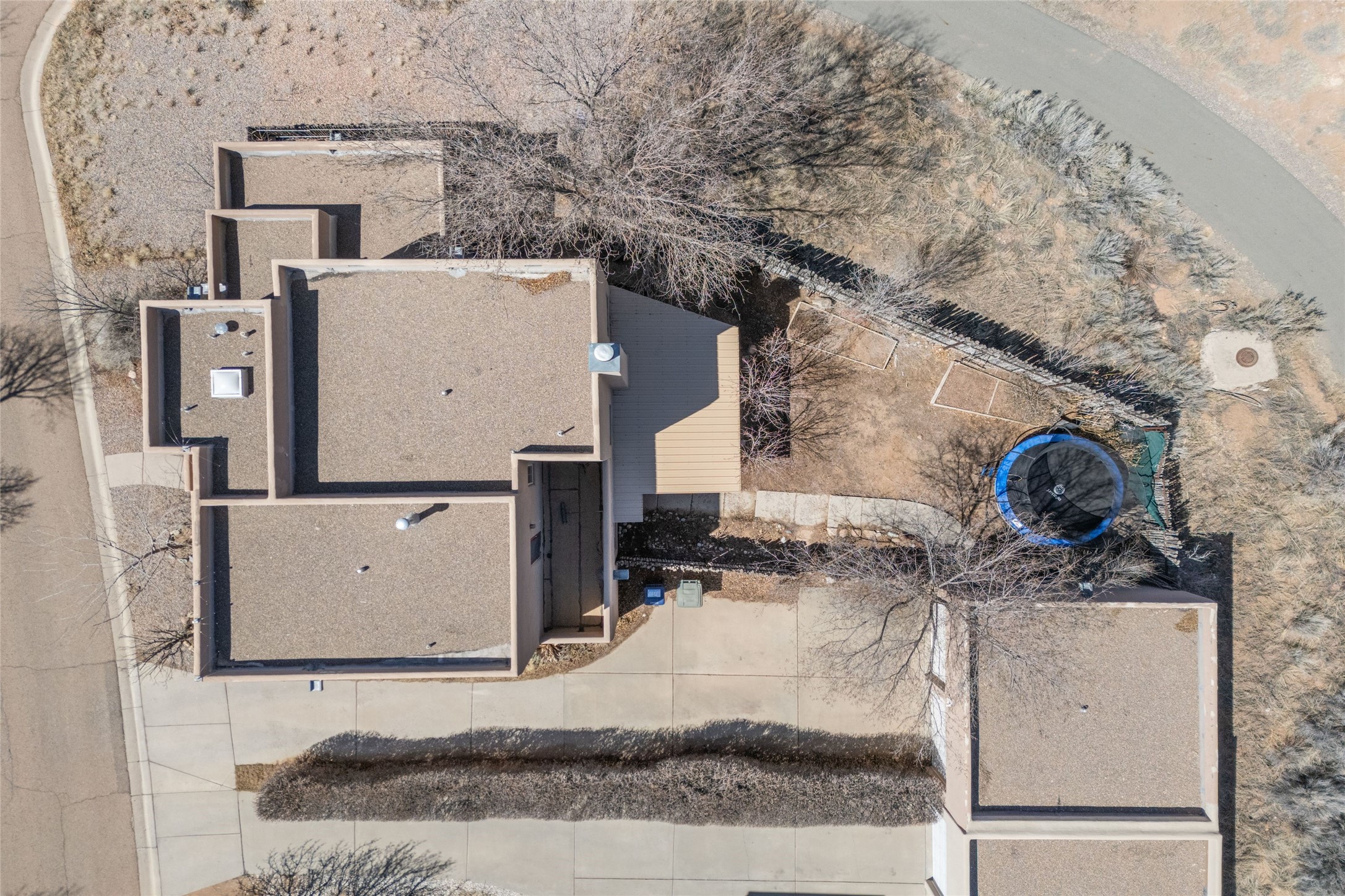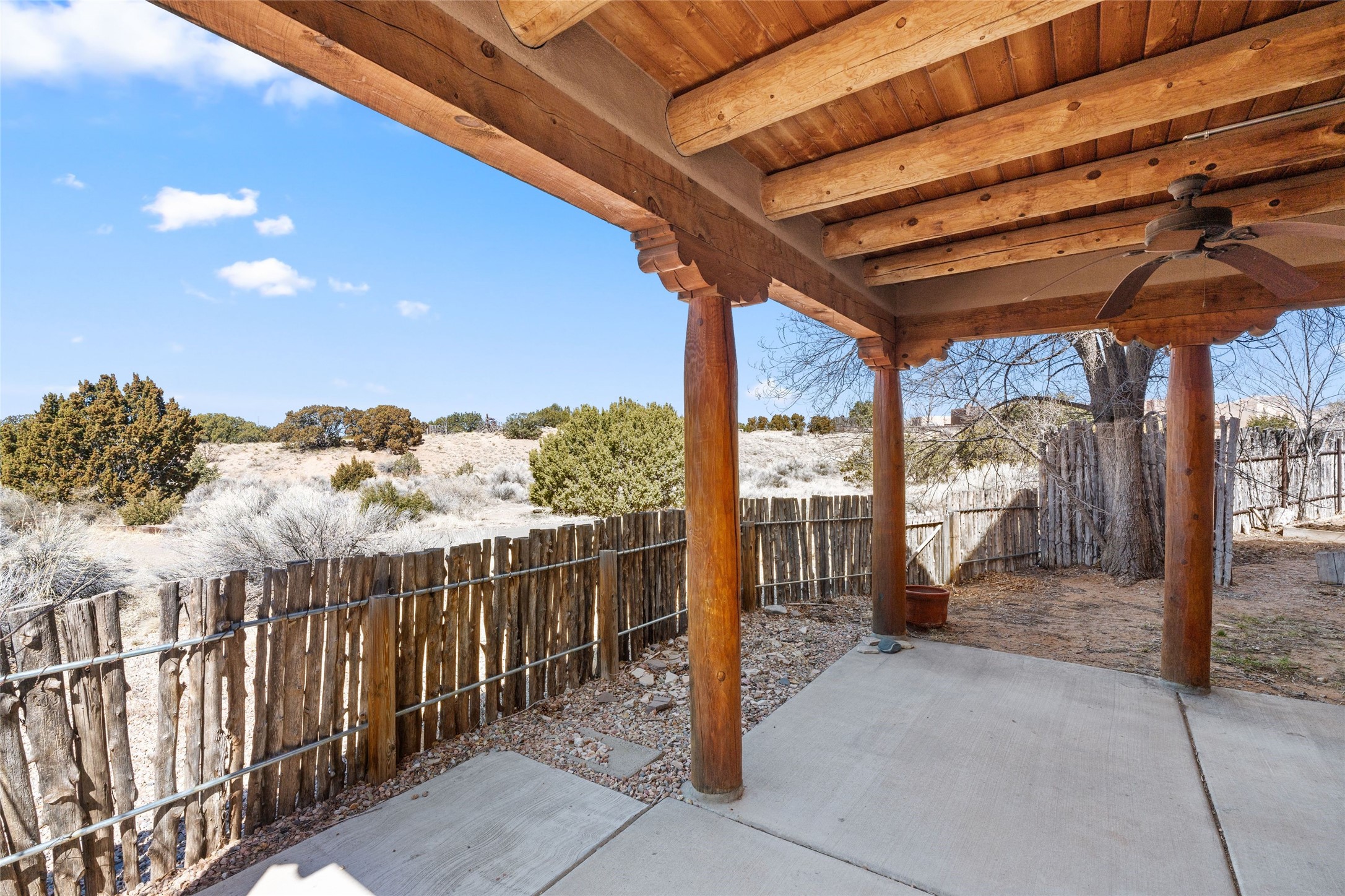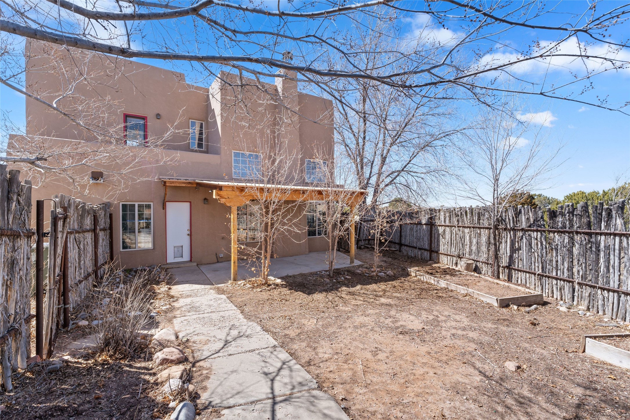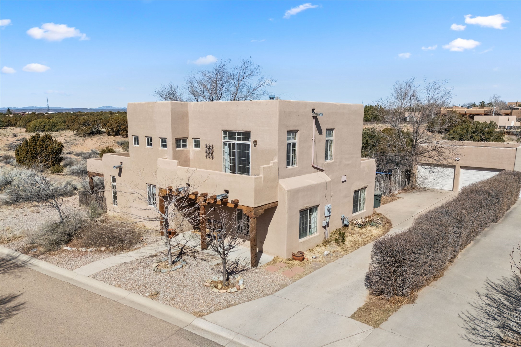 Pueblo style 3-bedroom, 2-bath home located in the desirable community of Nave Ade. Offering captivating 360-degree views of the stunning New Mexico landscape, this residence is designed for both comfort and style. Property is very private as it is at the end of a cul-de-sac and next to an arroyo which enhances the sense of nature and space. As you enter, you'll be greeted by high beamed ceilings and an abundance of natural light that highlights the open floor plan. The open floor plan creates a seamless flow between the living area, complete with a fireplace, and the kitchen featuring a central island--ideal for cooking and entertaining. Convenience is key with two spacious bedrooms, a full bath, and a laundry room all located on the main level. The primary suite, located upstairs, offers an oversized closet and a private deck, providing a tranquil retreat with breathtaking views. Step outside to enjoy the expansive outdoor patio that wraps around the south and west sides of the home, ideal for outdoor entertaining, morning coffee, or soaking in the warm New Mexico sun. The property also includes a detached 2-car garage with one side converted to a studio, adding to its functionality. Nave Ade is a thoughtfully planned development situated near the Santa Fe Community College, offering a vibrant lifestyle. Residents can enjoy access to a clubhouse featuring a workout room, swimming pool, steam room, and a network of walking trails that encourage outdoor exploration