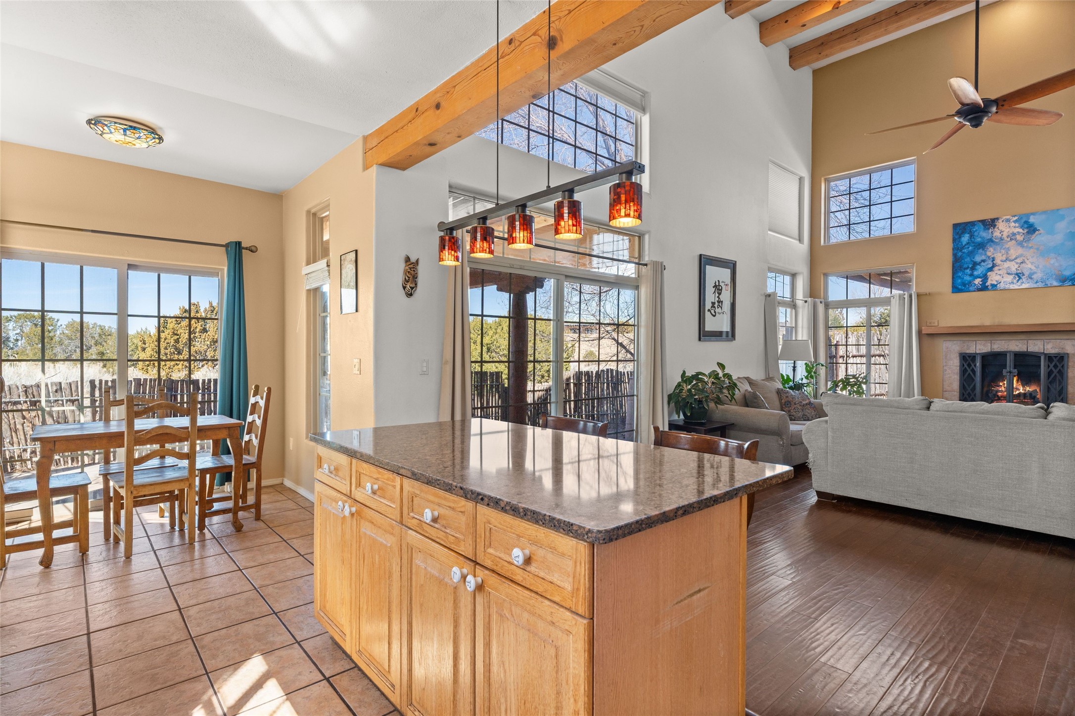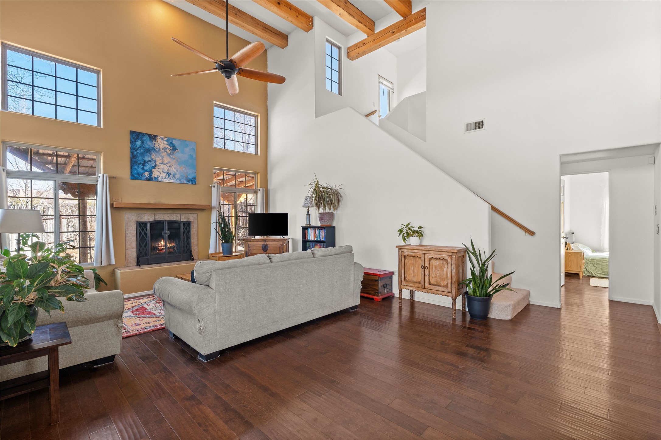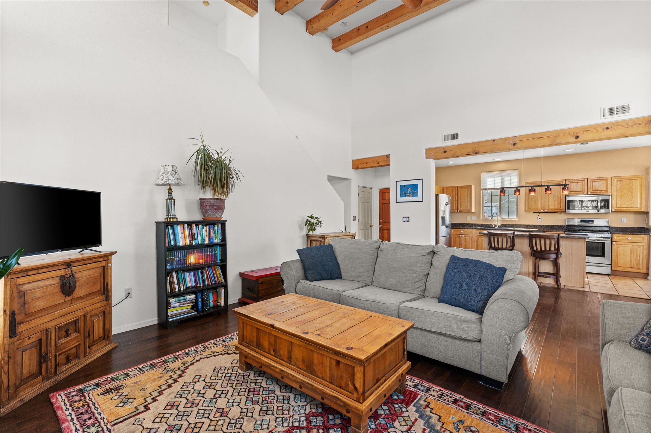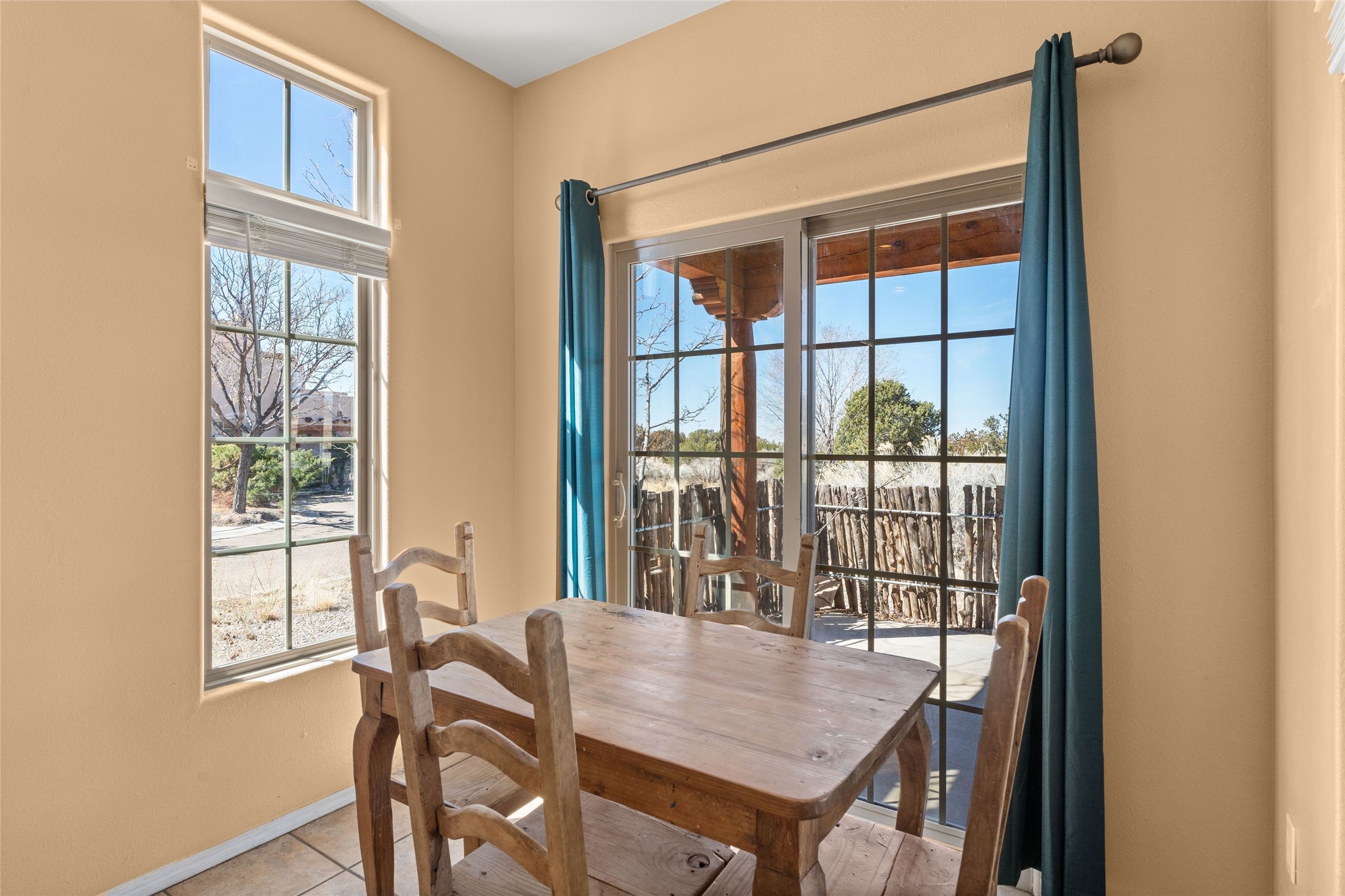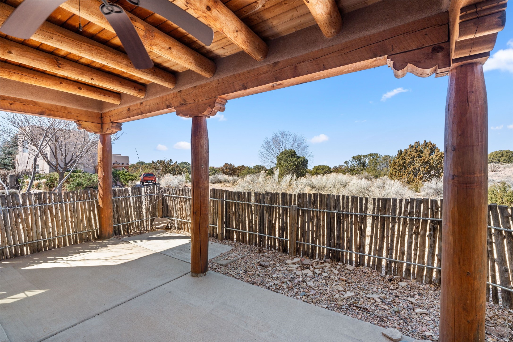 Pueblo style 3-bedroom, 2-bath home located in the desirable community of Nave Ade. Offering captivating 360-degree views of the stunning New Mexico landscape, this residence is designed for both comfort and style. Property is very private as it is at the end of a cul-de-sac and next to an arroyo which enhances the sense of nature and space. As you enter, you'll be greeted by high beamed ceilings and an abundance of natural light that highlights the open floor plan. The open floor plan creates a seamless flow between the living area, complete with a fireplace, and the kitchen featuring a central island--ideal for cooking and entertaining. Convenience is key with two spacious bedrooms, a full bath, and a laundry room all located on the main level. The primary suite, located upstairs, offers an oversized closet and a private deck, providing a tranquil retreat with breathtaking views. Step outside to enjoy the expansive outdoor patio that wraps around the south and west sides of the home, ideal for outdoor entertaining, morning coffee, or soaking in the warm New Mexico sun. The property also includes a detached 2-car garage with one side converted to a studio, adding to its functionality. Nave Ade is a thoughtfully planned development situated near the Santa Fe Community College, offering a vibrant lifestyle. Residents can enjoy access to a clubhouse featuring a workout room, swimming pool, steam room, and a network of walking trails that encourage outdoor exploration