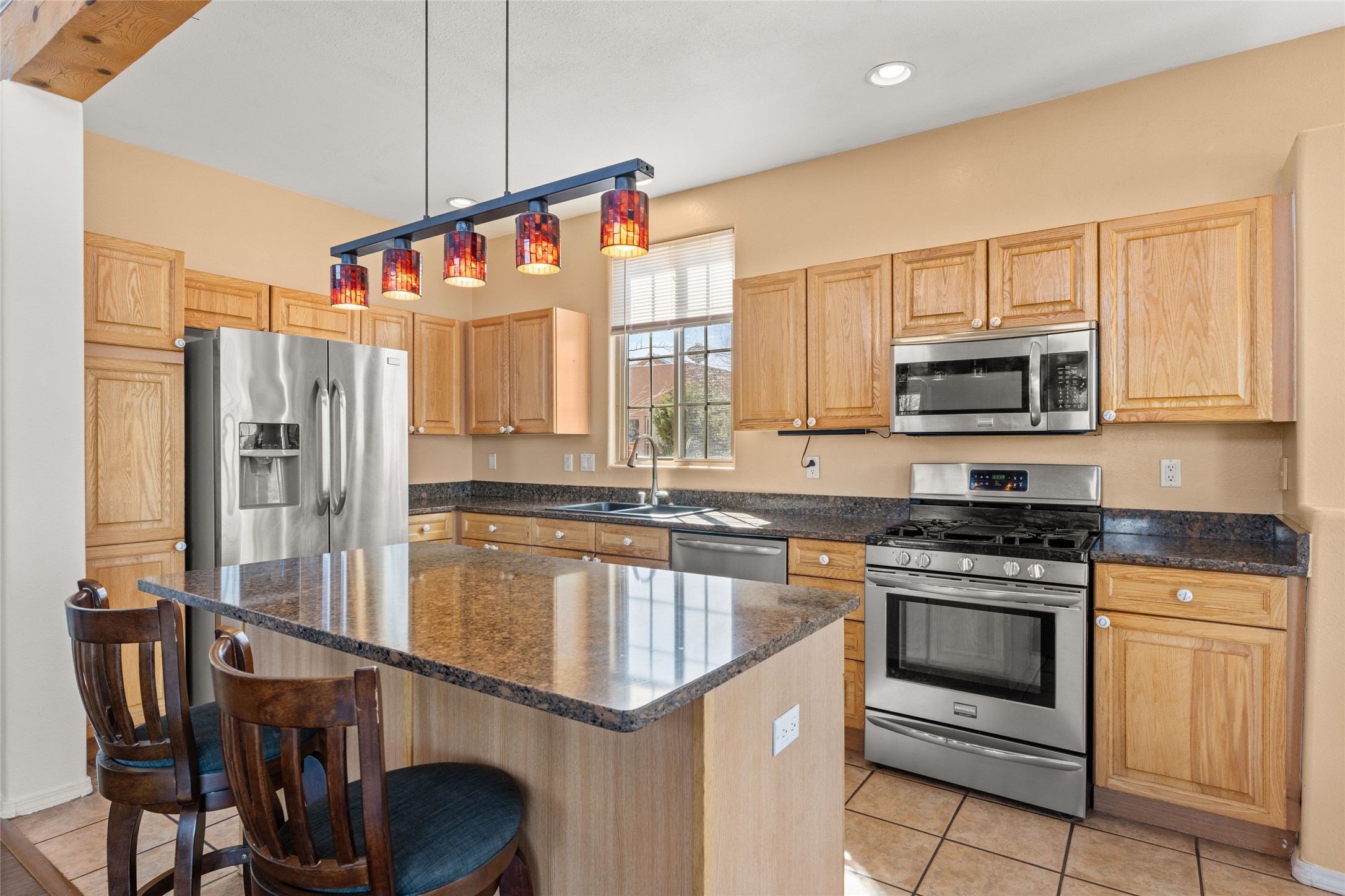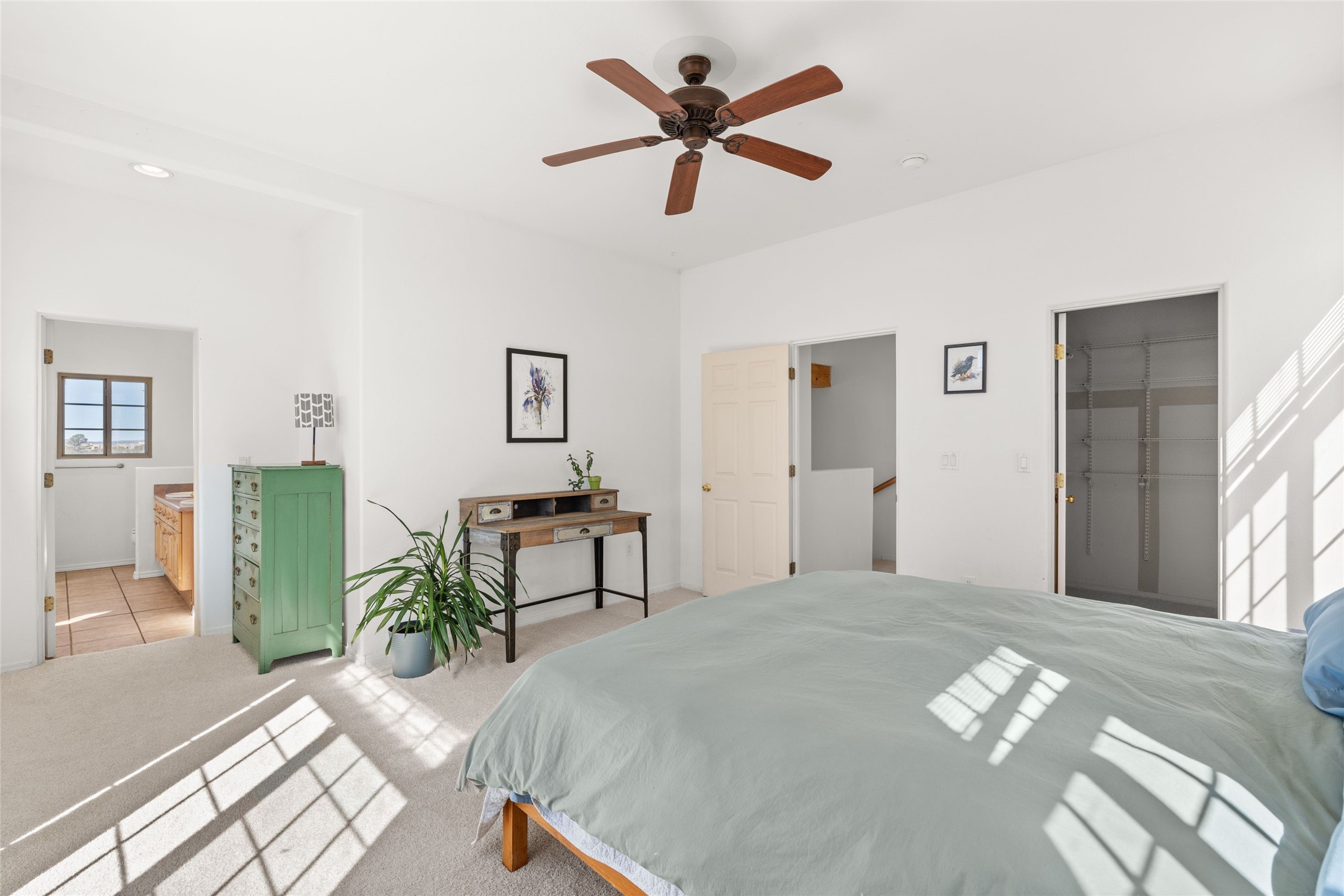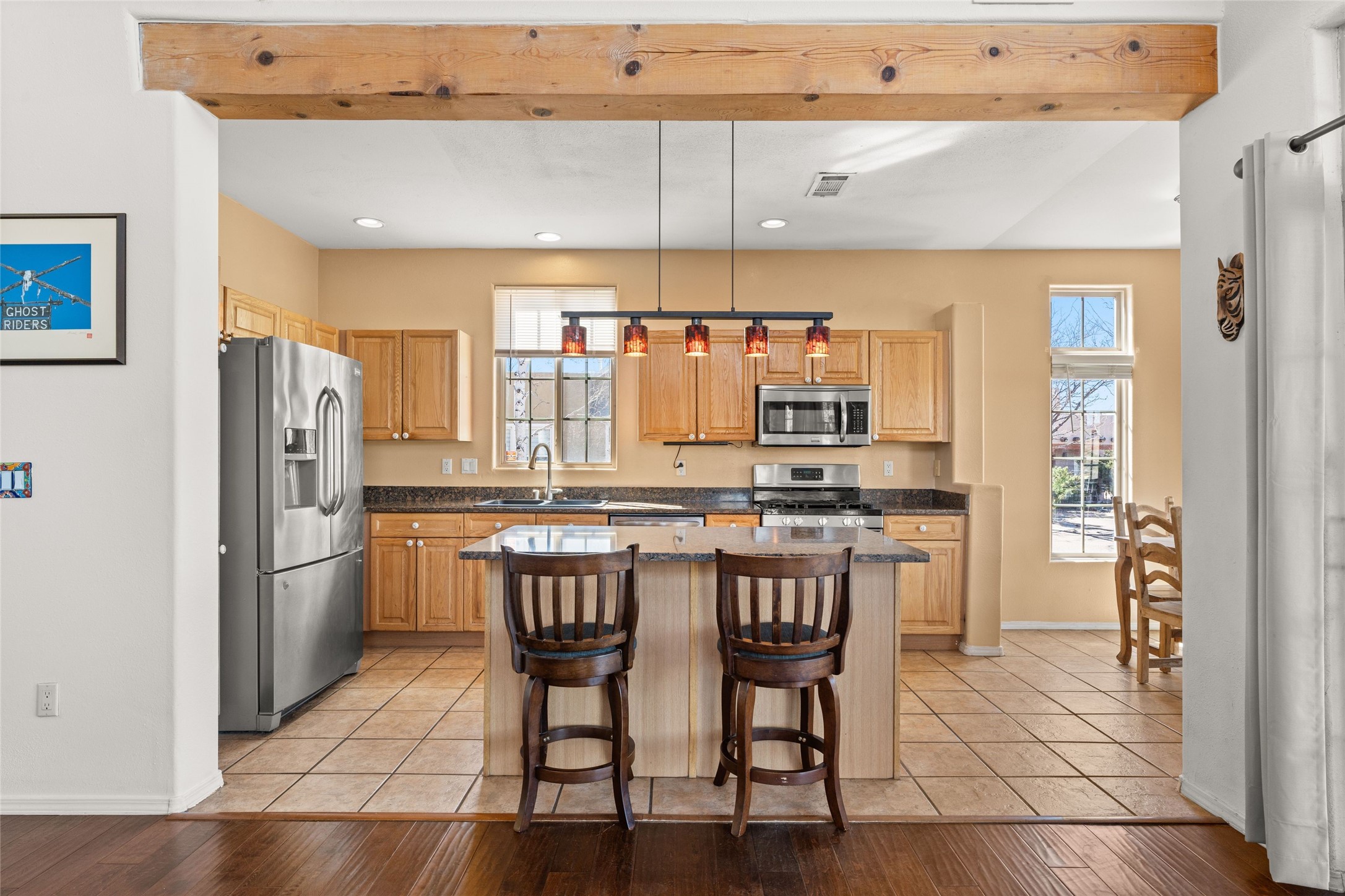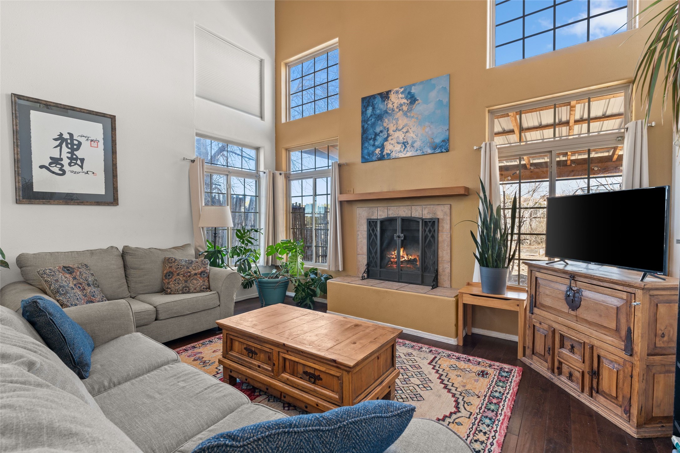 Pueblo style 3-bedroom, 2-bath home located in the desirable community of Nave Ade. Offering captivating 360-degree views of the stunning New Mexico landscape, this residence is designed for both comfort and style. Property is very private as it is at the end of a cul-de-sac and next to an arroyo which enhances the sense of nature and space. As you enter, you'll be greeted by high beamed ceilings and an abundance of natural light that highlights the open floor plan. The open floor plan creates a seamless flow between the living area, complete with a fireplace, and the kitchen featuring a central island--ideal for cooking and entertaining. Convenience is key with two spacious bedrooms, a full bath, and a laundry room all located on the main level. The primary suite, located upstairs, offers an oversized closet and a private deck, providing a tranquil retreat with breathtaking views. Step outside to enjoy the expansive outdoor patio that wraps around the south and west sides of the home, ideal for outdoor entertaining, morning coffee, or soaking in the warm New Mexico sun. The property also includes a detached 2-car garage with one side converted to a studio, adding to its functionality. Nave Ade is a thoughtfully planned development situated near the Santa Fe Community College, offering a vibrant lifestyle. Residents can enjoy access to a clubhouse featuring a workout room, swimming pool, steam room, and a network of walking trails that encourage outdoor exploration