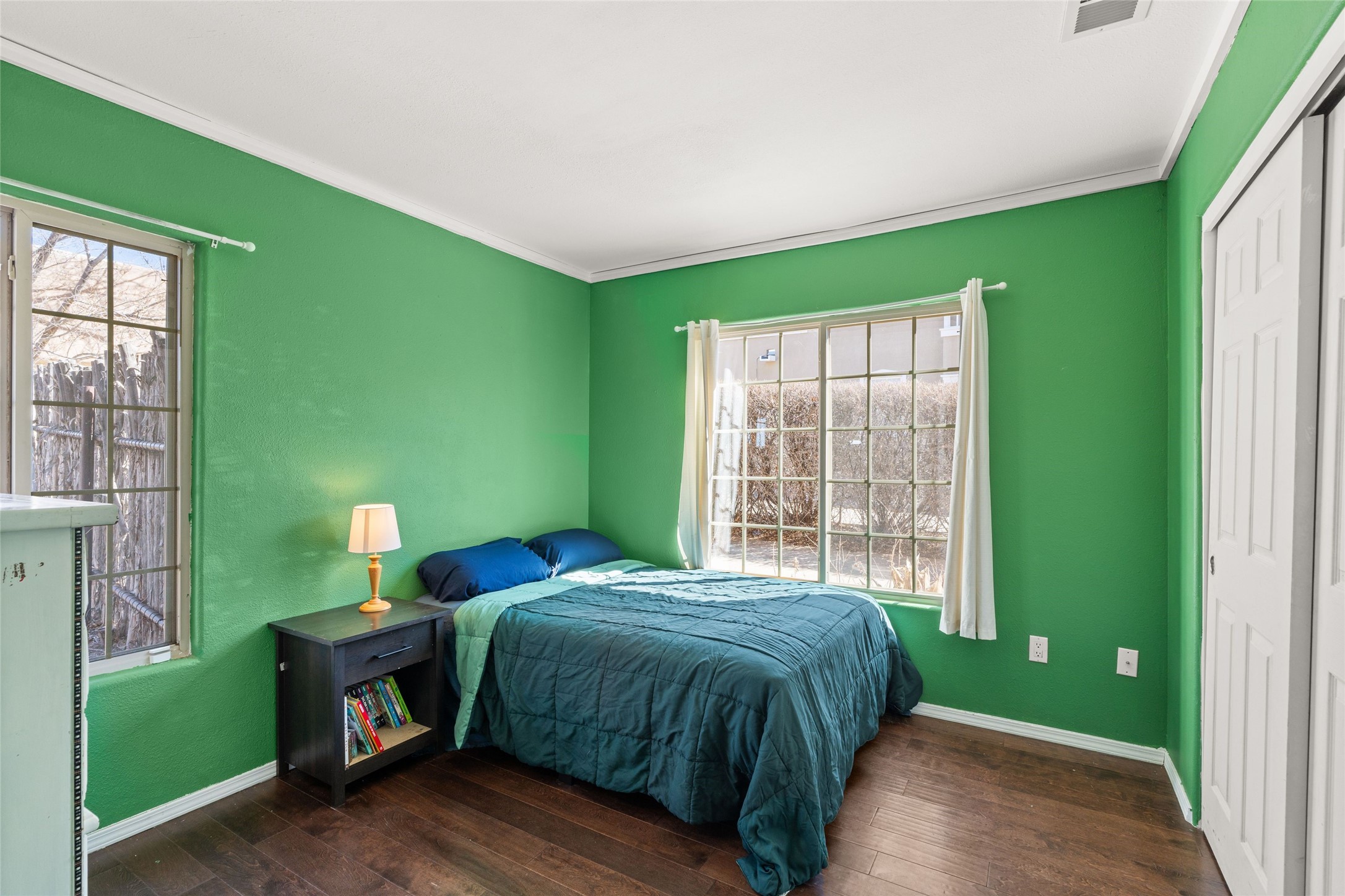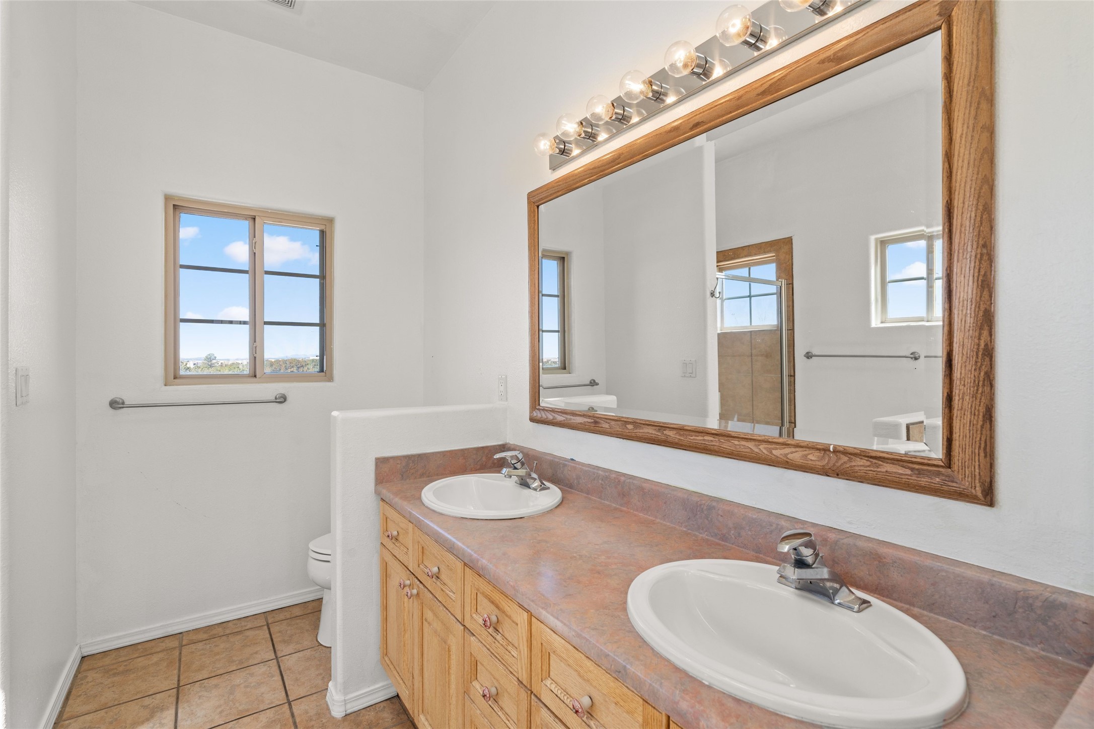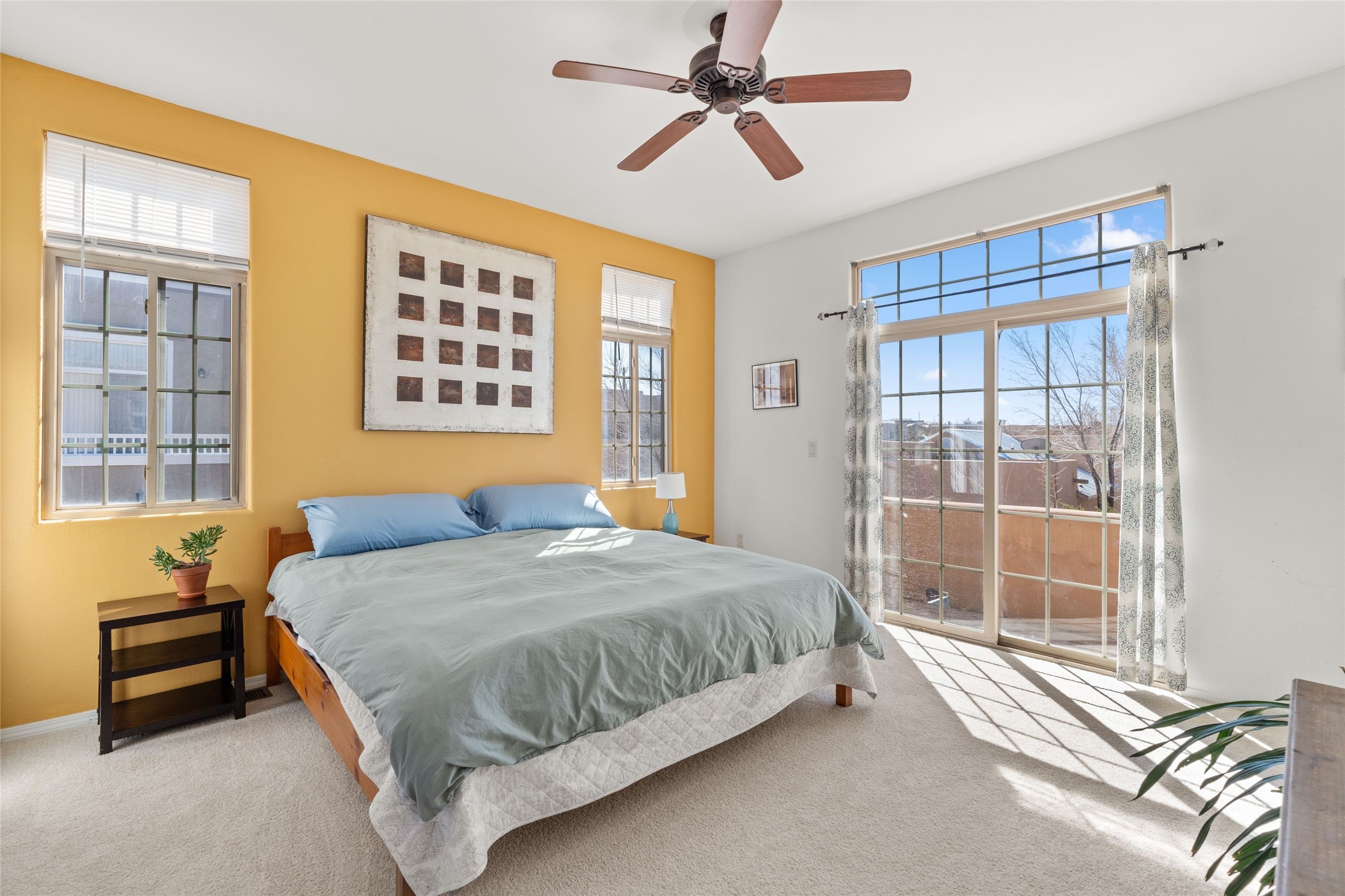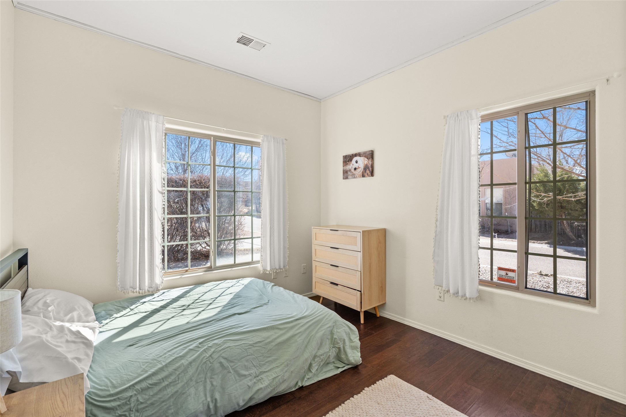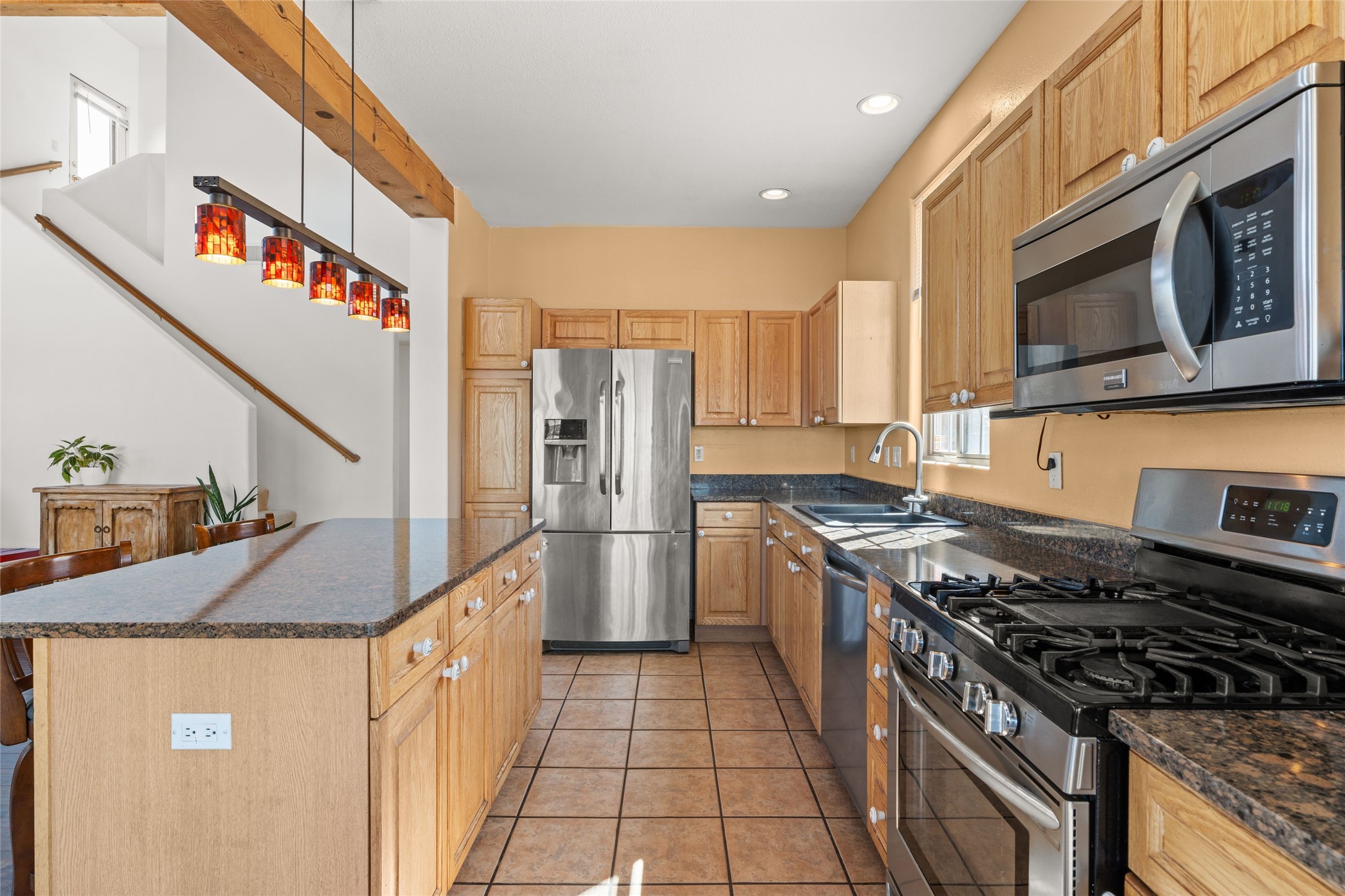 Pueblo style 3-bedroom, 2-bath home located in the desirable community of Nave Ade. Offering captivating 360-degree views of the stunning New Mexico landscape, this residence is designed for both comfort and style. Property is very private as it is at the end of a cul-de-sac and next to an arroyo which enhances the sense of nature and space. As you enter, you'll be greeted by high beamed ceilings and an abundance of natural light that highlights the open floor plan. The open floor plan creates a seamless flow between the living area, complete with a fireplace, and the kitchen featuring a central island--ideal for cooking and entertaining. Convenience is key with two spacious bedrooms, a full bath, and a laundry room all located on the main level. The primary suite, located upstairs, offers an oversized closet and a private deck, providing a tranquil retreat with breathtaking views. Step outside to enjoy the expansive outdoor patio that wraps around the south and west sides of the home, ideal for outdoor entertaining, morning coffee, or soaking in the warm New Mexico sun. The property also includes a detached 2-car garage with one side converted to a studio, adding to its functionality. Nave Ade is a thoughtfully planned development situated near the Santa Fe Community College, offering a vibrant lifestyle. Residents can enjoy access to a clubhouse featuring a workout room, swimming pool, steam room, and a network of walking trails that encourage outdoor exploration