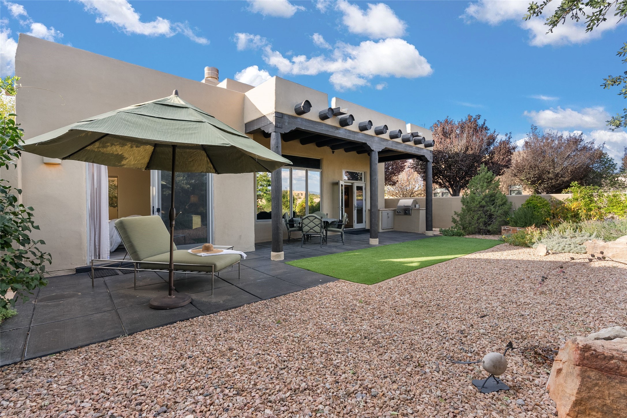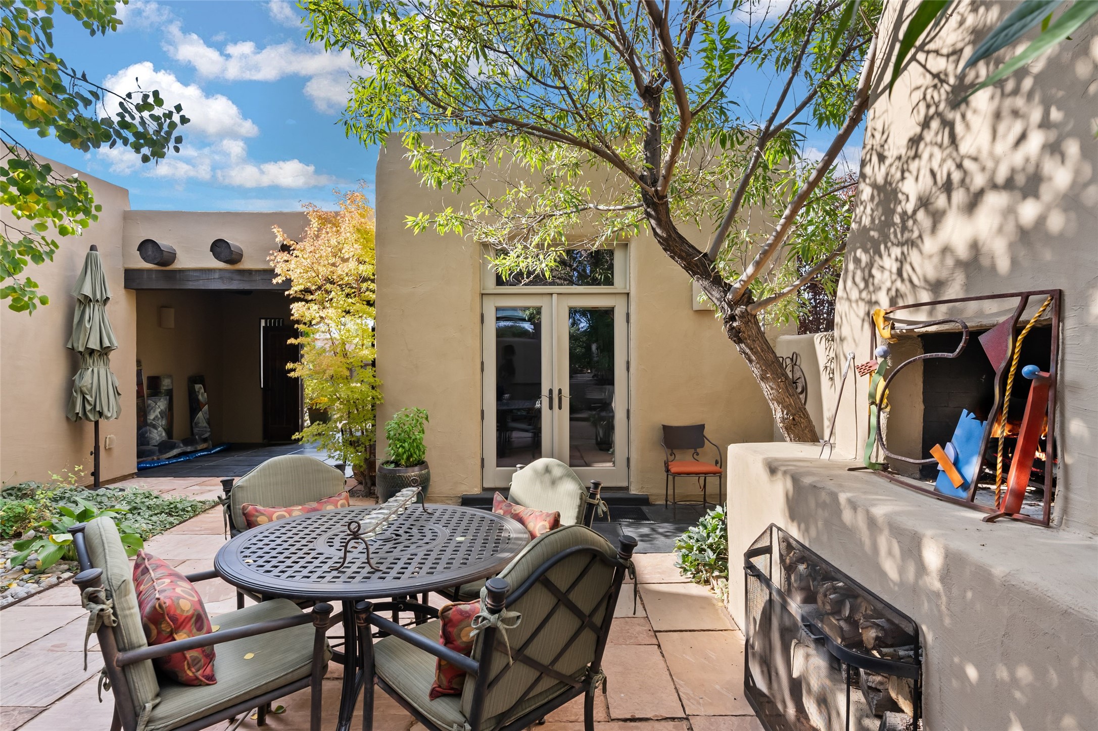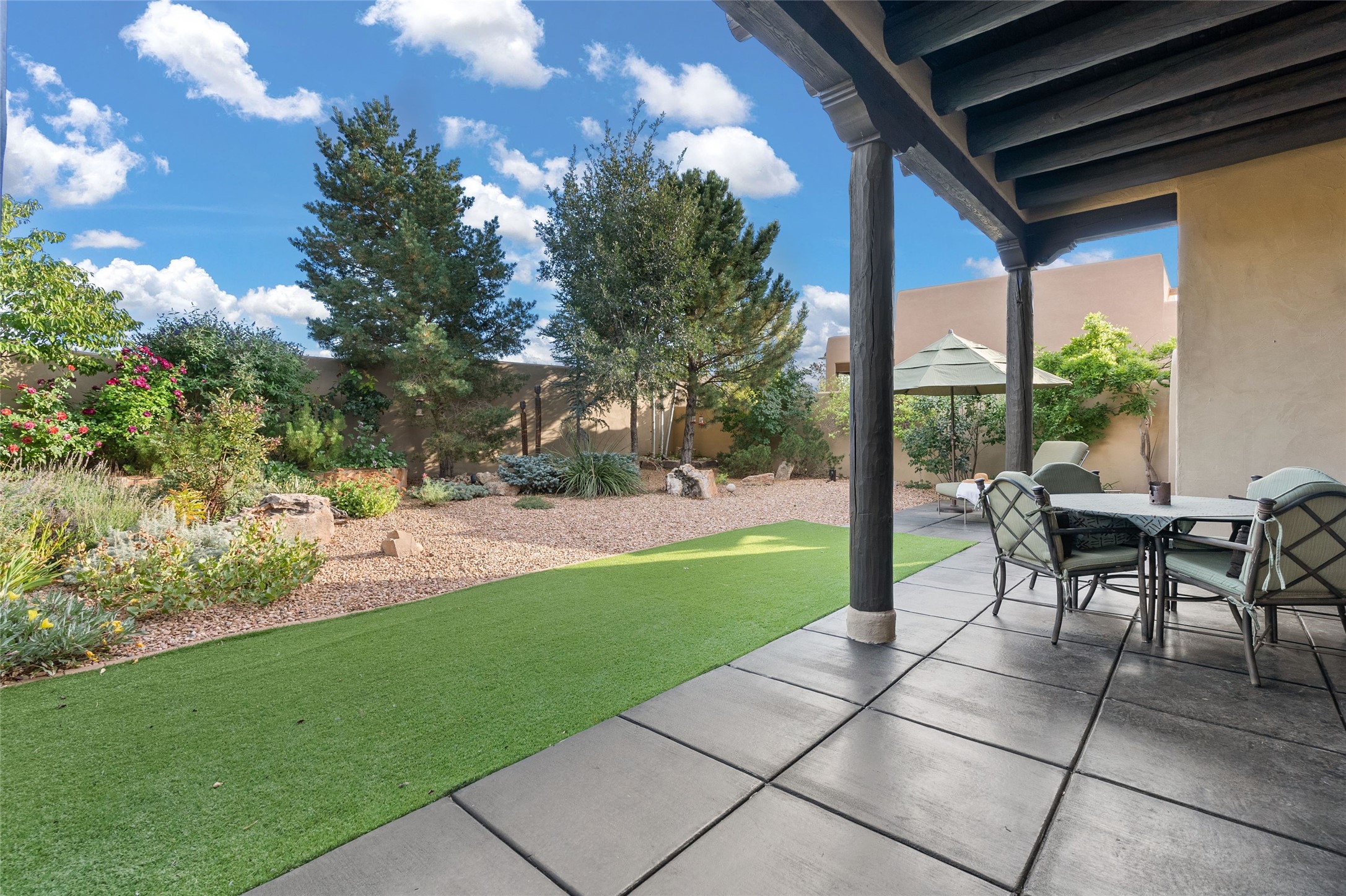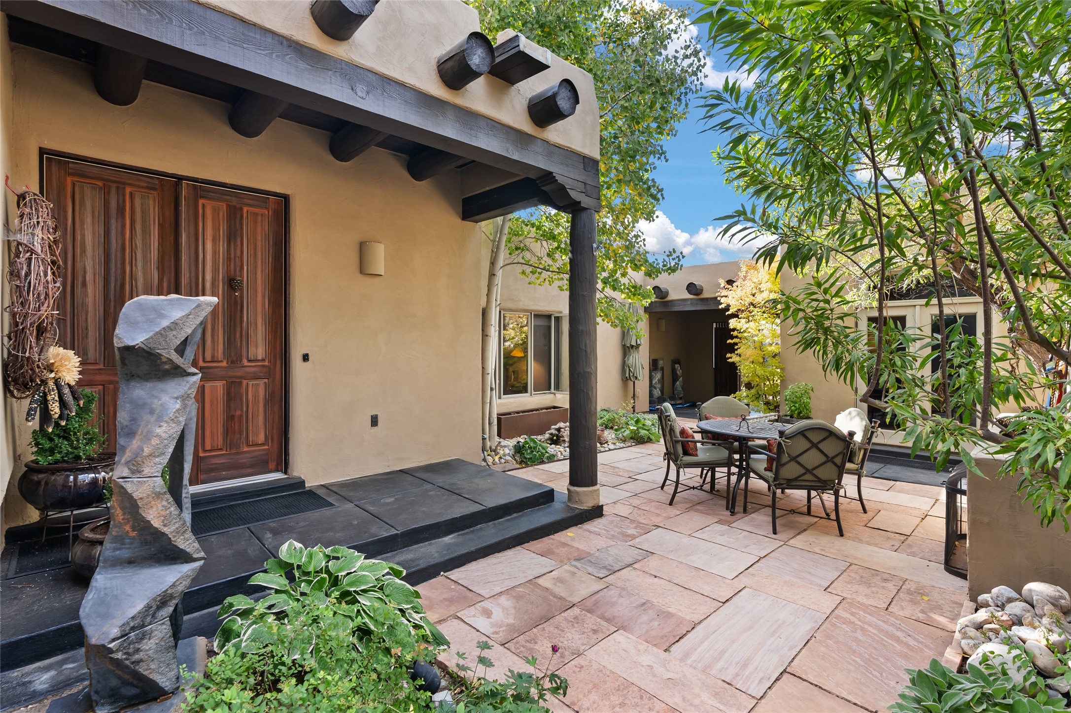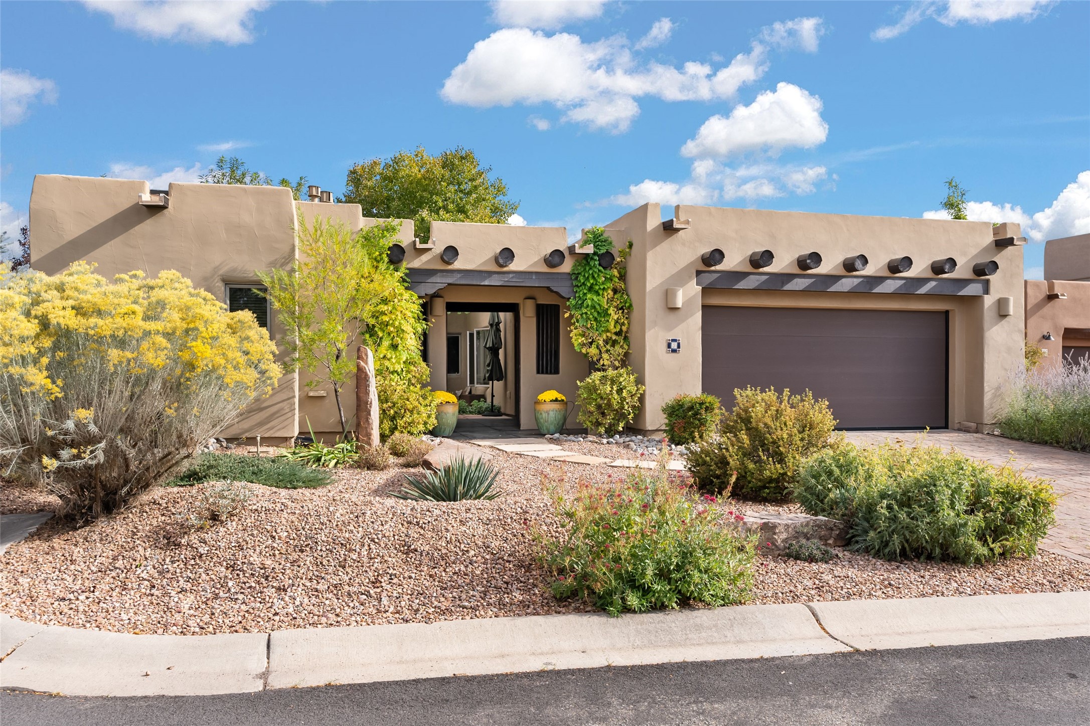 This inviting, Soft Contemporary 2-Bed + Den / 3-Bath home in Gated Las Campanas provides easy, "Lock & Leave" convenience with a gorgeous view of the Sangre de Cristo Mountains. Two rustic wood entry gates lead to the private, intimate entry courtyard, which is beautifully landscaped with a water feature & cozy wood-burning fireplace for entertaining guests. The Main house is an open floor plan with an easy flow from the Living & Dining areas to the Gourmet Kitchen with Taj Majal Quartzite countertop and stainless appliances - Sub Zero refrigerator, a 36-inch Frigidaire gas range/oven (installed in January 2025 & never used), Dacor hood, Bosch dishwasher, Sharp microwave drawer and wine cooler. The Elegant Master Bedroom & Bath offers two separate vanities, oval soaking tub, separate shower and a fabulous California Closet. The Media Room could easily be converted to a Bedroom and has an adjacent Bath. The Private, Detached 1-Bed / 1-Bath Guest Casita offers great privacy for visiting friends & family, with enough room for a King-size bed. The back yard is fully landscaped and walled-in for pets, with a water feature, built-in Viking grill and Sangre de Cristo Mountain view. This home has it all - Contemporary style, Detached Casita and a View of the Sangre de Cristo Mountains.