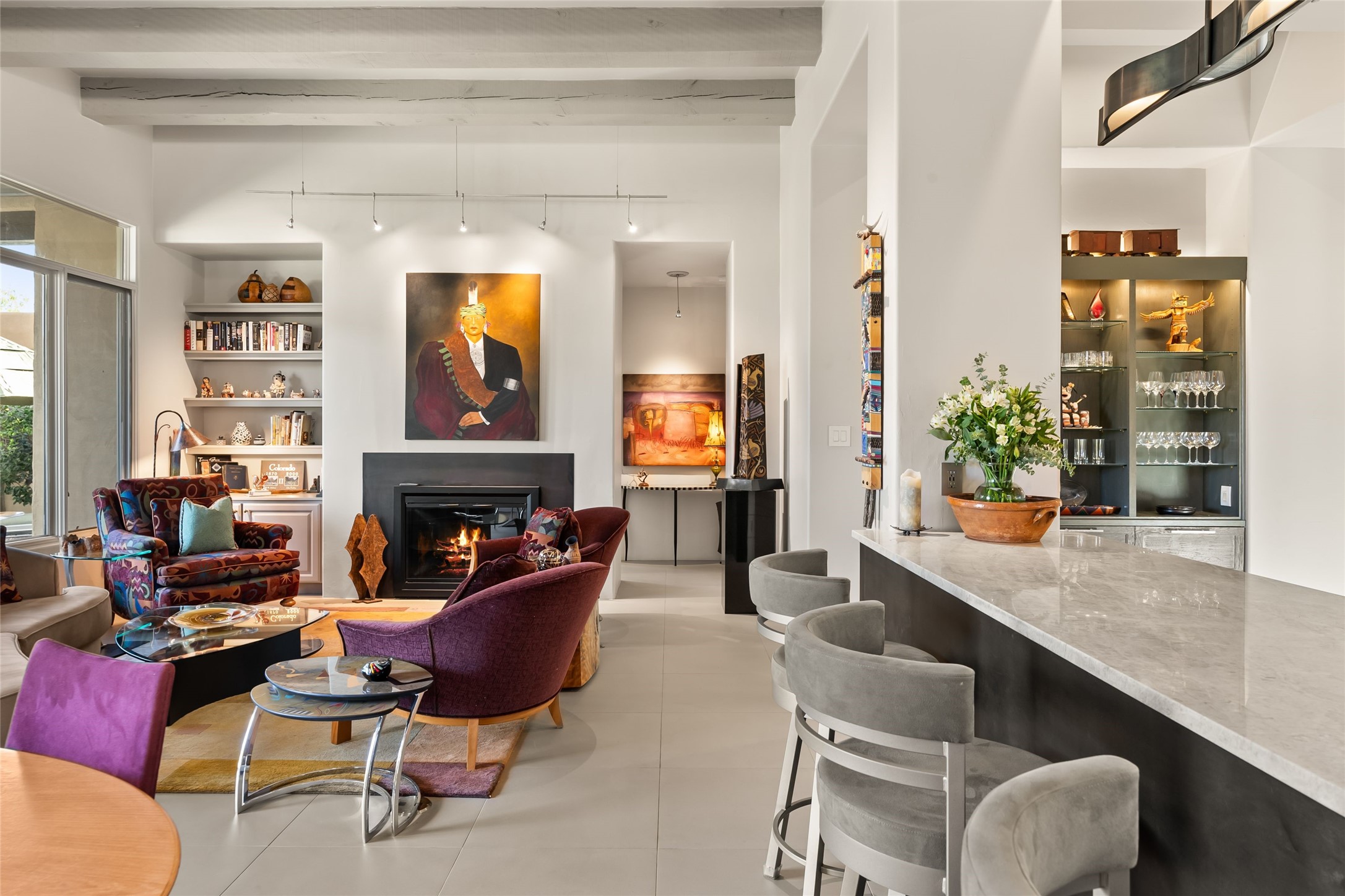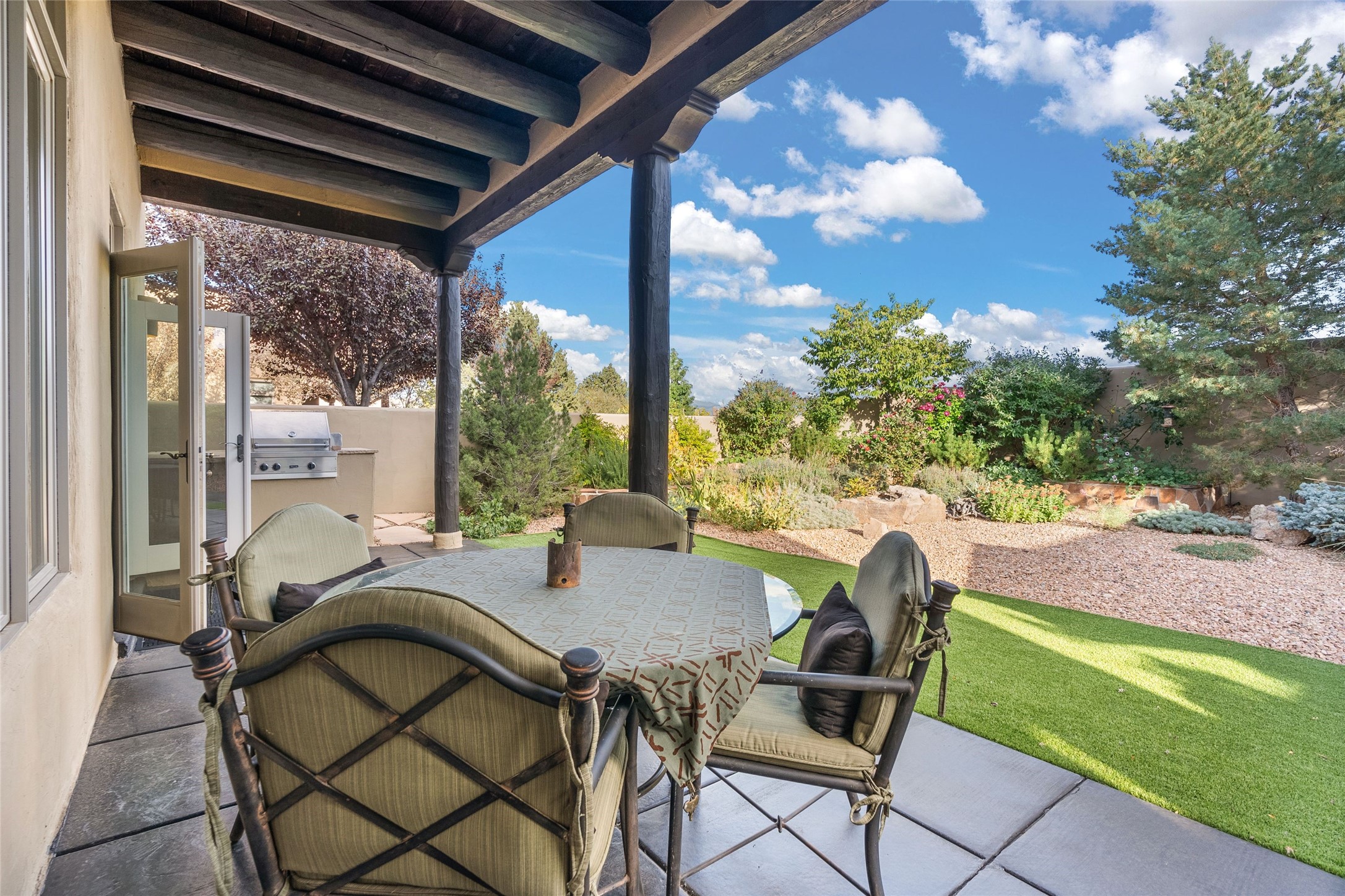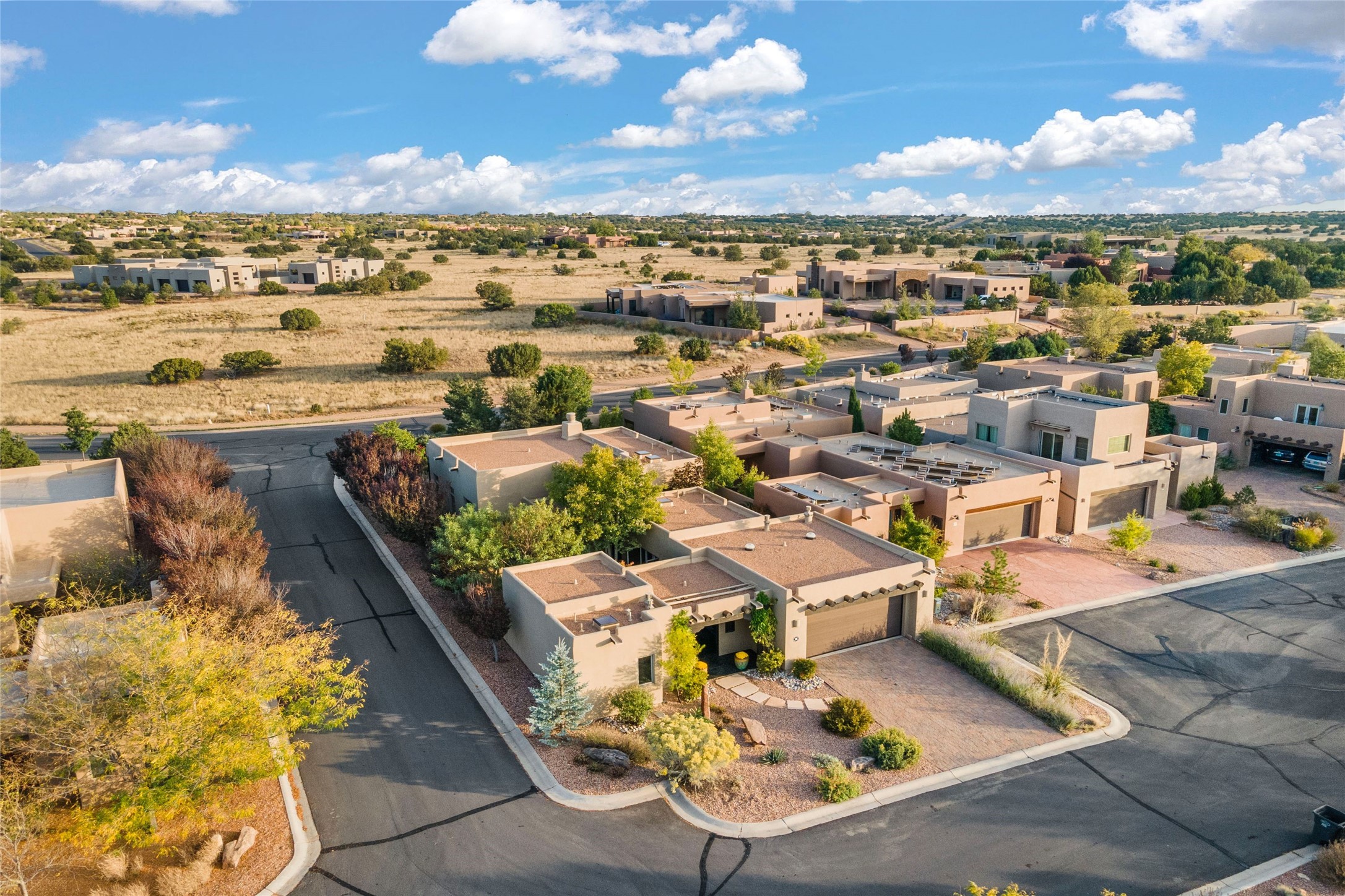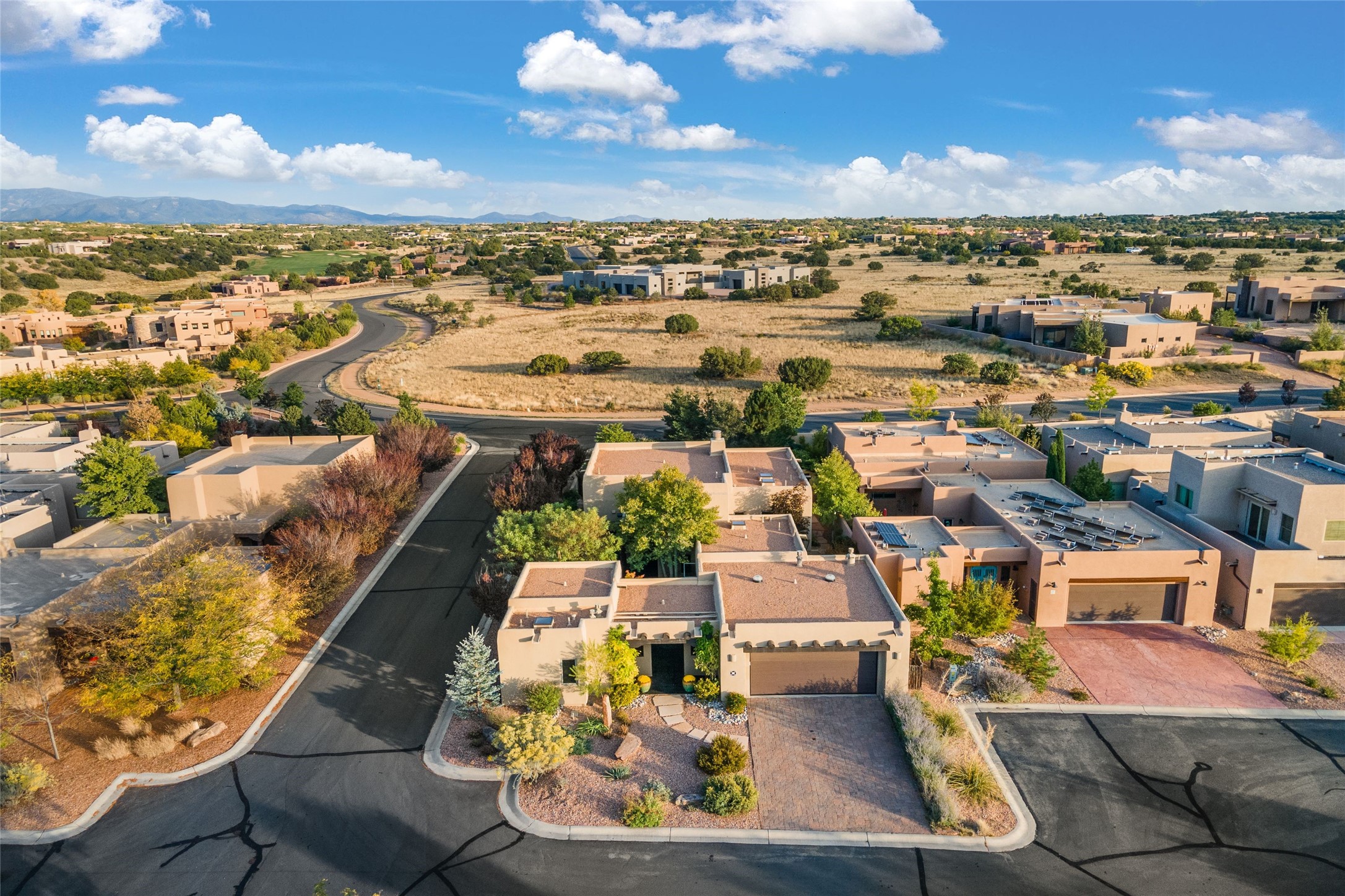 This inviting, Soft Contemporary 2-Bed + Den / 3-Bath home in Gated Las Campanas provides easy, "Lock & Leave" convenience with a gorgeous view of the Sangre de Cristo Mountains. Two rustic wood entry gates lead to the private, intimate entry courtyard, which is beautifully landscaped with a water feature & cozy wood-burning fireplace for entertaining guests. The Main house is an open floor plan with an easy flow from the Living & Dining areas to the Gourmet Kitchen with Taj Majal Quartzite countertop and stainless appliances - Sub Zero refrigerator, a 36-inch Frigidaire gas range/oven (installed in January 2025 & never used), Dacor hood, Bosch dishwasher, Sharp microwave drawer and wine cooler. The Elegant Master Bedroom & Bath offers two separate vanities, oval soaking tub, separate shower and a fabulous California Closet. The Media Room could easily be converted to a Bedroom and has an adjacent Bath. The Private, Detached 1-Bed / 1-Bath Guest Casita offers great privacy for visiting friends & family, with enough room for a King-size bed. The back yard is fully landscaped and walled-in for pets, with a water feature, built-in Viking grill and Sangre de Cristo Mountain view. This home has it all - Contemporary style, Detached Casita and a View of the Sangre de Cristo Mountains.