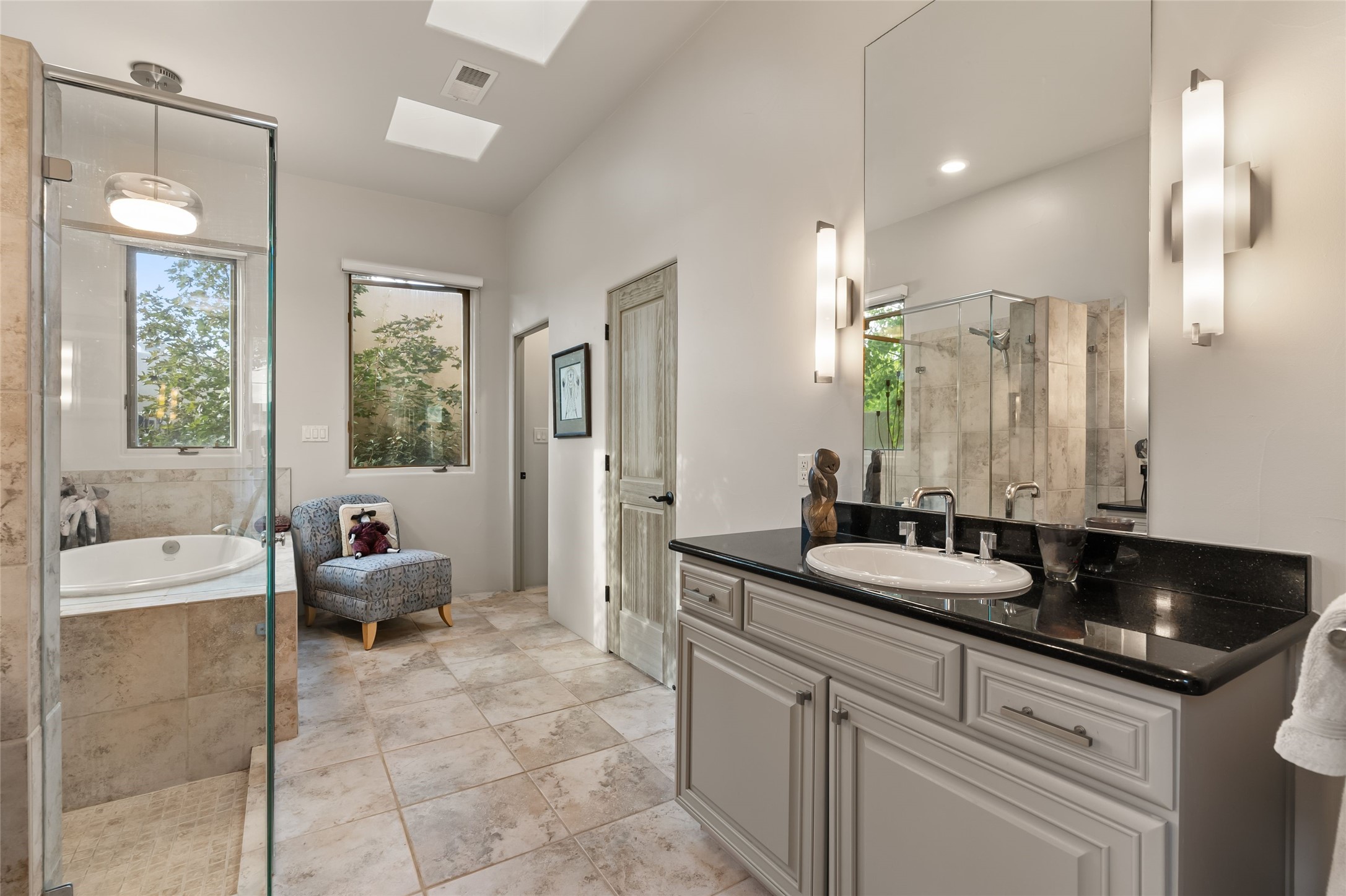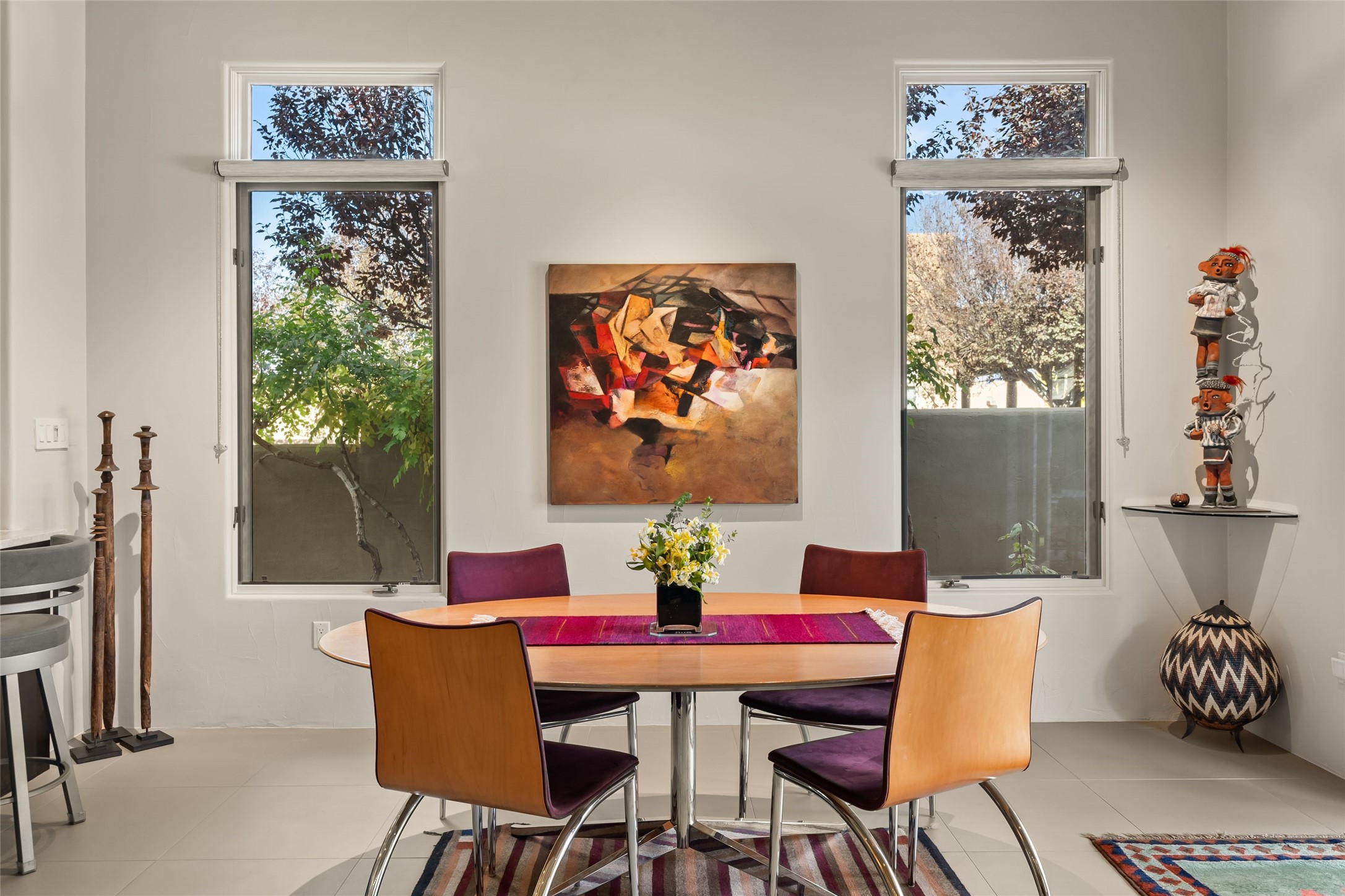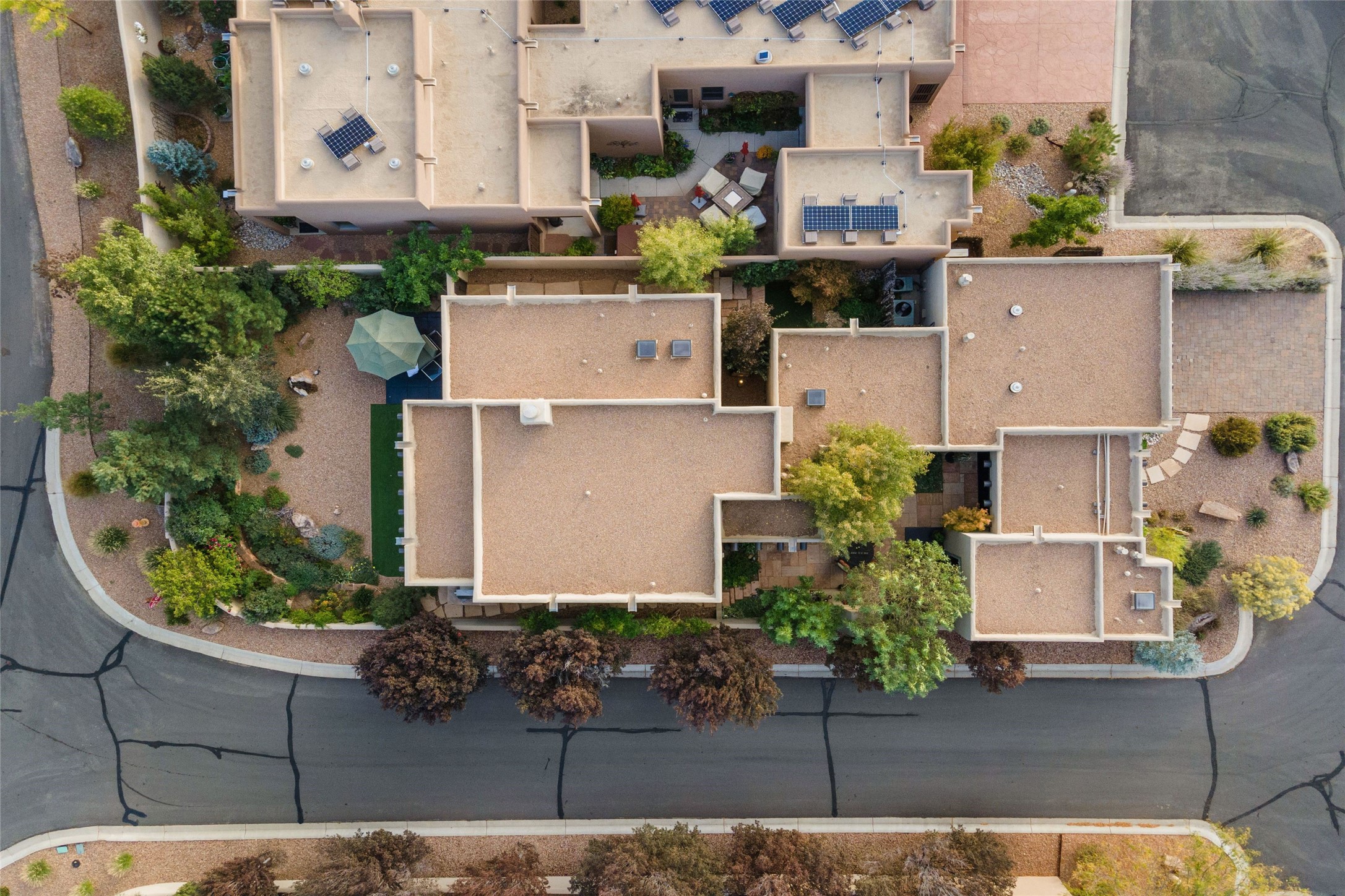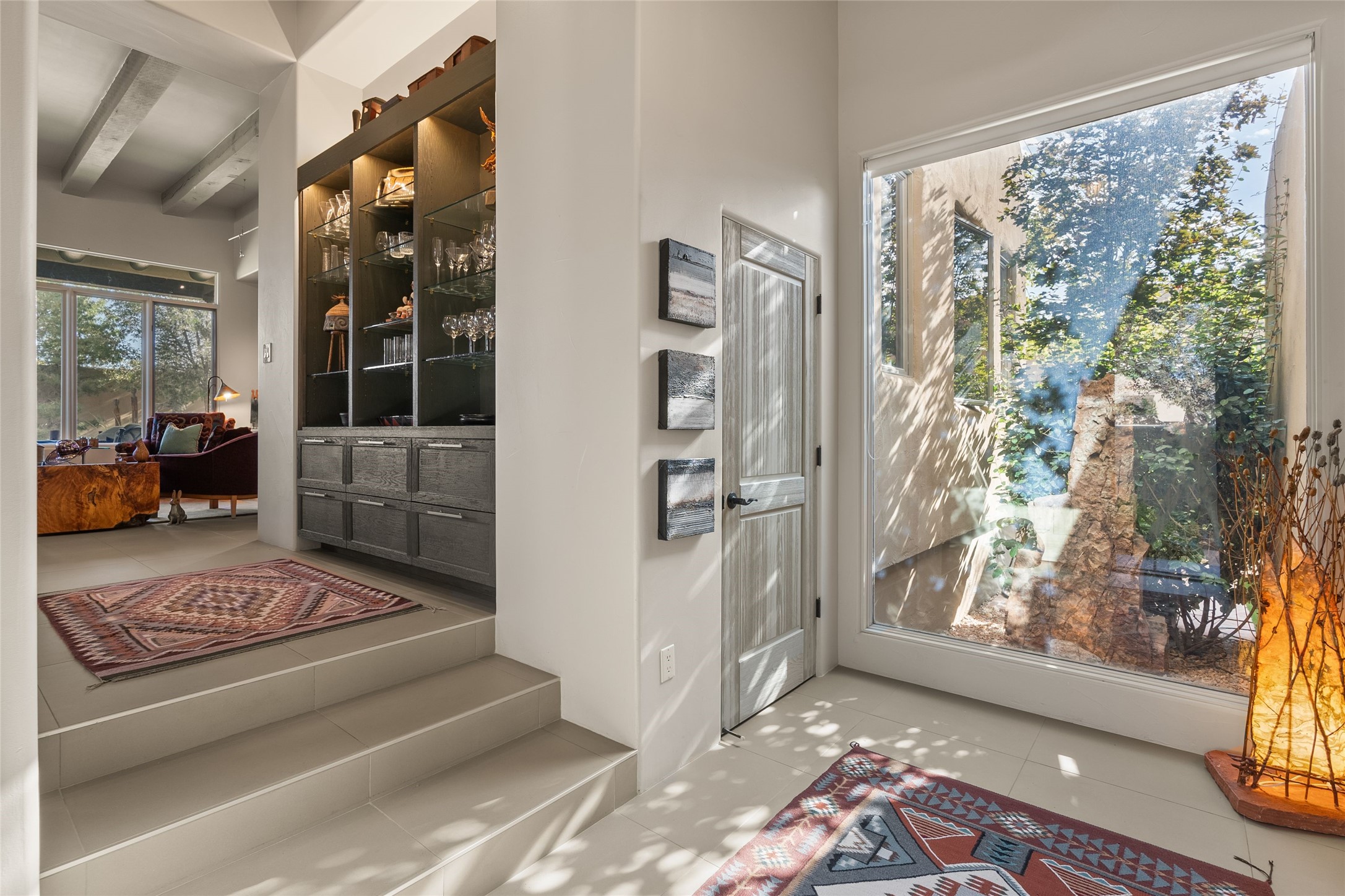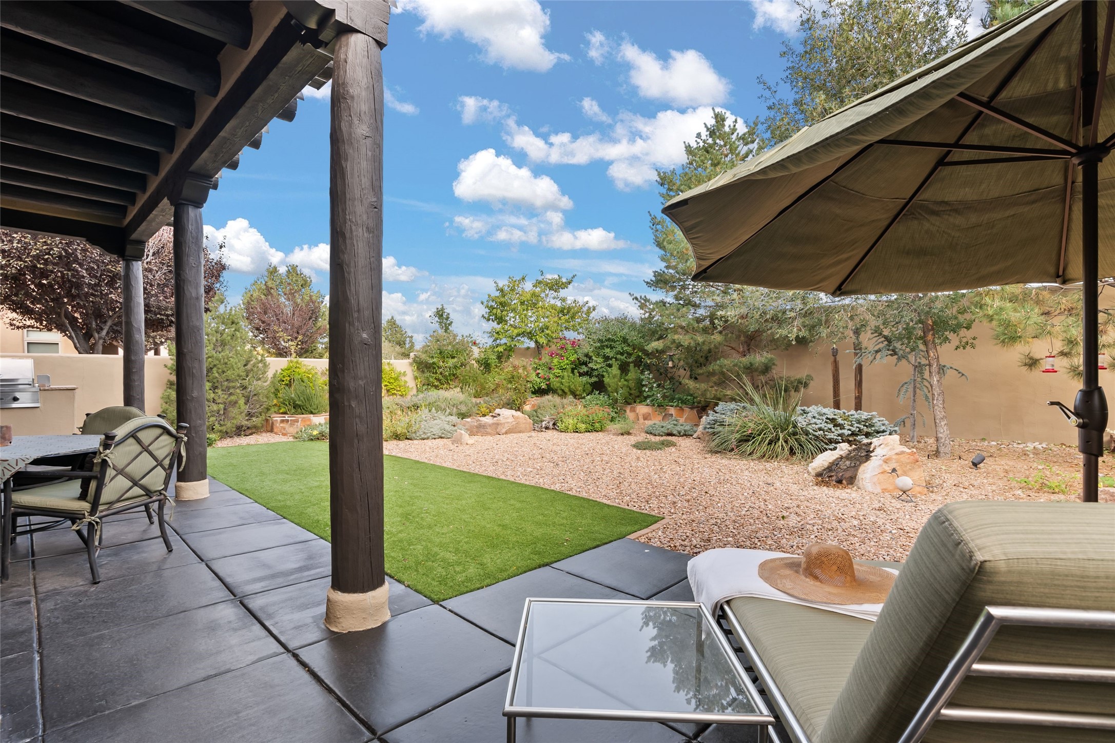 This inviting, Soft Contemporary 2-Bed + Den / 3-Bath home in Gated Las Campanas provides easy, "Lock & Leave" convenience with a gorgeous view of the Sangre de Cristo Mountains. Two rustic wood entry gates lead to the private, intimate entry courtyard, which is beautifully landscaped with a water feature & cozy wood-burning fireplace for entertaining guests. The Main house is an open floor plan with an easy flow from the Living & Dining areas to the Gourmet Kitchen with Taj Majal Quartzite countertop and stainless appliances - Sub Zero refrigerator, a 36-inch Frigidaire gas range/oven (installed in January 2025 & never used), Dacor hood, Bosch dishwasher, Sharp microwave drawer and wine cooler. The Elegant Master Bedroom & Bath offers two separate vanities, oval soaking tub, separate shower and a fabulous California Closet. The Media Room could easily be converted to a Bedroom and has an adjacent Bath. The Private, Detached 1-Bed / 1-Bath Guest Casita offers great privacy for visiting friends & family, with enough room for a King-size bed. The back yard is fully landscaped and walled-in for pets, with a water feature, built-in Viking grill and Sangre de Cristo Mountain view. This home has it all - Contemporary style, Detached Casita and a View of the Sangre de Cristo Mountains.