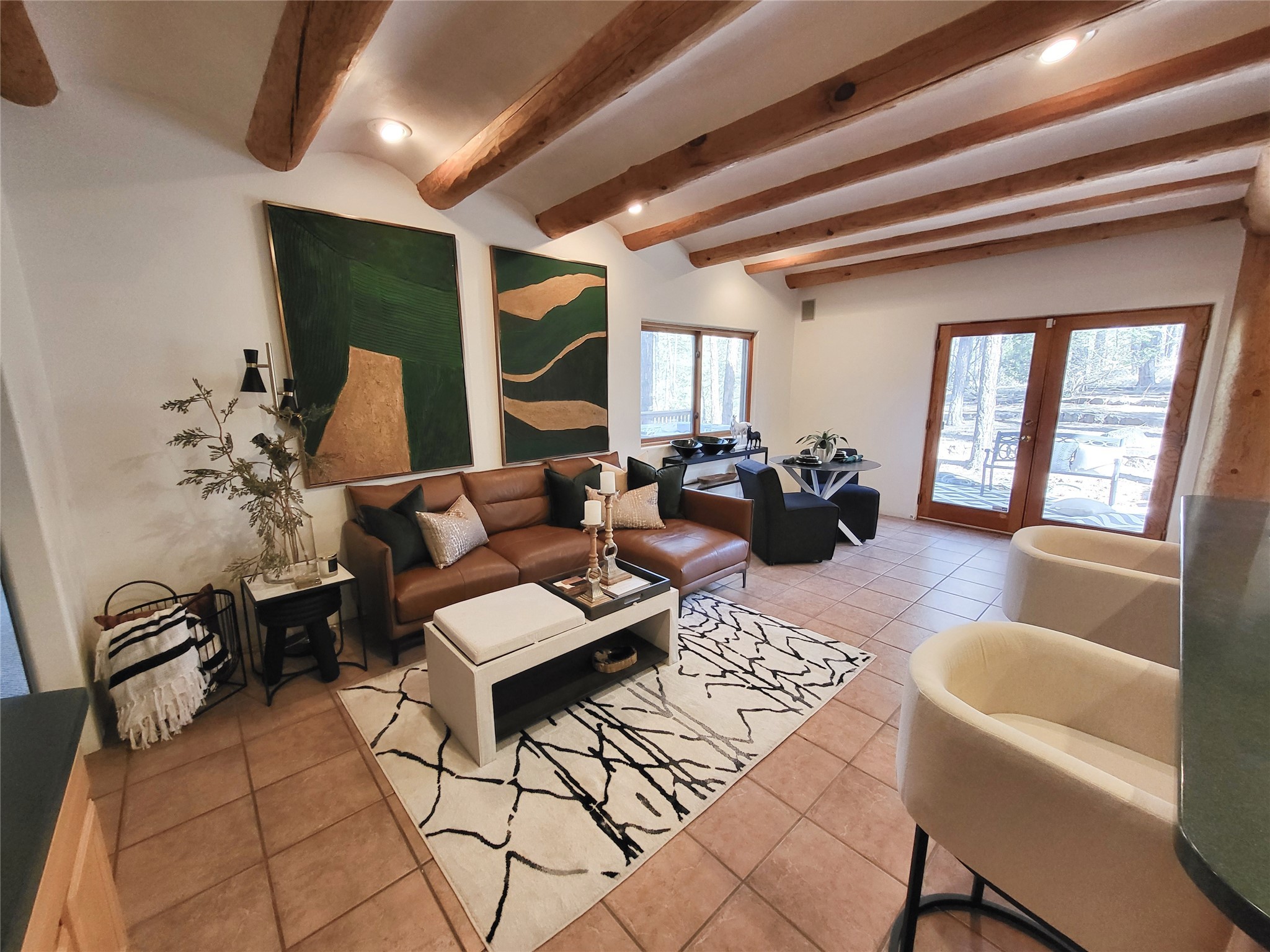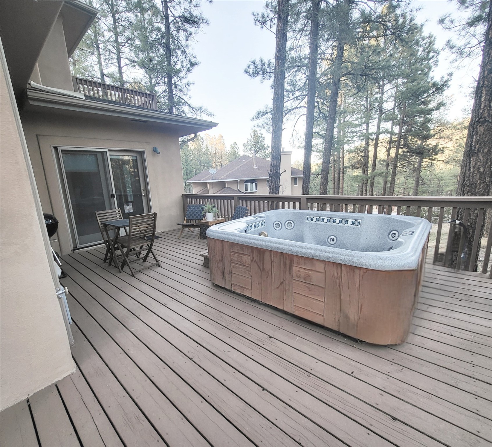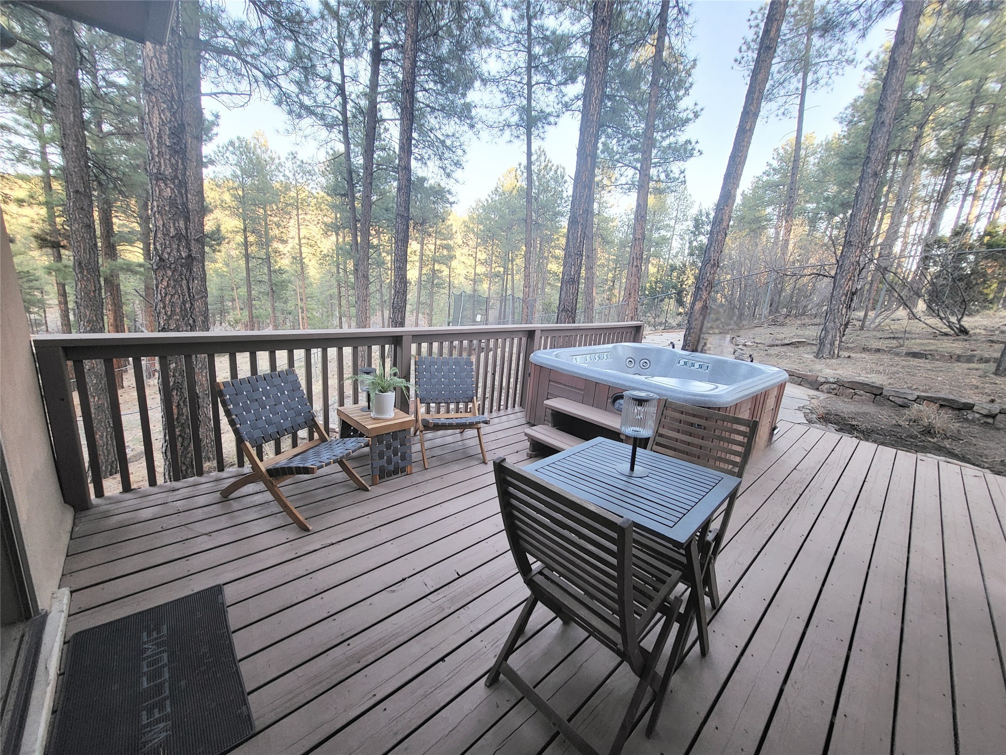 Welcome to your dream home in the sought-after Ponderosa Estates of Los Alamos! This spacious 2,500+ sq ft single-family retreat offers luxury, comfort, and unmatched amenities --all tucked away in a quiet cul-de-sac, steps from the golf course. Step into an entertainer's paradise featuring a stunning open-concept chef's kitchen with a center island large enough for 8 bar stools, built-in dry bar, and an indoor-outdoor built-in sound system perfect for hosting. Enjoy the beautifully stained decks, hot tub, and large yard for seamless indoor-outdoor living.With 4 generously sized bedrooms, including an oversized upstairs primary suite with private deck access, his-and-hers walk-in closets, double sinks, and a jacuzzi tub, this home offers resort-style comfort. The downstairs guest suite can easily serve as a second master, complete with a full bath, walk-in closet, and private patio deck.Additional features include a rare 3-car garage, heated driveway, and plenty of space to relax, entertain, and enjoy the serene beauty of Los Alamos living.Don't miss this rare opportunity to own one of Ponderosa's finest!