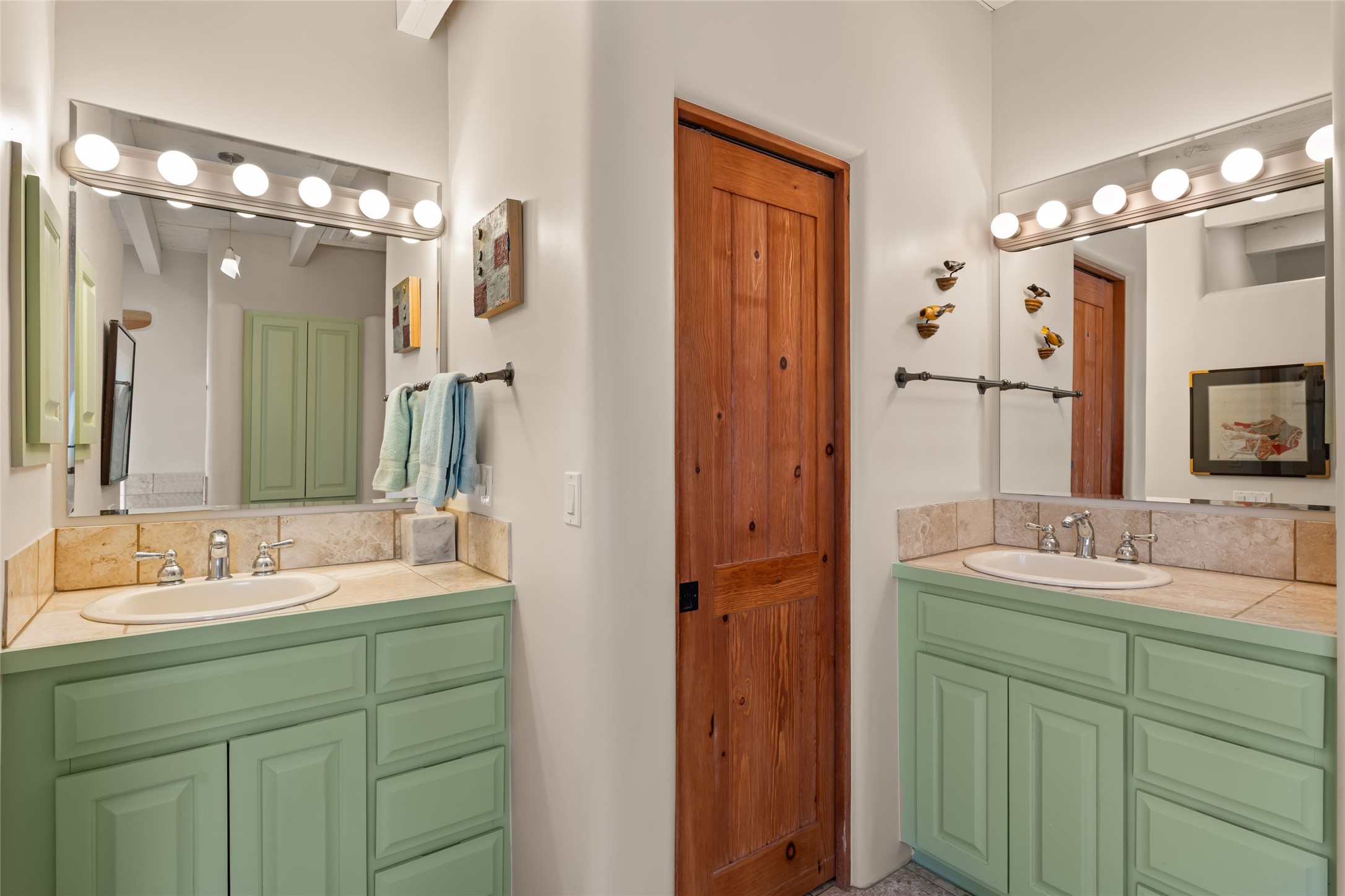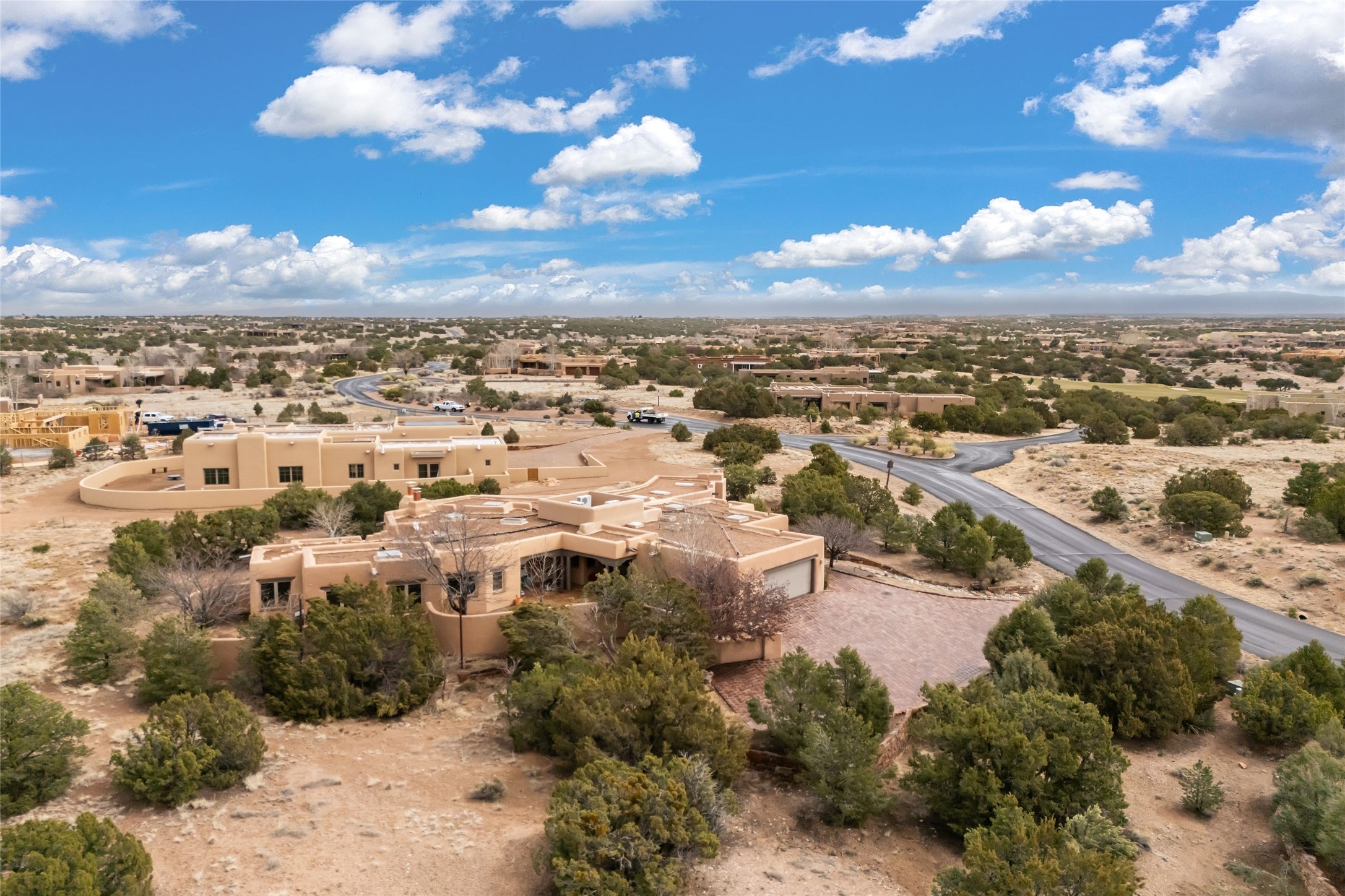 Welcome home to timeless elegance and a space that is as beautiful and functional on the inside as it is on the outside. Ideal living is captured with an open, recently updated kitchen which includes Wolf and Sub Zero appliances along with a charming beverage bar that overlooks the serene front courtyard, all enhanced with stylish Taj Majal quartzsite counters. Classic Saltillo tile, tall ceilings and rich wood accents tastefully adorn this peaceful space. True Santa Fe living is captured in the expansive rear portal with a full outdoor kitchen, Infratech heaters, fireplace and expert lighting. Between the large versatile space inside and the fabulous kitchen outside; this is the place to entertain! Entertainers come and see! Retire inside to an accommodating primary suite complete with an office, large bathroom and closet and charming outdoor space. Optimal separation of bedrooms, updated bathrooms, mini splits throughout, heated stone driveway, tasteful landscape with ample flagstone and meticulous maintenance combine to create a space which satisfies all the creature comforts. This gem is located a half mile from The Club in Las Campanas' popular Park Estates. Come and see!