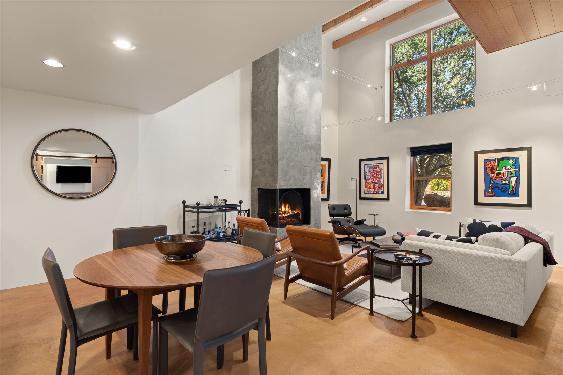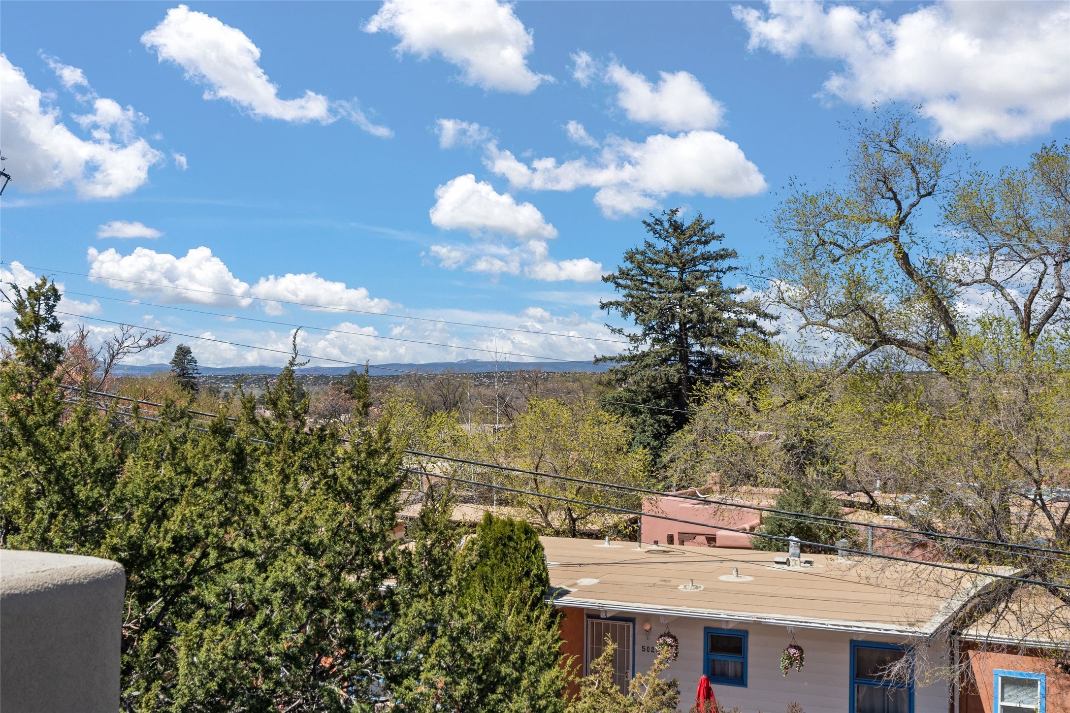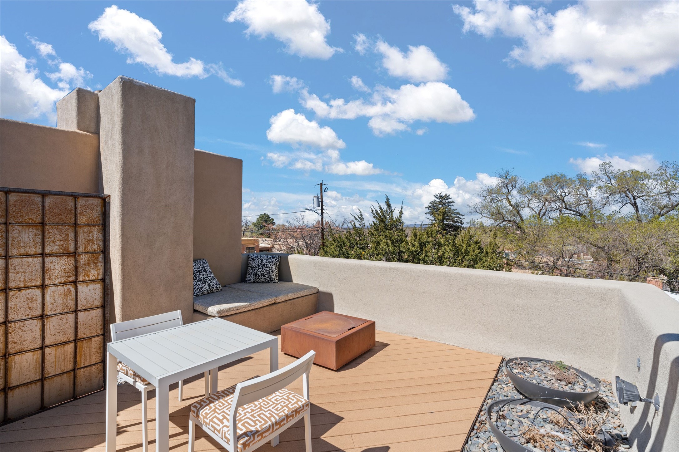 Have you been dreaming of a roof top garden deck where you can live alfresco with full kitchen (including dishwasher!), cozy gas fire pit and a sleeping spot under the stars? With views of sunrise over the Sangres, and sunsets behind the Jemez, and just three blocks from the Plaza, this is the icing on the cake of this cool soft contemporary 2 bedroom, 2,023 square foot condo. With two bedroom suites (one with a steam shower), bamboo floors and Ikea closet systems, this multi-level condo has nice bedroom separation and a very private walled patio off one, shaded by an ancient apricot tree. The living room enjoys a soaring 20 foot ceiling with beams, a fireplace, polished concrete floors, and has a wonderful open feel with the kitchen and dining areas. The kitchen has Cambria quartz counters, stainless appliances and great storage. All this, while being a handy run up to the ski basin and hiking trails, or a short walk to Ft. Marcy or downtown.
