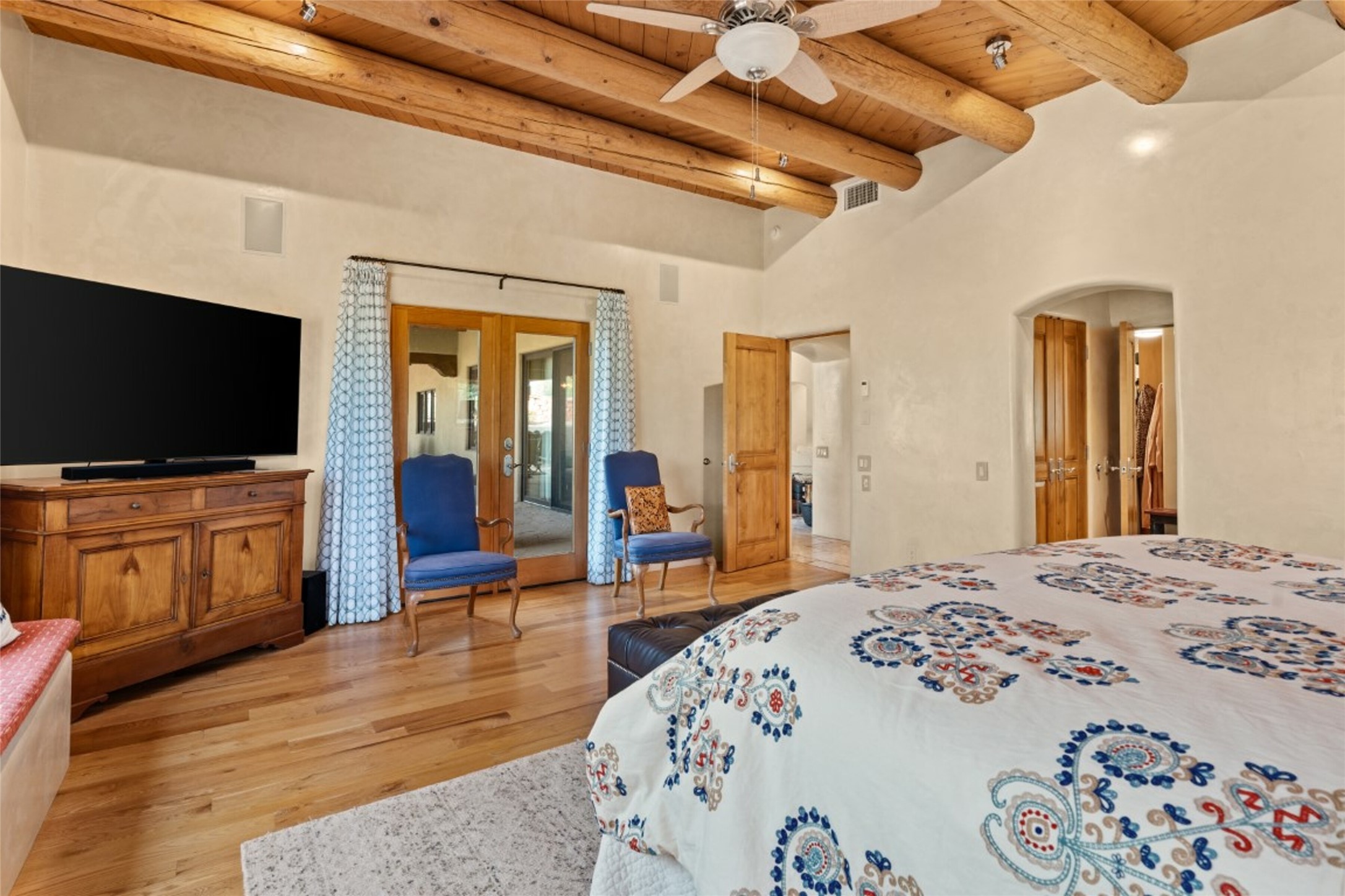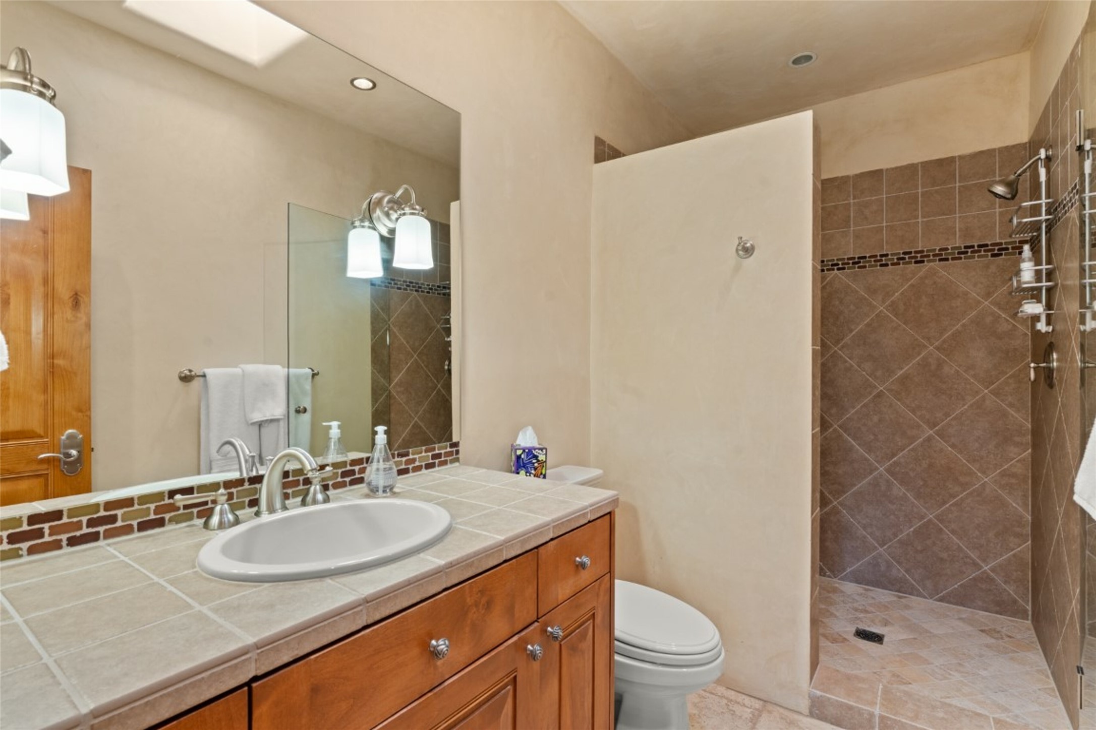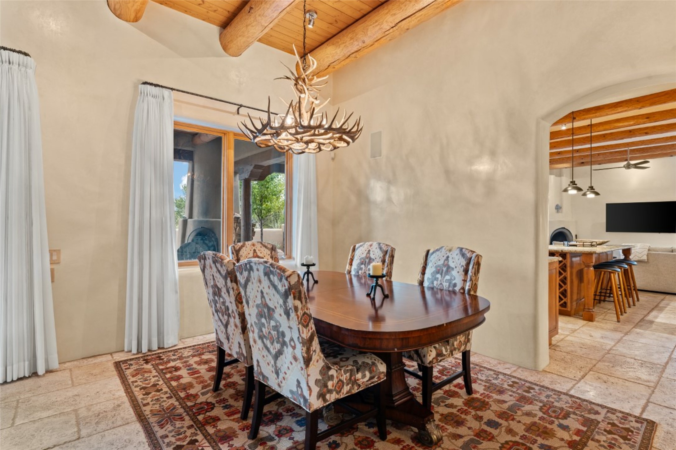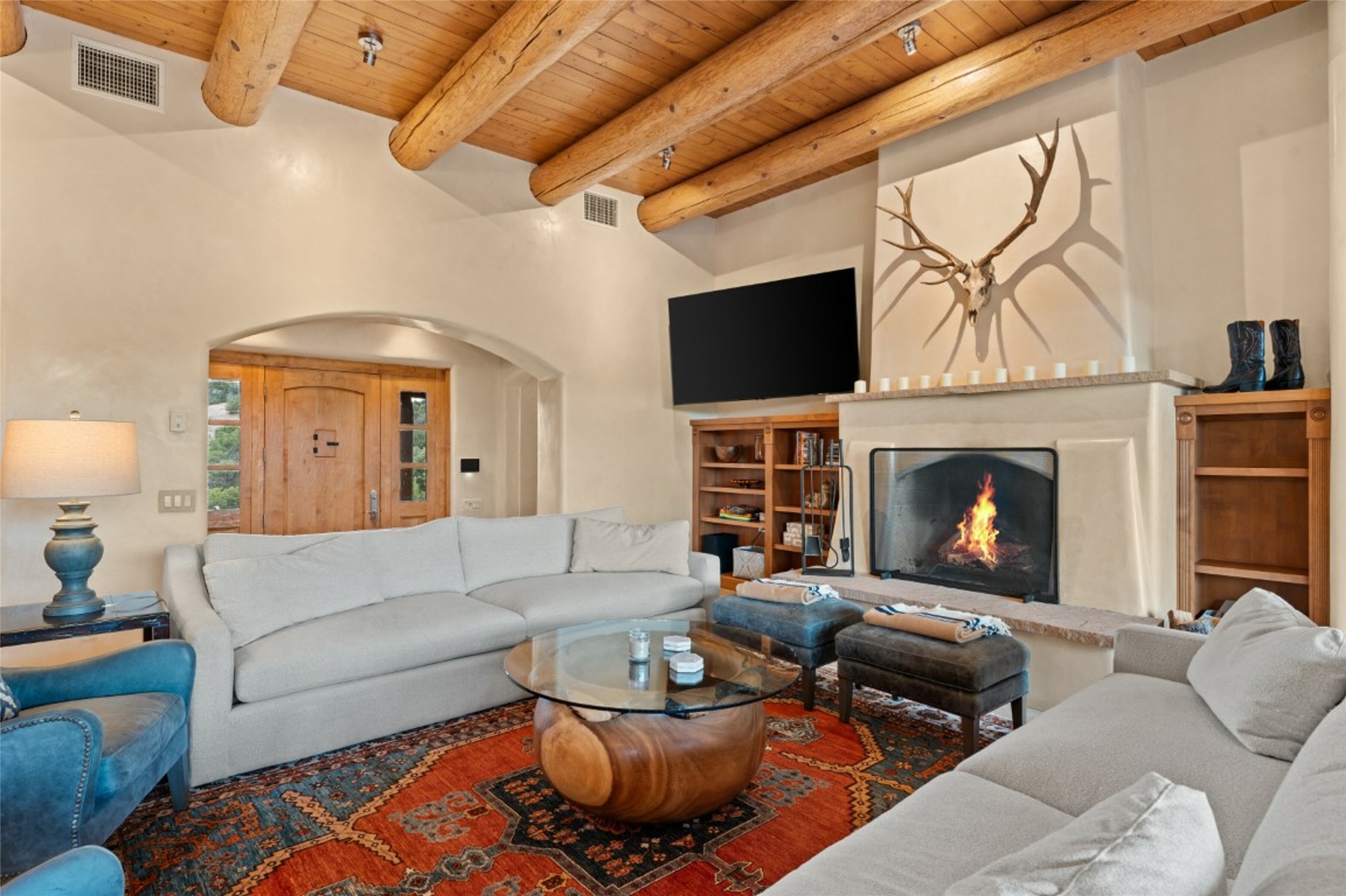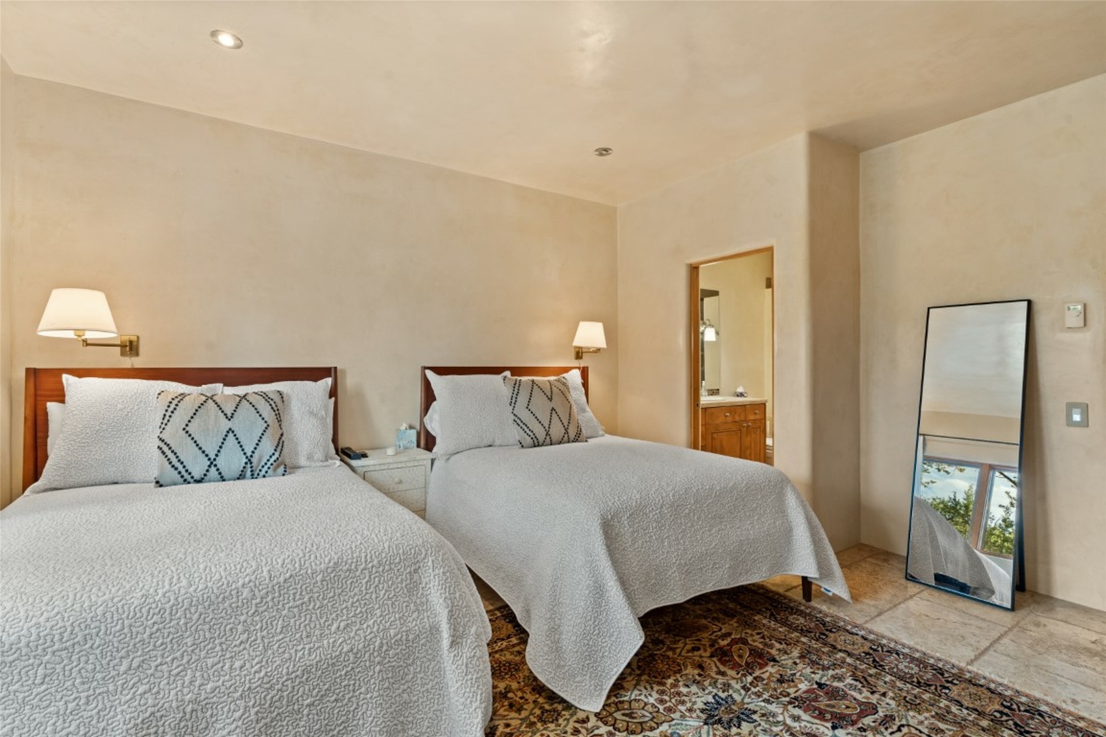 Poised on a curve in the prestigious Monte Sereno subdivision, this 3 BR/3.5BA soft contemporary home offers one-level living for owners, and a separate level for guests (or home office), thereby offering a true separation of space. Built in 2008, this home has been lovingly cared for, and offers a scale of rooms seldom seen in this price range. The comfortable kitchen/family room layout is great for day-to-day living, while the spacious living room/dining room makes a big statement as one enters the home for entertaining or enjoying the views of the Sangre de Cristo Mountains to the east. The owners suite is a true sanctuary, with access to the front portal, warm oak floors, an over-sized walk in closet with built in cabinetry, and a wonderful bath with separate new soaking tub and walk-in shower, accompanied by two vanity areas and a make-up counter. The 2nd and 3rd bedrooms are a couple of steps down, and both had en-suite baths and are very private. These bedrooms (as well as the rest of the home) feature chiseled travertine floors. The entertaining portal is one of the largest in Monte Sereno, and features an outdoor BBQ, a large seating area, a corner kiva wood burning fireplace, and a privacy wall encircling the rear landscaping. With easy access to Santa Fe in this front of Monte Sereno setting, miles of private walking trails, and of course great views - this reasonably priced home is one of the best values in all of Monte Sereno. Features: Deluxe Wolf 6 Burner Stove w/ double oven, Sub-Zero refrigerator Granite counter tops in the kitchen Custom cabinetry with loads of storage area Separate pantry with new shelving 3 Wood burning fireplaces - living room, family room, and outdoor portal New large owner's suite soaking tub Built in sound system in the Kitchen/Family Room, Living Room, Owner's Suite & Rear Portal High ceilings with vigas throughout the home Hand trawled plaster finishes throughout Travertine tile and wood floors Clad windows and sliding doors for low maintenance exterior Landscaped with drip irrigation In floor radiant heat 2 Evaporative Coolers with whole house ducting. Beautiful new window treatments throughout create a sense of warmth and elegance throughout the entire home.