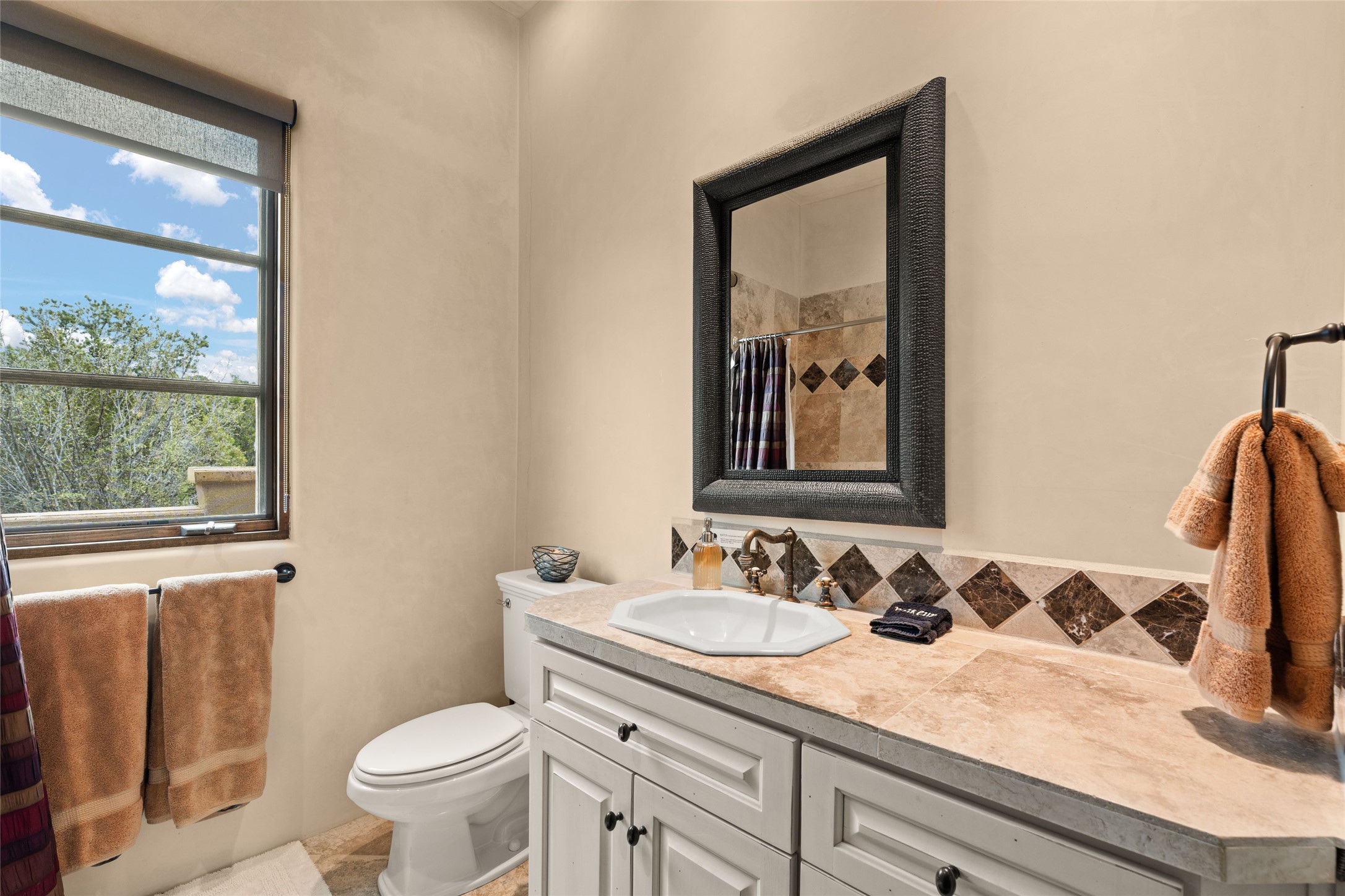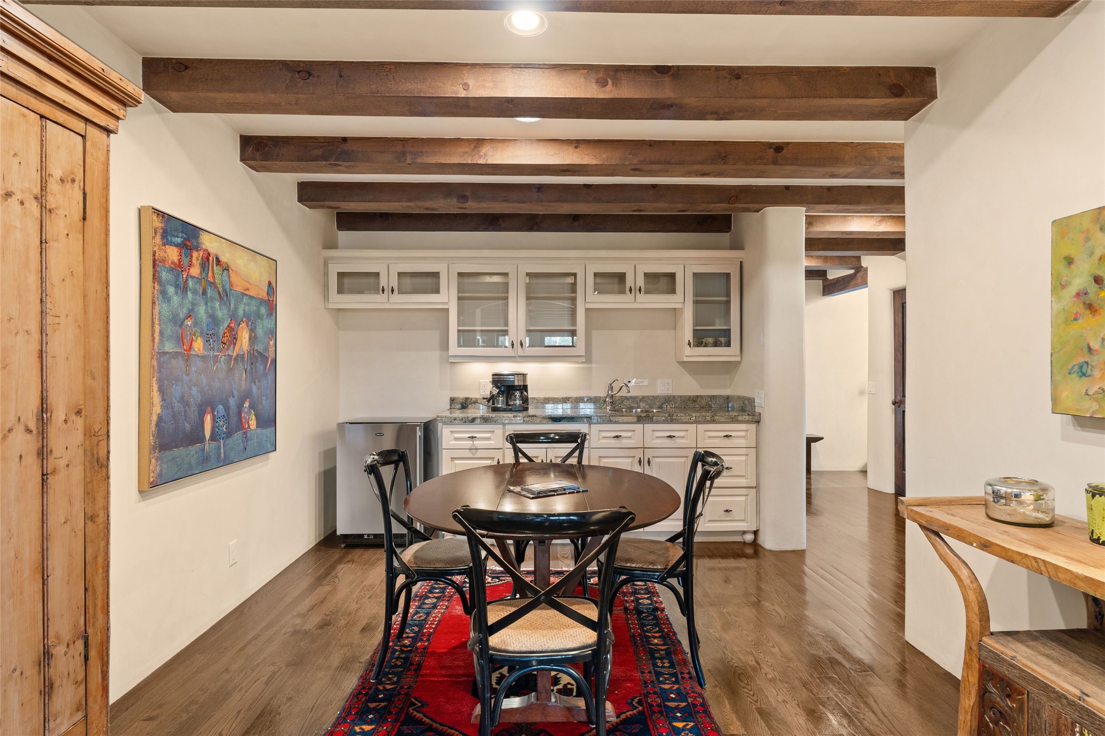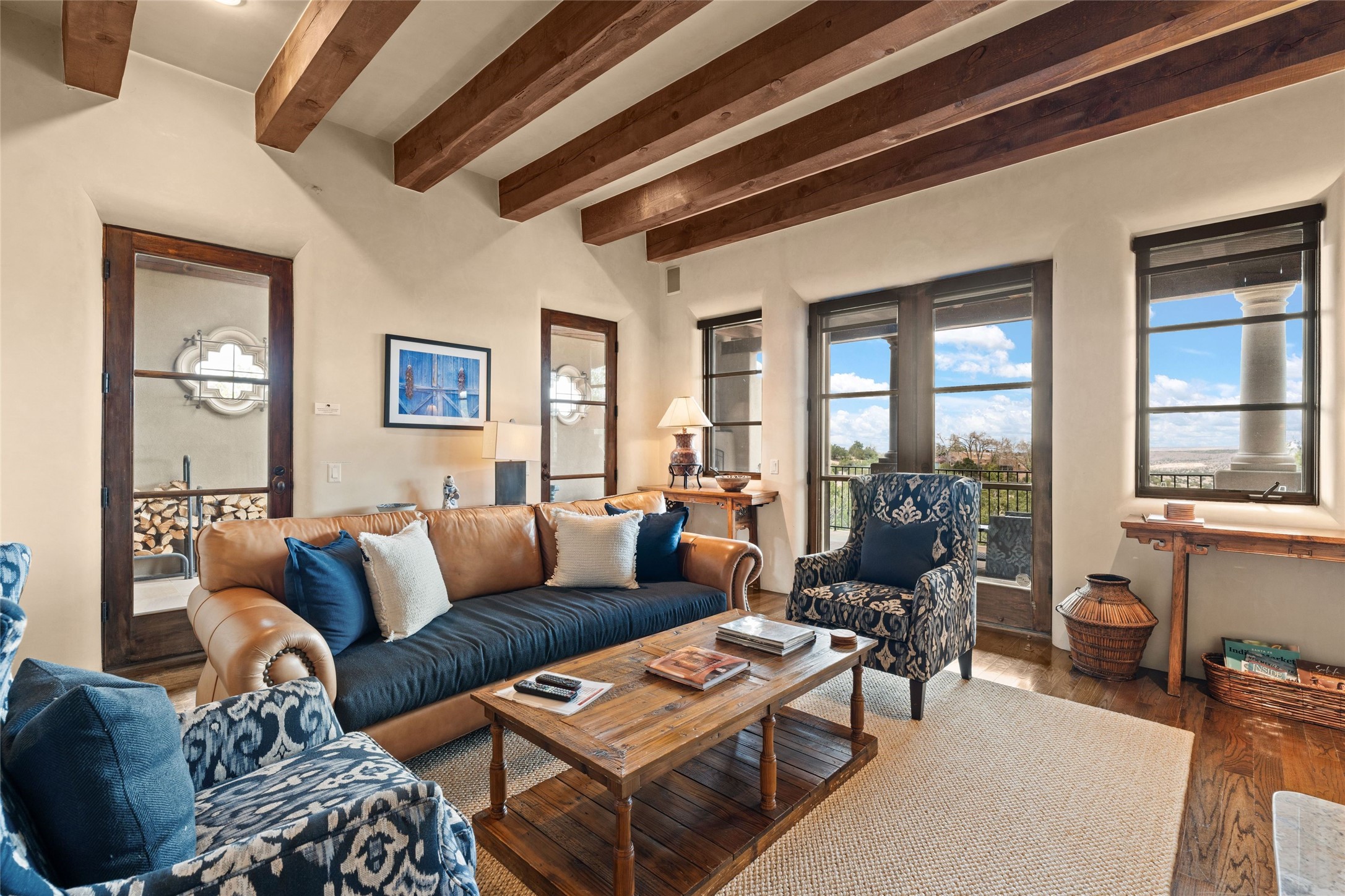 41 Avenida de Las Casas presents a rare opportunity to own one of the single family homes within the prestigious and gated Casas de San Juan community. Enjoy sweeping northern vistas, dramatic views of the Badlands, and dynamic seasonal tableaus of the Sangre de Cristo mountains from this stunning residence. Designed for both comfort and elegance, this approximately 5,000 square foot, two-level home with four generously sized bedrooms. There's a grandeur and stately quality to the property, typified by the high wood beamed ceiling in the living room that welcomes guests to the home. Spacious entertaining rooms are complimented by less formal and intimate spaces. The main level has three bedroom suites, each with their own outdoor access to secluded patios and portals. The lower level functions as a private one-bedroom guest casita, complete with its own living/dining area and kitchenette--ideal for visitors or multi-generational living. A spacious family room sits just off the fully equipped kitchen, creating a perfect flow for everyday living and entertaining. The outdoor spaces are impeccable with multiple formal and informal eating areas, an outdoor grill and bar, a stone fire pit, and a hot tub with a view to Colorado. The property is offered with the existing furniture included.