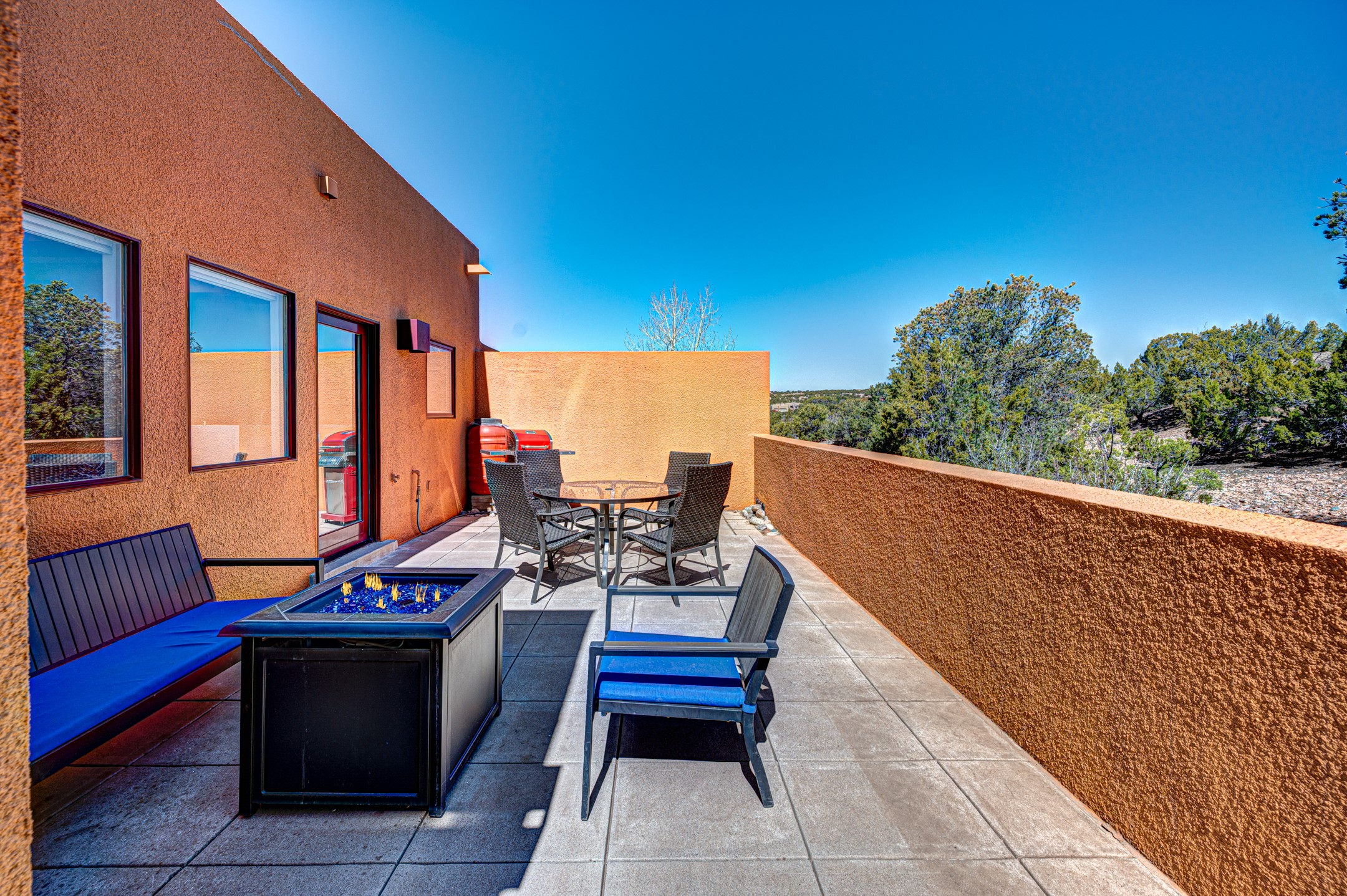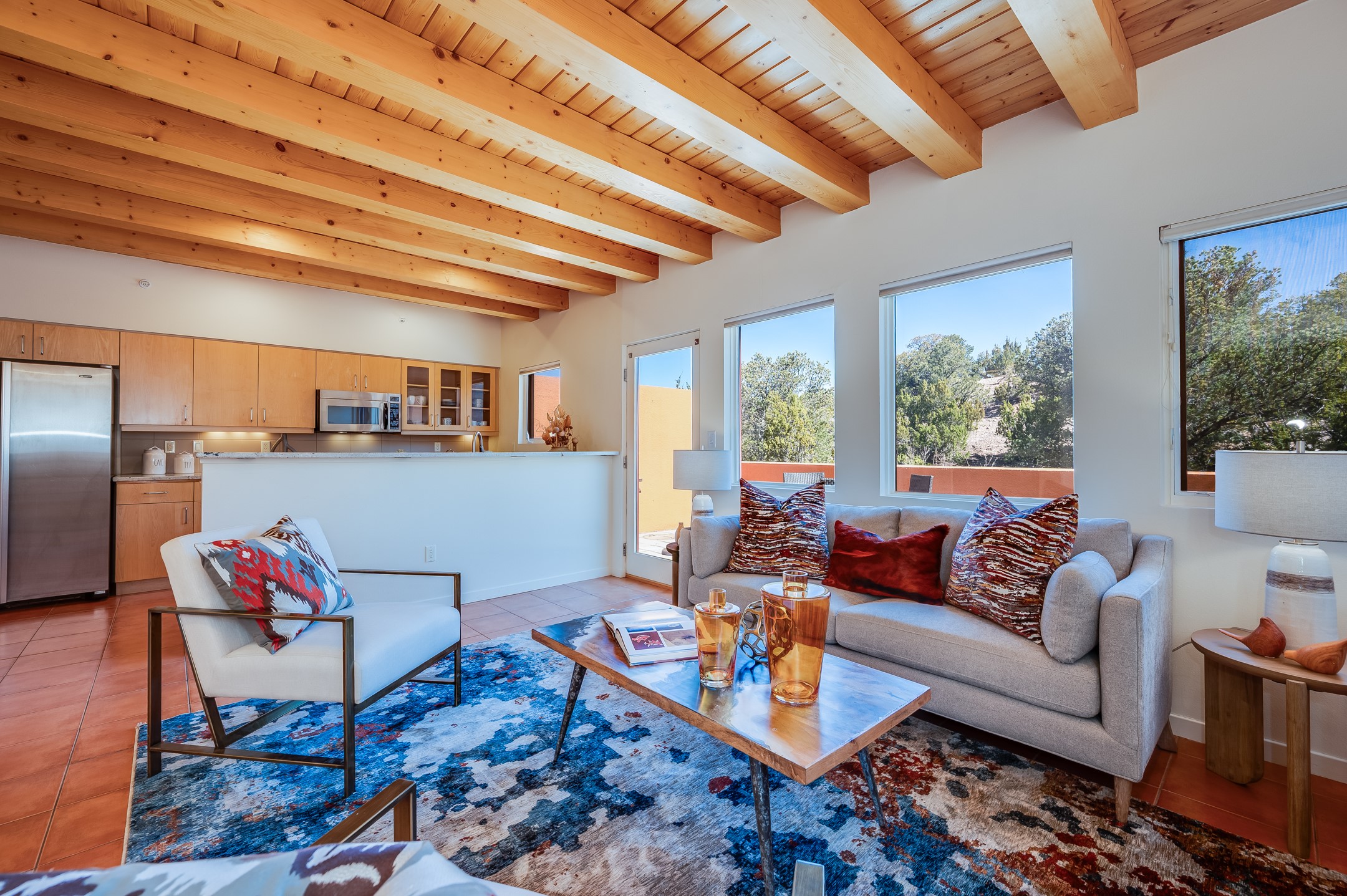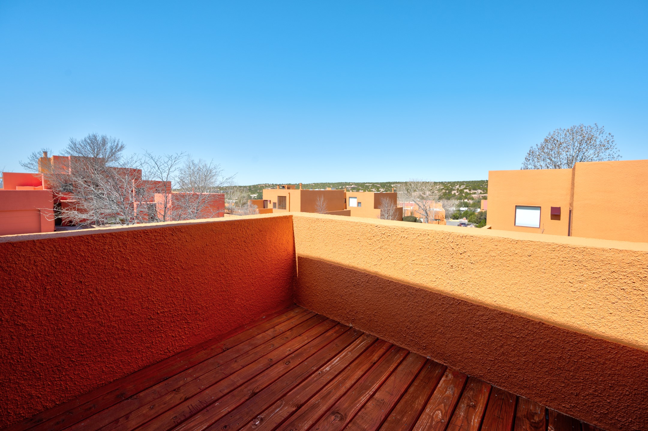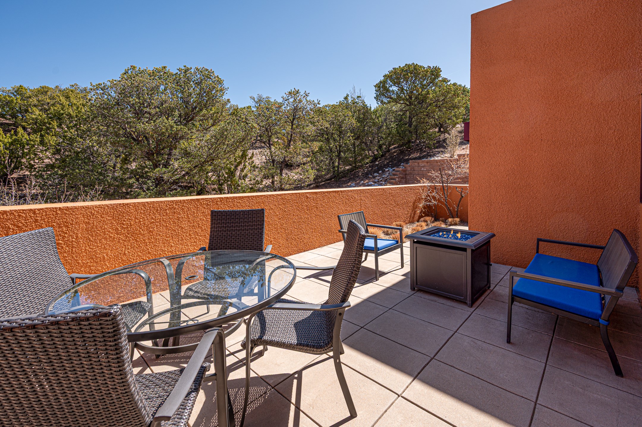 This highly sought after floor plan boasts two thoughtfully separated en-suites both with full baths and walk-in closets. The main suite has a bonus office area as wel as its own private balcony. A double sided gas fireplace separates the dining and living room Located in the beautiful Zocalo Condominium Community located near shopping and just a fewshort minutes to downtown Santa Fe.