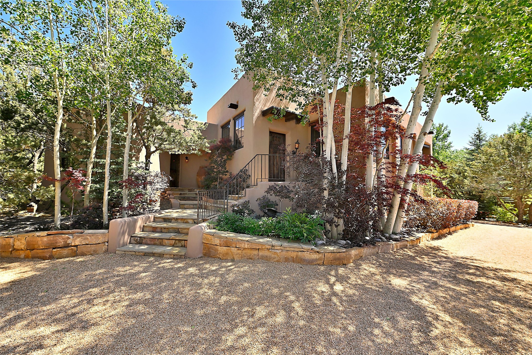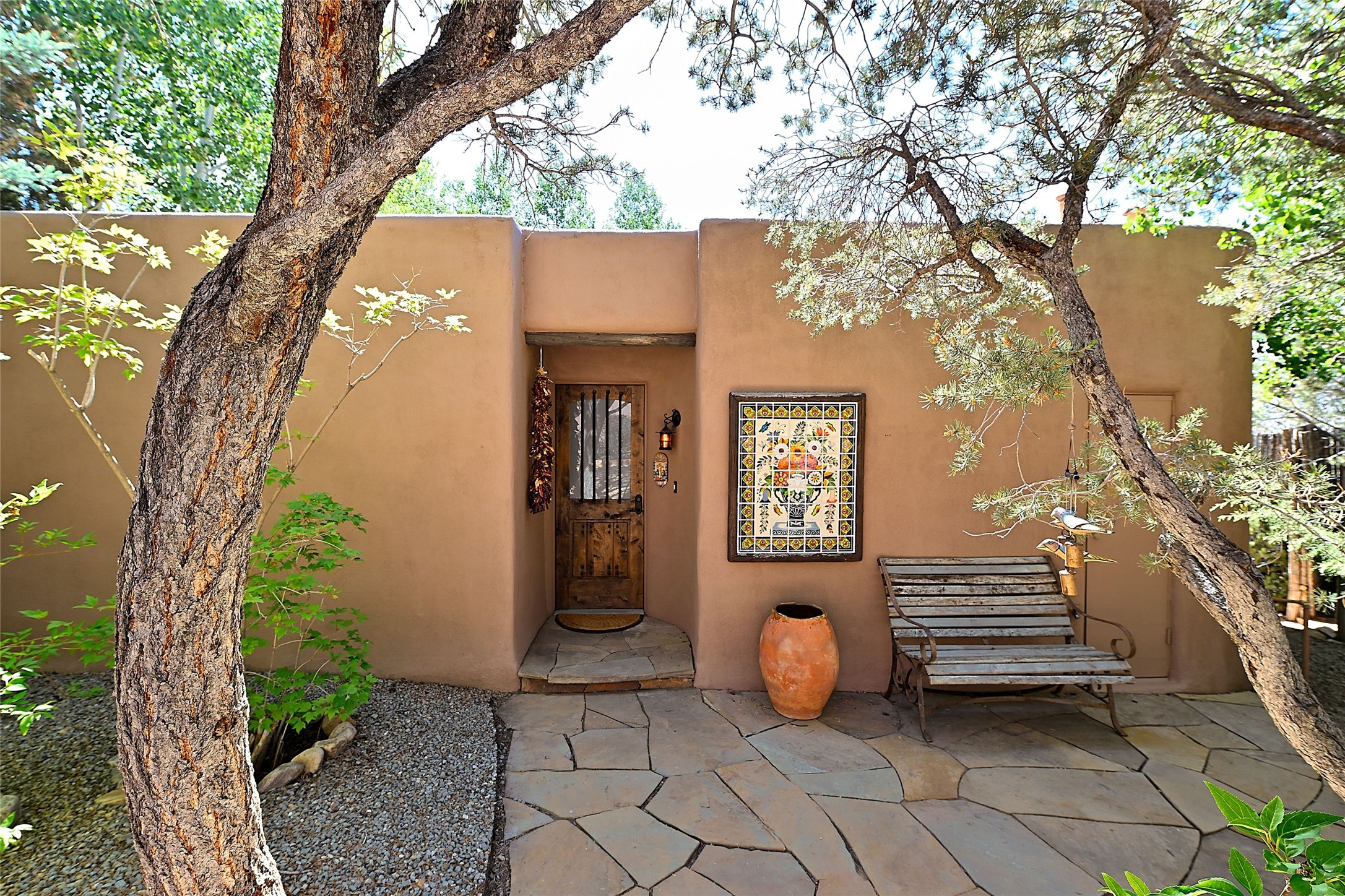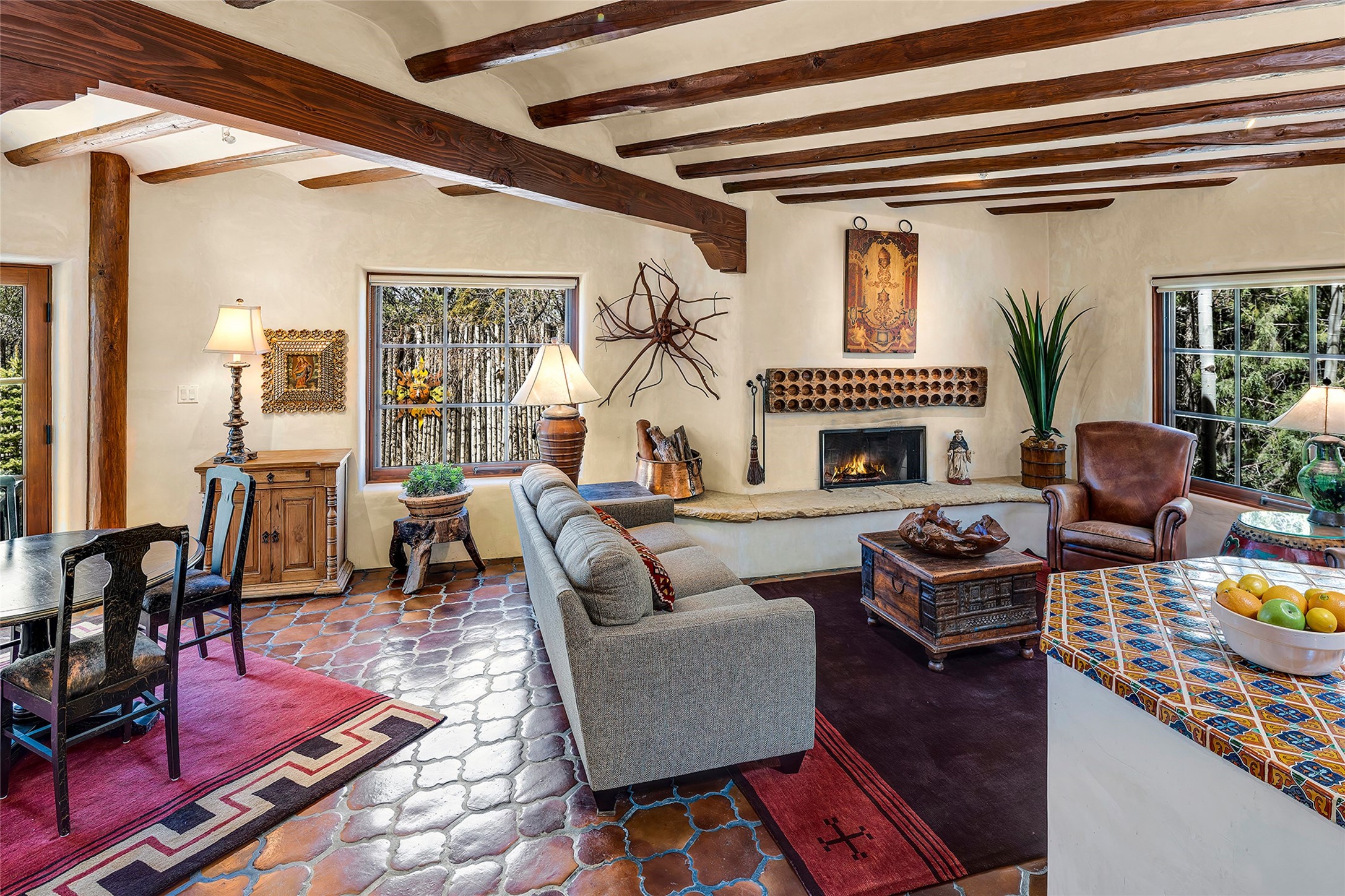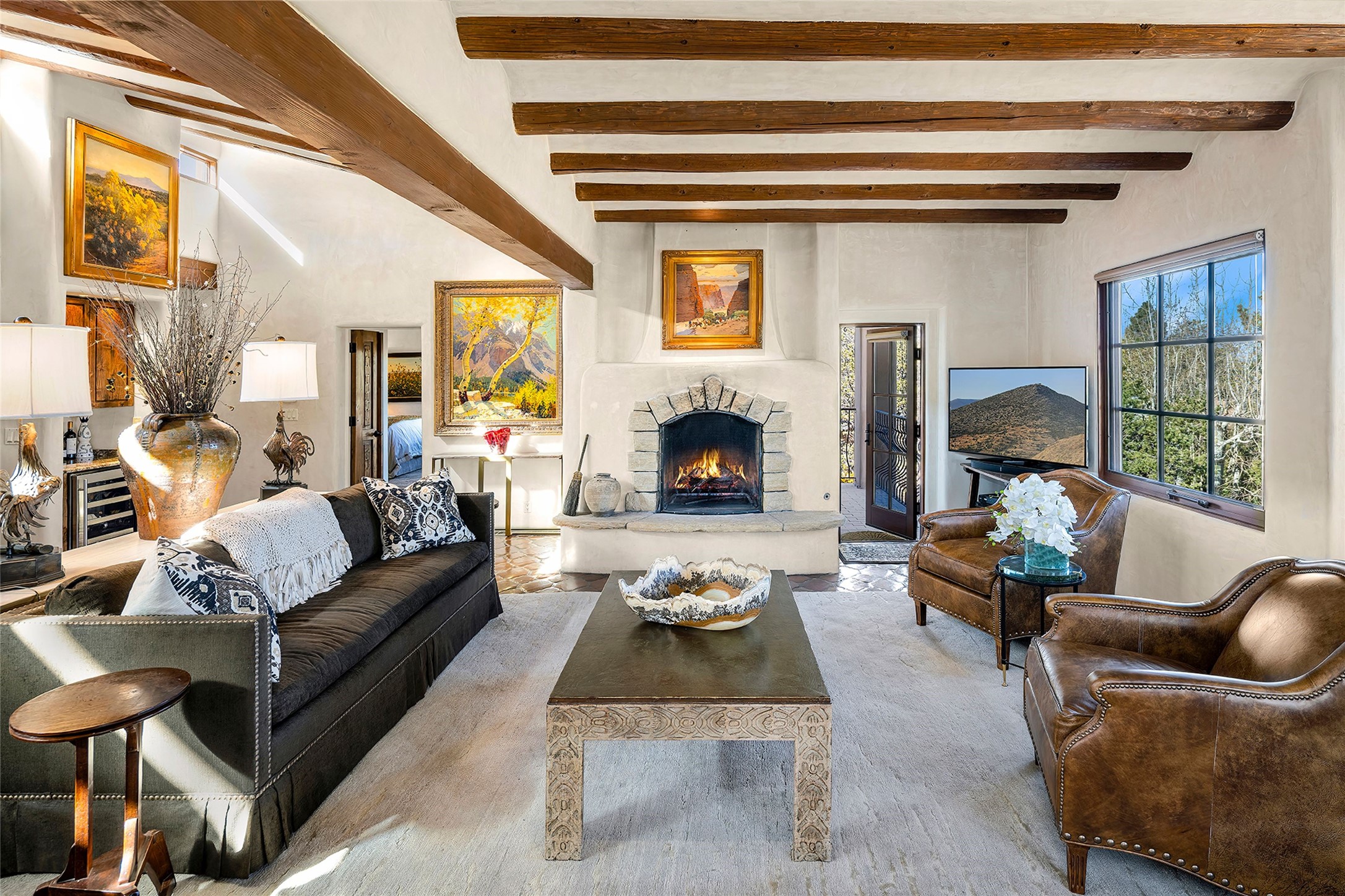 Experience the Santa Fe Dream on Camino del Monte Sol. This exceptional Eastside compound offers the quintessential Santa Fe lifestyle on a desirable, elevated half-acre lot, blocks from the famed Canyon Road. Enter through the electric gate with latillas, meander through the tree grove down the gravel drive and ascend the stone steps, leaving the world behind. Aspens whisper in the breeze above, leading you to a beautifully appointed home boasting a great room with vigas, plaster walls, coved ceilings, abundant natural light, a center piece fireplace and ample room for your art. Culinary enthusiasts will appreciate the island kitchen with custom wood-carved cabinets, Wolf range and Sub-Zero refrigerator, while the open dining room features its own romantic fireplace. Each living space and bedroom in the main house is anchored by a fireplace, creating a warm and inviting ambiance during the cooler months. The great room and primary suite with large awning windows both open to a treetop level covered portal with kiva fireplace. All of these spaces overlook the landscaped grounds with aspens, Japanese red maples, blue spruces, roses, peonies, pinions and junipers. From the house, enjoy breathtaking city lights, Jemez Mountain and sunset views. Beyond the main residence, a charming and private two-bedroom, two-bath casita with the same fine appointments of the main home and private stone patio offers ease of entertaining. Indulge in relaxation and recreation with a freestanding lap pool featuring resistance jets and hot tub. A stacked stone outdoor fireplace and multiple patios are designed for both grand entertaining and intimate moments. Practical features include generous parking for both the main house and casita, a convenient attached two car garage and a fully fenced yard. The property seamlessly blends seclusion with convenience, offering easy access to Santa Fe's renowned shopping, dining, entertainment and hiking trails, within the heart of the Historic Eastside.