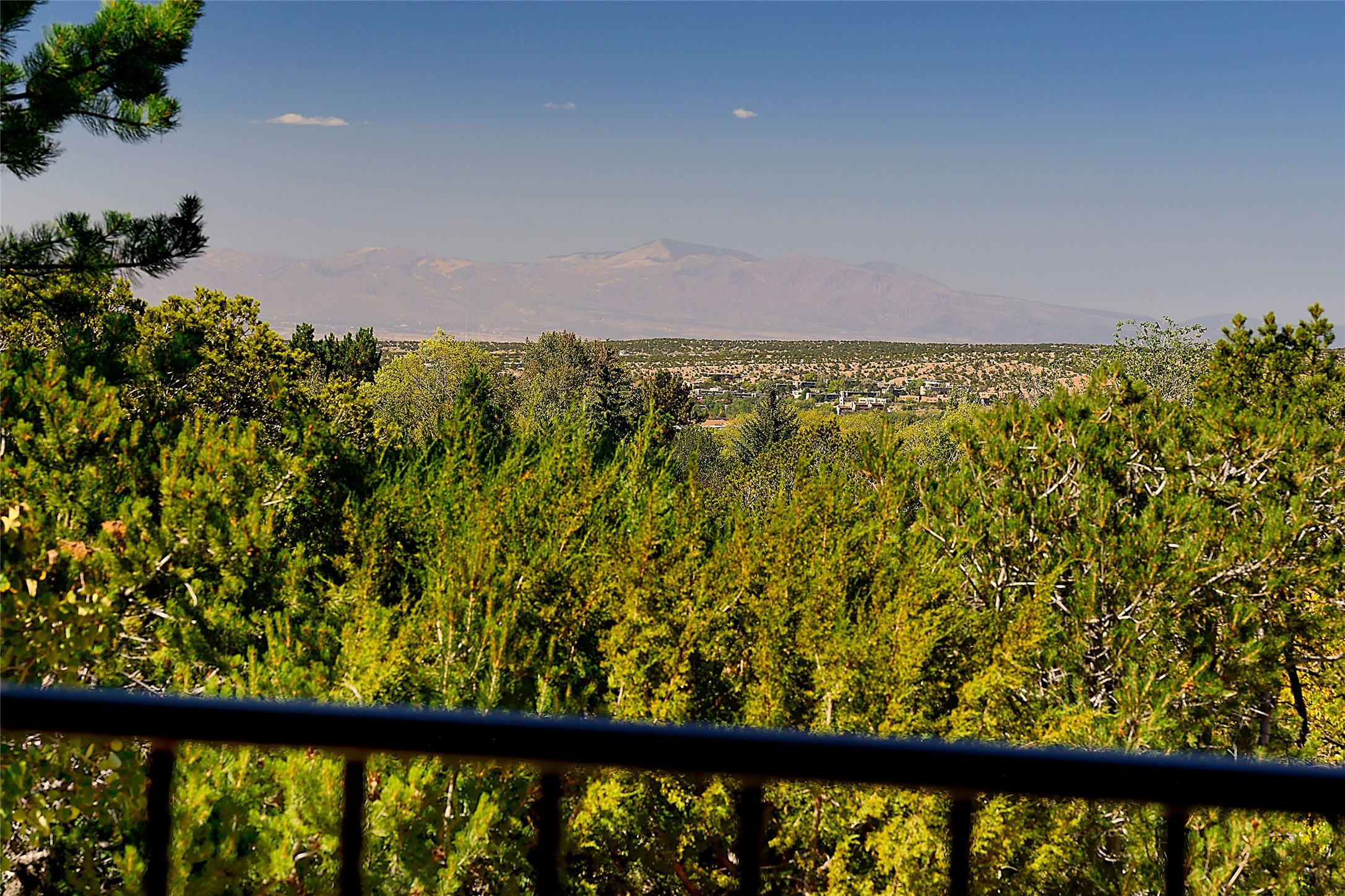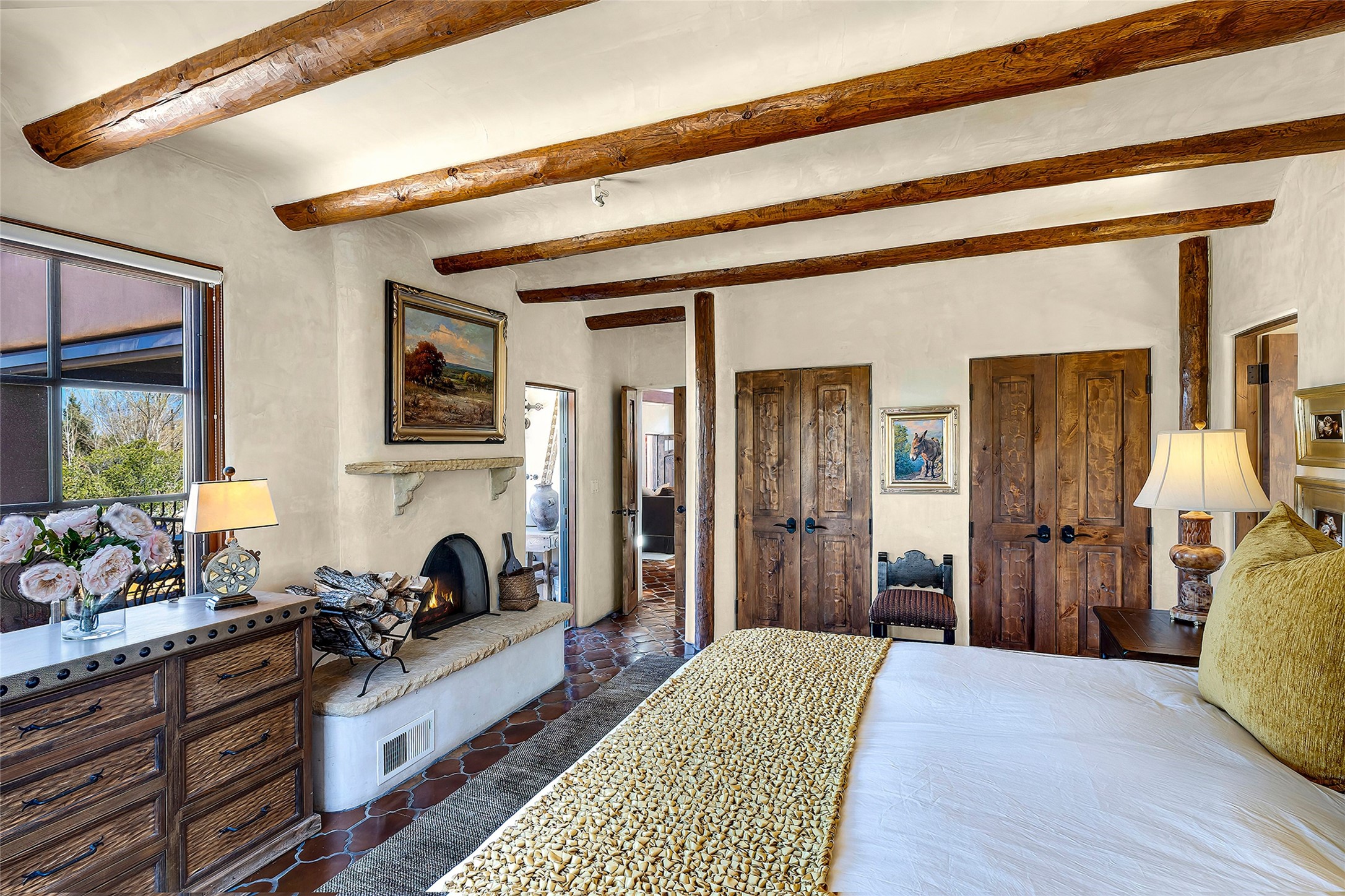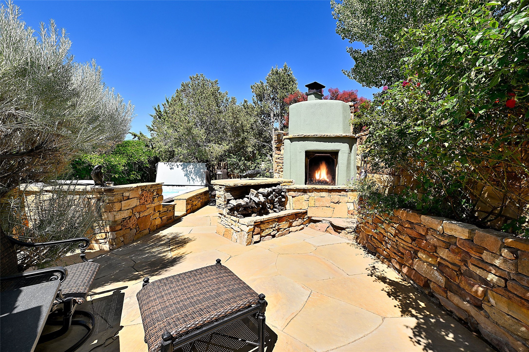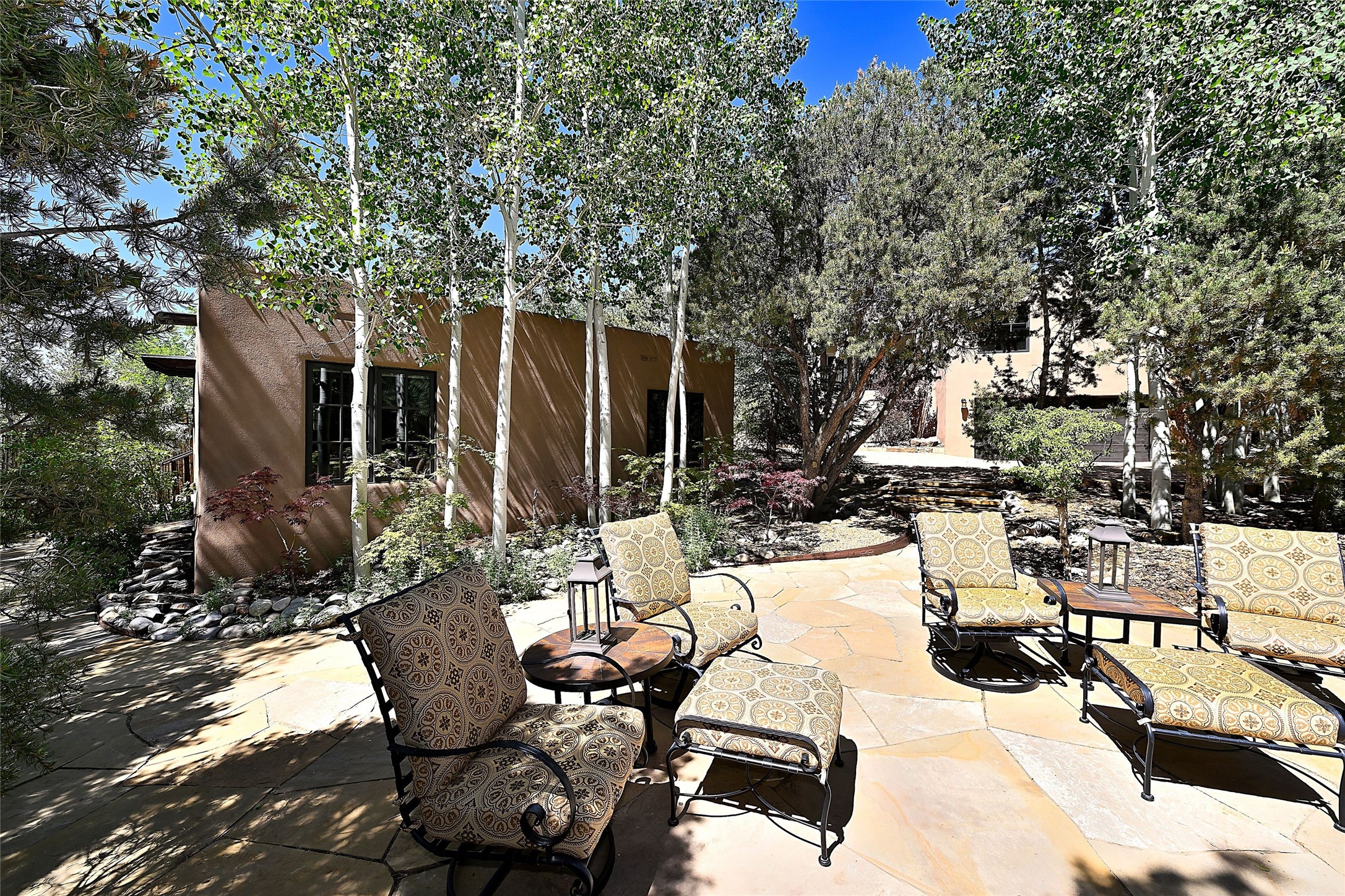 Experience the Santa Fe Dream on Camino del Monte Sol. This exceptional Eastside compound offers the quintessential Santa Fe lifestyle on a desirable, elevated half-acre lot, blocks from the famed Canyon Road. Enter through the electric gate with latillas, meander through the tree grove down the gravel drive and ascend the stone steps, leaving the world behind. Aspens whisper in the breeze above, leading you to a beautifully appointed home boasting a great room with vigas, plaster walls, coved ceilings, abundant natural light, a center piece fireplace and ample room for your art. Culinary enthusiasts will appreciate the island kitchen with custom wood-carved cabinets, Wolf range and Sub-Zero refrigerator, while the open dining room features its own romantic fireplace. Each living space and bedroom in the main house is anchored by a fireplace, creating a warm and inviting ambiance during the cooler months. The great room and primary suite with large awning windows both open to a treetop level covered portal with kiva fireplace. All of these spaces overlook the landscaped grounds with aspens, Japanese red maples, blue spruces, roses, peonies, pinions and junipers. From the house, enjoy breathtaking city lights, Jemez Mountain and sunset views. Beyond the main residence, a charming and private two-bedroom, two-bath casita with the same fine appointments of the main home and private stone patio offers ease of entertaining. Indulge in relaxation and recreation with a freestanding lap pool featuring resistance jets and hot tub. A stacked stone outdoor fireplace and multiple patios are designed for both grand entertaining and intimate moments. Practical features include generous parking for both the main house and casita, a convenient attached two car garage and a fully fenced yard. The property seamlessly blends seclusion with convenience, offering easy access to Santa Fe's renowned shopping, dining, entertainment and hiking trails, within the heart of the Historic Eastside.