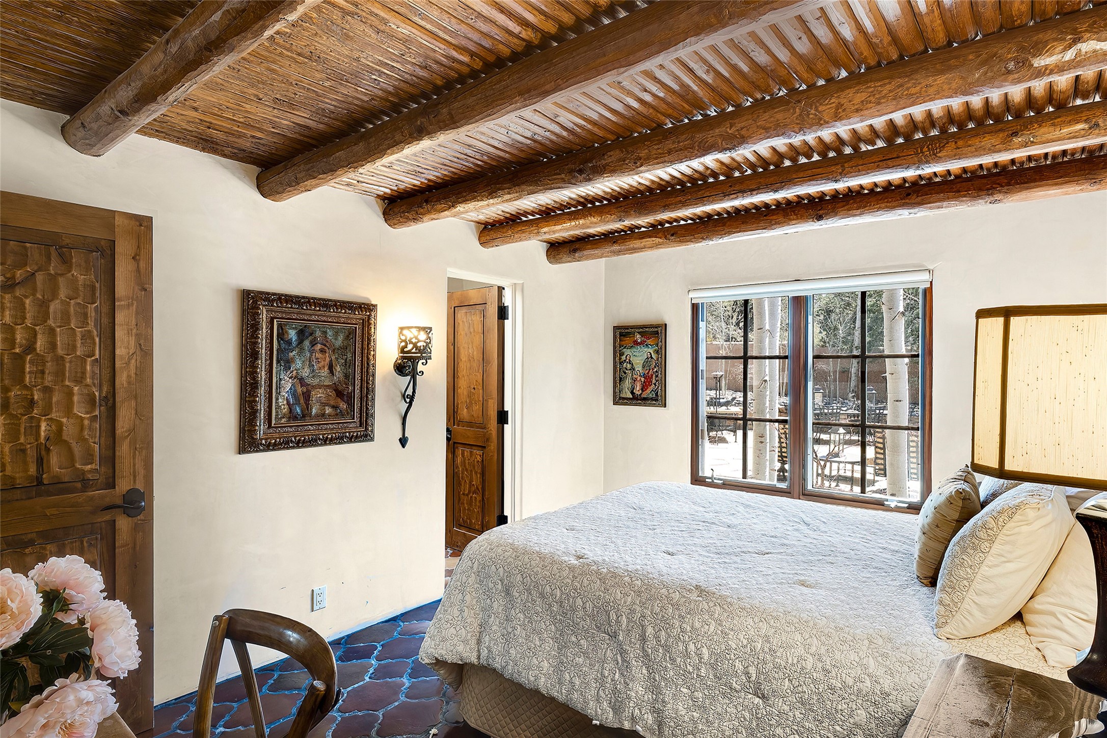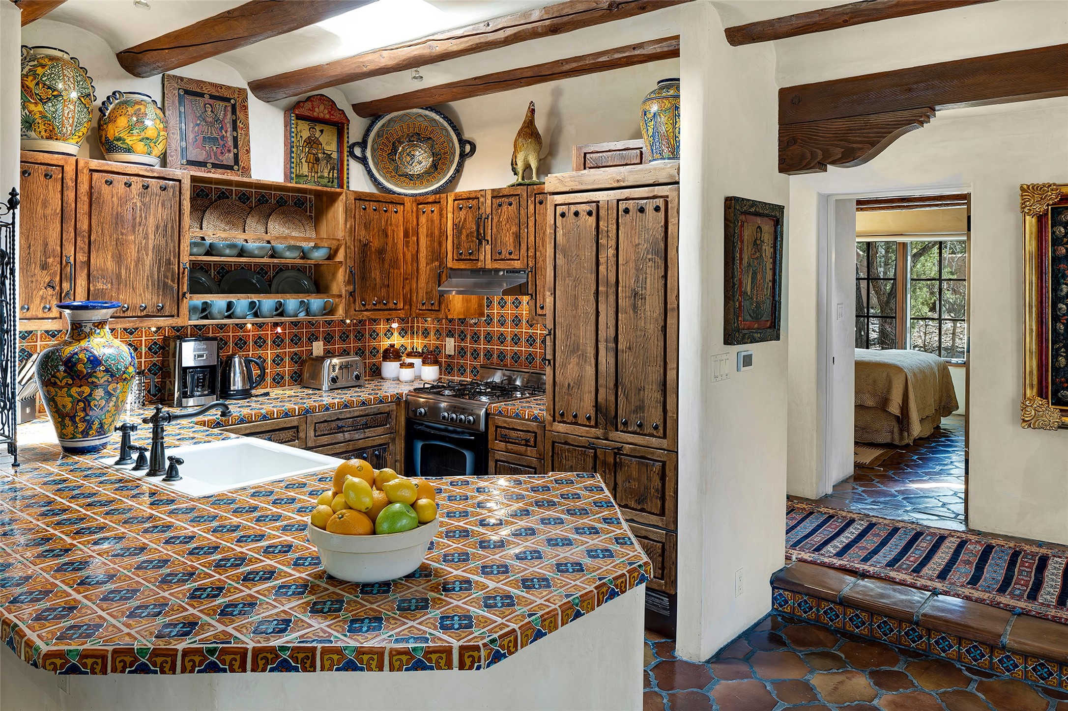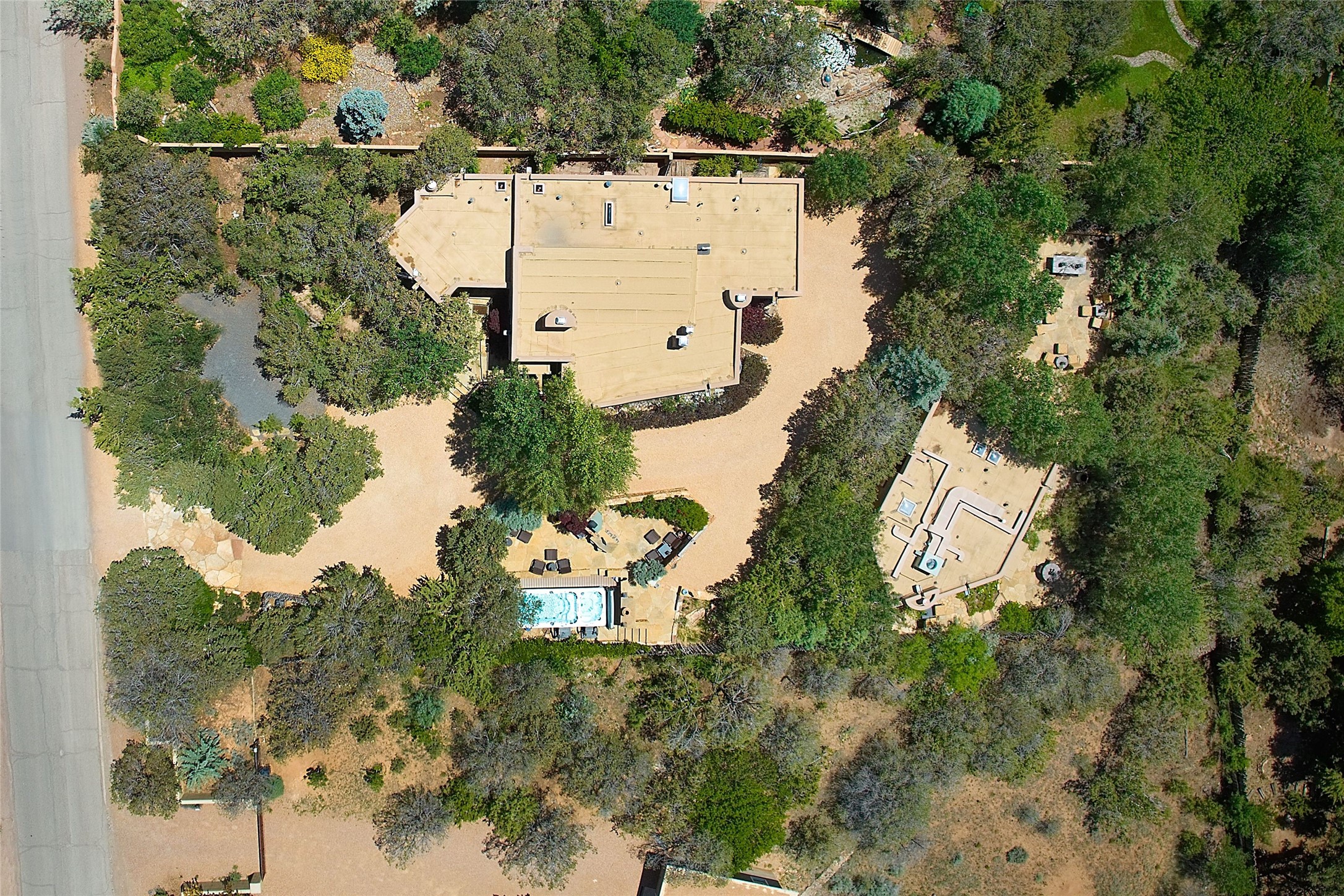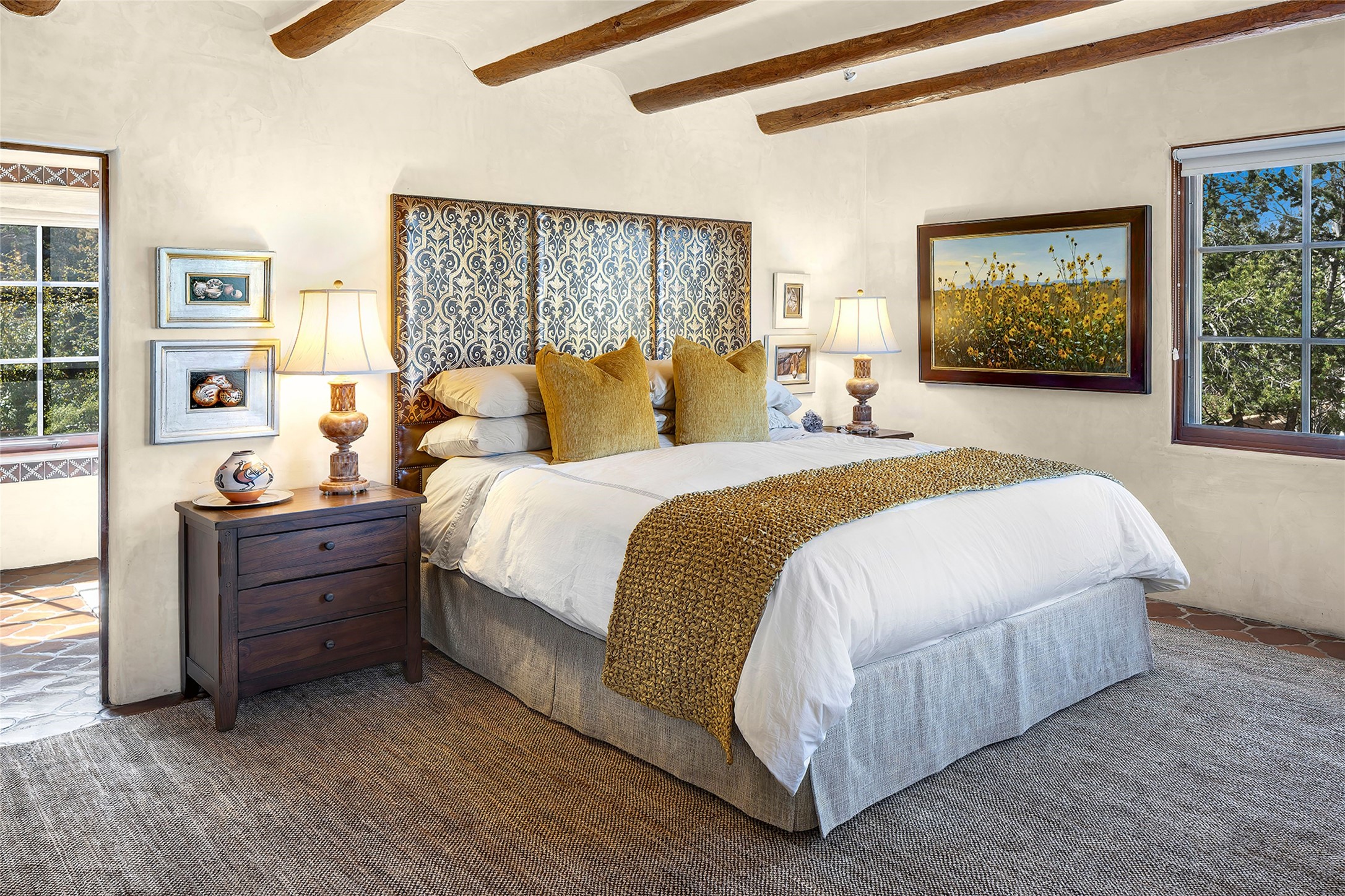 Experience the Santa Fe Dream on Camino del Monte Sol. This exceptional Eastside compound offers the quintessential Santa Fe lifestyle on a desirable, elevated half-acre lot, blocks from the famed Canyon Road. Enter through the electric gate with latillas, meander through the tree grove down the gravel drive and ascend the stone steps, leaving the world behind. Aspens whisper in the breeze above, leading you to a beautifully appointed home boasting a great room with vigas, plaster walls, coved ceilings, abundant natural light, a center piece fireplace and ample room for your art. Culinary enthusiasts will appreciate the island kitchen with custom wood-carved cabinets, Wolf range and Sub-Zero refrigerator, while the open dining room features its own romantic fireplace. Each living space and bedroom in the main house is anchored by a fireplace, creating a warm and inviting ambiance during the cooler months. The great room and primary suite with large awning windows both open to a treetop level covered portal with kiva fireplace. All of these spaces overlook the landscaped grounds with aspens, Japanese red maples, blue spruces, roses, peonies, pinions and junipers. From the house, enjoy breathtaking city lights, Jemez Mountain and sunset views. Beyond the main residence, a charming and private two-bedroom, two-bath casita with the same fine appointments of the main home and private stone patio offers ease of entertaining. Indulge in relaxation and recreation with a freestanding lap pool featuring resistance jets and hot tub. A stacked stone outdoor fireplace and multiple patios are designed for both grand entertaining and intimate moments. Practical features include generous parking for both the main house and casita, a convenient attached two car garage and a fully fenced yard. The property seamlessly blends seclusion with convenience, offering easy access to Santa Fe's renowned shopping, dining, entertainment and hiking trails, within the heart of the Historic Eastside.