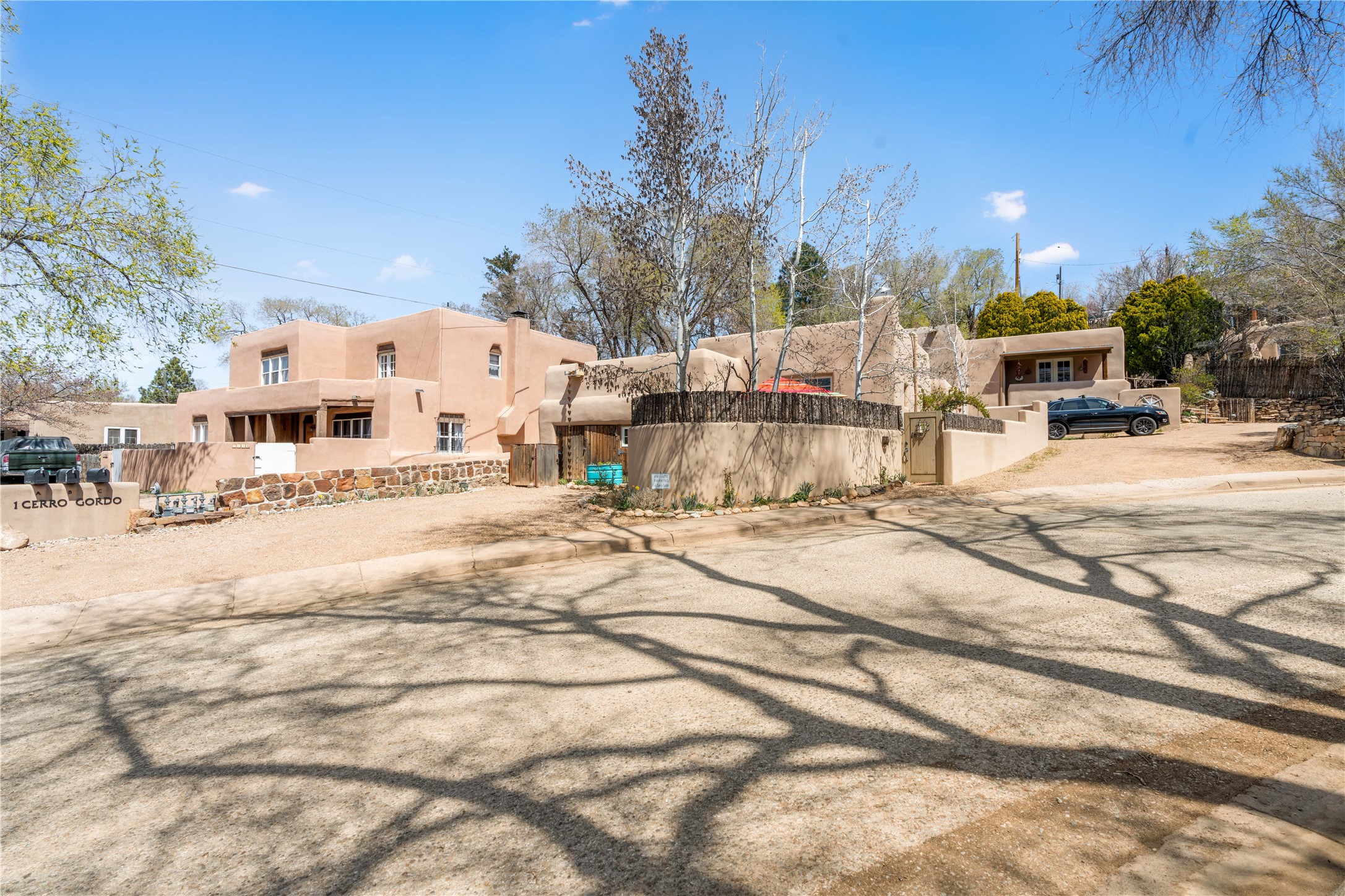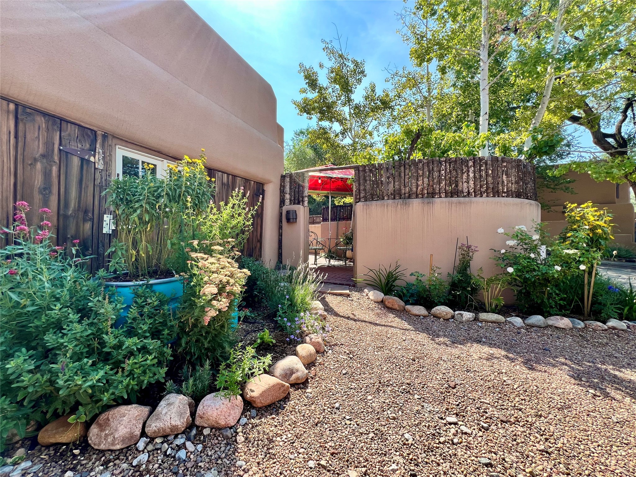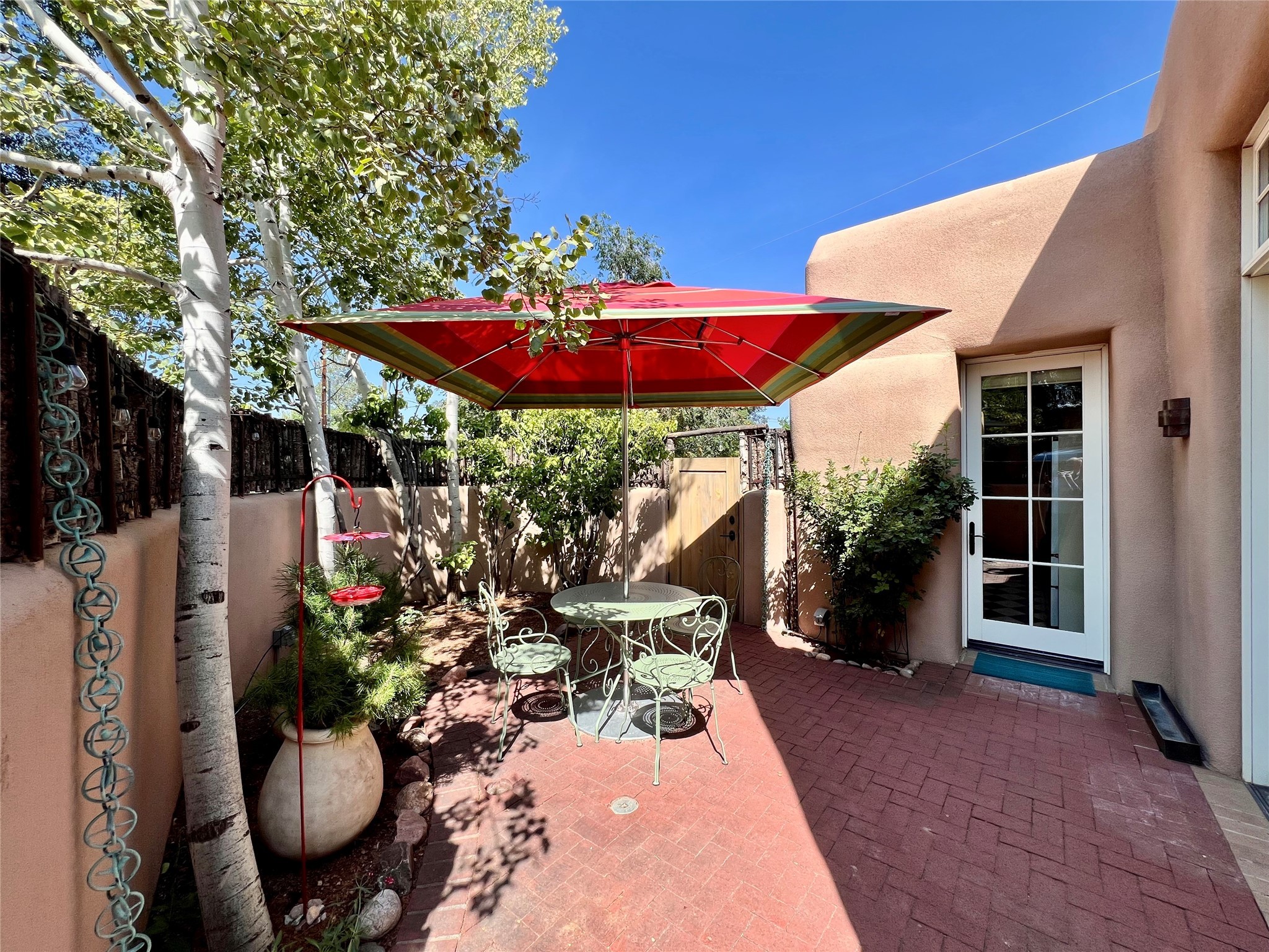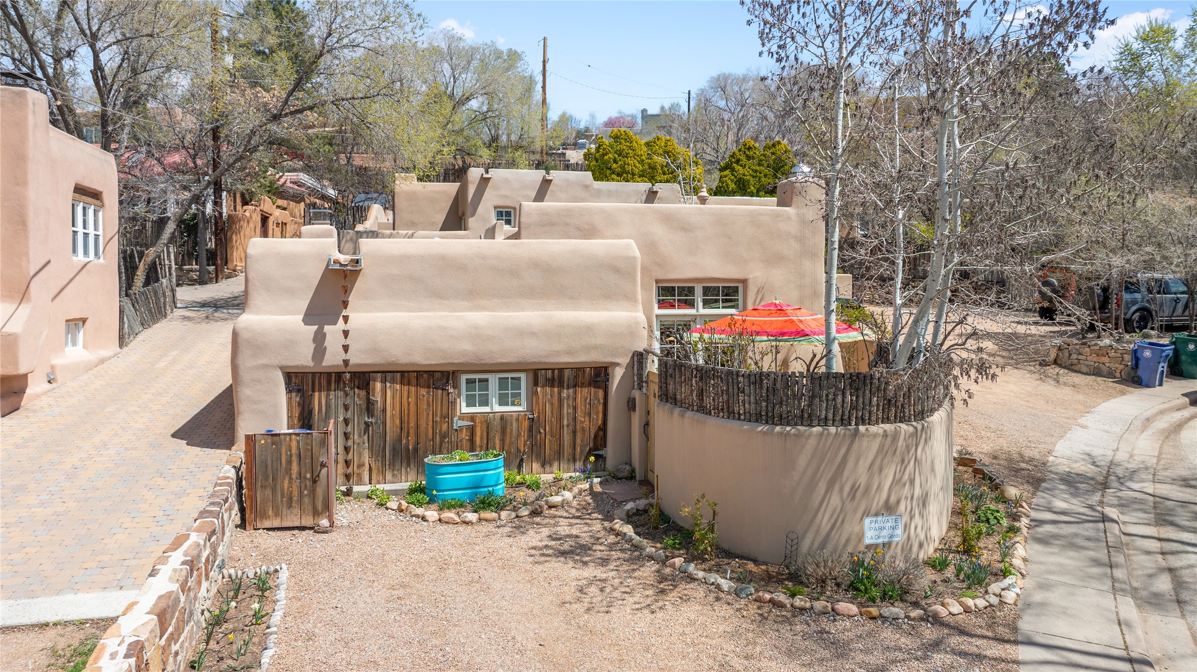 This historic Eastside home offers 1,322+/- Sq. Ft. of elegant living space, blending timeless Santa Fe charm with modern comfort. Designed by architect Michael Mahaffey and built in 2006 on the grounds of the 1926 Sheldon Parsons artist compound, it features a brand new roof, taupe-stone brick floors, tall alder wood doors, 2 wood-burning kiva fireplaces, skylights, and several glass French doors including one opening to a beautifully landscaped front patio. The interior walls are hand-plastered, adding warmth and texture to the space. Both the living area and bedroom boast high ceilings with wood beams, enhancing the open feel. The spacious bedroom suite offers a luxurious full bath and generous closet space. The kitchen flows into an open-concept living and dining area, perfect for relaxed living and entertaining. The front patio, framed by aspen, lilacs, and flower beds, offers privacy with wood gates and a walled perimeter, ideal for morning coffee or an evening meal. The low-maintenance landscaping has a drip irrigation system fed by a shared well. The back patio has an indoor-outdoor ambiance, reminiscent of a European pied--terre, offering serene architectural details and dappled light. This home is perfect for full-time living or as a "lock and leave" retreat. With its newly installed roof providing years of worry-free protection, and priced $302,000 below a recent appraisal (3/25), this property presents an exceptional value and an amazing opportunity to own a beautiful home in a highly sought-after location, just steps from the Santa Fe River Trail, Canyon Road, and a short stroll to the Plaza.
