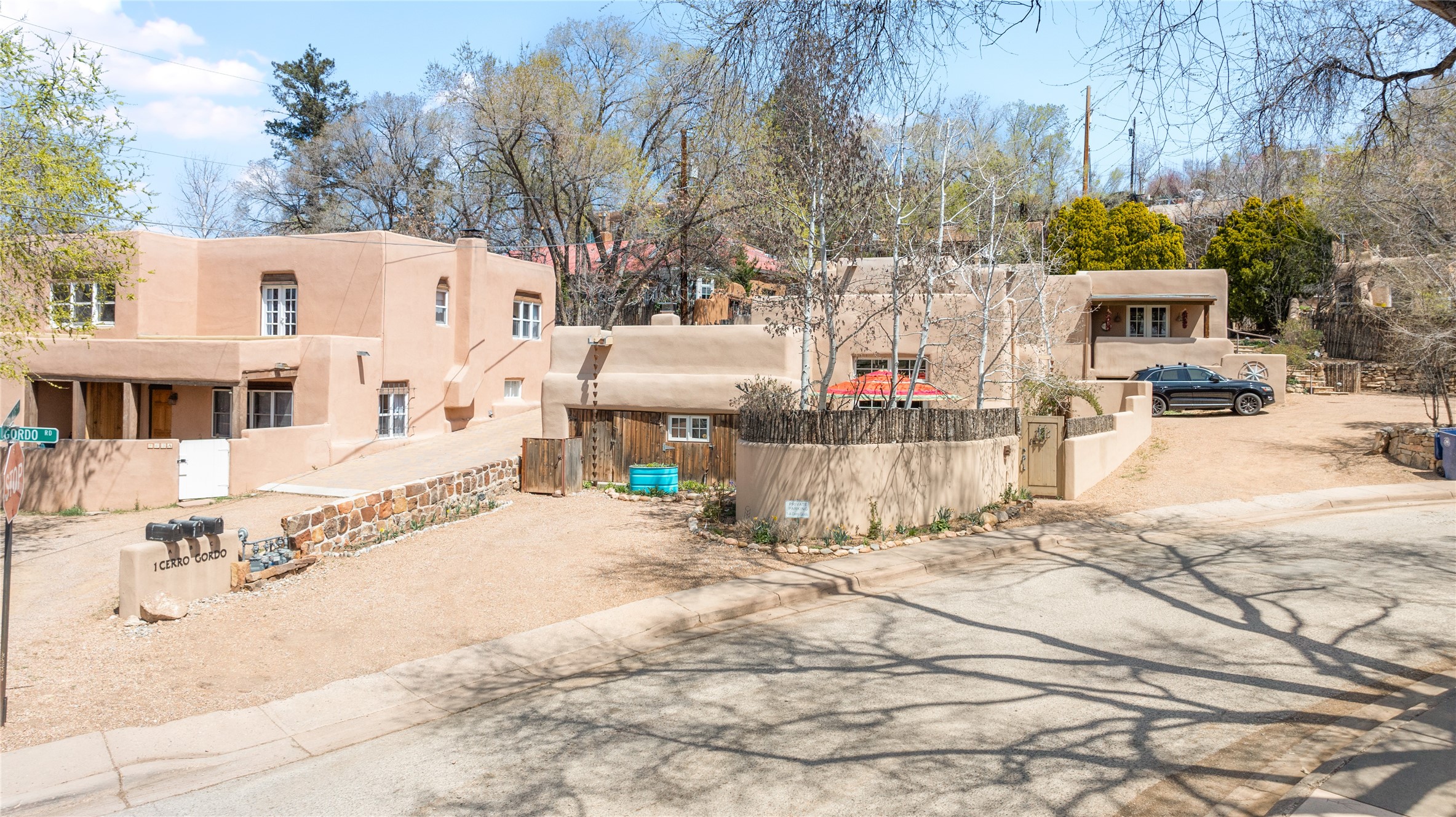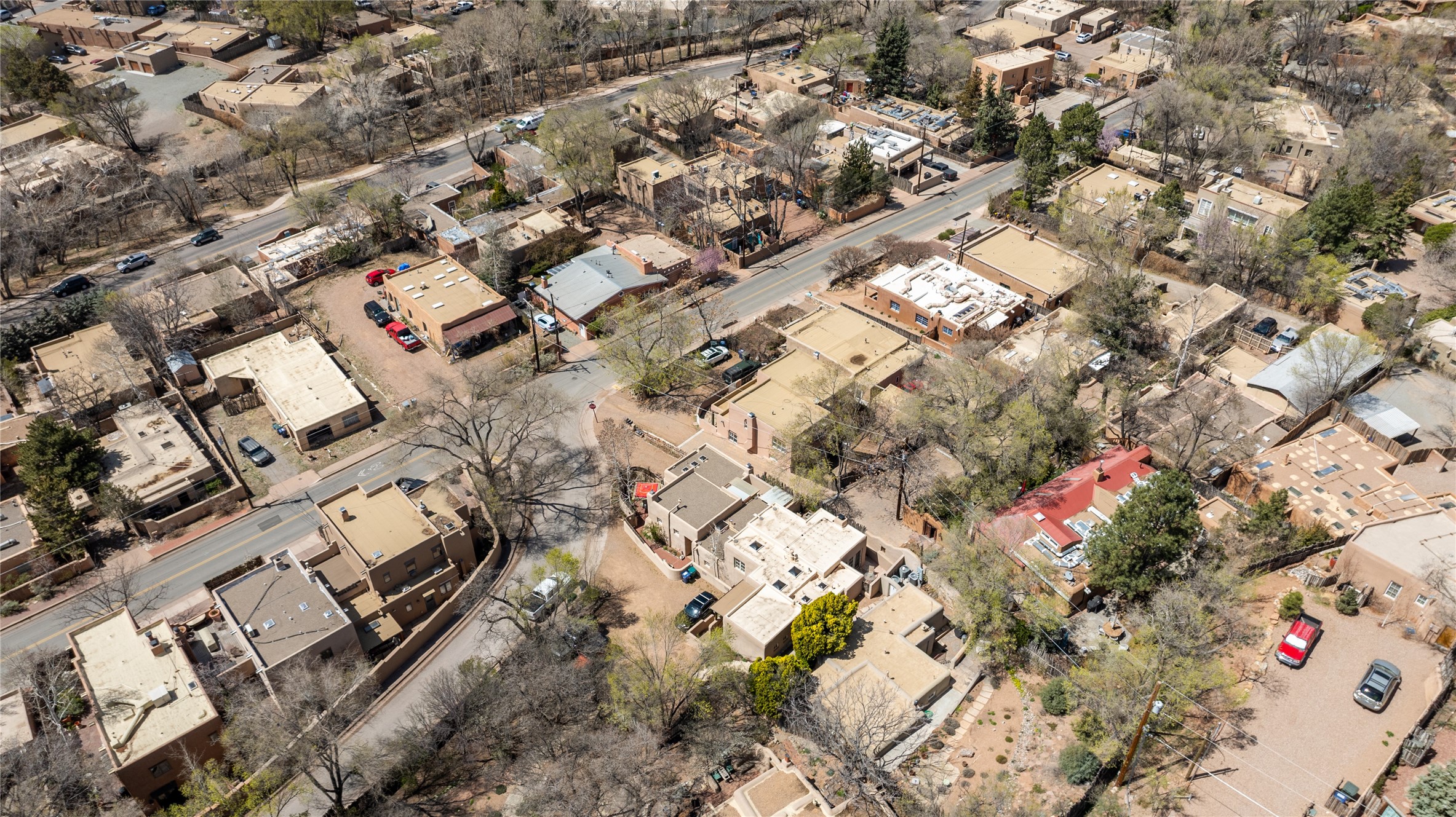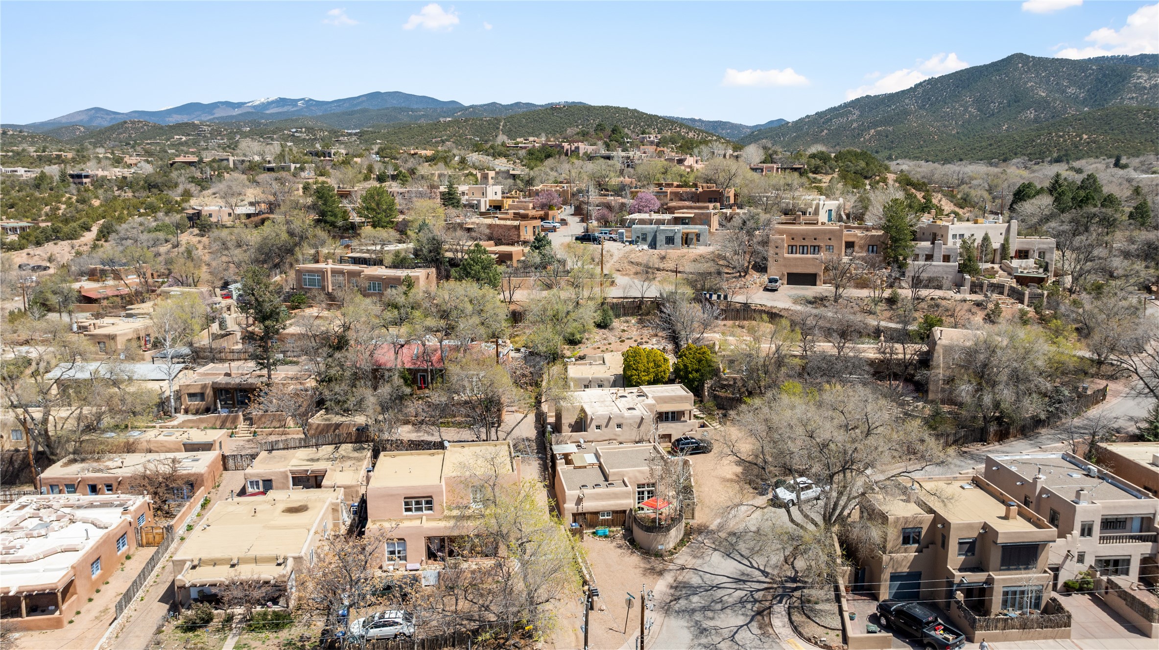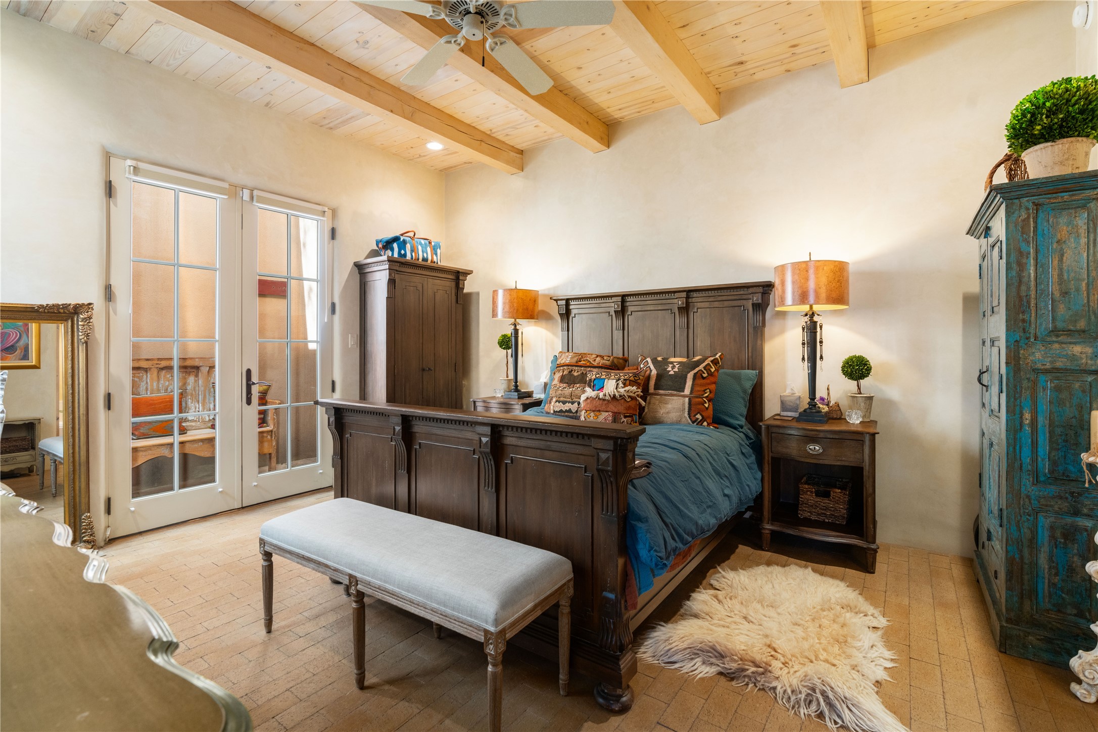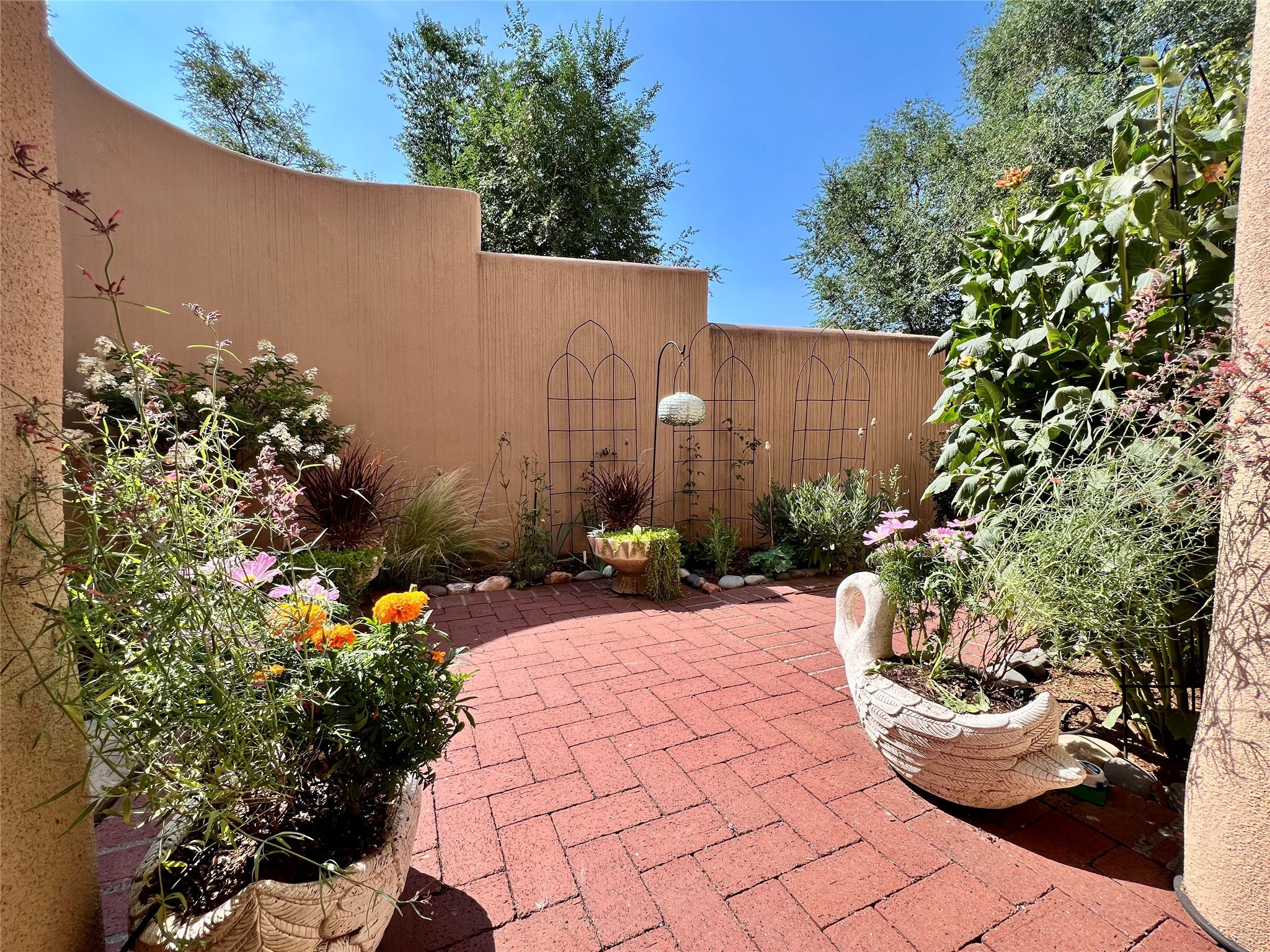 This historic Eastside home offers 1,322+/- Sq. Ft. of elegant living space, blending timeless Santa Fe charm with modern comfort. Designed by architect Michael Mahaffey and built in 2006 on the grounds of the 1926 Sheldon Parsons artist compound, it features a brand new roof, taupe-stone brick floors, tall alder wood doors, 2 wood-burning kiva fireplaces, skylights, and several glass French doors including one opening to a beautifully landscaped front patio. The interior walls are hand-plastered, adding warmth and texture to the space. Both the living area and bedroom boast high ceilings with wood beams, enhancing the open feel. The spacious bedroom suite offers a luxurious full bath and generous closet space. The kitchen flows into an open-concept living and dining area, perfect for relaxed living and entertaining. The front patio, framed by aspen, lilacs, and flower beds, offers privacy with wood gates and a walled perimeter, ideal for morning coffee or an evening meal. The low-maintenance landscaping has a drip irrigation system fed by a shared well. The back patio has an indoor-outdoor ambiance, reminiscent of a European pied--terre, offering serene architectural details and dappled light. This home is perfect for full-time living or as a "lock and leave" retreat. With its newly installed roof providing years of worry-free protection, and priced $302,000 below a recent appraisal (3/25), this property presents an exceptional value and an amazing opportunity to own a beautiful home in a highly sought-after location, just steps from the Santa Fe River Trail, Canyon Road, and a short stroll to the Plaza.