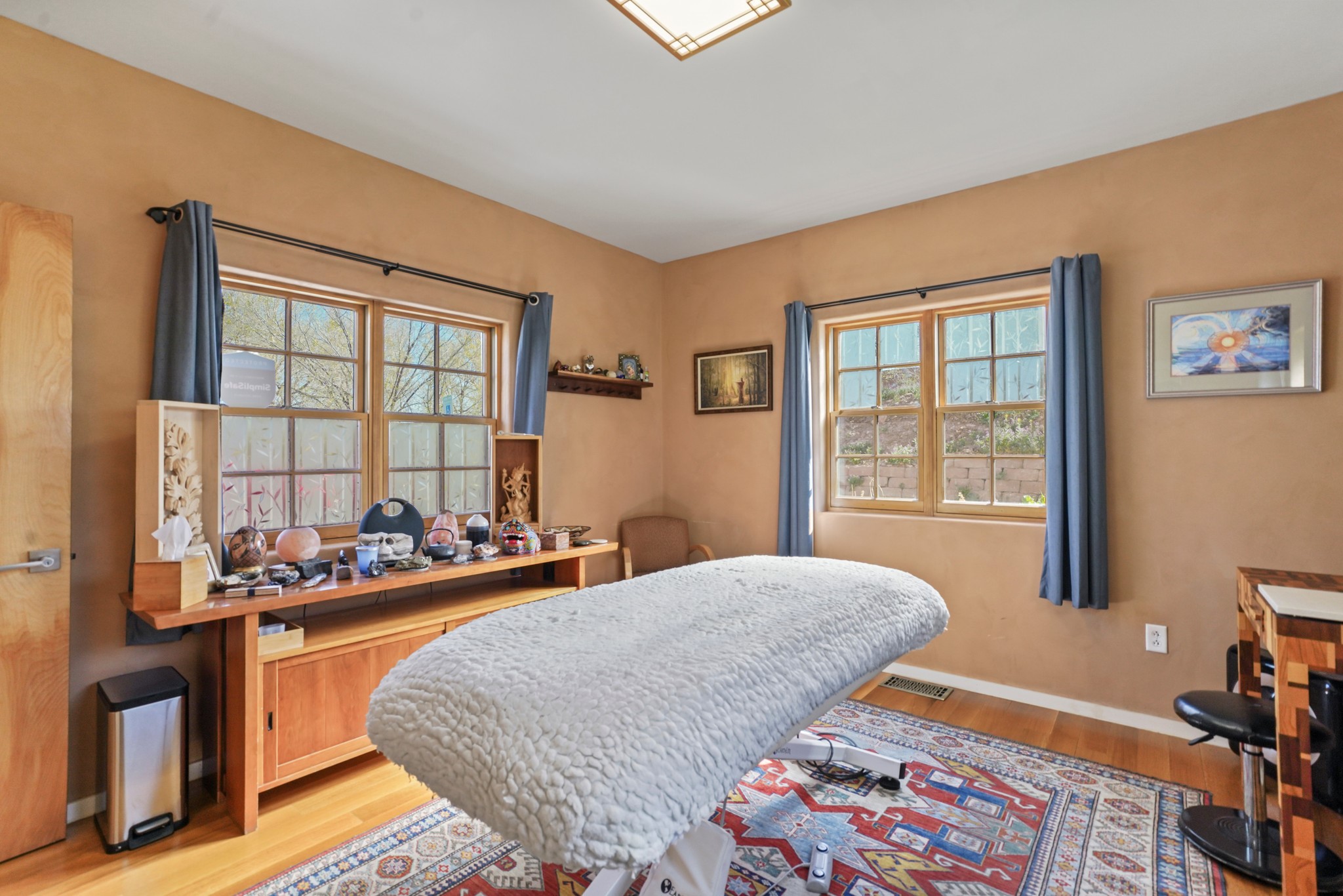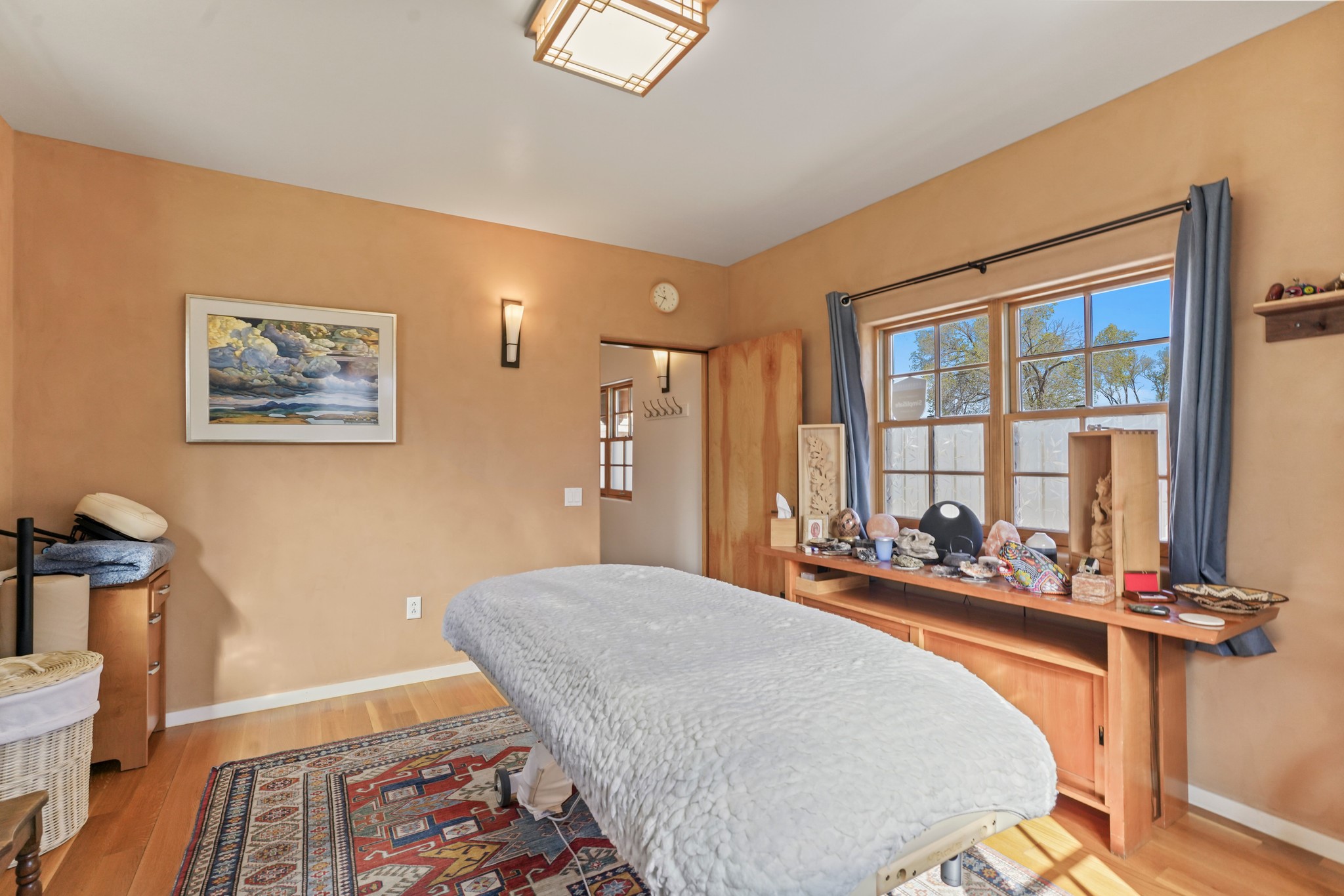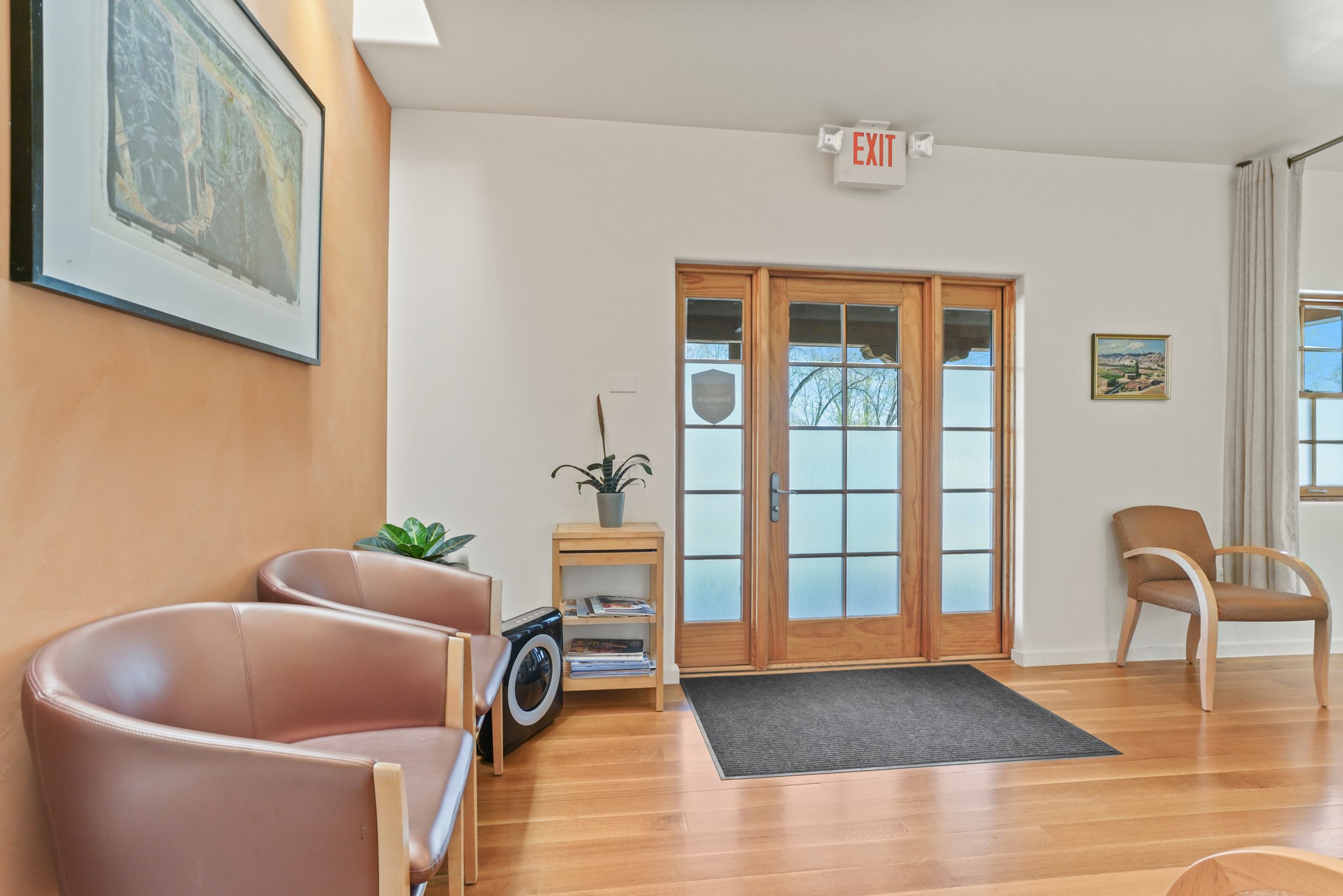 Beautifully remodeled and centrally located, this office condo showcases classic Santa Fe architectural elements both inside and out. The floor plan offers excellent flow with a welcoming reception area, hardwood floors throughout, recessed lighting, skylights, finished plaster walls, high ceilings, four private windowed offices, and a well-equipped kitchenette featuring washer and dryer hookups. Situated in a highly desirable area with excellent visibility and easy access from S. St. Francis Drive, the property also provides ample on-site parking--a rare find in Santa Fe. Ideal for professionals seeking a unique and stylish work environment in a prime location. Condo fees are estimated at $310 per month. **Do Not Disturb Tenants**