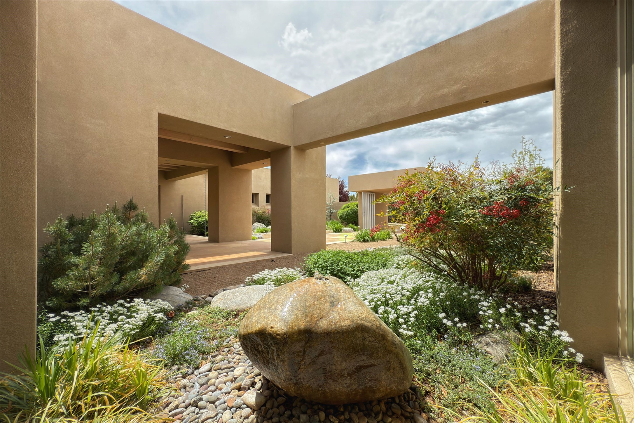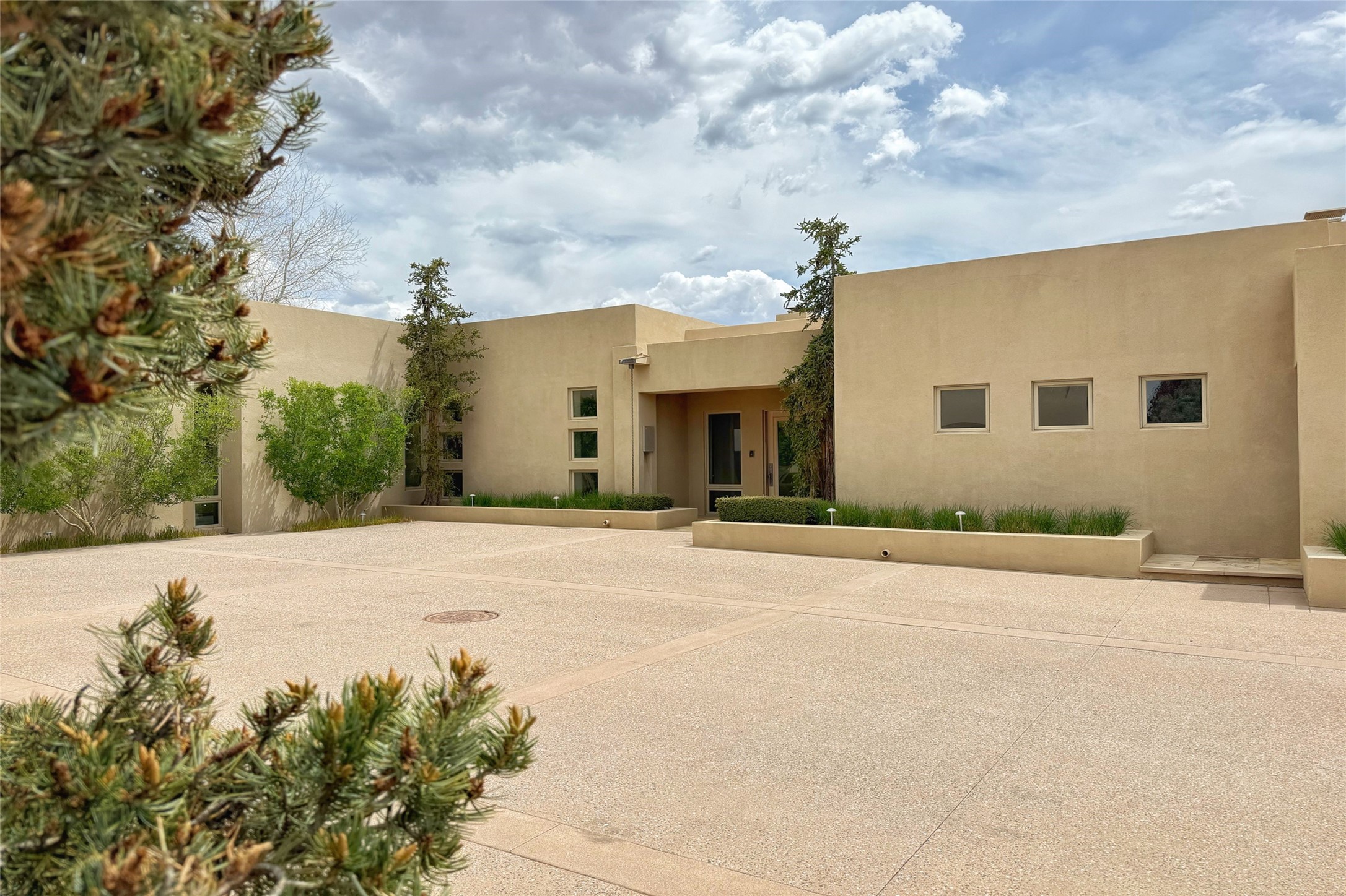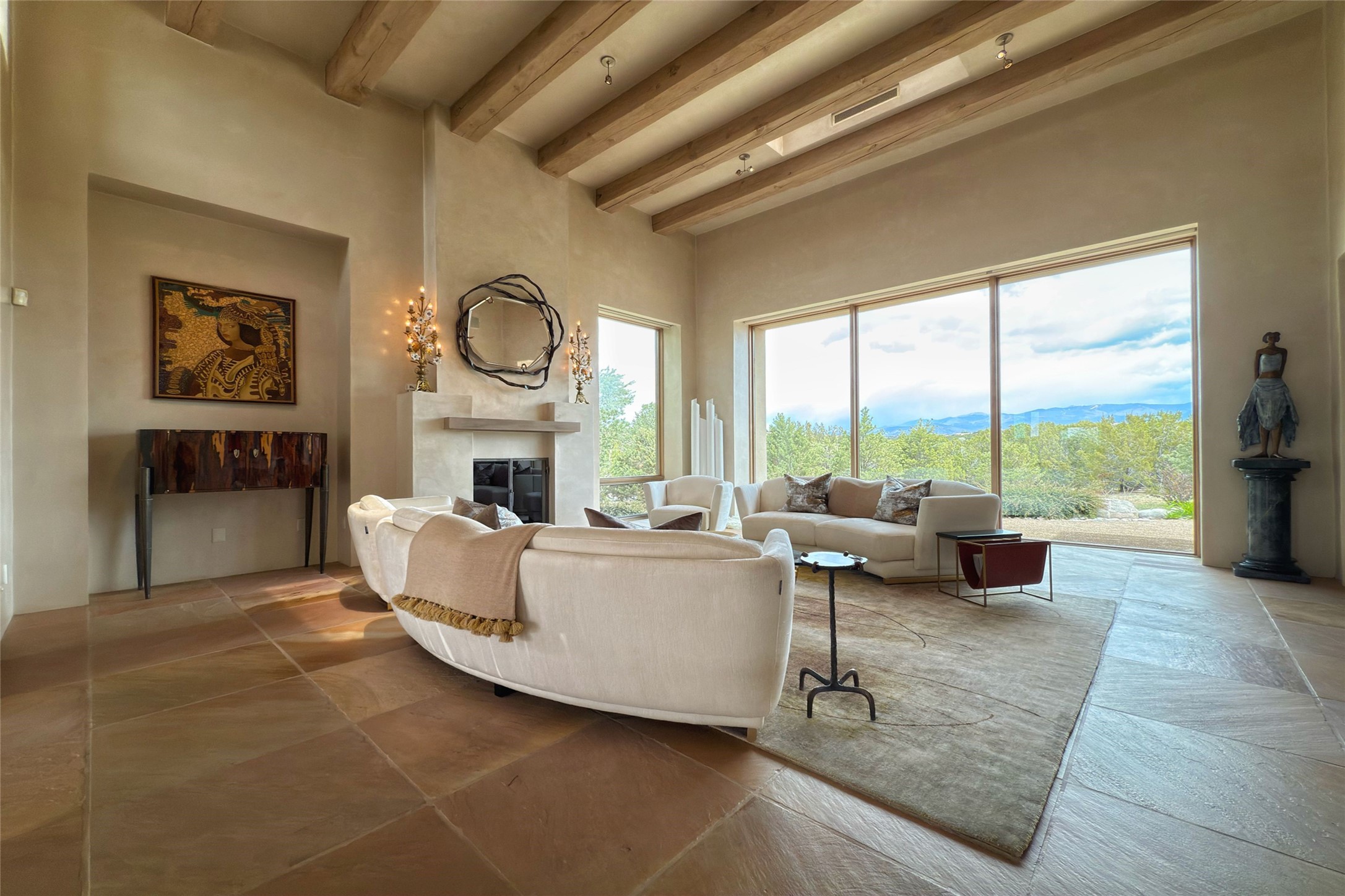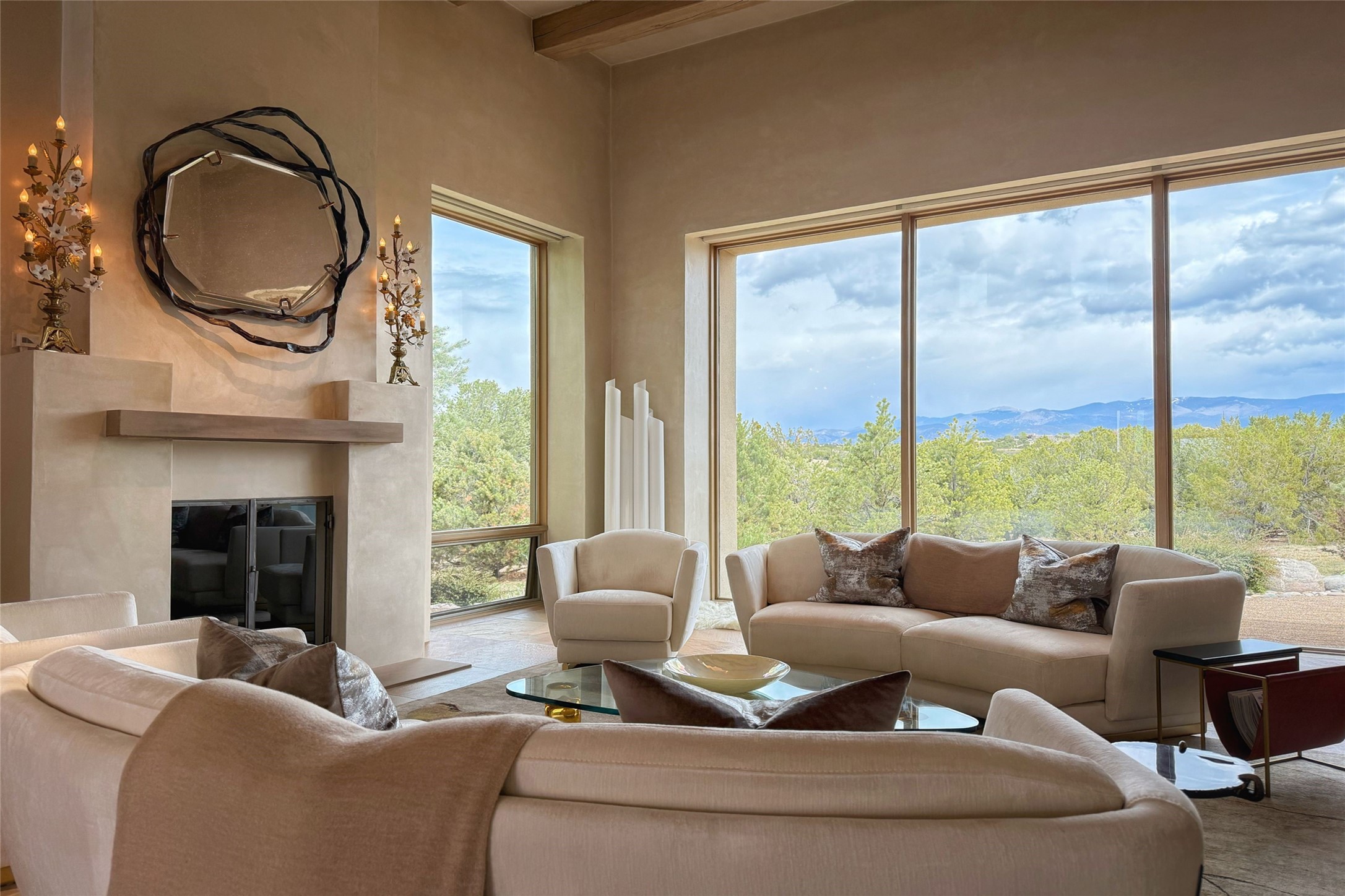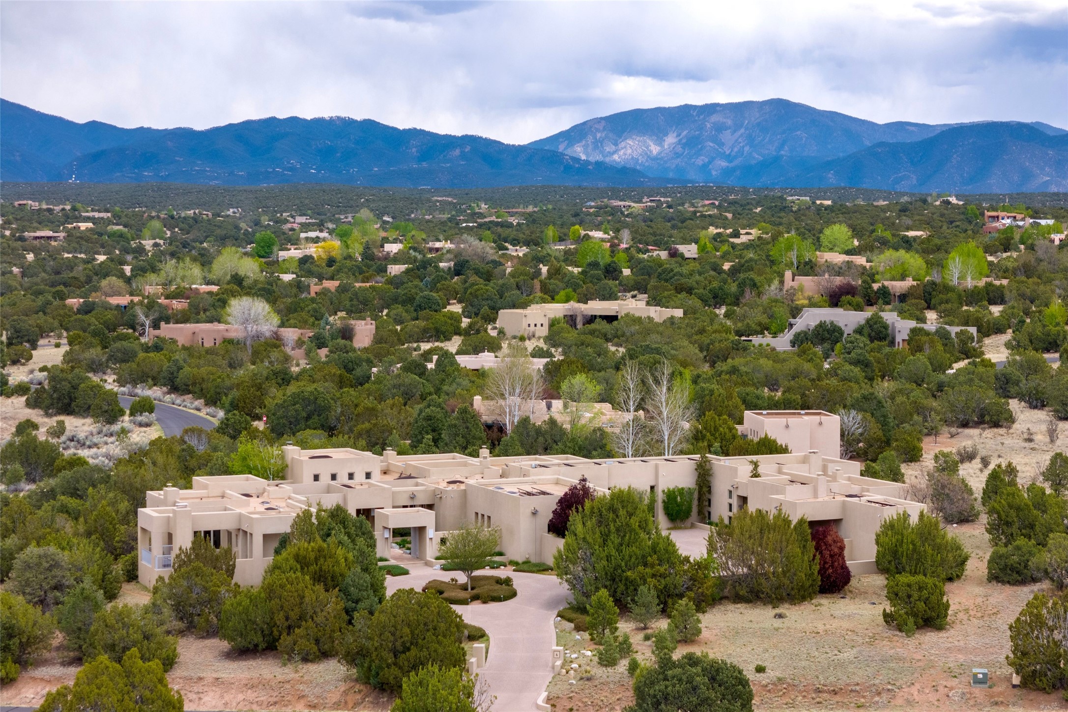 Prestigious Las Campanas Estate. Sophisticated Soft Contemporary on a Double Lot- over 3 acres for privacy.Welcome to an extraordinary estate built by Kim Dressel. Featuring a circular front drive, enclosed zen-like courtyard, and large separate motor court. With sweeping Sangre de Cristo views, this masterpiece blends elegance with tranquility and superb attention to detail. The entire residence is filled with natural light and augmented with custom lighting to showcase the art lover's collection.Interiors are graced with vigas and Desert Indian Sandstone floors. A total of 9 fireplaces (indoor and outdoor) provide warmth and charm. A generous entry hall, framed with alabaster sculptural lighting opens to the Great Room, anchored with a center fireplace and inspired by a bank of floor to ceiling windows that showcase the Sangre de Cristos. This space flaunts soaring ceilings and clerestory windows that flood the space with light. A gourmet kitchen features a large center island with Taj Mahal countertops, Sub-Zero/Wolf appliances, and opens to adjoining formal dining area and a cozy family room. A lavish primary suite offers a fireplace and an east facingportal complete with hot tub, fireplace and mountain views. Primary bath includes dual vanities, steam shower, soaking tub, dry sauna and custom closet. Adjacent home gym for convenience. Transition to the second wing through an impressive Gallery Hall designed for private art collections, exhibits and concert entertaining. A dedicated wine tasting space and sculpture garden complete the gallery.The secondary residence area includes large media room,office, two ensuite bedrooms with fireplaces and patios.Multiple outdoor spaces for indoor/outdoor living and entertaining including a deep covered portal with skylights, water feature, built-in grill and banco seating.Sparing no expense, this architectural gem delivers high-end fit and finishes throughout. The ultimate in style and serene luxury.