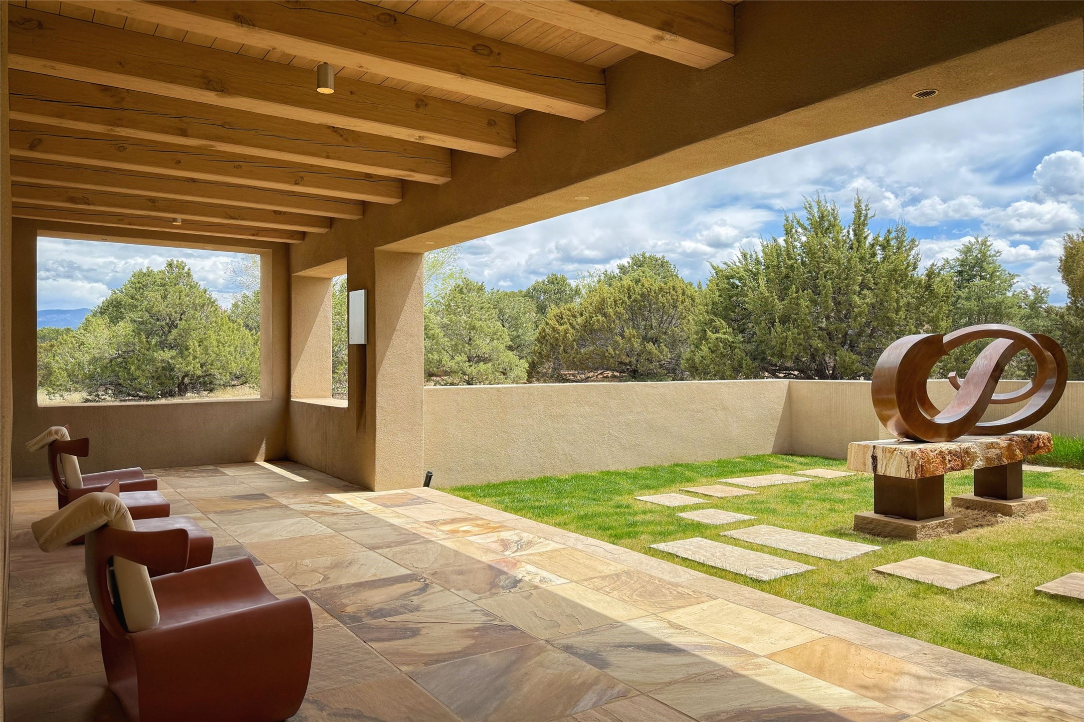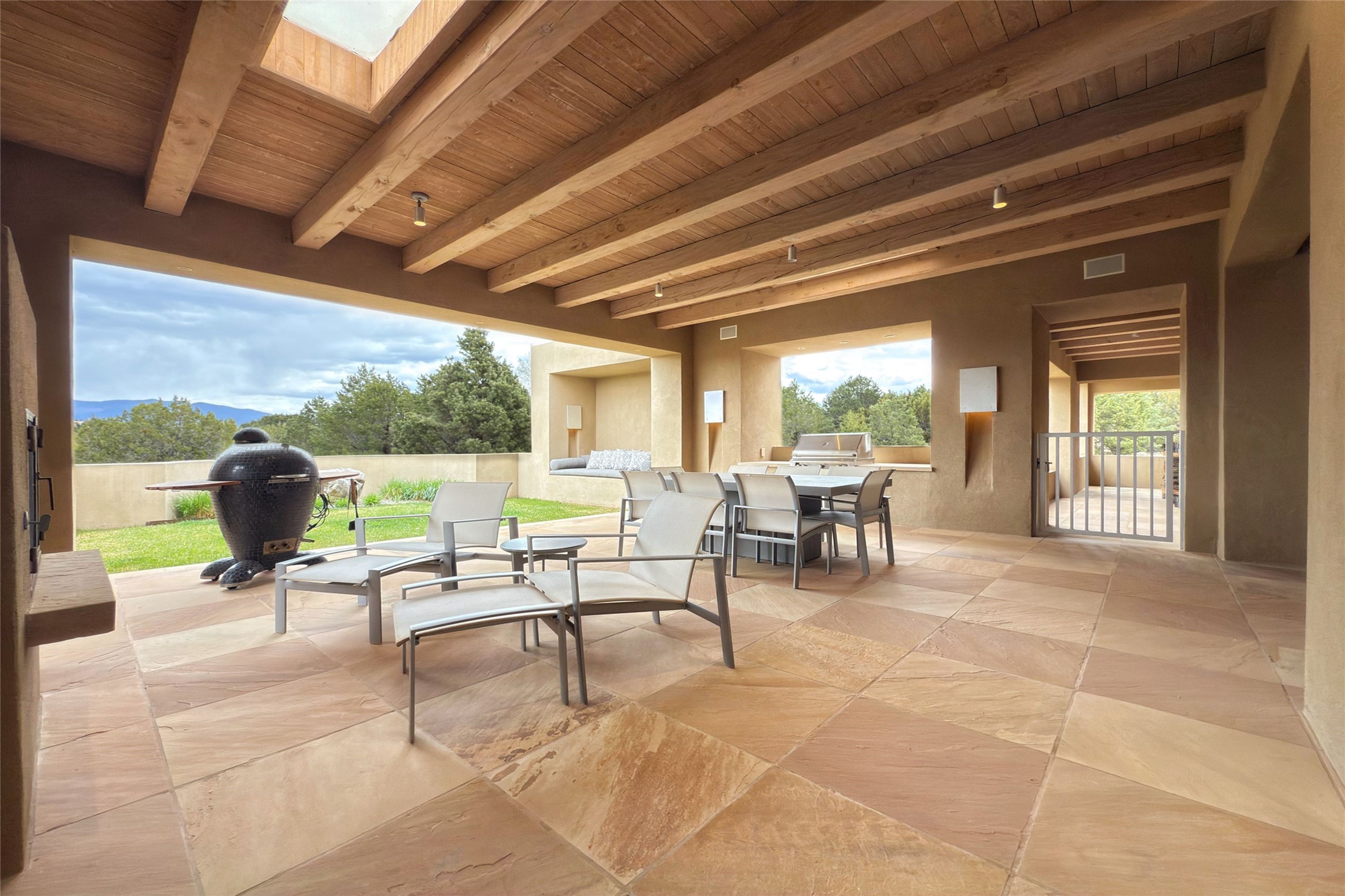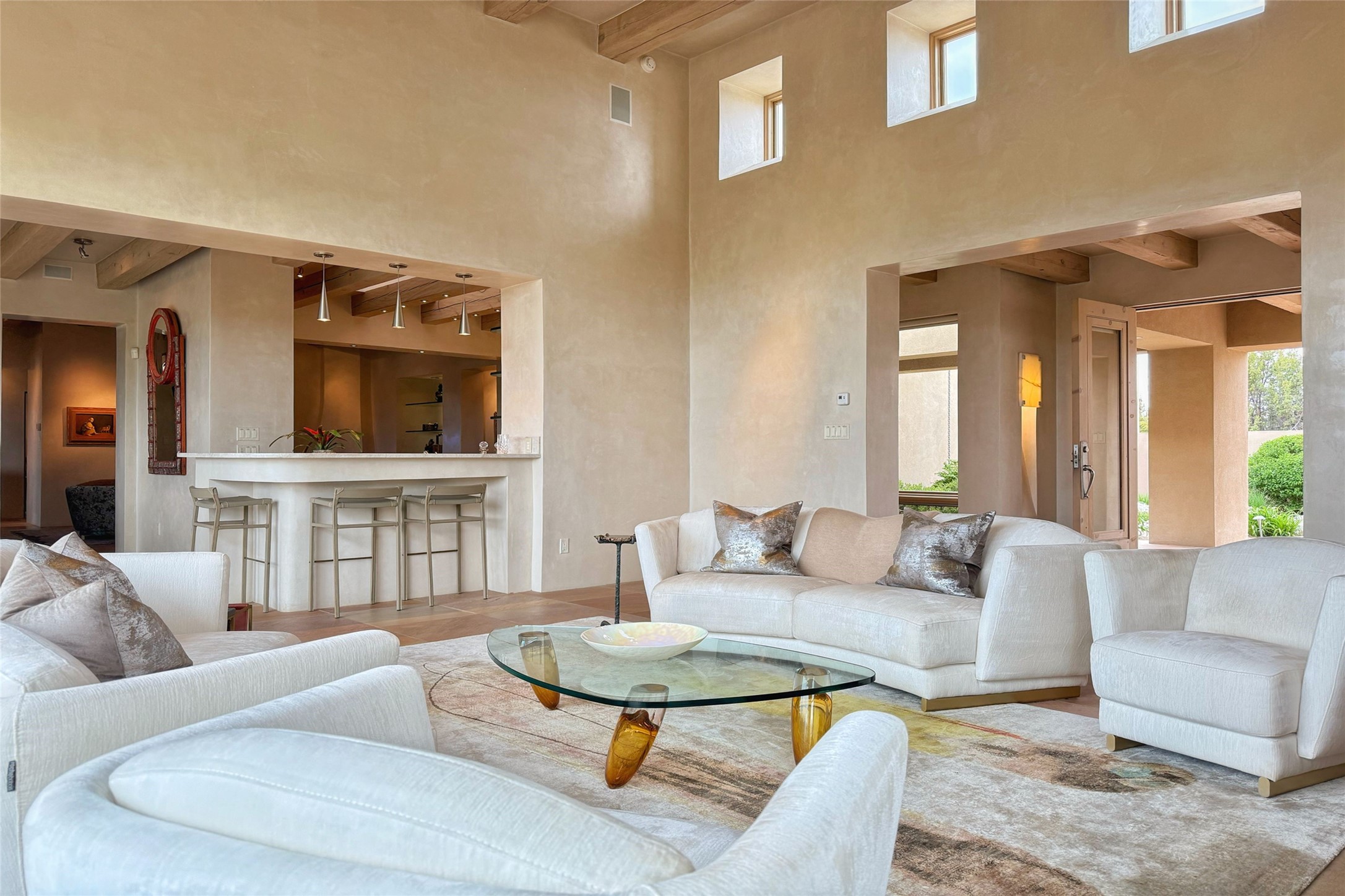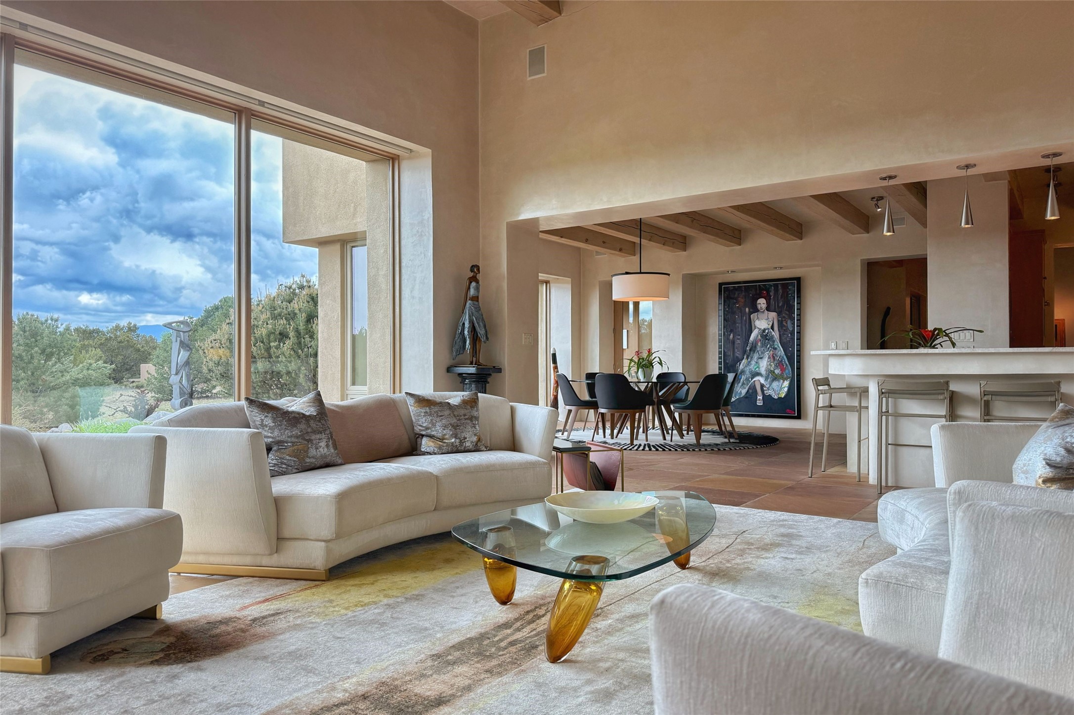Prestigious Las Campanas Estate. Sophisticated Soft Contemporary on a Double Lot- over 3 acres for privacy.Welcome to an extraordinary estate built by Kim Dressel. Featuring a circular front drive, enclosed zen-like courtyard, and large separate motor court. With sweeping Sangre de Cristo views, this masterpiece blends elegance with tranquility and superb attention to detail. The entire residence is filled with natural light and augmented with custom lighting to showcase the art lover's collection.Interiors are graced with vigas and Desert Indian Sandstone floors. A total of 9 fireplaces (indoor and outdoor) provide warmth and charm. A generous entry hall, framed with alabaster sculptural lighting opens to the Great Room, anchored with a center fireplace and inspired by a bank of floor to ceiling windows that showcase the Sangre de Cristos. This space flaunts soaring ceilings and clerestory windows that flood the space with light. A gourmet kitchen features a large center island with Taj Mahal countertops, Sub-Zero/Wolf appliances, and opens to adjoining formal dining area and a cozy family room. A lavish primary suite offers a fireplace and an east facingportal complete with hot tub, fireplace and mountain views. Primary bath includes dual vanities, steam shower, soaking tub, dry sauna and custom closet. Adjacent home gym for convenience. Transition to the second wing through an impressive Gallery Hall designed for private art collections, exhibits and concert entertaining. A dedicated wine tasting space and sculpture garden complete the gallery.The secondary residence area includes large media room,office, two ensuite bedrooms with fireplaces and patios.Multiple outdoor spaces for indoor/outdoor living and entertaining including a deep covered portal with skylights, water feature, built-in grill and banco seating.Sparing no expense, this architectural gem delivers high-end fit and finishes throughout. The ultimate in style and serene luxury.