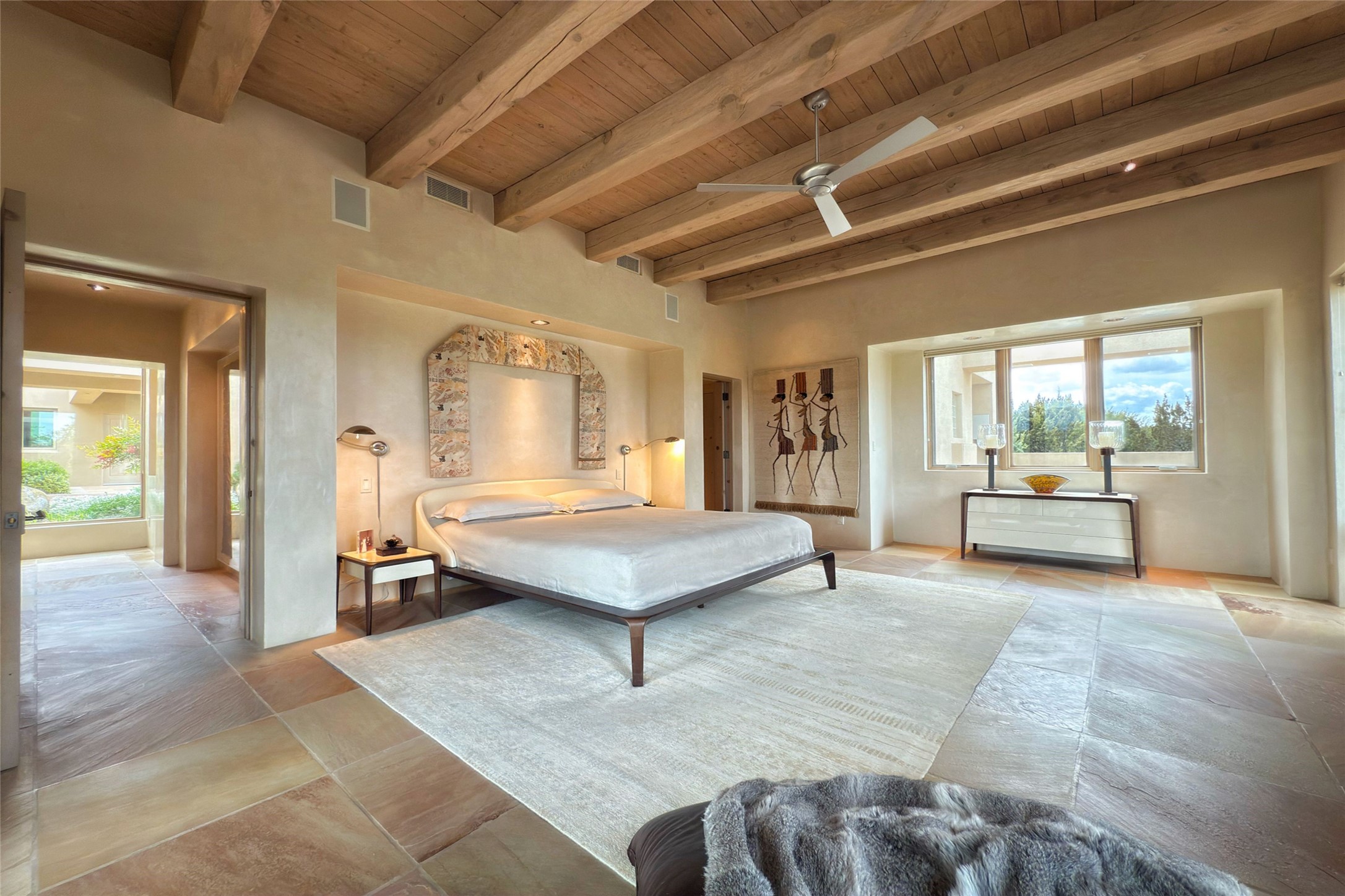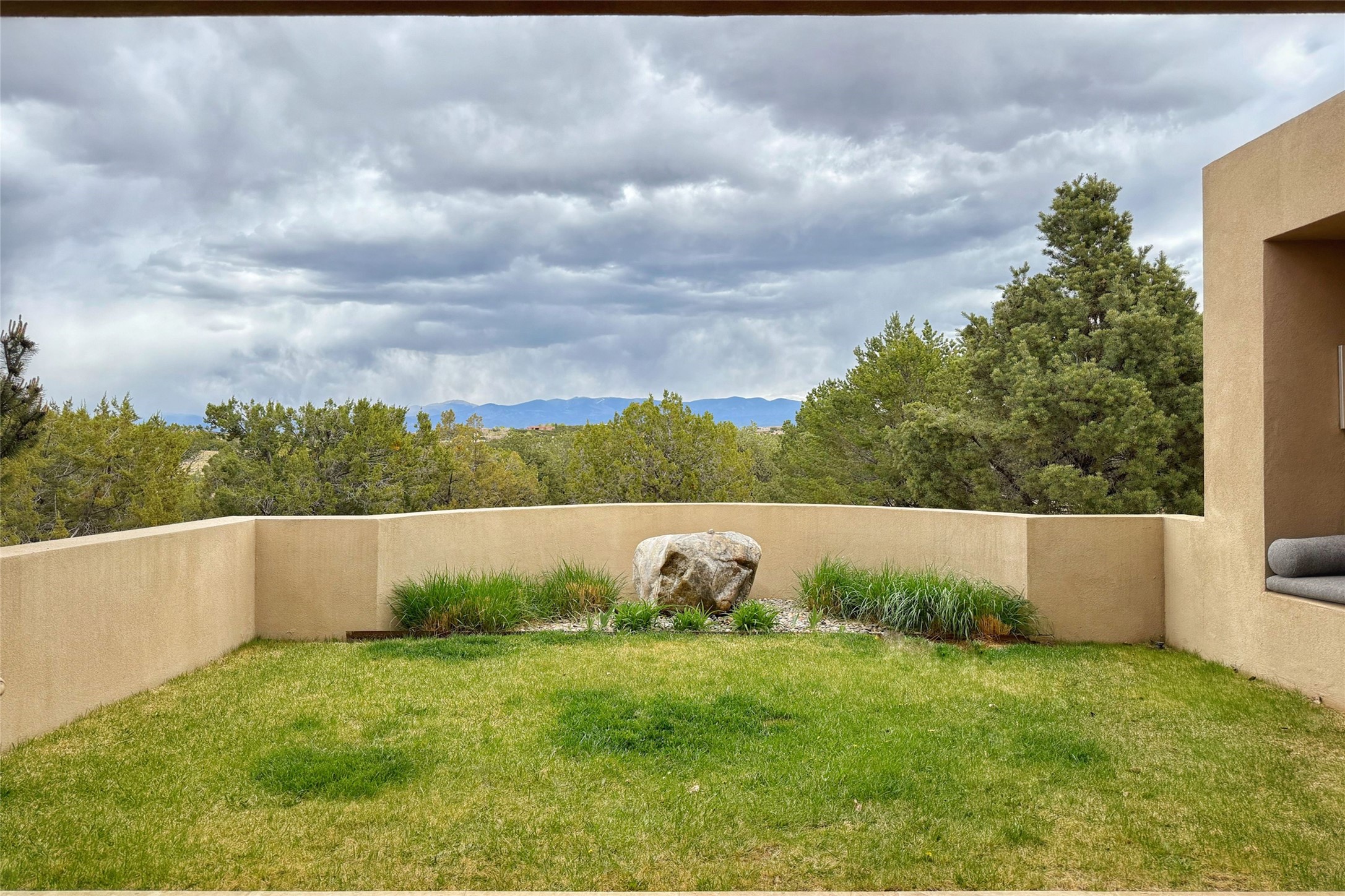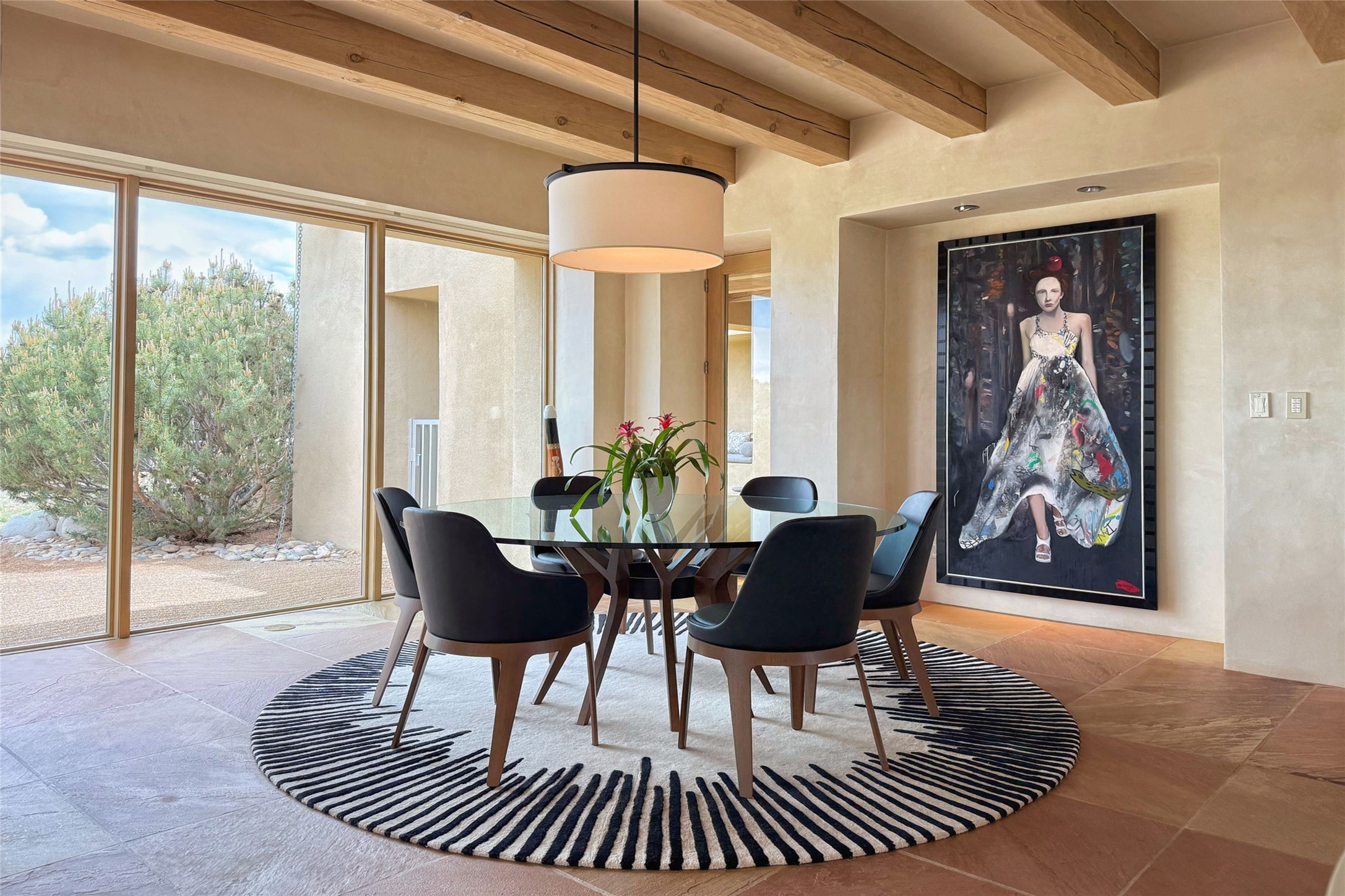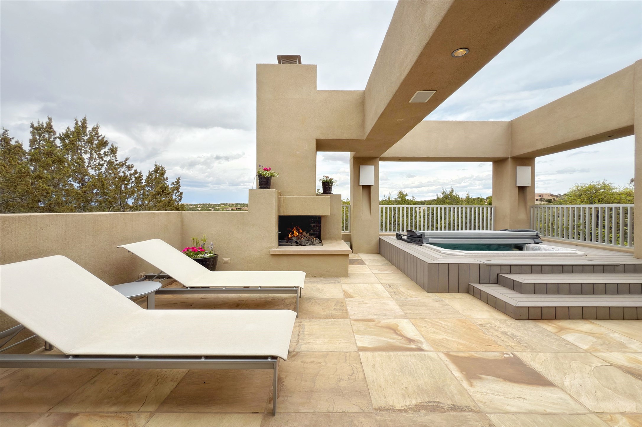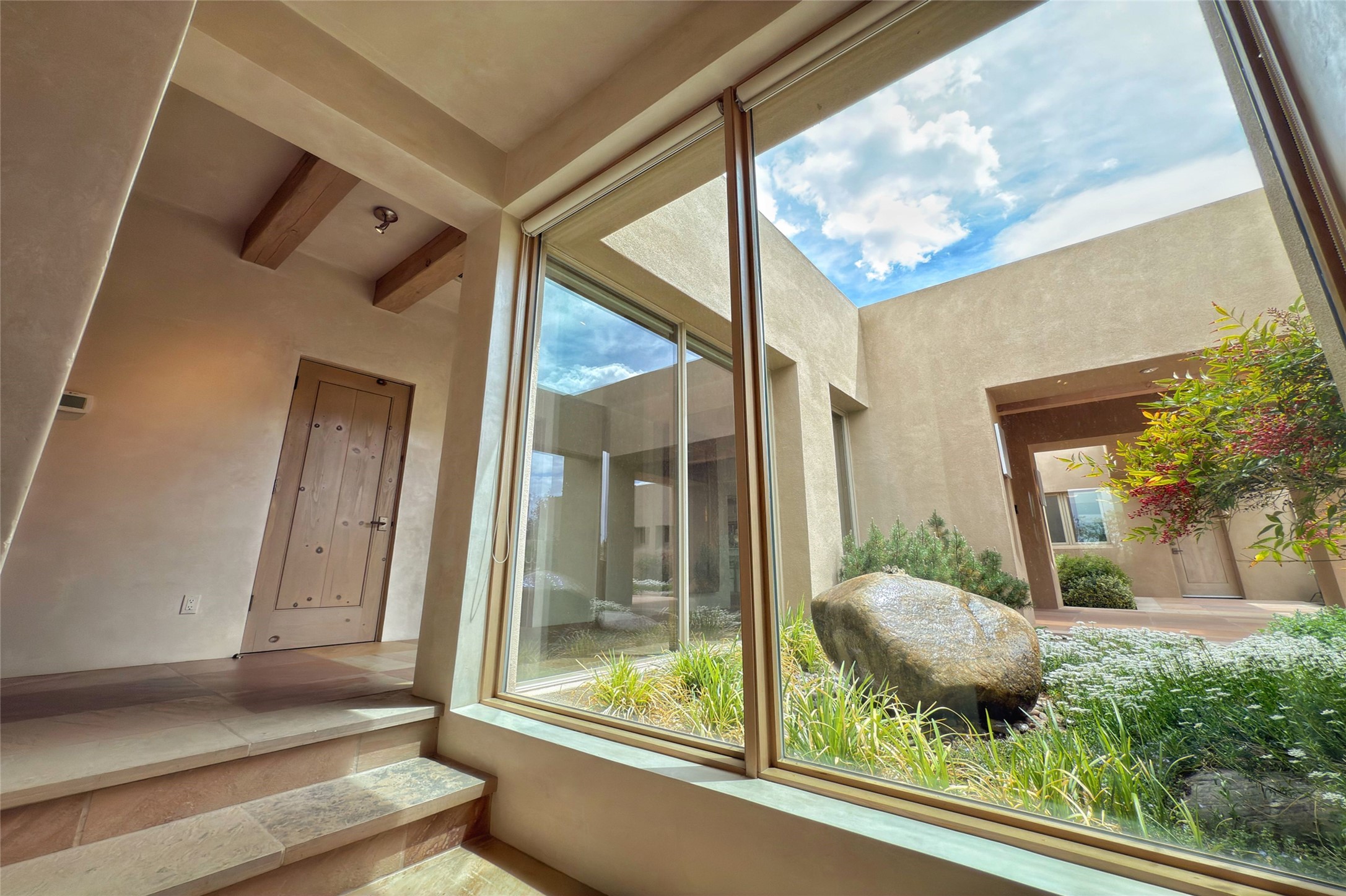 Prestigious Las Campanas Estate. Sophisticated Soft Contemporary on a Double Lot- over 3 acres for privacy.Welcome to an extraordinary estate built by Kim Dressel. Featuring a circular front drive, enclosed zen-like courtyard, and large separate motor court. With sweeping Sangre de Cristo views, this masterpiece blends elegance with tranquility and superb attention to detail. The entire residence is filled with natural light and augmented with custom lighting to showcase the art lover's collection.Interiors are graced with vigas and Desert Indian Sandstone floors. A total of 9 fireplaces (indoor and outdoor) provide warmth and charm. A generous entry hall, framed with alabaster sculptural lighting opens to the Great Room, anchored with a center fireplace and inspired by a bank of floor to ceiling windows that showcase the Sangre de Cristos. This space flaunts soaring ceilings and clerestory windows that flood the space with light. A gourmet kitchen features a large center island with Taj Mahal countertops, Sub-Zero/Wolf appliances, and opens to adjoining formal dining area and a cozy family room. A lavish primary suite offers a fireplace and an east facingportal complete with hot tub, fireplace and mountain views. Primary bath includes dual vanities, steam shower, soaking tub, dry sauna and custom closet. Adjacent home gym for convenience. Transition to the second wing through an impressive Gallery Hall designed for private art collections, exhibits and concert entertaining. A dedicated wine tasting space and sculpture garden complete the gallery.The secondary residence area includes large media room,office, two ensuite bedrooms with fireplaces and patios.Multiple outdoor spaces for indoor/outdoor living and entertaining including a deep covered portal with skylights, water feature, built-in grill and banco seating.Sparing no expense, this architectural gem delivers high-end fit and finishes throughout. The ultimate in style and serene luxury.