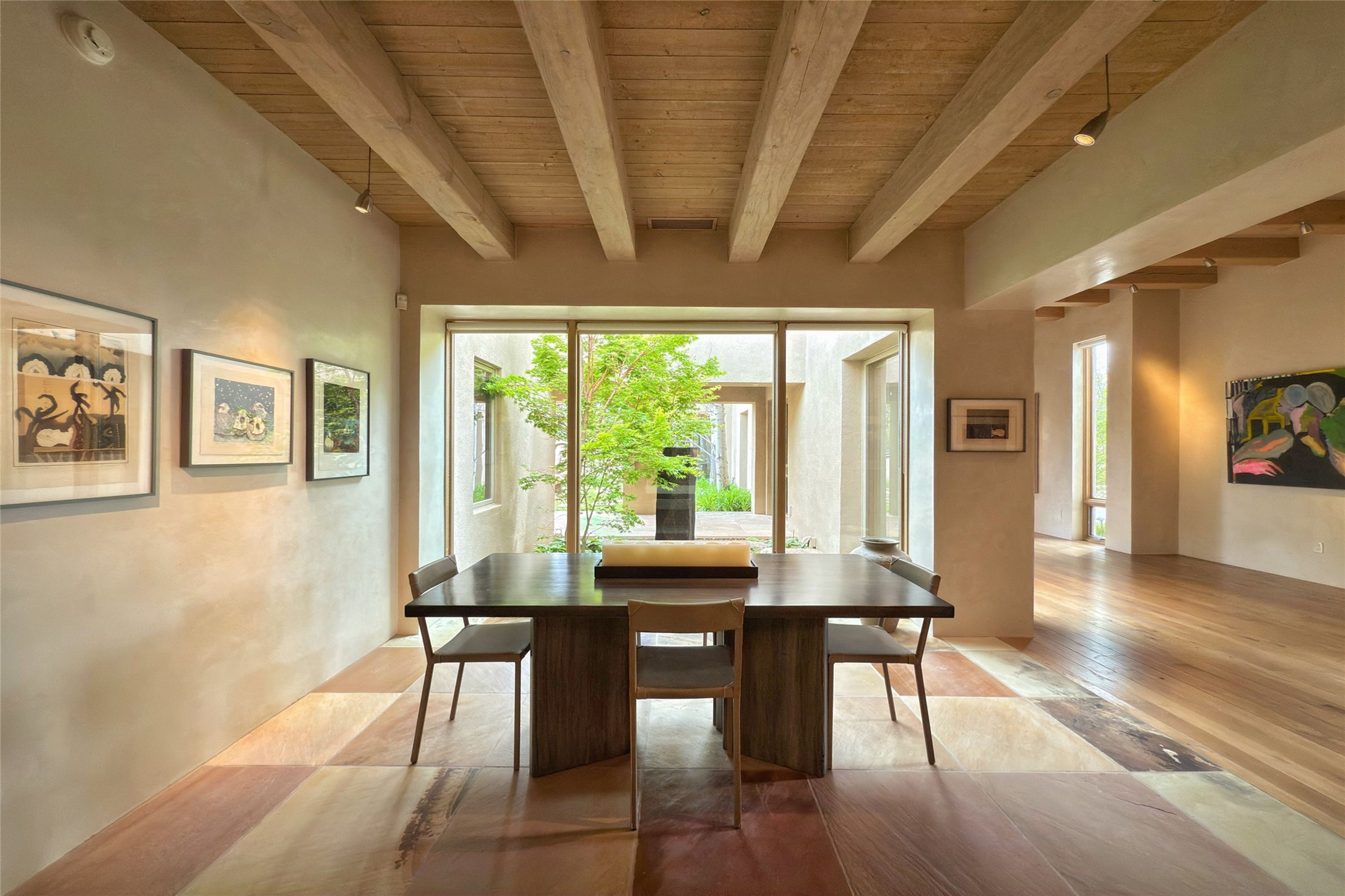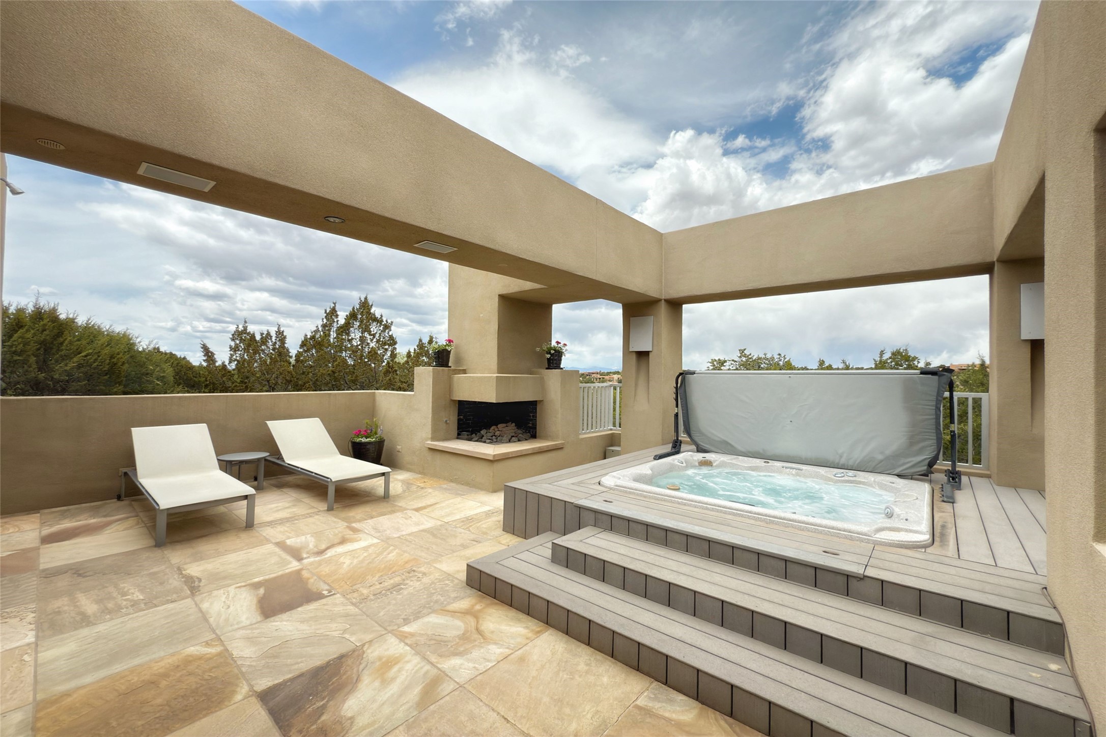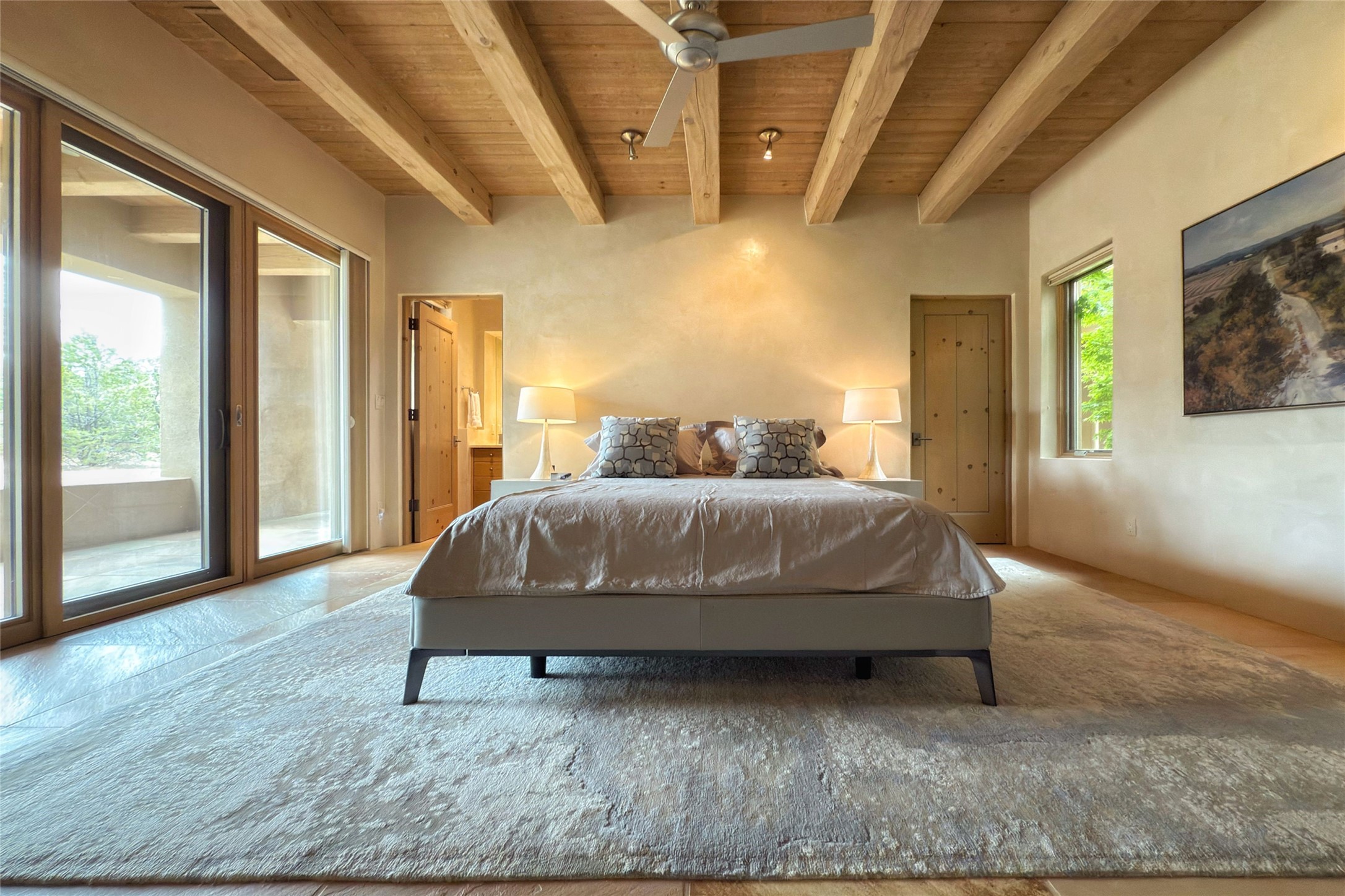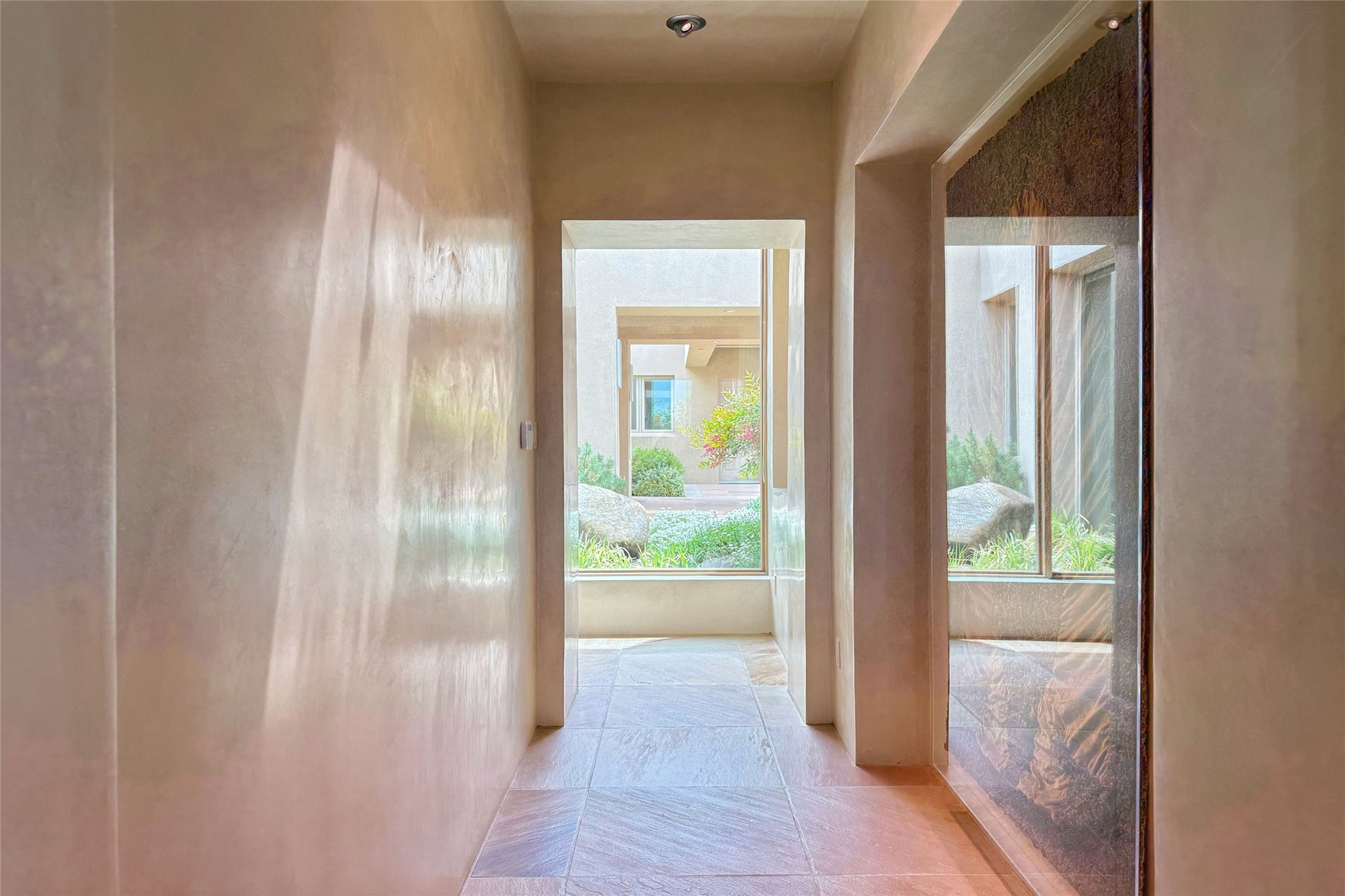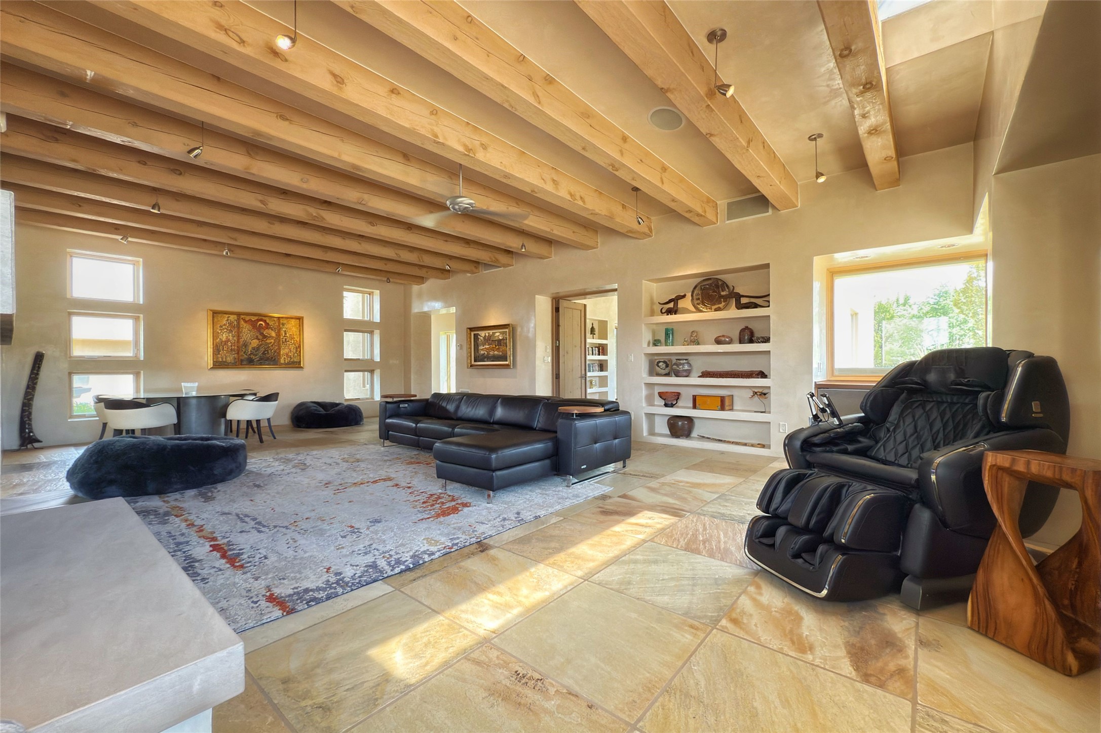 Prestigious Las Campanas Estate. Sophisticated Soft Contemporary on a Double Lot- over 3 acres for privacy.Welcome to an extraordinary estate built by Kim Dressel. Featuring a circular front drive, enclosed zen-like courtyard, and large separate motor court. With sweeping Sangre de Cristo views, this masterpiece blends elegance with tranquility and superb attention to detail. The entire residence is filled with natural light and augmented with custom lighting to showcase the art lover's collection.Interiors are graced with vigas and Desert Indian Sandstone floors. A total of 9 fireplaces (indoor and outdoor) provide warmth and charm. A generous entry hall, framed with alabaster sculptural lighting opens to the Great Room, anchored with a center fireplace and inspired by a bank of floor to ceiling windows that showcase the Sangre de Cristos. This space flaunts soaring ceilings and clerestory windows that flood the space with light. A gourmet kitchen features a large center island with Taj Mahal countertops, Sub-Zero/Wolf appliances, and opens to adjoining formal dining area and a cozy family room. A lavish primary suite offers a fireplace and an east facingportal complete with hot tub, fireplace and mountain views. Primary bath includes dual vanities, steam shower, soaking tub, dry sauna and custom closet. Adjacent home gym for convenience. Transition to the second wing through an impressive Gallery Hall designed for private art collections, exhibits and concert entertaining. A dedicated wine tasting space and sculpture garden complete the gallery.The secondary residence area includes large media room,office, two ensuite bedrooms with fireplaces and patios.Multiple outdoor spaces for indoor/outdoor living and entertaining including a deep covered portal with skylights, water feature, built-in grill and banco seating.Sparing no expense, this architectural gem delivers high-end fit and finishes throughout. The ultimate in style and serene luxury.