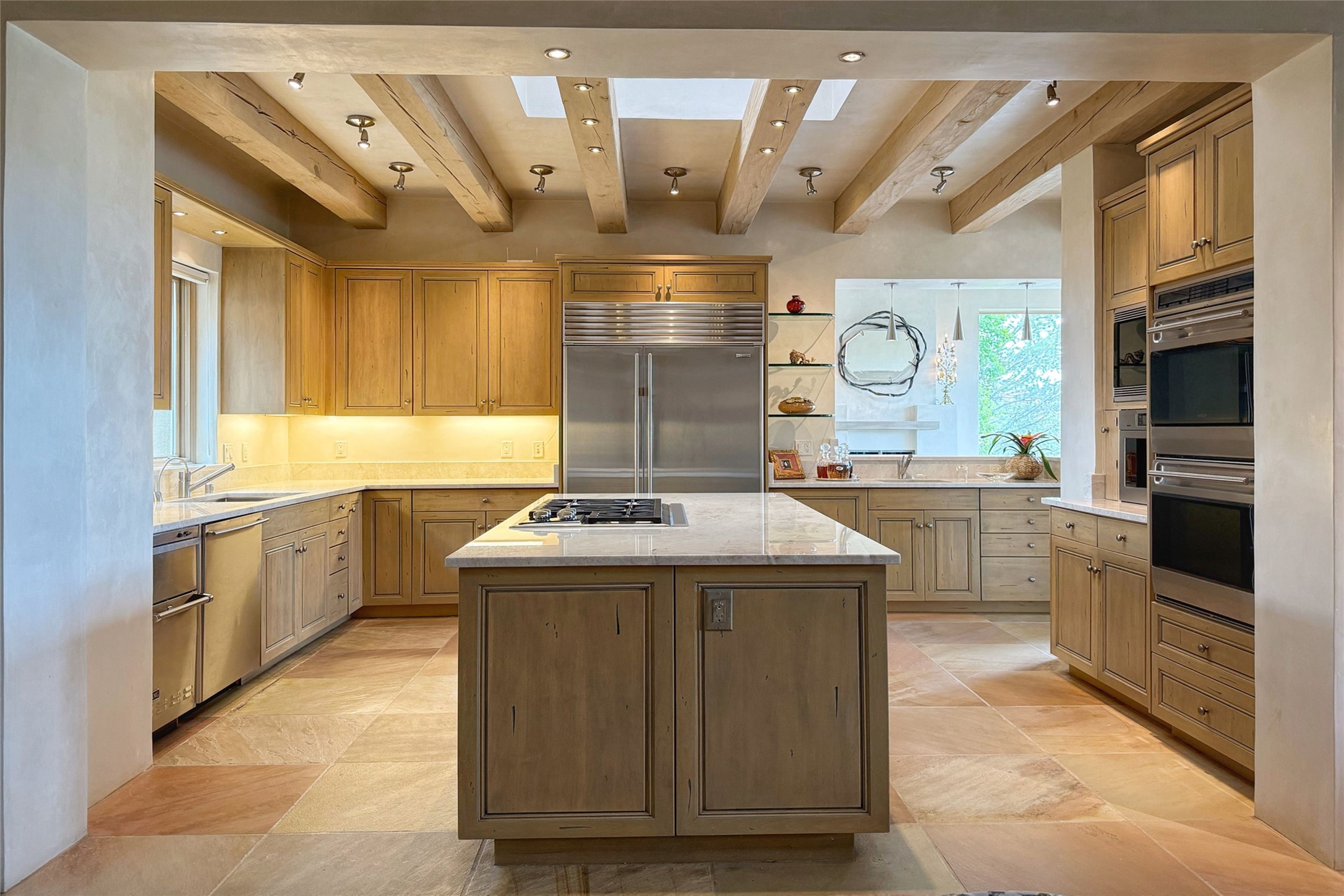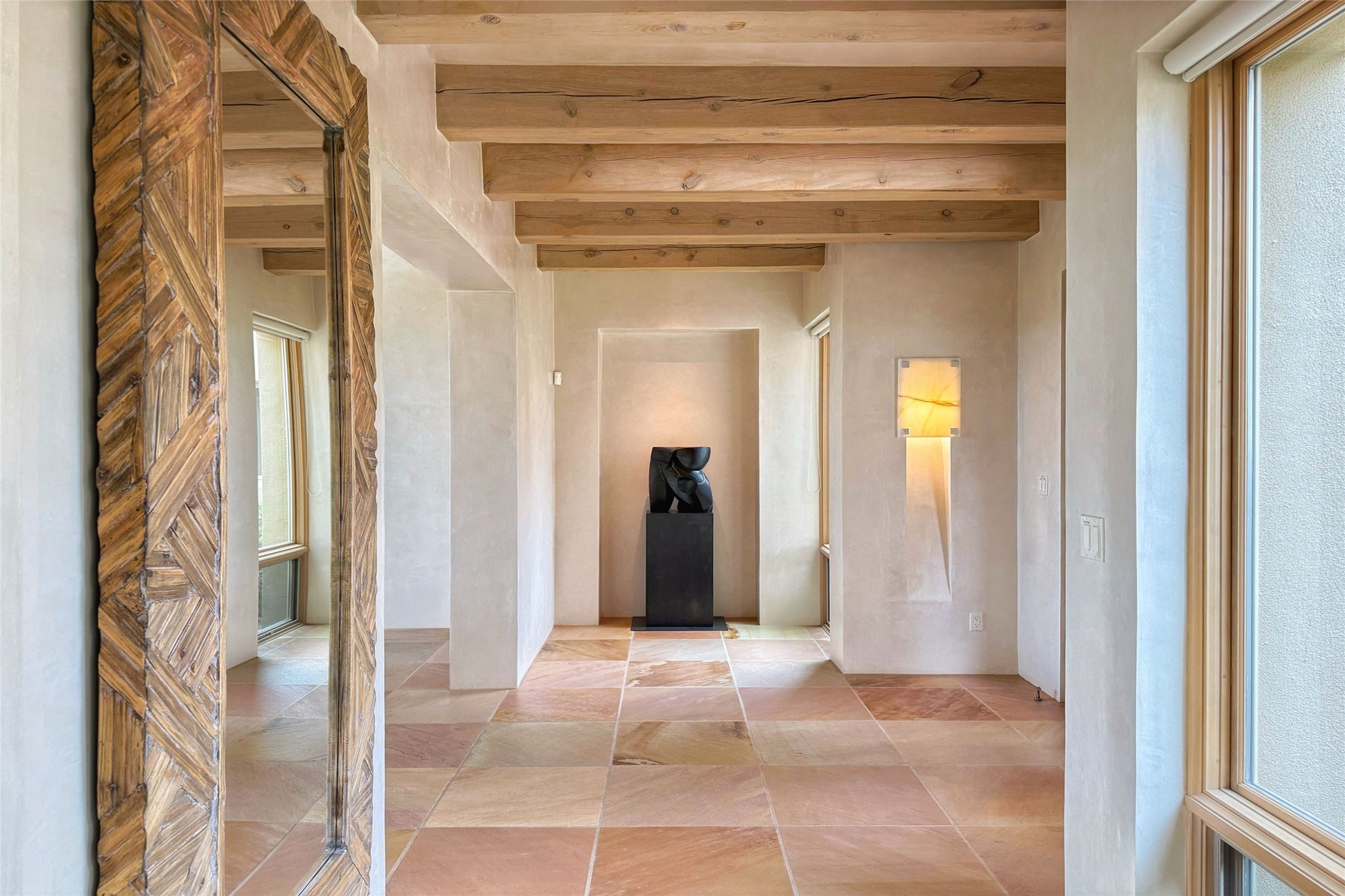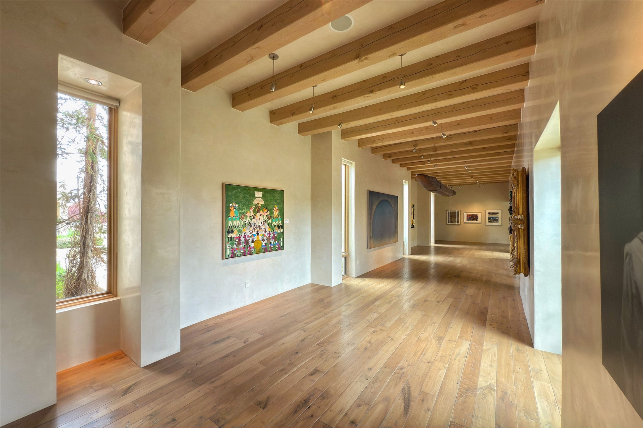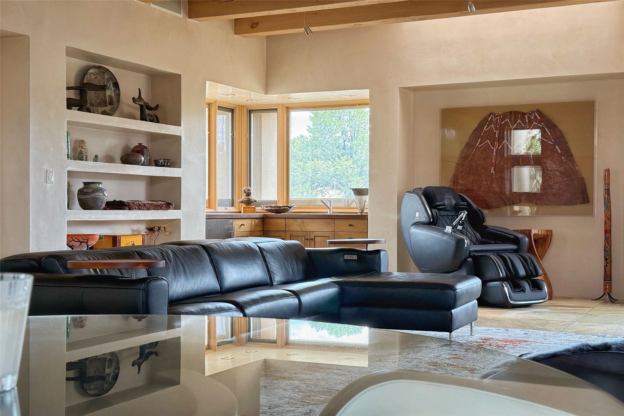 Prestigious Las Campanas Estate. Sophisticated Soft Contemporary on a Double Lot- over 3 acres for privacy.Welcome to an extraordinary estate built by Kim Dressel. Featuring a circular front drive, enclosed zen-like courtyard, and large separate motor court. With sweeping Sangre de Cristo views, this masterpiece blends elegance with tranquility and superb attention to detail. The entire residence is filled with natural light and augmented with custom lighting to showcase the art lover's collection.Interiors are graced with vigas and Desert Indian Sandstone floors. A total of 9 fireplaces (indoor and outdoor) provide warmth and charm. A generous entry hall, framed with alabaster sculptural lighting opens to the Great Room, anchored with a center fireplace and inspired by a bank of floor to ceiling windows that showcase the Sangre de Cristos. This space flaunts soaring ceilings and clerestory windows that flood the space with light. A gourmet kitchen features a large center island with Taj Mahal countertops, Sub-Zero/Wolf appliances, and opens to adjoining formal dining area and a cozy family room. A lavish primary suite offers a fireplace and an east facingportal complete with hot tub, fireplace and mountain views. Primary bath includes dual vanities, steam shower, soaking tub, dry sauna and custom closet. Adjacent home gym for convenience. Transition to the second wing through an impressive Gallery Hall designed for private art collections, exhibits and concert entertaining. A dedicated wine tasting space and sculpture garden complete the gallery.The secondary residence area includes large media room,office, two ensuite bedrooms with fireplaces and patios.Multiple outdoor spaces for indoor/outdoor living and entertaining including a deep covered portal with skylights, water feature, built-in grill and banco seating.Sparing no expense, this architectural gem delivers high-end fit and finishes throughout. The ultimate in style and serene luxury.